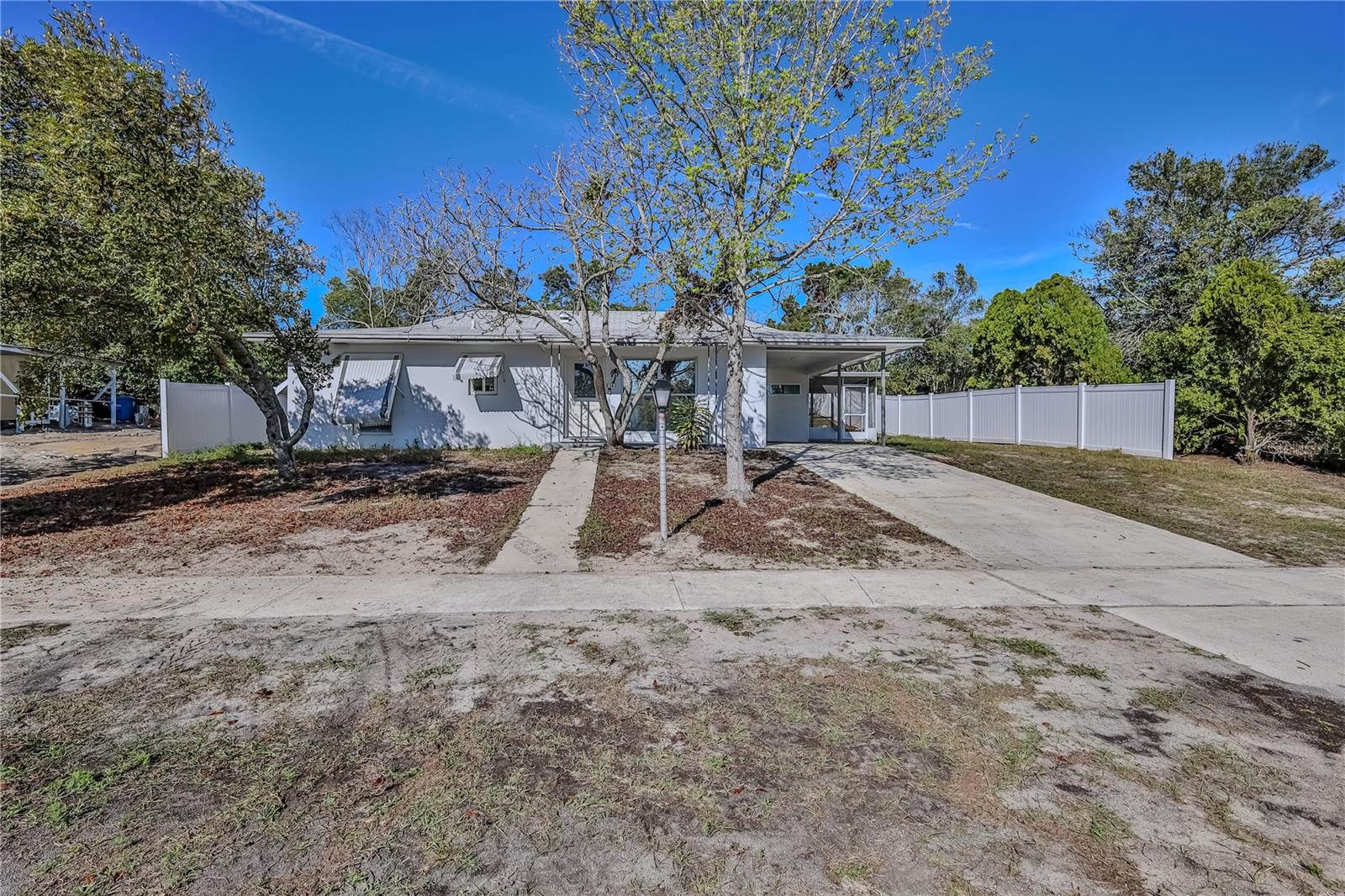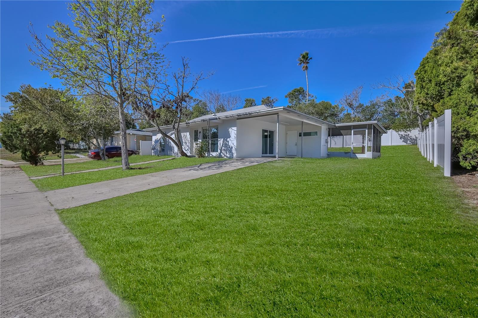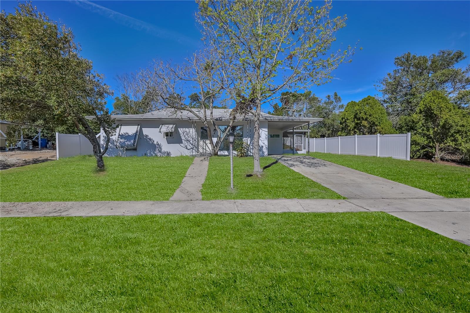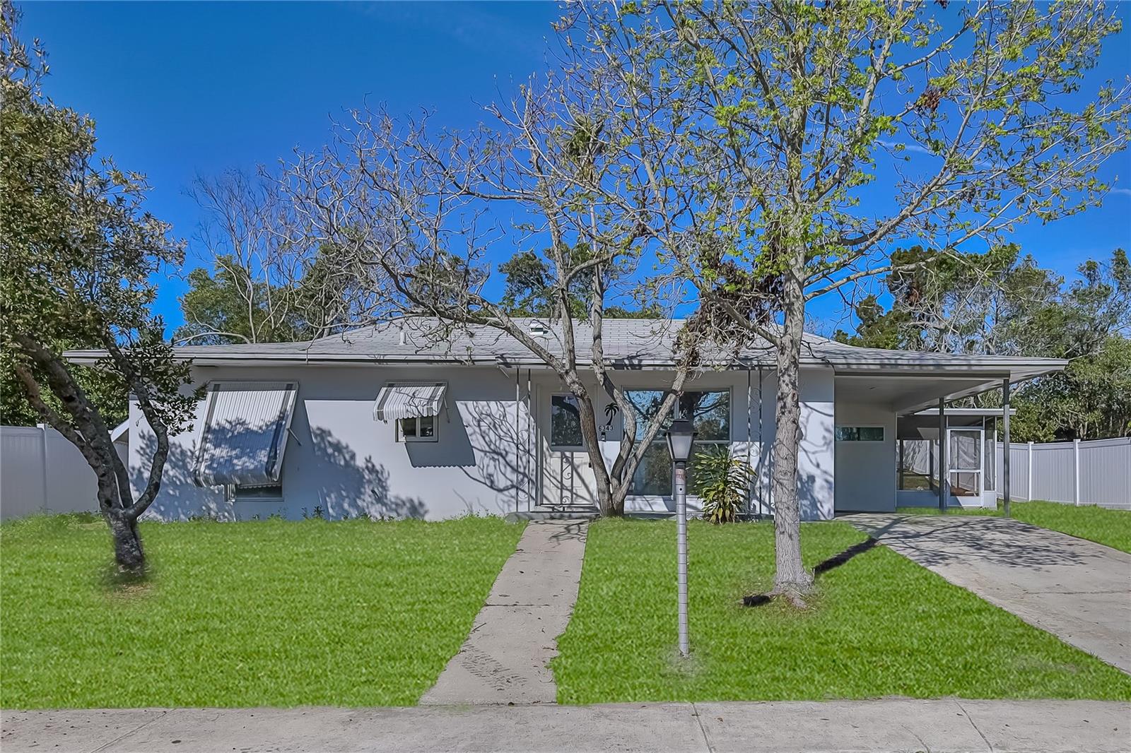 Step into this beautifully updated 2-bedroom, 1-bathroom home with a 1-car carport, where modern upgrades meet timeless comfort. Inside, you'll find new luxury vinyl plank flooring, designer lighting, and a completely renovated chef's kitchen featuring wood cabinets with soft-close drawers, quartz countertops, and stainless steel appliances. The bathroom has been tastefully updated with new vanity, toilet, tile, and flooring. The new front door and sliding glass doors enhance both style and energy efficiency. Enjoy extra living space in the enclosed porch, ready for your personal touch, leading to a screened and covered porch—ideal for relaxing or entertaining. Additional highlights include a 2023 electrical upgrade, a 2014 roof, and a 2011 HVAC system. A washer and dryer are conveniently located in the carport storage room. Vinyl privacy fence in rear yard. No HOA. Make an appointment today to see this home in person!
