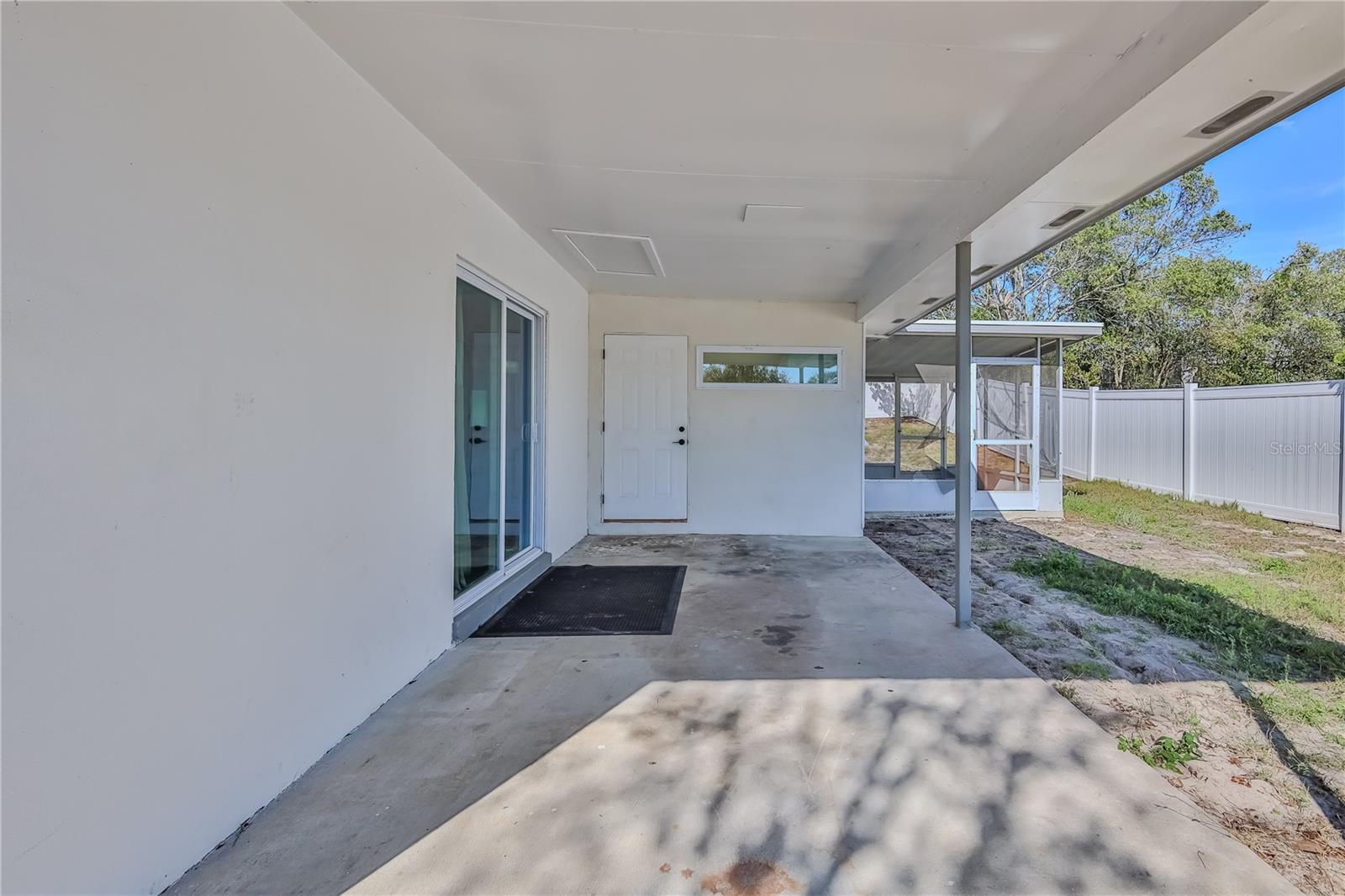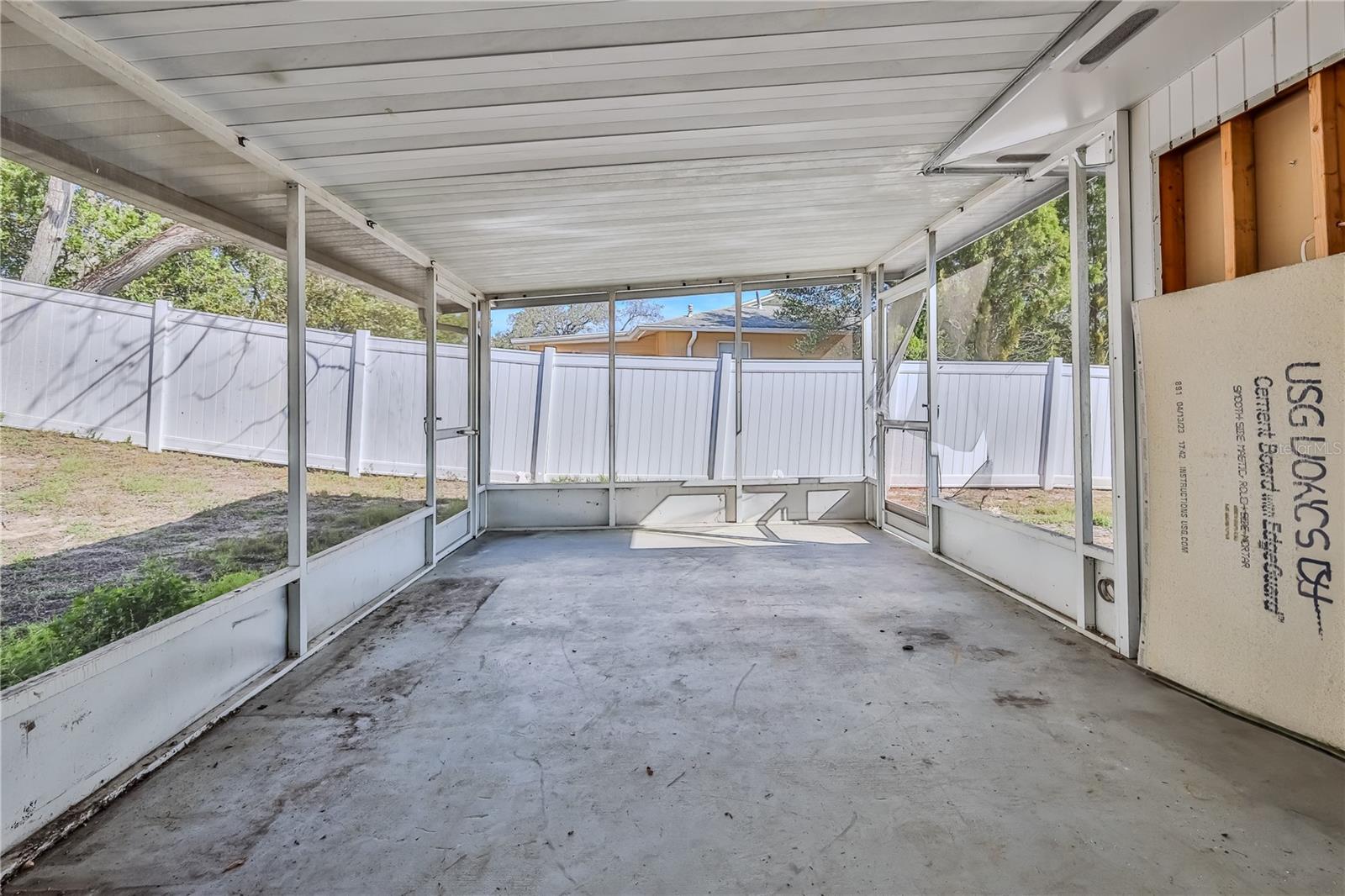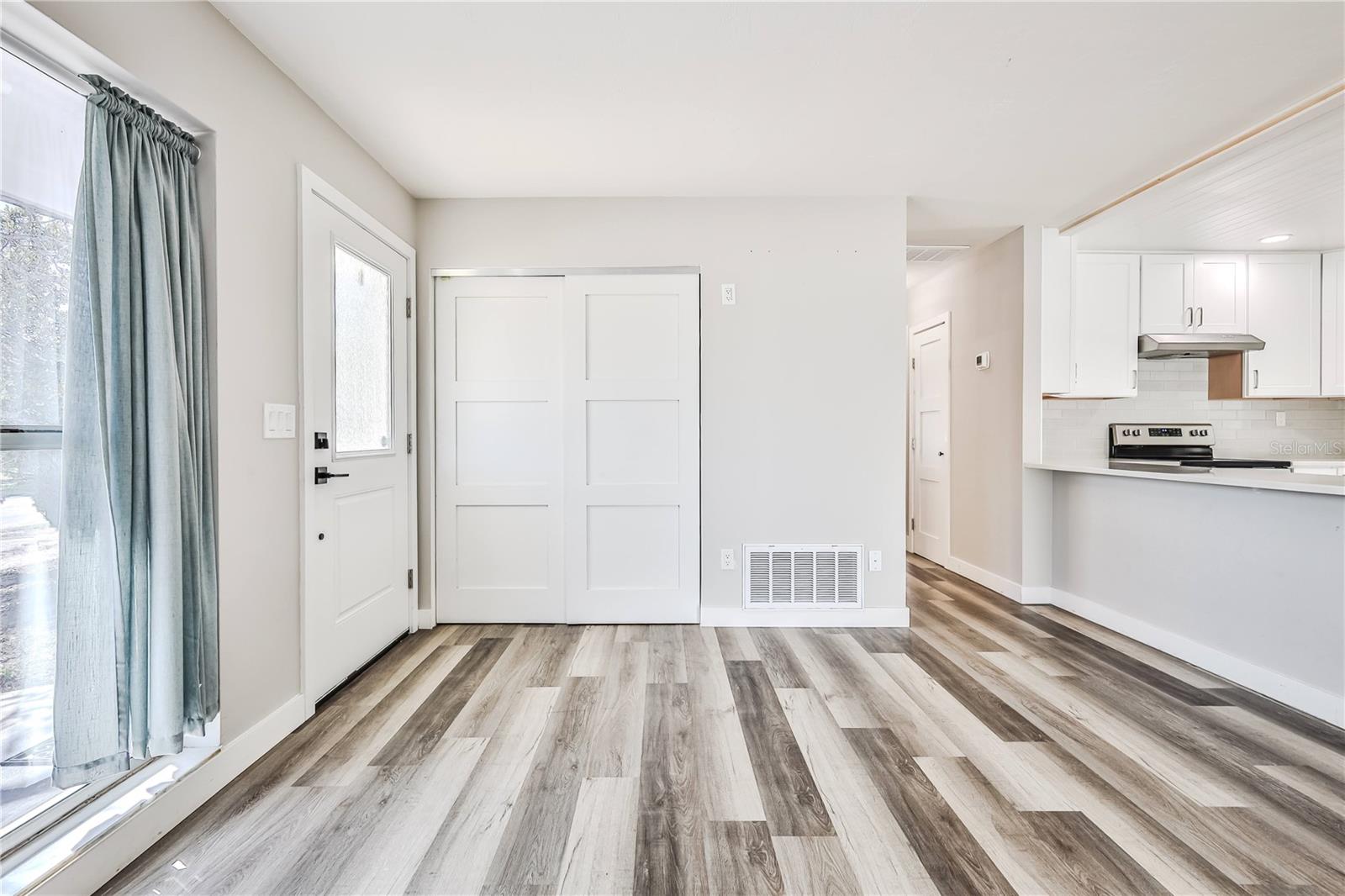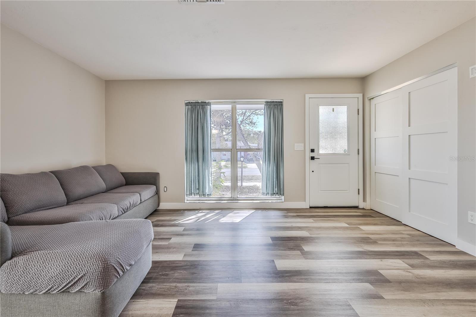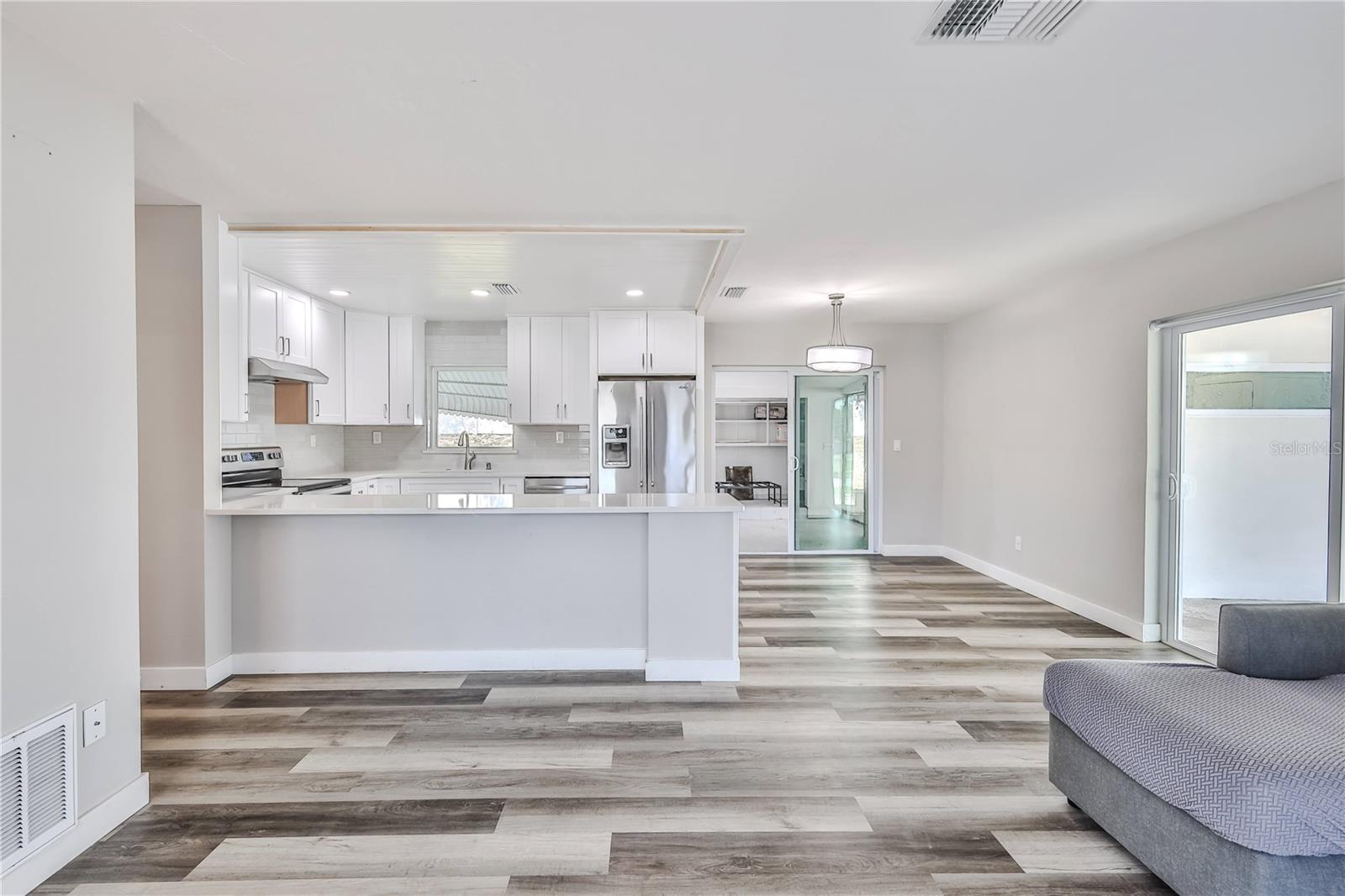 Step into this beautifully updated 2-bedroom, 1-bathroom home with a 1-car carport, where modern upgrades meet timeless comfort. Inside, you'll find new luxury vinyl plank flooring, designer lighting, and a completely renovated chef's kitchen featuring wood cabinets with soft-close drawers, quartz countertops, and stainless steel appliances. The bathroom has been tastefully updated with new vanity, toilet, tile, and flooring. The new front door and sliding glass doors enhance both style and energy efficiency. Enjoy extra living space in the enclosed porch, ready for your personal touch, leading to a screened and covered porch—ideal for relaxing or entertaining. Additional highlights include a 2023 electrical upgrade, a 2014 roof, and a 2011 HVAC system. A washer and dryer are conveniently located in the carport storage room. Vinyl privacy fence in rear yard. No HOA. Make an appointment today to see this home in person!