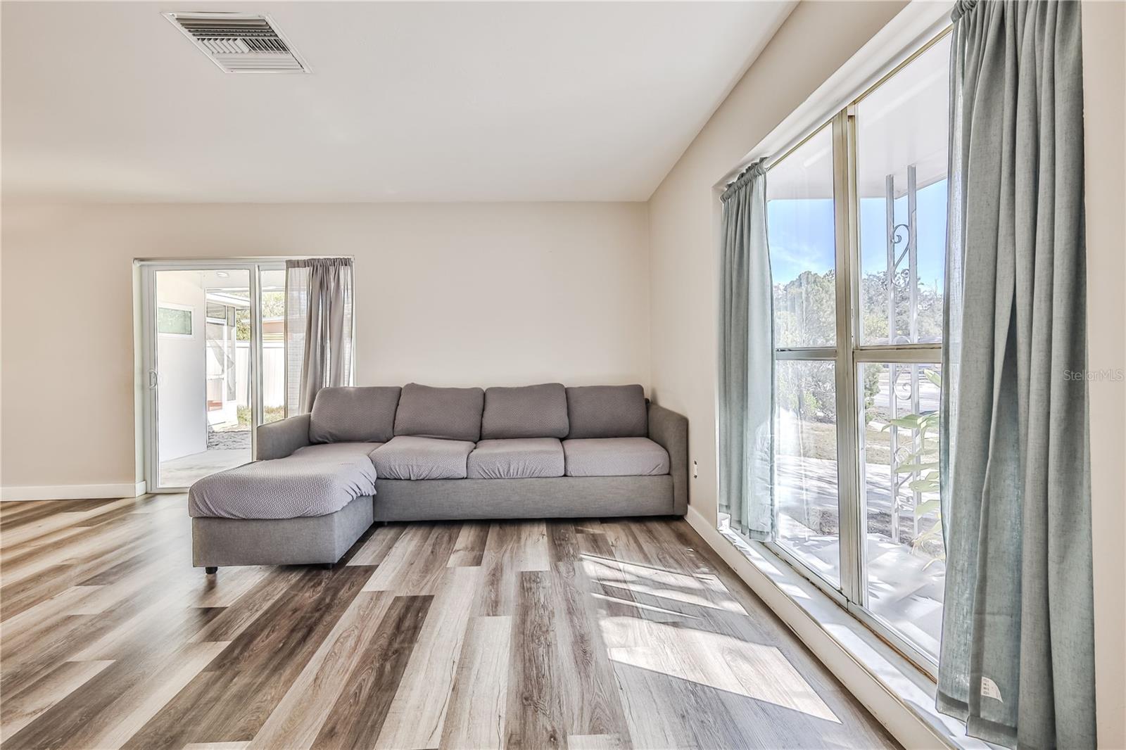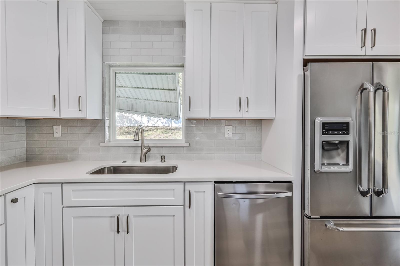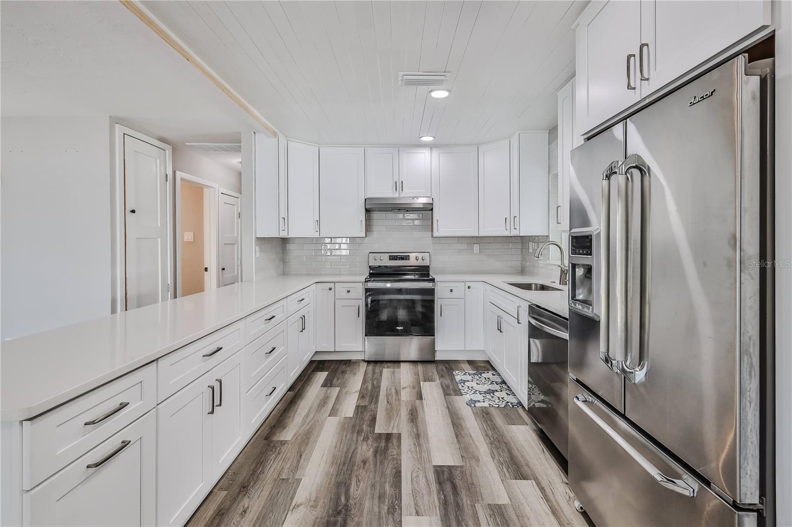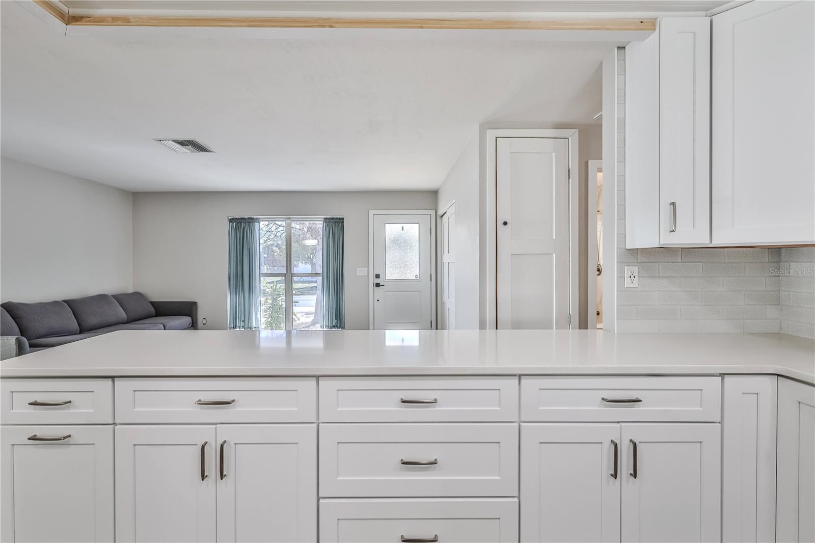 Step into this beautifully updated 2-bedroom, 1-bathroom home with a 1-car carport, where modern upgrades meet timeless comfort. Inside, you'll find new luxury vinyl plank flooring, designer lighting, and a completely renovated chef's kitchen featuring wood cabinets with soft-close drawers, quartz countertops, and stainless steel appliances. The bathroom has been tastefully updated with new vanity, toilet, tile, and flooring. The new front door and sliding glass doors enhance both style and energy efficiency. Enjoy extra living space in the enclosed porch, ready for your personal touch, leading to a screened and covered porch—ideal for relaxing or entertaining. Additional highlights include a 2023 electrical upgrade, a 2014 roof, and a 2011 HVAC system. A washer and dryer are conveniently located in the carport storage room. Vinyl privacy fence in rear yard. No HOA. Make an appointment today to see this home in person!