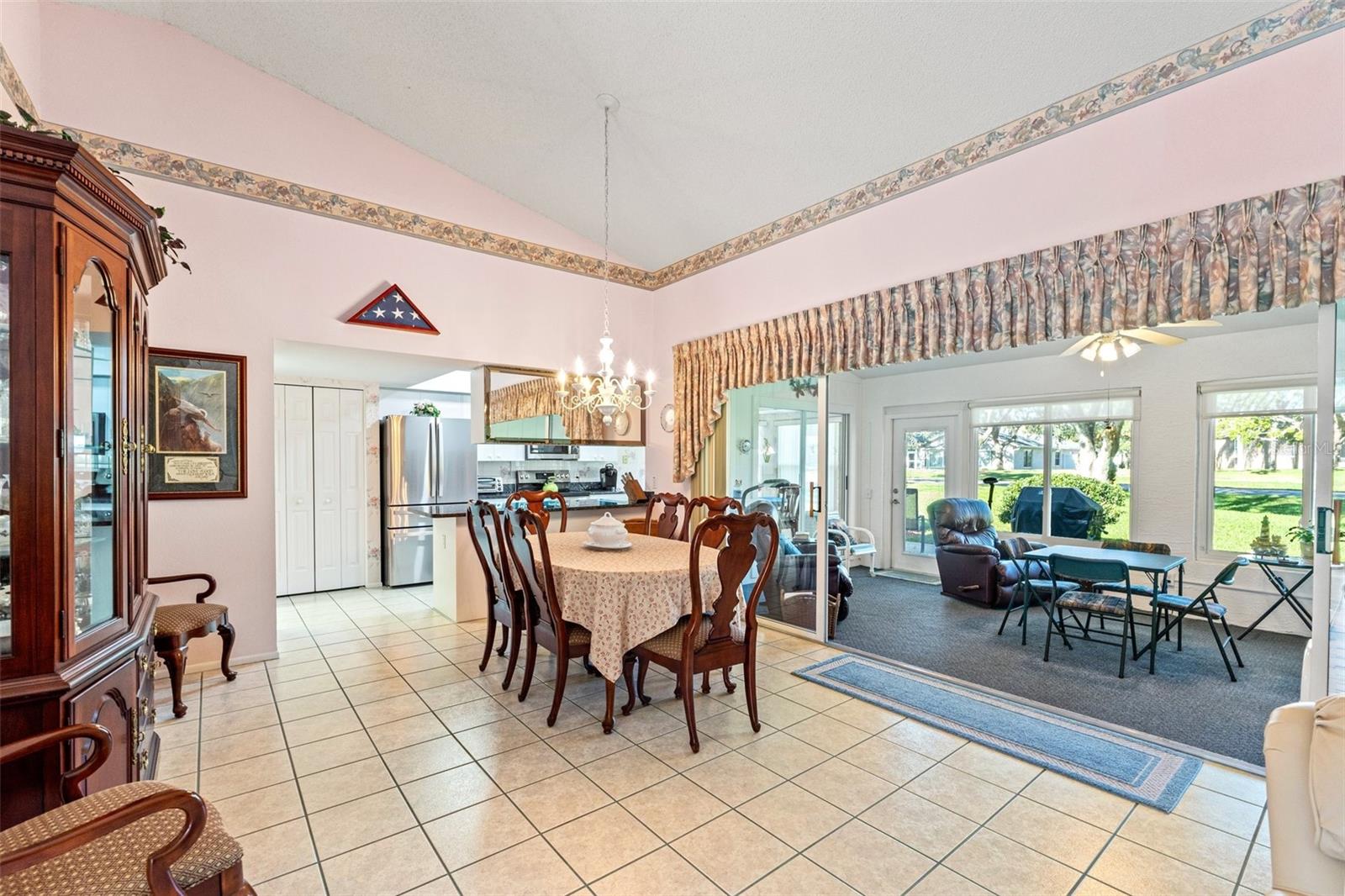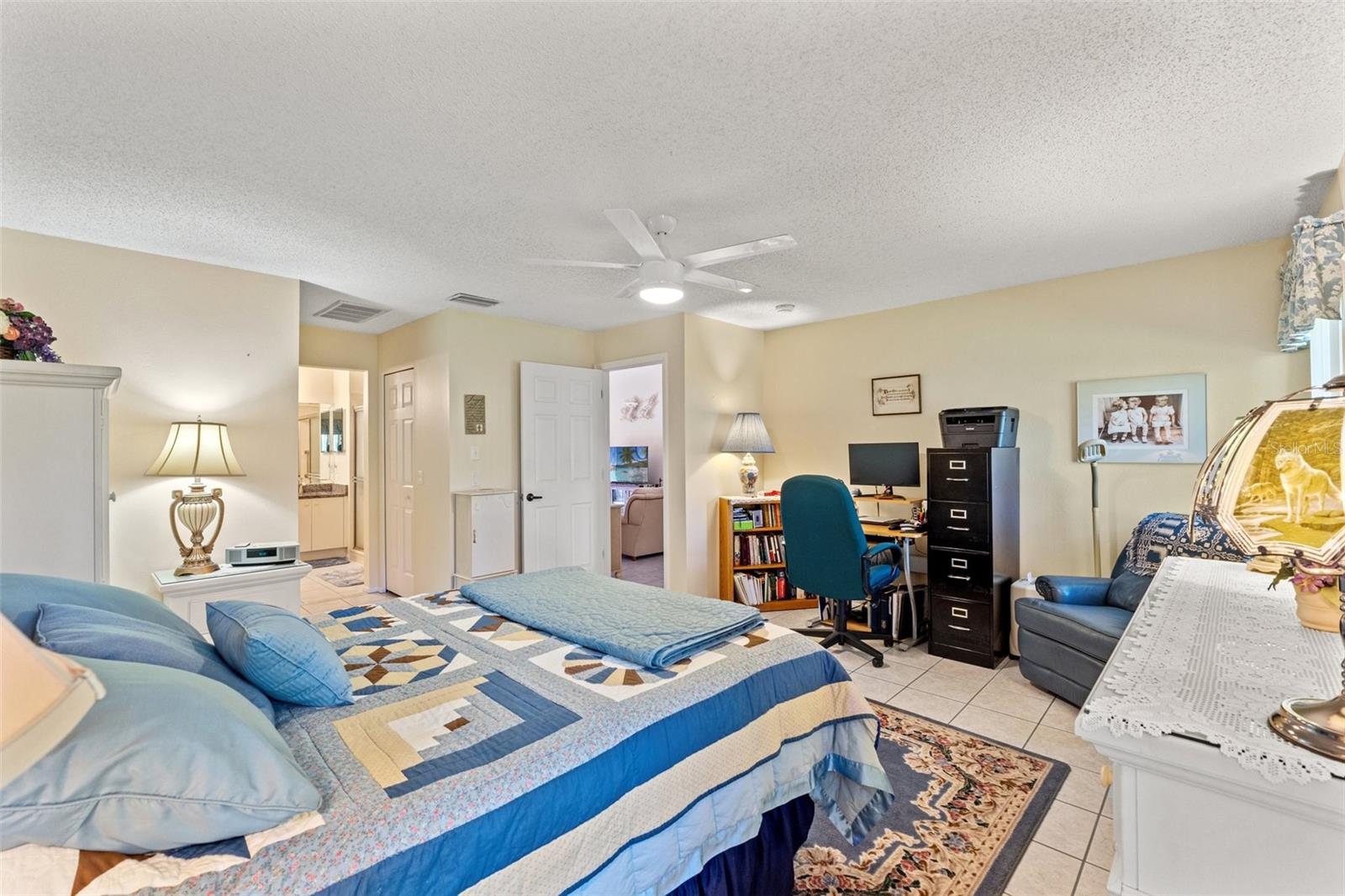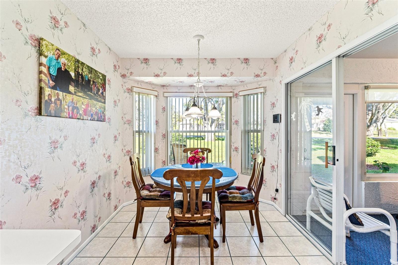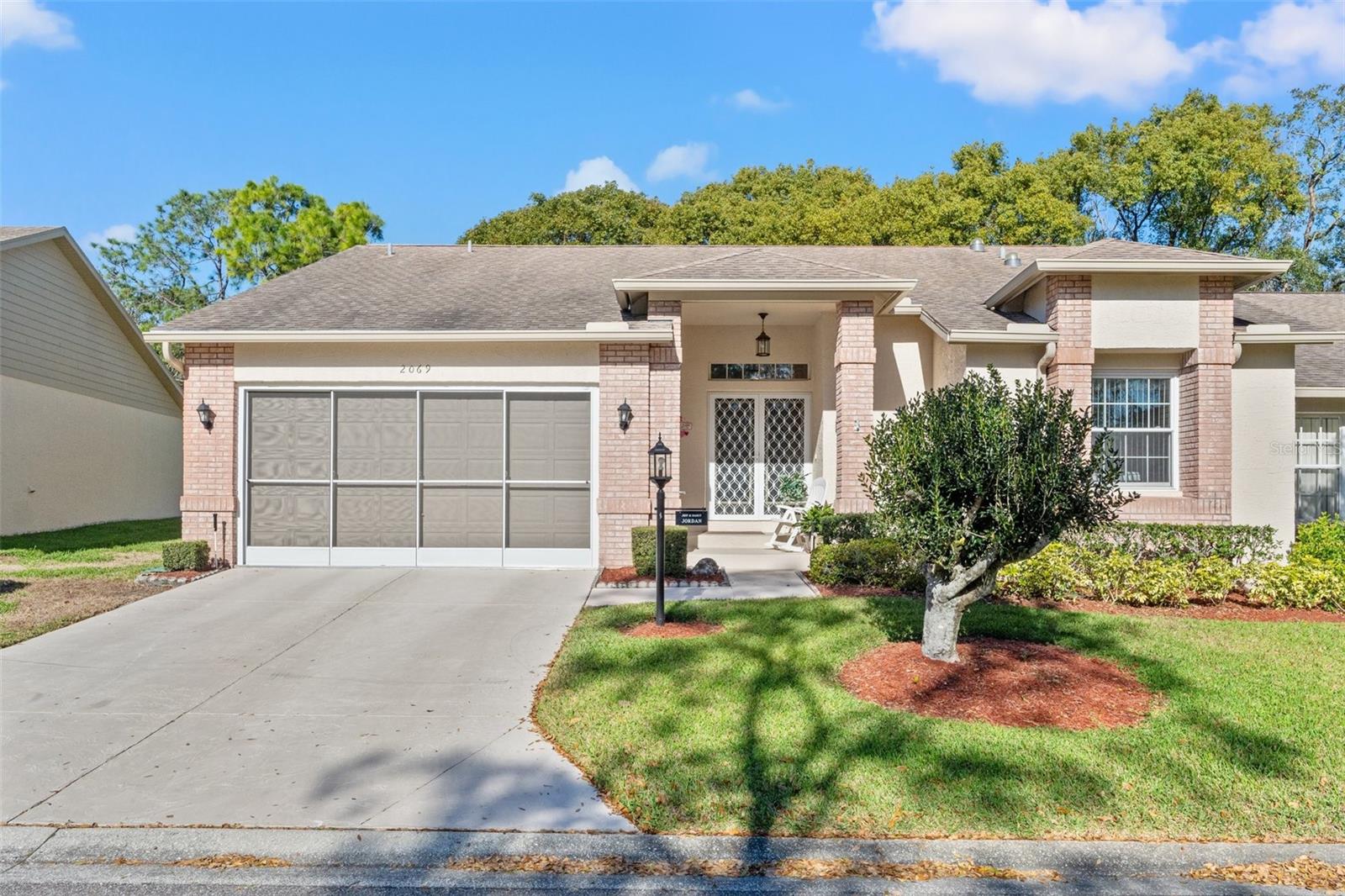 Amazing Villa in the award-winning Timber Pines community! This expanded Oakmont 2/2/2 model features a double-door entry, vaulted ceilings, and a light, bright open floor plan. Tiled flooring extends throughout the home, except for the carpeted lanai. A solar tube provides additional natural light. The updated kitchen boasts quartz countertops, ample cabinetry, a kitchen nook, a stainless steel sink, and appliances. Range and Microwave 2023. A pantry provides extra storage, and the inside laundry room includes a quartz countertop and additional cabinetry, leading to the garage. In the garage you will notice the home is equipped with an HVAC system featuring a whole-house filter (maintained yearly by Krueger), a water softener, a hurricane-reinforced garage door, a painted garage floor, and pull-down stairs for attic access. The guest bedroom includes an enlarged closet with a power outlet and is conveniently located near the guest bath, which features a granite vanity, a comfort-height commode, and a tub/shower combo. The spacious lanai is under heat and air, with new windows and shades, offering a comfortable space to relax year-round. An outdoor patio provides the perfect spot for grilling, entertaining, or unwinding. Gutter guards at the rear of the home and a side apron around the villa add termite protection. The primary bedroom offers additional space ideal for a desk or hobby area, along with two walk-in closets, a solar tube for natural light, and an en-suite bath. The bathroom features a step-in shower, a granite-top vanity with dual sinks and upgraded faucets, a comfort-height commode, and a linen closet. This is not a pet friendly village. Termite protection is included in the $122 monthly maintenance fee. Washer and Dryer do not convey This beautifully maintained villa is ready to welcome you home! Make this YOUR HOME & ENJOY THE GREAT LIFE TIMBER PINES has to offer, a gated, guarded, 55+ Active Adult Community. Timber Pines boasts 4 PRISTINE Golf Courses, Award winning pickle ball center, New state of the art Fitness/Wellness Center, Club House and Restaurant, Performing Arts Center, Residents Activity Center, 2 Geothermal Pools, Tennis, Billiards, Bocce, Wood Shop, Arts and Crafts Center, PAWS PARK for your pets. SO MANY ACTIVITIES with Over 100 Clubs. Spectrum Cable TV, 2 Boxes, and highest speed internet included in HOA fee. New buyer pays $2640 Capital Contribution to TPCA at closing. CALL TODAY!!!