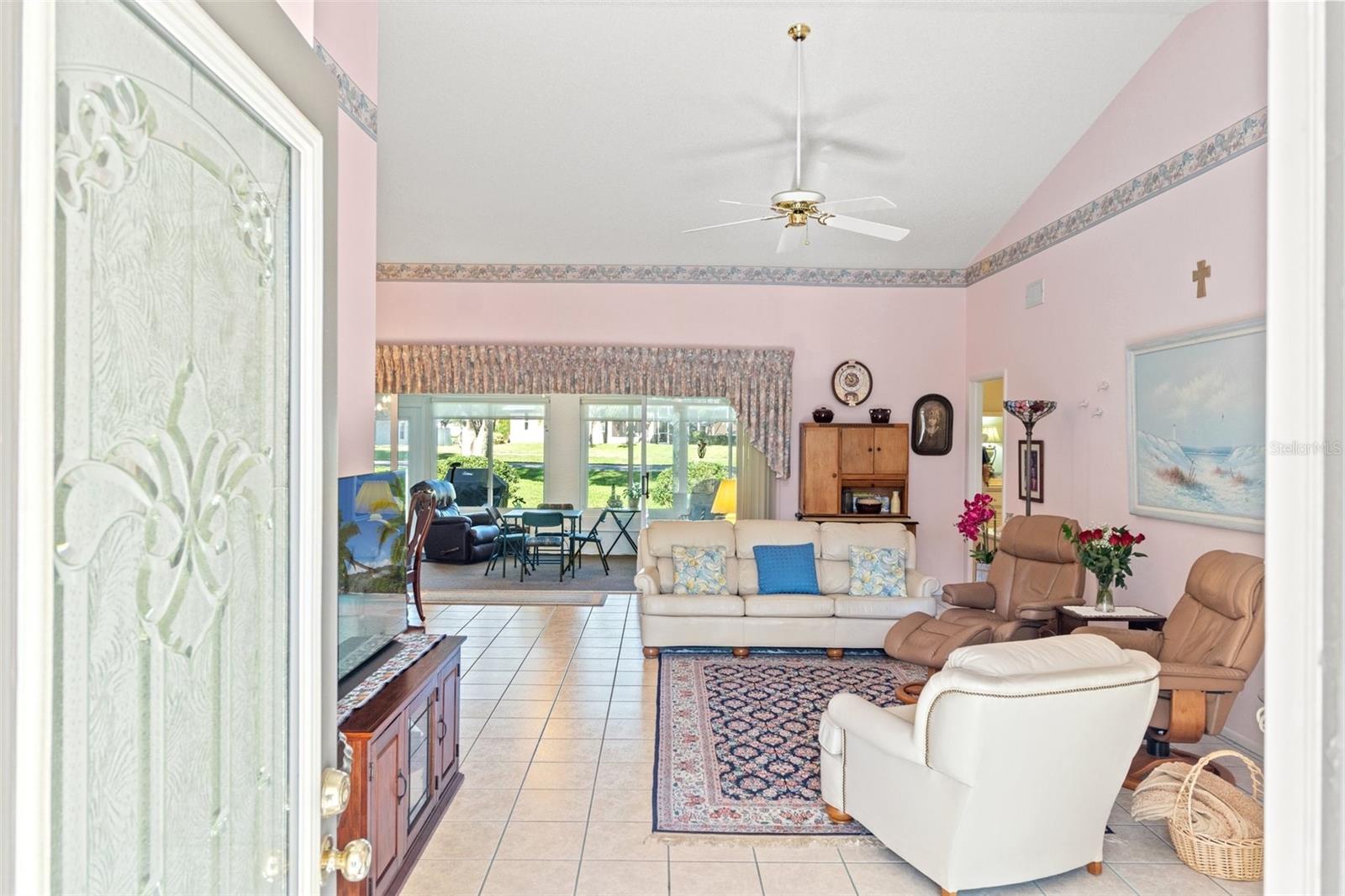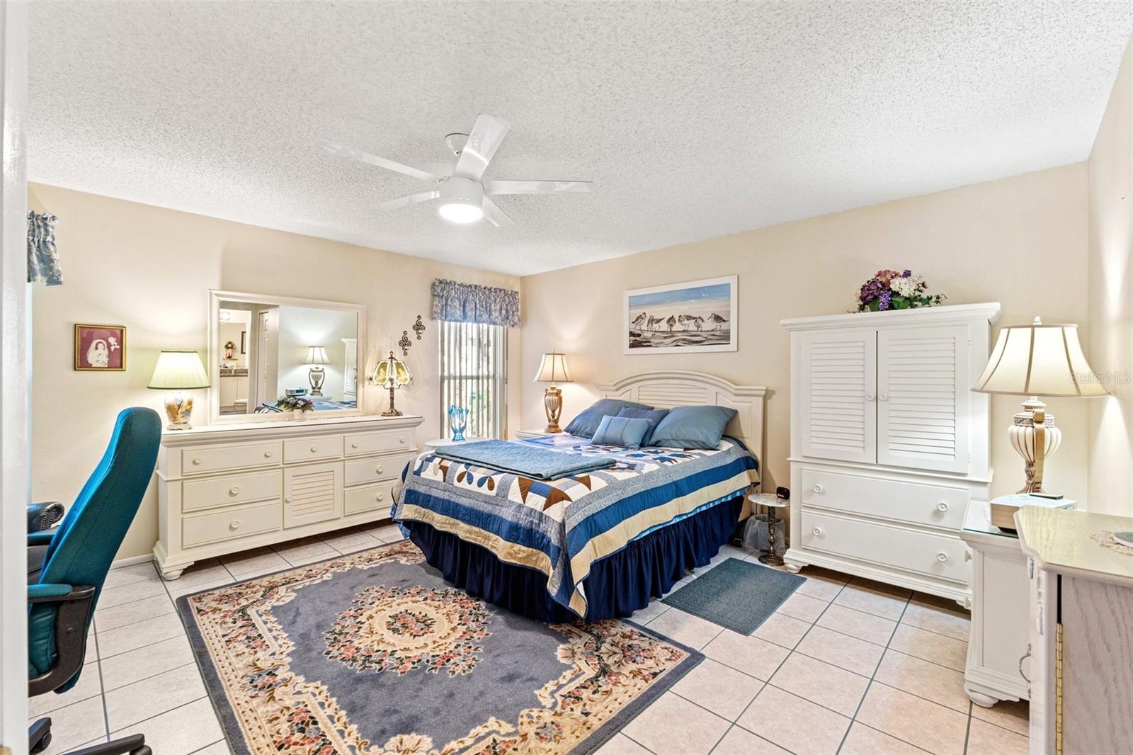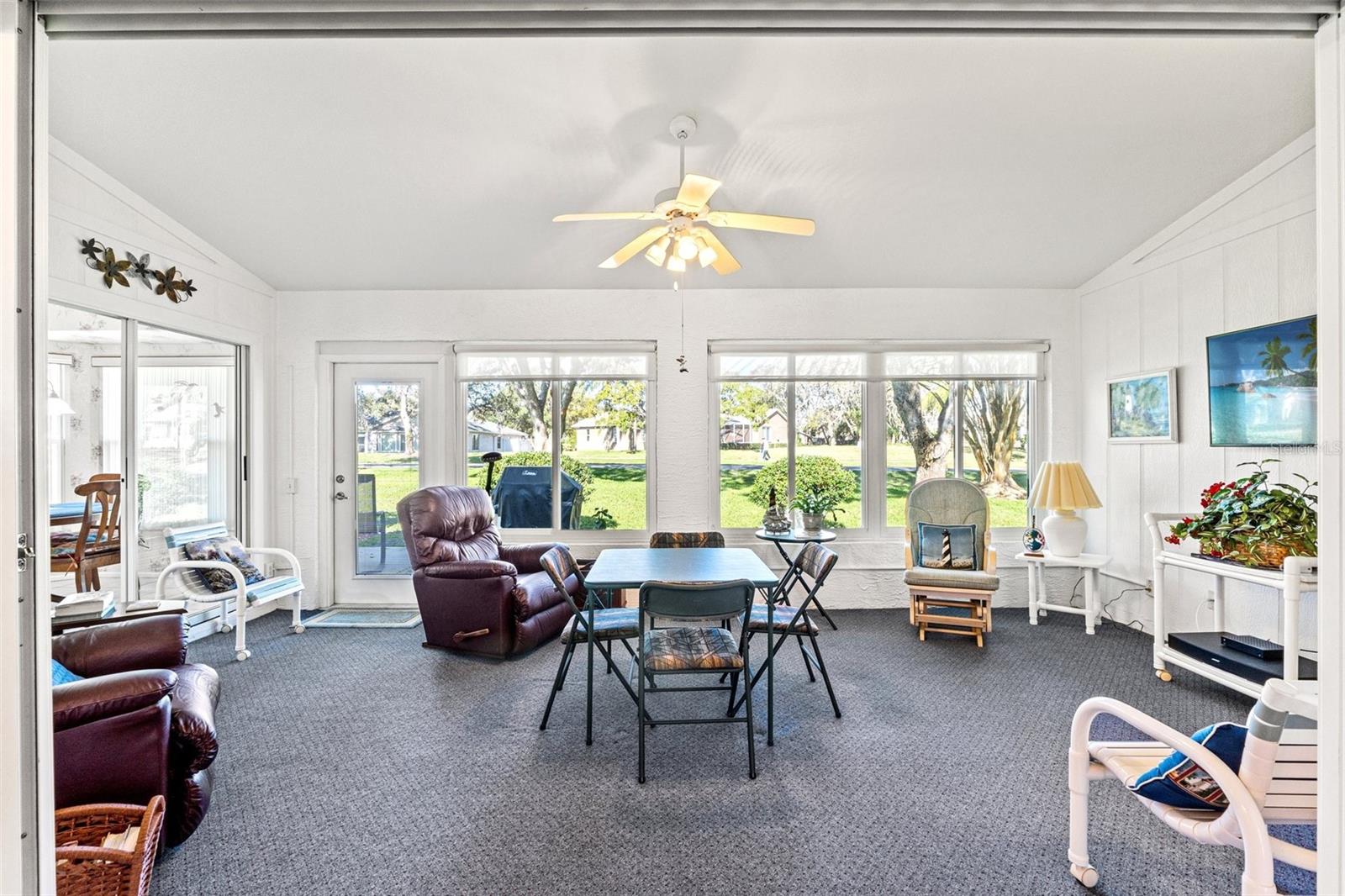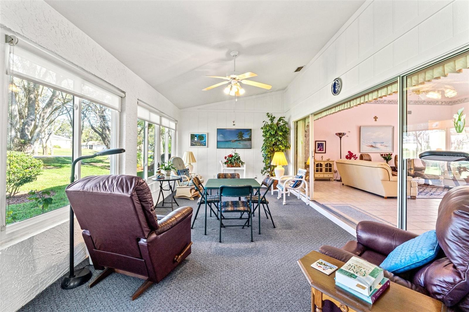 Amazing Villa in the award-winning Timber Pines community! This expanded Oakmont 2/2/2 model features a double-door entry, vaulted ceilings, and a light, bright open floor plan. Tiled flooring extends throughout the home, except for the carpeted lanai. A solar tube provides additional natural light. The updated kitchen boasts quartz countertops, ample cabinetry, a kitchen nook, a stainless steel sink, and appliances. Range and Microwave 2023. A pantry provides extra storage, and the inside laundry room includes a quartz countertop and additional cabinetry, leading to the garage. In the garage you will notice the home is equipped with an HVAC system featuring a whole-house filter (maintained yearly by Krueger), a water softener, a hurricane-reinforced garage door, a painted garage floor, and pull-down stairs for attic access. The guest bedroom includes an enlarged closet with a power outlet and is conveniently located near the guest bath, which features a granite vanity, a comfort-height commode, and a tub/shower combo. The spacious lanai is under heat and air, with new windows and shades, offering a comfortable space to relax year-round. An outdoor patio provides the perfect spot for grilling, entertaining, or unwinding. Gutter guards at the rear of the home and a side apron around the villa add termite protection. The primary bedroom offers additional space ideal for a desk or hobby area, along with two walk-in closets, a solar tube for natural light, and an en-suite bath. The bathroom features a step-in shower, a granite-top vanity with dual sinks and upgraded faucets, a comfort-height commode, and a linen closet. This is not a pet friendly village. Termite protection is included in the $122 monthly maintenance fee. Washer and Dryer do not convey This beautifully maintained villa is ready to welcome you home! Make this YOUR HOME & ENJOY THE GREAT LIFE TIMBER PINES has to offer, a gated, guarded, 55+ Active Adult Community. Timber Pines boasts 4 PRISTINE Golf Courses, Award winning pickle ball center, New state of the art Fitness/Wellness Center, Club House and Restaurant, Performing Arts Center, Residents Activity Center, 2 Geothermal Pools, Tennis, Billiards, Bocce, Wood Shop, Arts and Crafts Center, PAWS PARK for your pets. SO MANY ACTIVITIES with Over 100 Clubs. Spectrum Cable TV, 2 Boxes, and highest speed internet included in HOA fee. New buyer pays $2640 Capital Contribution to TPCA at closing. CALL TODAY!!!