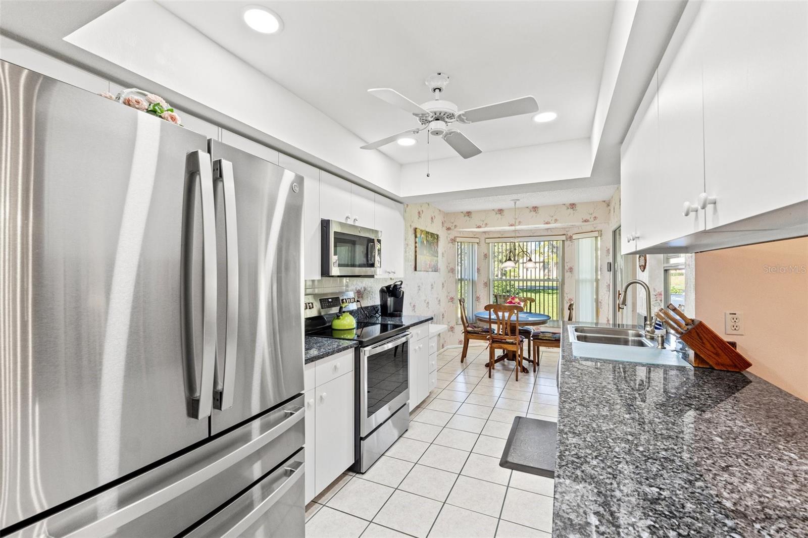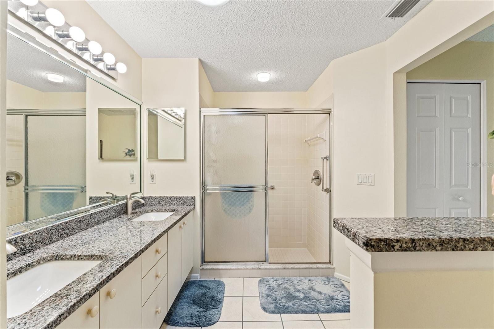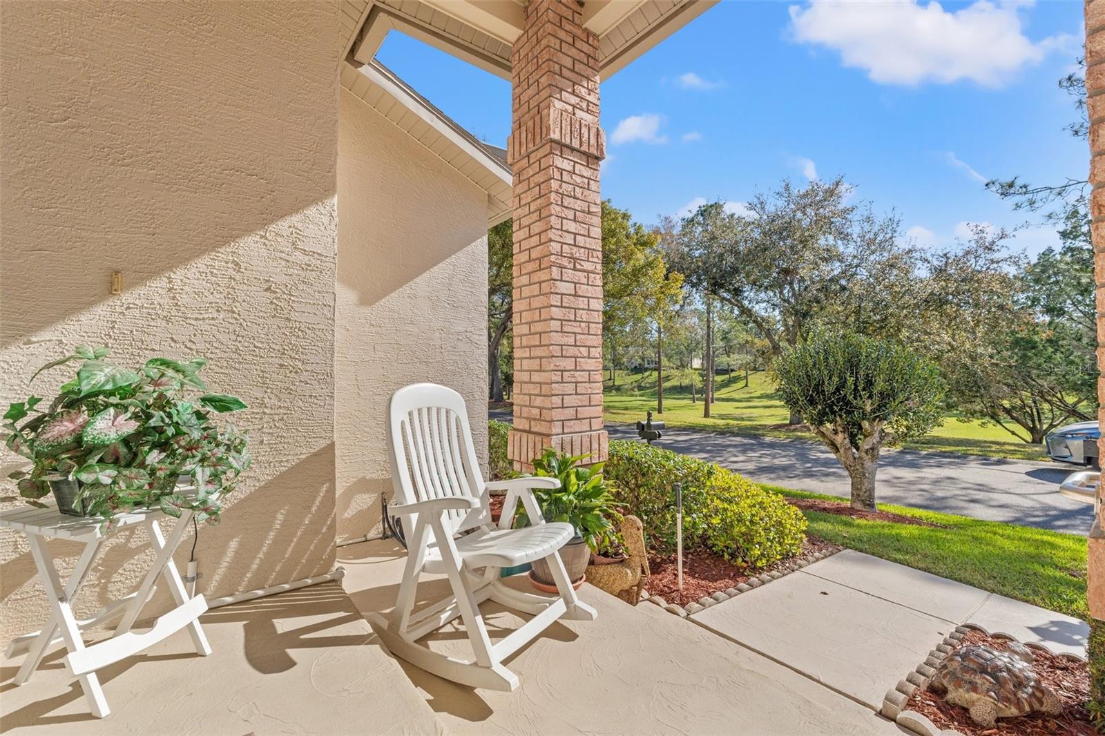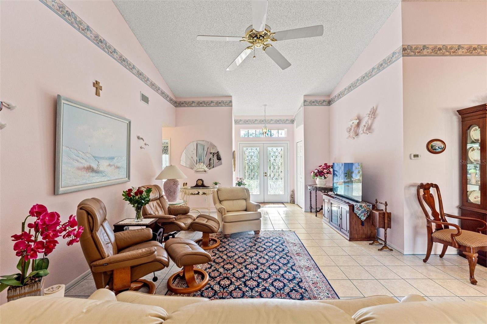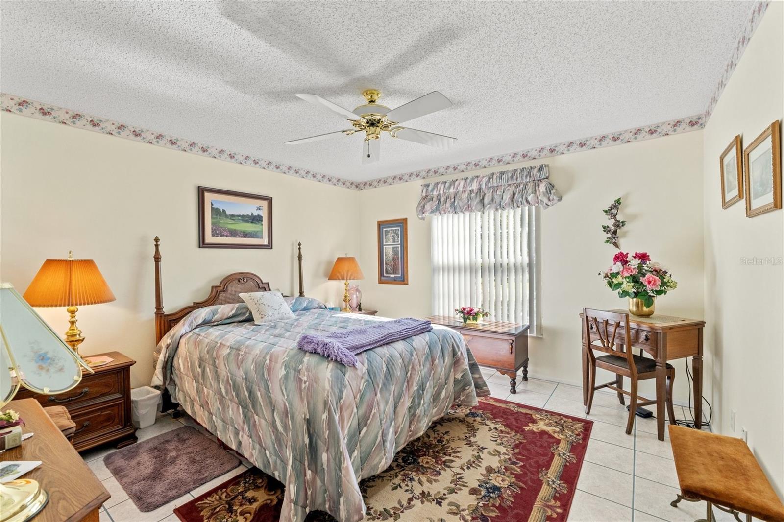 Amazing Villa in the award-winning Timber Pines community! This expanded Oakmont 2/2/2 model features a double-door entry, vaulted ceilings, and a light, bright open floor plan. Tiled flooring extends throughout the home, except for the carpeted lanai. A solar tube provides additional natural light. The updated kitchen boasts quartz countertops, ample cabinetry, a kitchen nook, a stainless steel sink, and appliances. Range and Microwave 2023. A pantry provides extra storage, and the inside laundry room includes a quartz countertop and additional cabinetry, leading to the garage. In the garage you will notice the home is equipped with an HVAC system featuring a whole-house filter (maintained yearly by Krueger), a water softener, a hurricane-reinforced garage door, a painted garage floor, and pull-down stairs for attic access. The guest bedroom includes an enlarged closet with a power outlet and is conveniently located near the guest bath, which features a granite vanity, a comfort-height commode, and a tub/shower combo. The spacious lanai is under heat and air, with new windows and shades, offering a comfortable space to relax year-round. An outdoor patio provides the perfect spot for grilling, entertaining, or unwinding. Gutter guards at the rear of the home and a side apron around the villa add termite protection. The primary bedroom offers additional space ideal for a desk or hobby area, along with two walk-in closets, a solar tube for natural light, and an en-suite bath. The bathroom features a step-in shower, a granite-top vanity with dual sinks and upgraded faucets, a comfort-height commode, and a linen closet. This is not a pet friendly village. Termite protection is included in the $122 monthly maintenance fee. Washer and Dryer do not convey This beautifully maintained villa is ready to welcome you home! Make this YOUR HOME & ENJOY THE GREAT LIFE TIMBER PINES has to offer, a gated, guarded, 55+ Active Adult Community. Timber Pines boasts 4 PRISTINE Golf Courses, Award winning pickle ball center, New state of the art Fitness/Wellness Center, Club House and Restaurant, Performing Arts Center, Residents Activity Center, 2 Geothermal Pools, Tennis, Billiards, Bocce, Wood Shop, Arts and Crafts Center, PAWS PARK for your pets. SO MANY ACTIVITIES with Over 100 Clubs. Spectrum Cable TV, 2 Boxes, and highest speed internet included in HOA fee. New buyer pays $2640 Capital Contribution to TPCA at closing. CALL TODAY!!!
