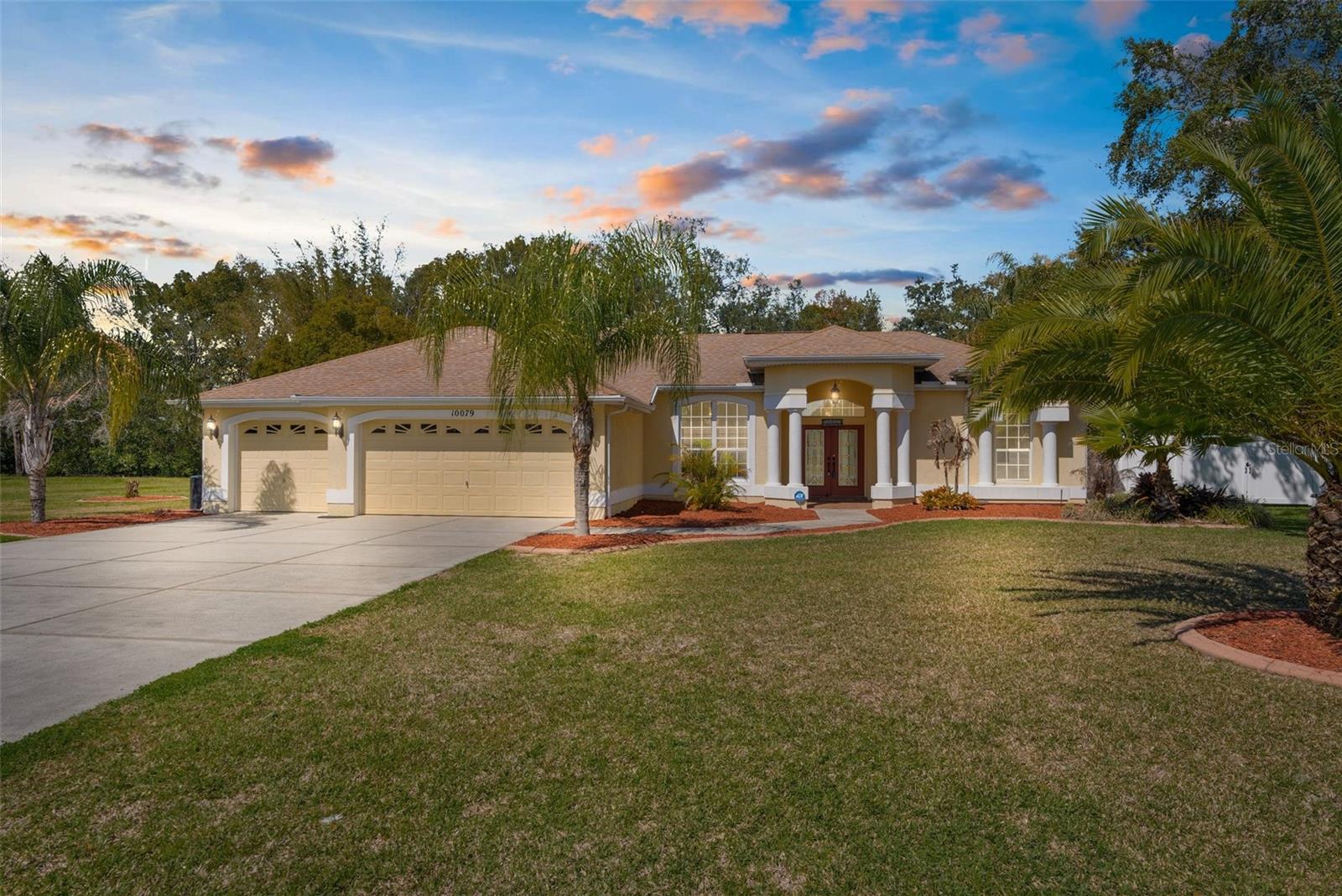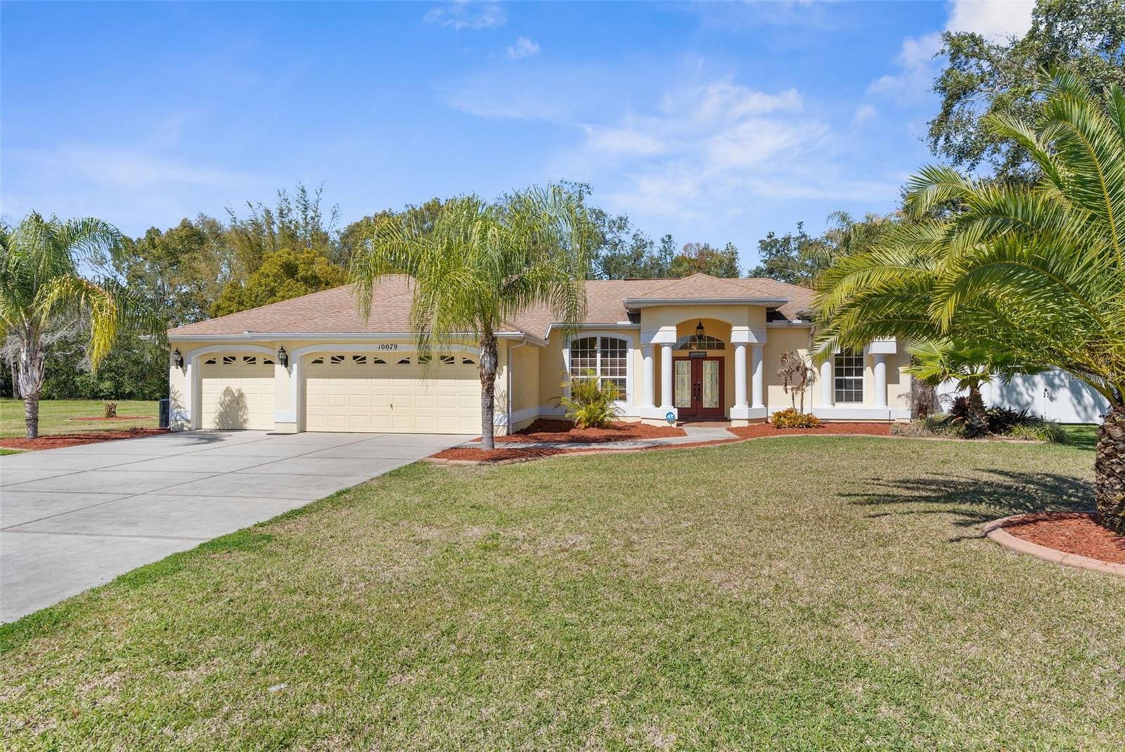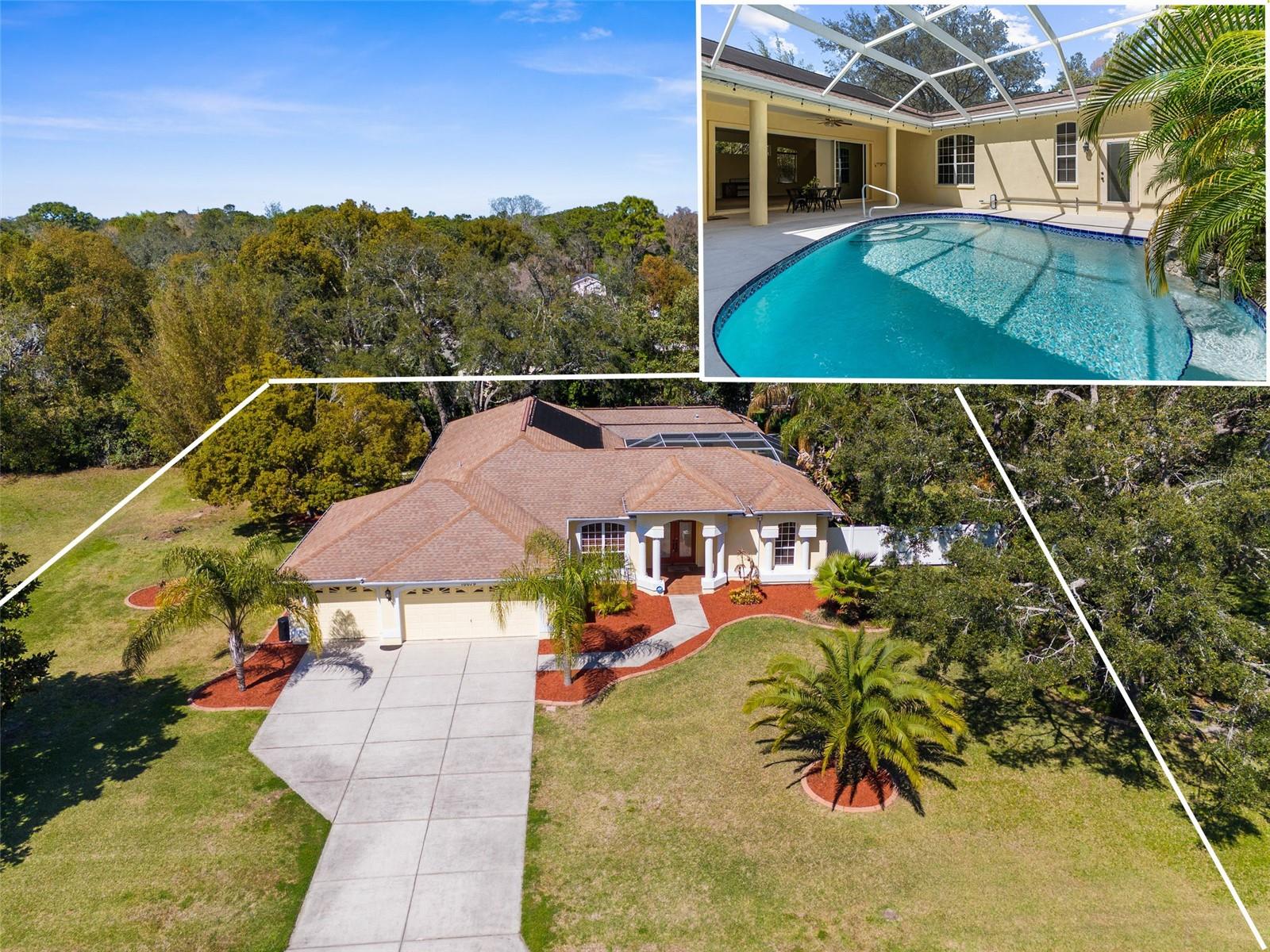 GORGEOUS, MOVE-IN READY, LARGE, 3/3/3 COURTYARD POOL HOME was built by ARTISTIC HOMES...nestled on a 1/2 acre in the highly sought-after neighborhood of Orchard Park with larger lots and custom homes!! Home offers a Double Master Suite or Mother-in-law Suite with separate entrance to the pool/courtyard!! Home will get a NEW ROOF before closing; buyer can pick out the color of the shingles! Large home with 2,357 sq feet of living space; 3,387 total sq feet!! 3 generous-sized bedrooms + office/den with modern barn-doors (can use as 4th bedroom or formal dining room) + 3 full bathrooms (2 with pool access) + 3 car oversized and extra deep garage for your large trucks or boat!! Extra long and wide driveway for extra parking, too!! Open floor plan with high tray ceiling and large glass sliders to the pool let in so much natural light the home feels incredibly spacious, light, bright, and cheery!! GREAT FLOOR PLAN for entertaining your family and friends!! Kitchen is upgraded with granite countertops, large breakfast bar for extra seating, stainless steel appliances and lots of cabinet space for storage! Kitchen overlooks your private pool, great room, breakfast nook, and lanai...beautiful floor plan by Artistic Homes!! Enjoy your pool without any neighbors looking at you!! The master has dual walk-in closets, ensuite bathroom with dual sinks, granite countertops, large soaking tub, separate walk-in shower and private toilet room...with access to the pool! The other master suite (mother-in-law suite) is off to itself with dual closets, ensuite bathroom with walk-in shower and access to the pool! The large 3rd bedroom also has its own bathroom with tub/shower combo! Large inside laundry room! Beautiful palm trees and grand entrance welcome your guests! Walk into the very large foyer with glass sliders to the pool for an impressive entrance into the home!! NO FLOOD!! NO CDD!! Low HOA of only $225/year to keep your neighborhood nice!! Located close to restaurants, shopping, movies, coffee shops. 10 minutes to the Suncoast Parkway for easy access to Tampa for work and play. Tampa General Hospital Spring Hill is 7-8 minutes away! 15 minutes to kayaking the clear Weeki Wachee River, swimming with the manatees, sunsets at Pine Island, fishing and boating on the Gulf of America!! Come see this spectacular home! NEW ROOF 2025 before closing. AC 2013. Home is in great shape!!