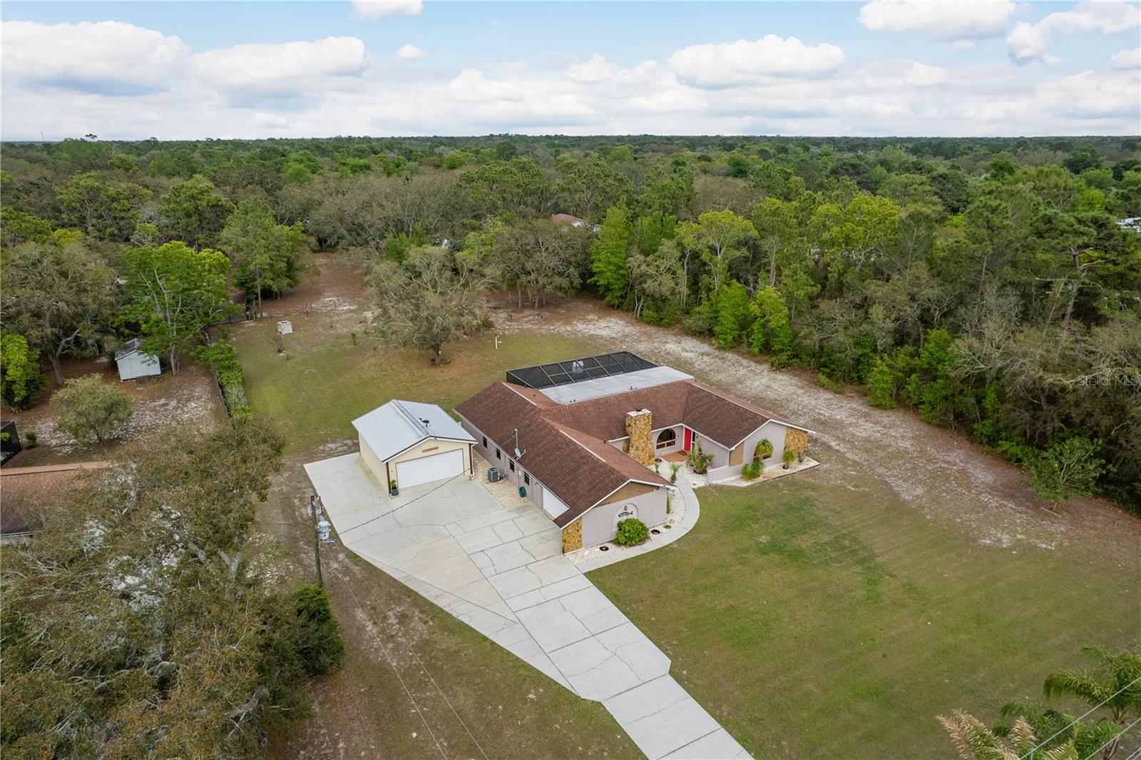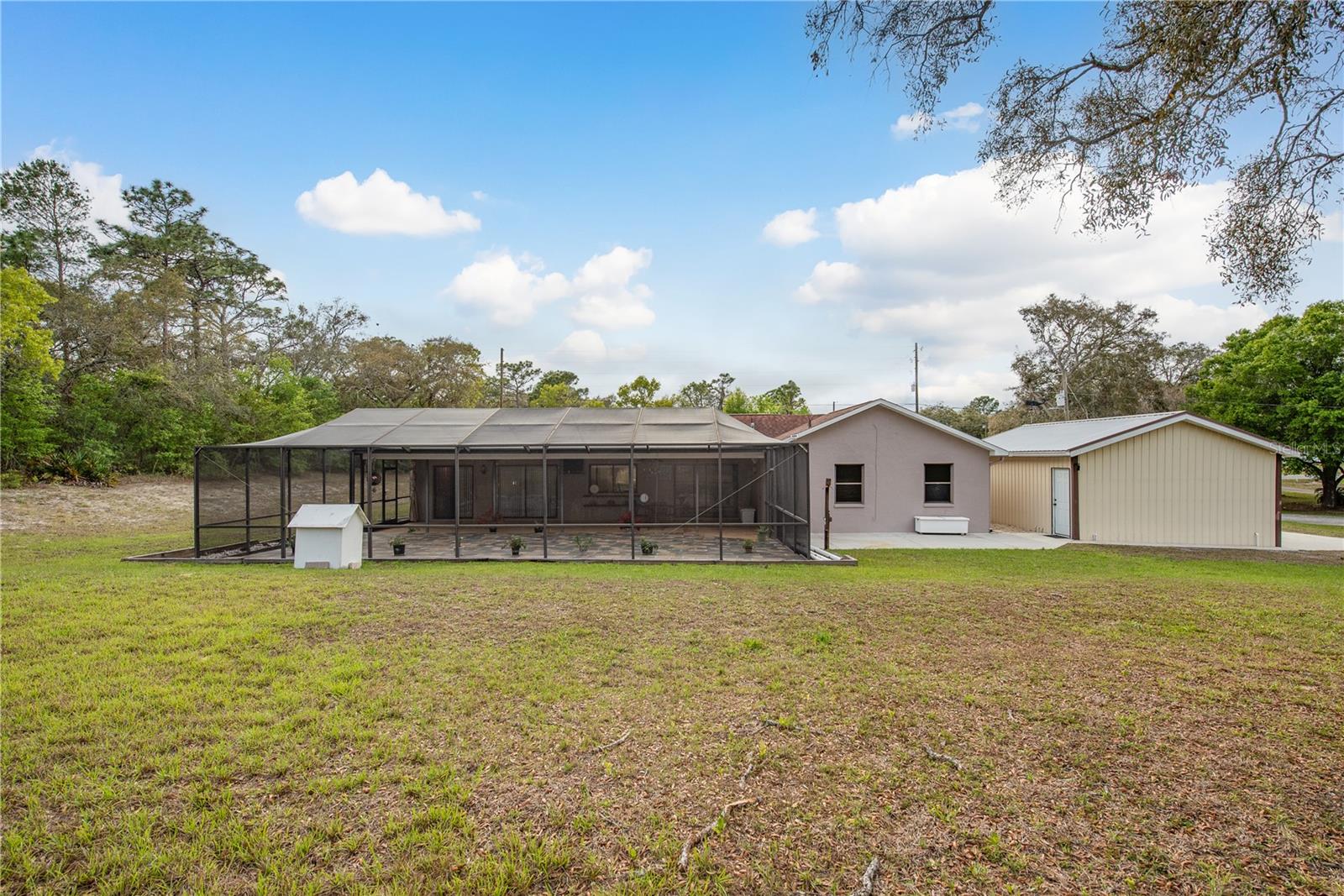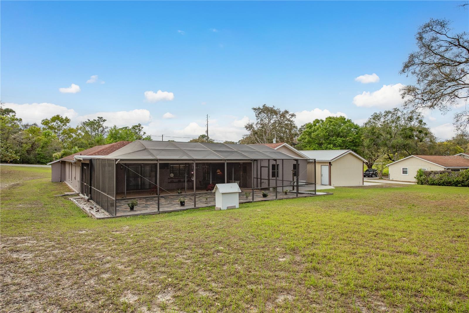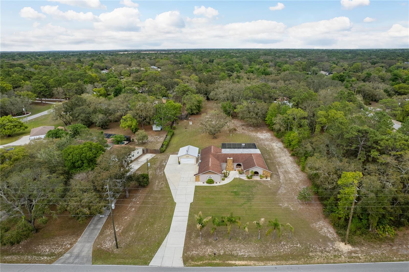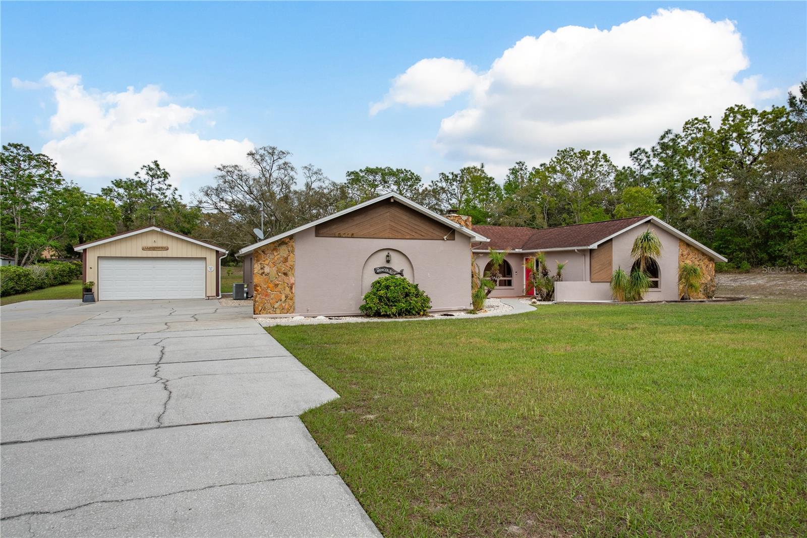 This Spring Hill home is high and dry, NO HOA or CDD! This beautiful 4/3 FULL baths home in the desirable Highlands neighborhood is move in ready! Open floor plan with tile through-out, with the exception of the Family Room. The spacious Master bedroom has a walk-in closet and en-suite bath with sliding glass doors that lead to the lanai, and a dining room and den/family room on that end of the home. The split floor plan has a guest bath and one of the 3 bedrooms on this end of the home has another full bath that leads to the lanai. so guests/family have a separate entrance into the home. The living room off the kitchen area also has sliding glass doors that lead to the lanai. There's an attached garage AND a detached garage/workshop, both with metal roofs!! A concrete RV pad with water and electric hook-ups! This home is zoned AR-1 agriculture, everyone has acreage and plenty of room for your animals, gardening, etc! This neighborhood is known for Pigeon Racing Lofts for the Pigeon racing hobbyists. Close to all the shopping, restaurants, the Suncoast Parkway is just 3.5 miles up County Line and Tampa Int'l Airport is just 45 minutes away! US 19 is just 5 miles to the west. TGH Spring Hill is just 1.5 miles away. The large screened-in lanai has beautiful pavers and would be great for relaxing in the evening or having parties!