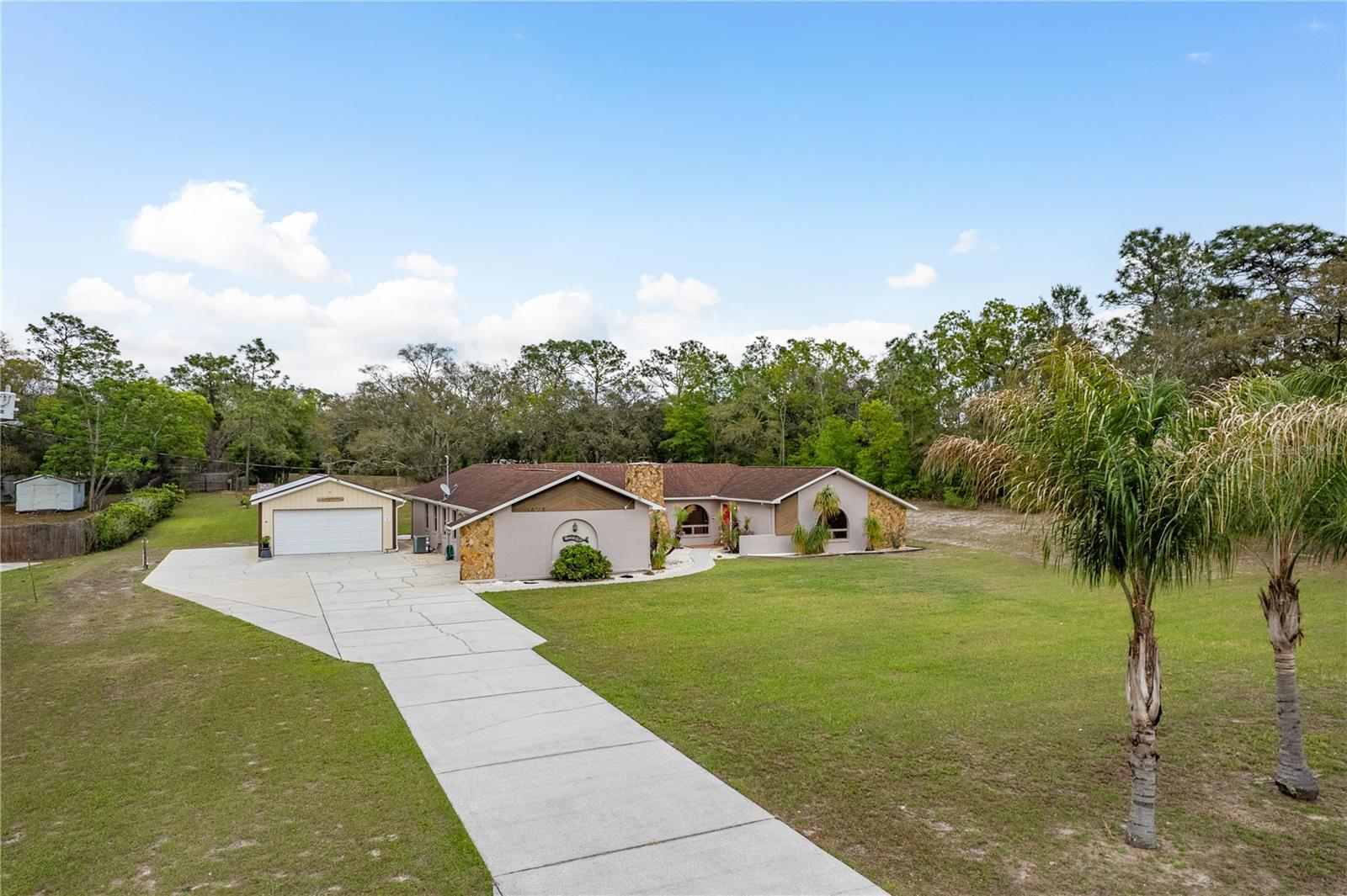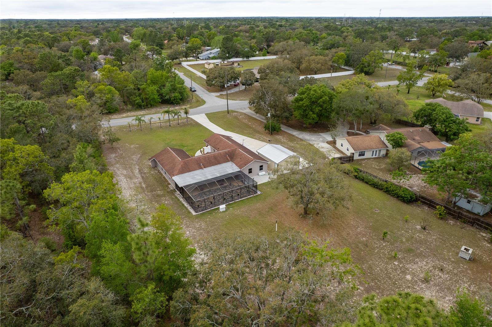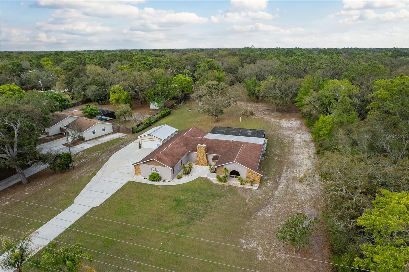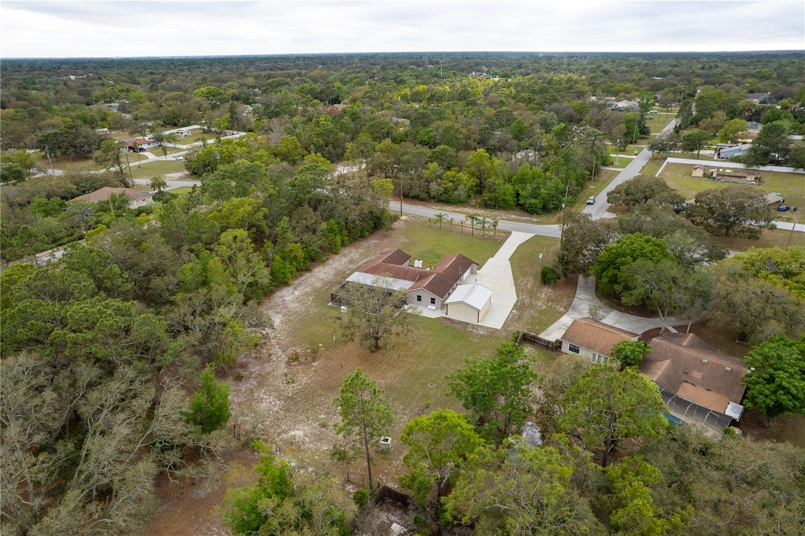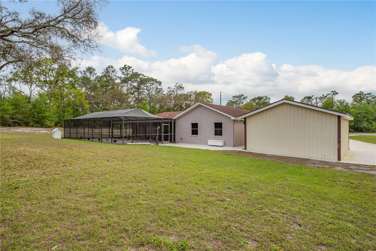 This Spring Hill home is high and dry, NO HOA or CDD! This beautiful 4/3 FULL baths home in the desirable Highlands neighborhood is move in ready! Open floor plan with tile through-out, with the exception of the Family Room. The spacious Master bedroom has a walk-in closet and en-suite bath with sliding glass doors that lead to the lanai, and a dining room and den/family room on that end of the home. The split floor plan has a guest bath and one of the 3 bedrooms on this end of the home has another full bath that leads to the lanai. so guests/family have a separate entrance into the home. The living room off the kitchen area also has sliding glass doors that lead to the lanai. There's an attached garage AND a detached garage/workshop, both with metal roofs!! A concrete RV pad with water and electric hook-ups! This home is zoned AR-1 agriculture, everyone has acreage and plenty of room for your animals, gardening, etc! This neighborhood is known for Pigeon Racing Lofts for the Pigeon racing hobbyists. Close to all the shopping, restaurants, the Suncoast Parkway is just 3.5 miles up County Line and Tampa Int'l Airport is just 45 minutes away! US 19 is just 5 miles to the west. TGH Spring Hill is just 1.5 miles away. The large screened-in lanai has beautiful pavers and would be great for relaxing in the evening or having parties!