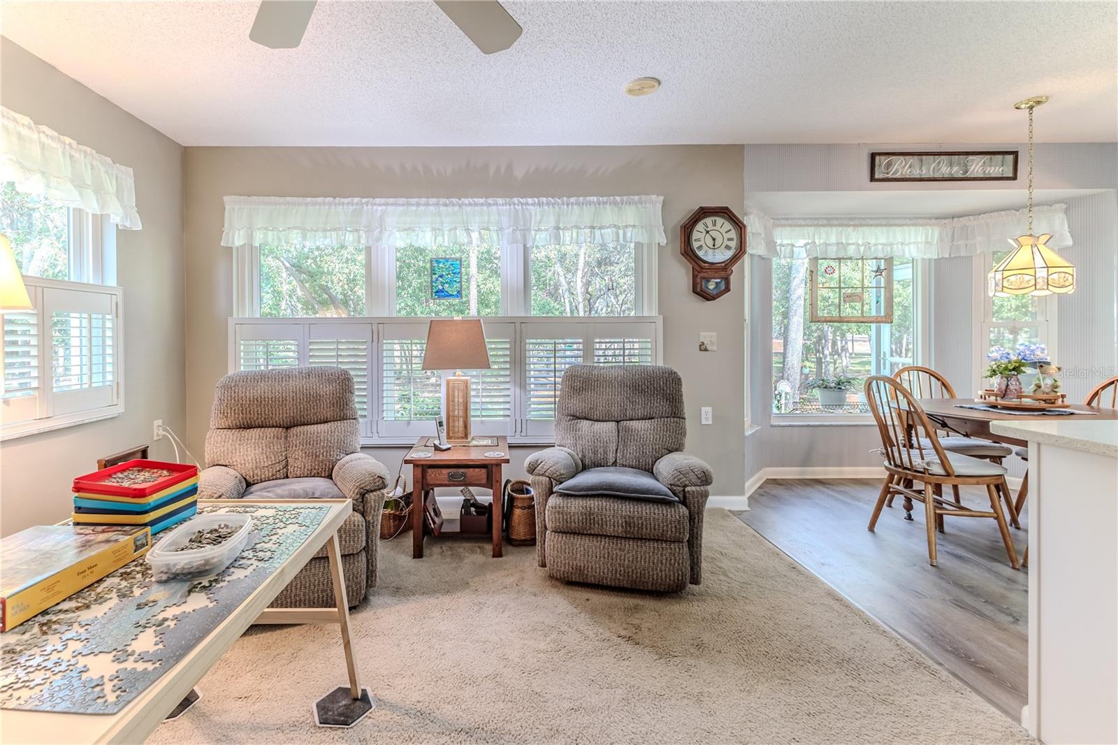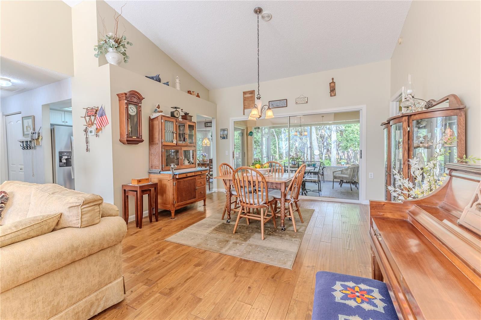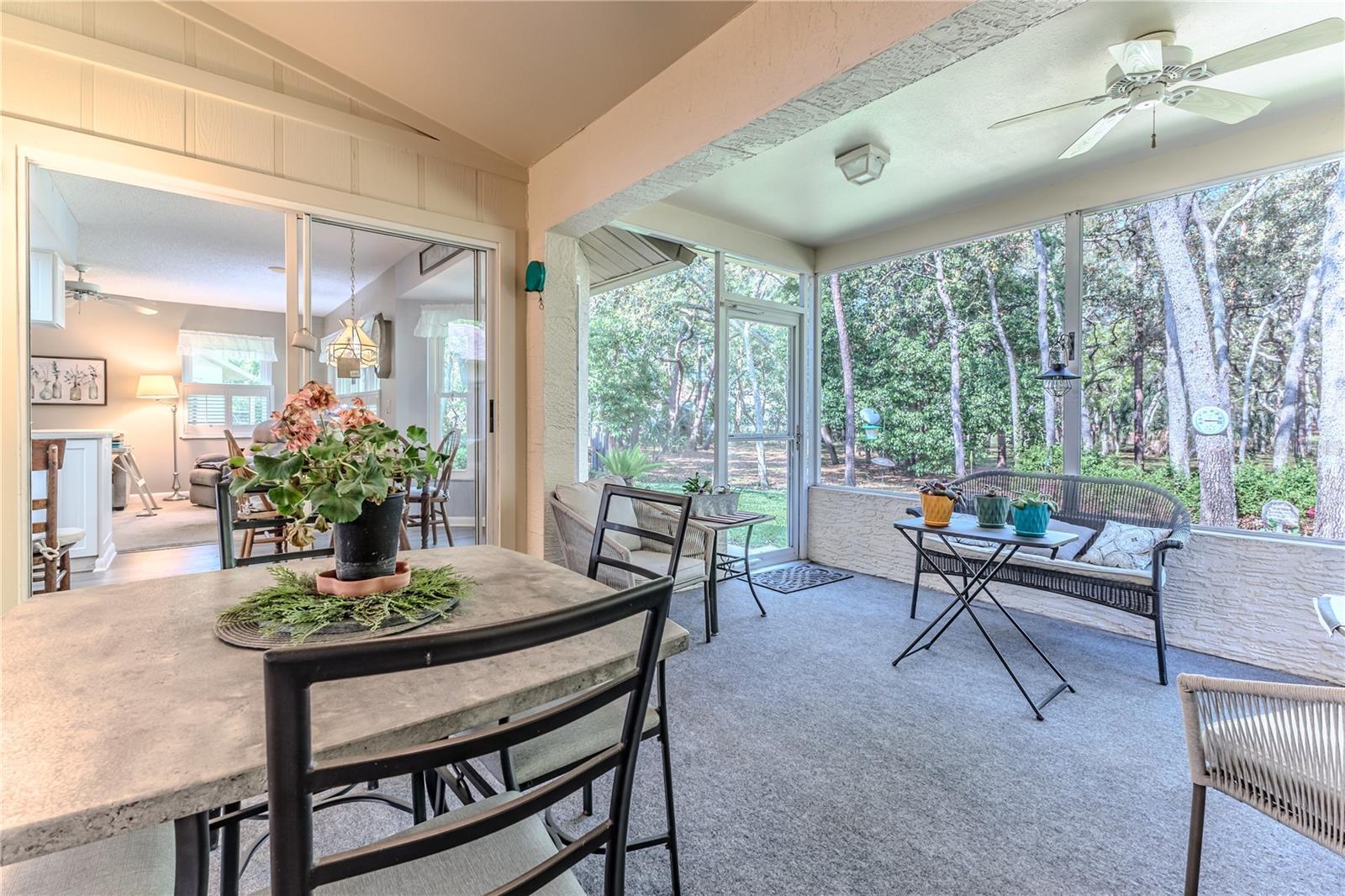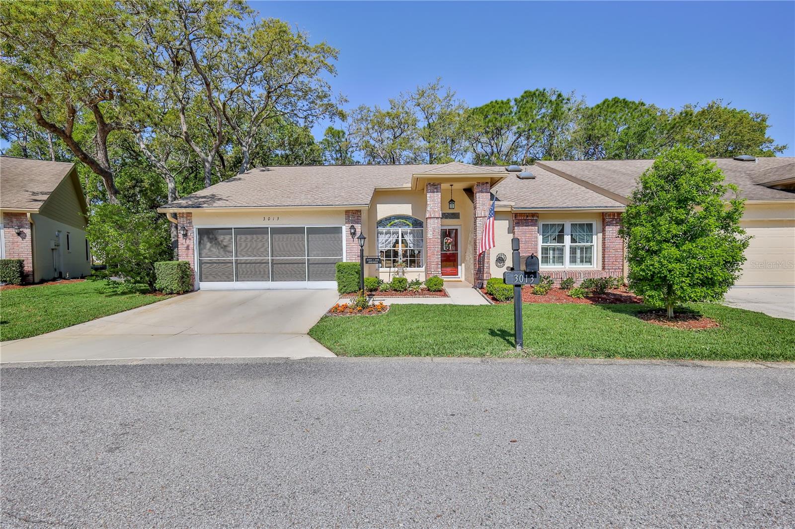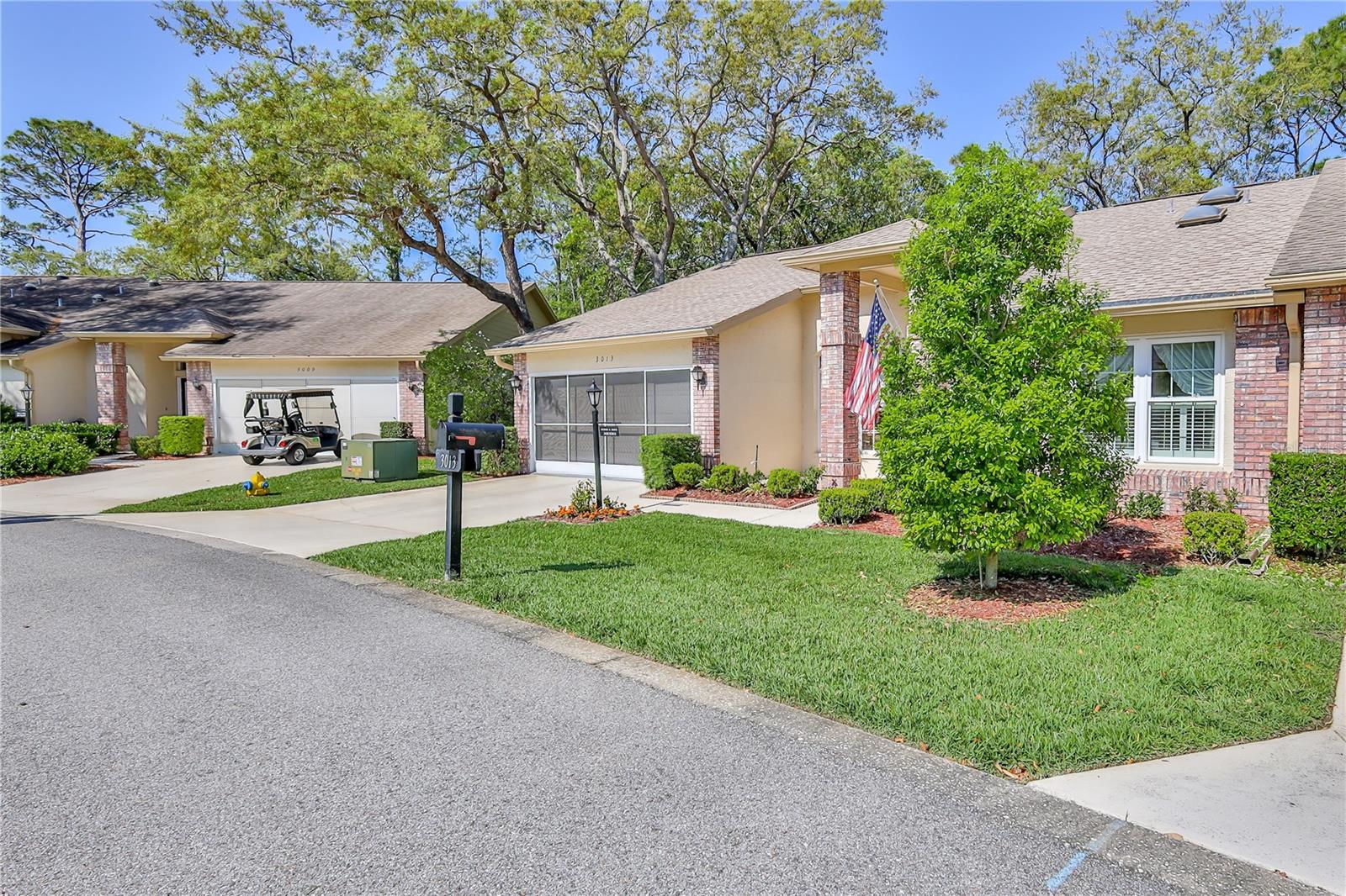 This is the one!! This charming, one owner, updated end-unit villa offers everything you need, including a golf cart, for comfortable and stylish living. Step inside to discover, two spacious bedrooms, updated kitchen, plantation shutters, a living room and family room, providing ample accommodations for you and your guests. The kitchen is a bright and welcoming space, featuring newer wood cabinets, gorgeous quartz counters, newer appliances, ample pantry storage, luxury vinyl plank flooring, and a cozy breakfast nook where you can start your mornings with beautiful garden views. The heart of the home features a delightful dining room and living room combo, adorned with wood floors, a piano and vaulted ceilings that create an airy, open atmosphere. From here, you'll enjoy additional living space in the enclosed lanai. The main bedroom, located at the rear of the home, is a true retreat with a door to the lanai, two California-closets, offering ample storage for all your wardrobe needs. The updated ensuite bathroom boasts a walk-in shower and linen closet. The guest bedroom is generously sized and conveniently located near the hall bathroom, perfect for visitors. Additional storage is available with two hall closets. The property also includes a two-car garage, pull-down stairs to the attic, fridge in garage. The oversized, inside laundry room includes washer, dryer, cabinets and utility sink. Updates include a new roof in 2012, newer windows, HVAC 2015, newer water heater, rain gutters screens. Additionally, furniture is offered outside the villa sale, making your move even easier. The Woodlands Village fee is $126/month, allows one dog, includes irrigation, lawn mowing, fertilization, weed control, front shrub trims, exterior painting, termite protection. Timber Pines, an award-winning, guard-gated 55+ deed-restricted community, offers access to an exceptional lifestyle. Residents enjoy three 18-hole golf courses, a 9-hole pitch & putt, tennis courts, 12 pickleball courts, two community pools, a country club restaurant and bar, a state-of-the-art fitness center, a woodworking shop, billiards, a performing arts center, and a vibrant array of clubs and activities. Don't miss the chance to make this delightful villa your new home, where comfort meets convenience. Contact us today to schedule your showing!