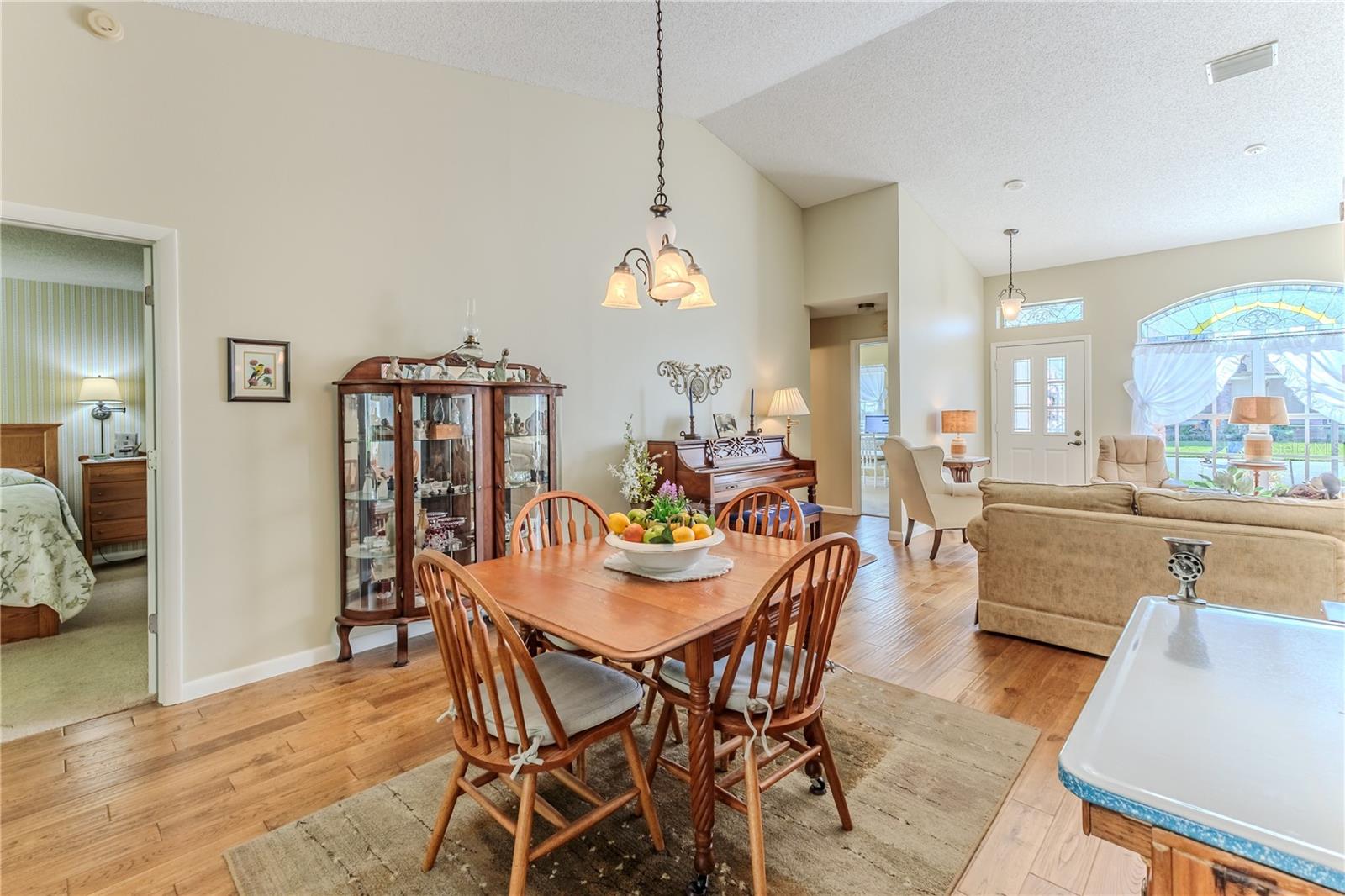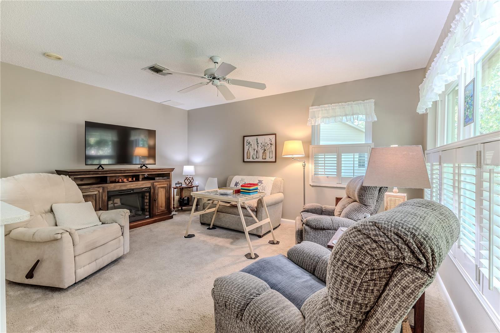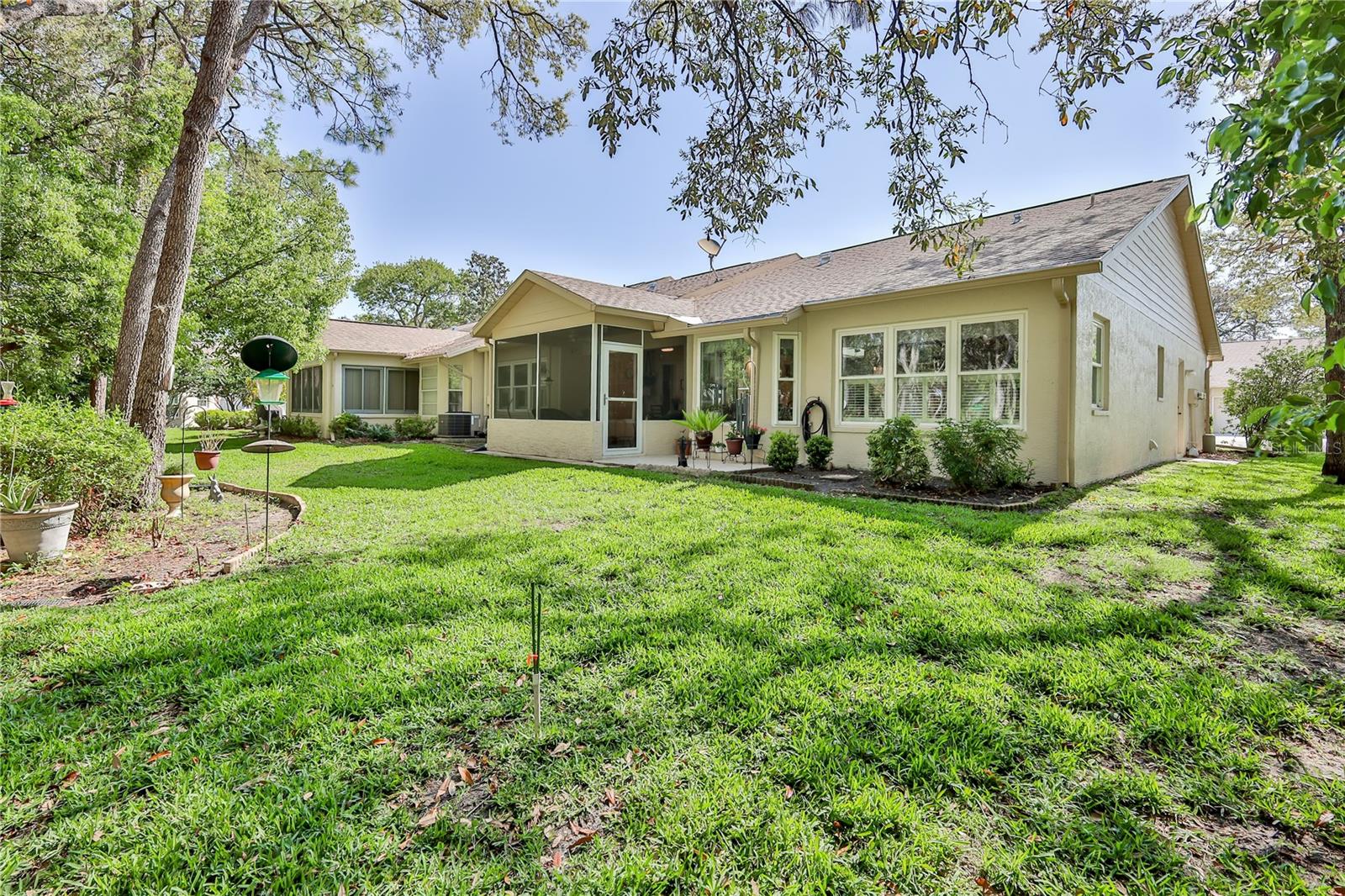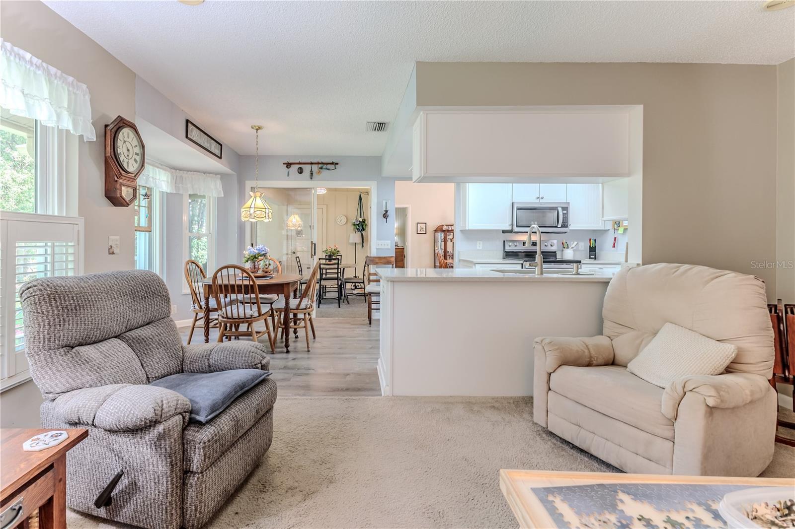 This is the one!! This charming, one owner, updated end-unit villa offers everything you need, including a golf cart, for comfortable and stylish living. Step inside to discover, two spacious bedrooms, updated kitchen, plantation shutters, a living room and family room, providing ample accommodations for you and your guests. The kitchen is a bright and welcoming space, featuring newer wood cabinets, gorgeous quartz counters, newer appliances, ample pantry storage, luxury vinyl plank flooring, and a cozy breakfast nook where you can start your mornings with beautiful garden views. The heart of the home features a delightful dining room and living room combo, adorned with wood floors, a piano and vaulted ceilings that create an airy, open atmosphere. From here, you'll enjoy additional living space in the enclosed lanai. The main bedroom, located at the rear of the home, is a true retreat with a door to the lanai, two California-closets, offering ample storage for all your wardrobe needs. The updated ensuite bathroom boasts a walk-in shower and linen closet. The guest bedroom is generously sized and conveniently located near the hall bathroom, perfect for visitors. Additional storage is available with two hall closets. The property also includes a two-car garage, pull-down stairs to the attic, fridge in garage. The oversized, inside laundry room includes washer, dryer, cabinets and utility sink. Updates include a new roof in 2012, newer windows, HVAC 2015, newer water heater, rain gutters screens. Additionally, furniture is offered outside the villa sale, making your move even easier. The Woodlands Village fee is $126/month, allows one dog, includes irrigation, lawn mowing, fertilization, weed control, front shrub trims, exterior painting, termite protection. Timber Pines, an award-winning, guard-gated 55+ deed-restricted community, offers access to an exceptional lifestyle. Residents enjoy three 18-hole golf courses, a 9-hole pitch & putt, tennis courts, 12 pickleball courts, two community pools, a country club restaurant and bar, a state-of-the-art fitness center, a woodworking shop, billiards, a performing arts center, and a vibrant array of clubs and activities. Don't miss the chance to make this delightful villa your new home, where comfort meets convenience. Contact us today to schedule your showing!