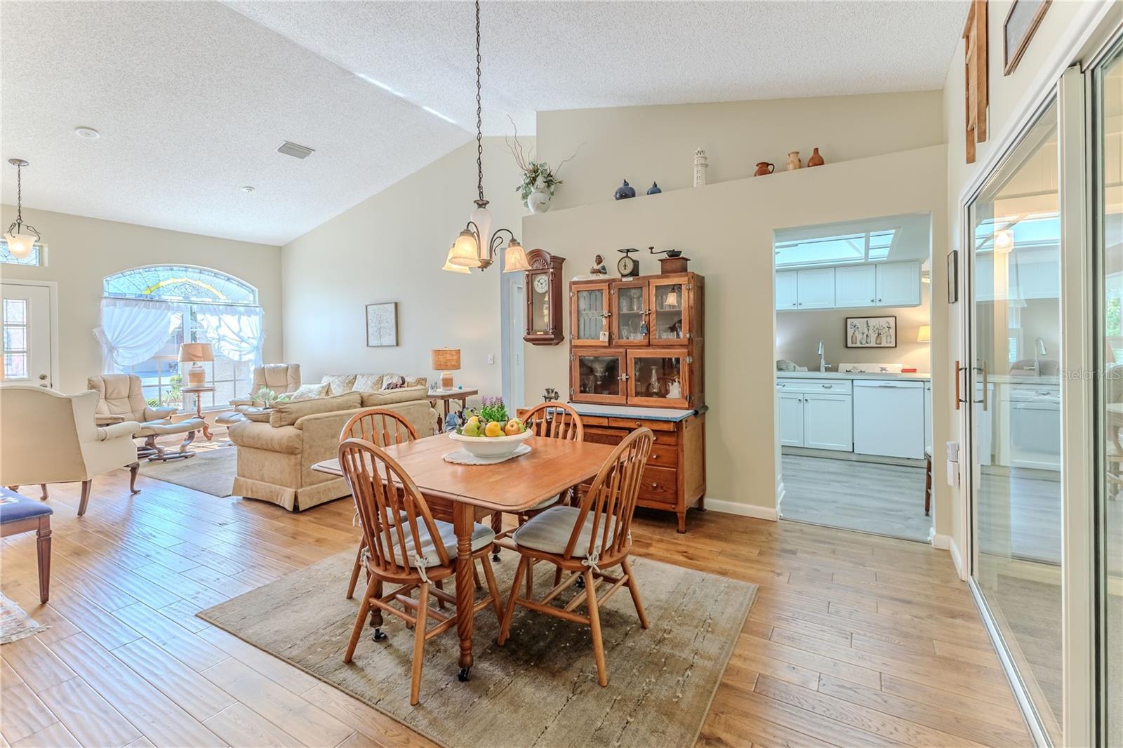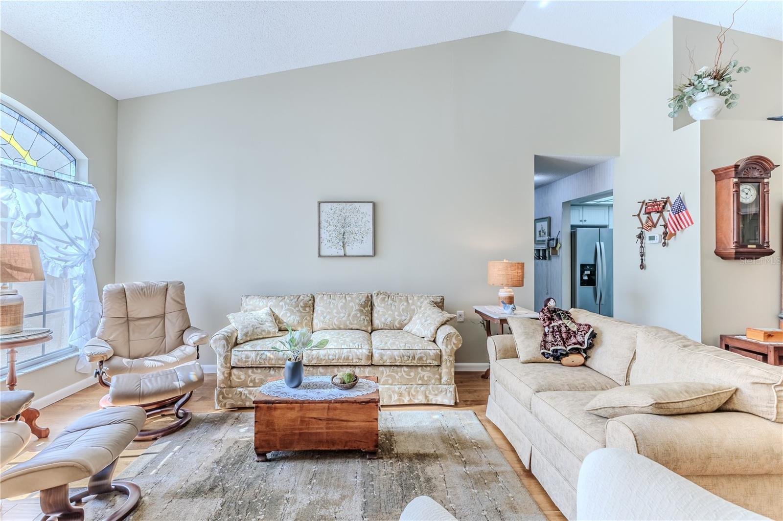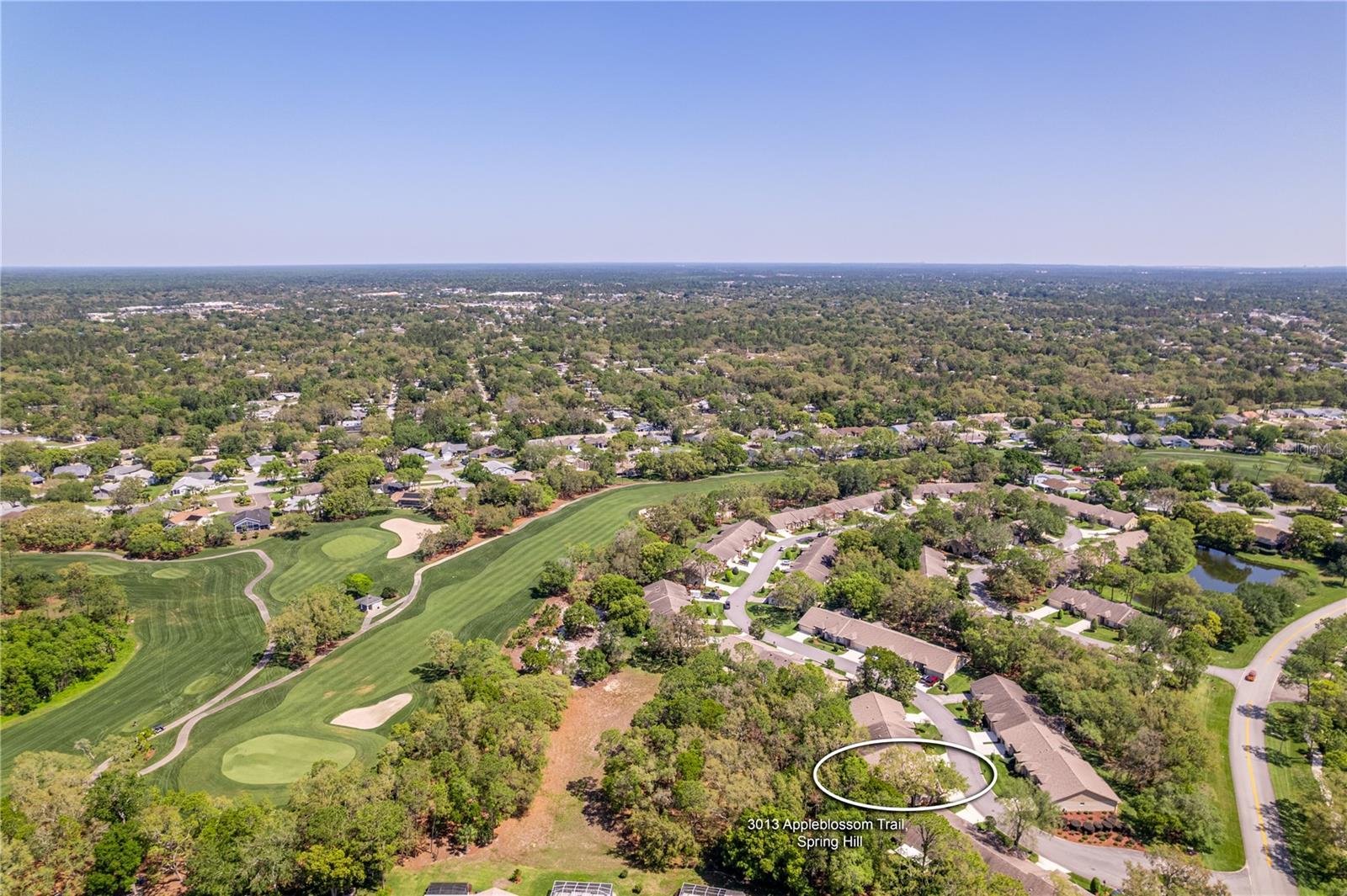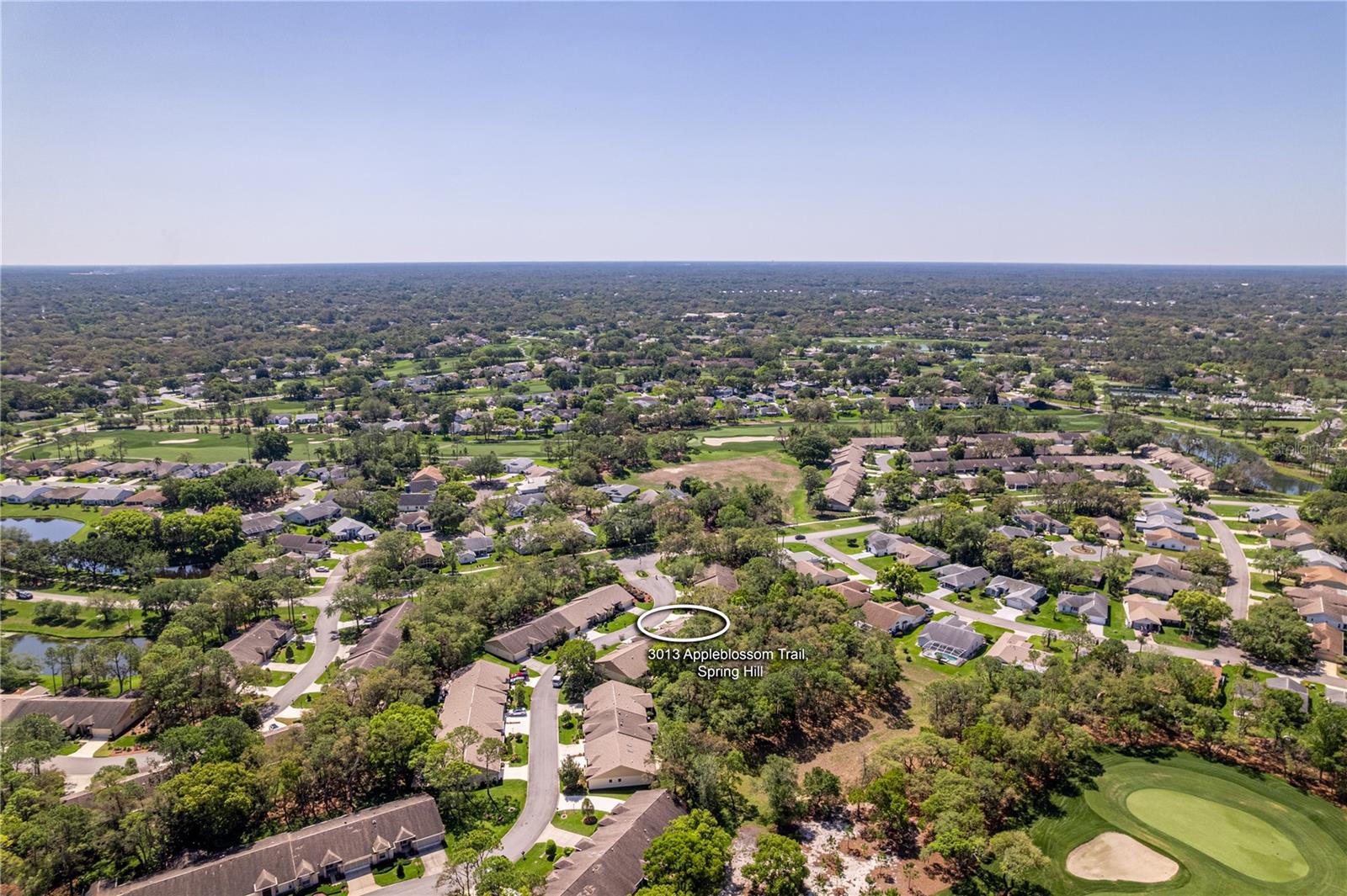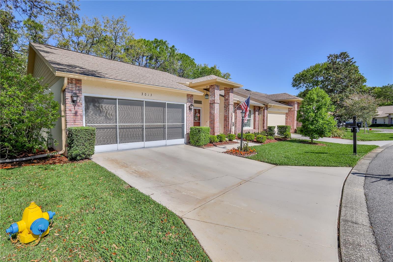 This is the one!! This charming, one owner, updated end-unit villa offers everything you need, including a golf cart, for comfortable and stylish living. Step inside to discover, two spacious bedrooms, updated kitchen, plantation shutters, a living room and family room, providing ample accommodations for you and your guests. The kitchen is a bright and welcoming space, featuring newer wood cabinets, gorgeous quartz counters, newer appliances, ample pantry storage, luxury vinyl plank flooring, and a cozy breakfast nook where you can start your mornings with beautiful garden views. The heart of the home features a delightful dining room and living room combo, adorned with wood floors, a piano and vaulted ceilings that create an airy, open atmosphere. From here, you'll enjoy additional living space in the enclosed lanai. The main bedroom, located at the rear of the home, is a true retreat with a door to the lanai, two California-closets, offering ample storage for all your wardrobe needs. The updated ensuite bathroom boasts a walk-in shower and linen closet. The guest bedroom is generously sized and conveniently located near the hall bathroom, perfect for visitors. Additional storage is available with two hall closets. The property also includes a two-car garage, pull-down stairs to the attic, fridge in garage. The oversized, inside laundry room includes washer, dryer, cabinets and utility sink. Updates include a new roof in 2012, newer windows, HVAC 2015, newer water heater, rain gutters screens. Additionally, furniture is offered outside the villa sale, making your move even easier. The Woodlands Village fee is $126/month, allows one dog, includes irrigation, lawn mowing, fertilization, weed control, front shrub trims, exterior painting, termite protection. Timber Pines, an award-winning, guard-gated 55+ deed-restricted community, offers access to an exceptional lifestyle. Residents enjoy three 18-hole golf courses, a 9-hole pitch & putt, tennis courts, 12 pickleball courts, two community pools, a country club restaurant and bar, a state-of-the-art fitness center, a woodworking shop, billiards, a performing arts center, and a vibrant array of clubs and activities. Don't miss the chance to make this delightful villa your new home, where comfort meets convenience. Contact us today to schedule your showing!