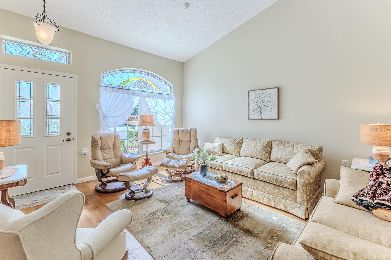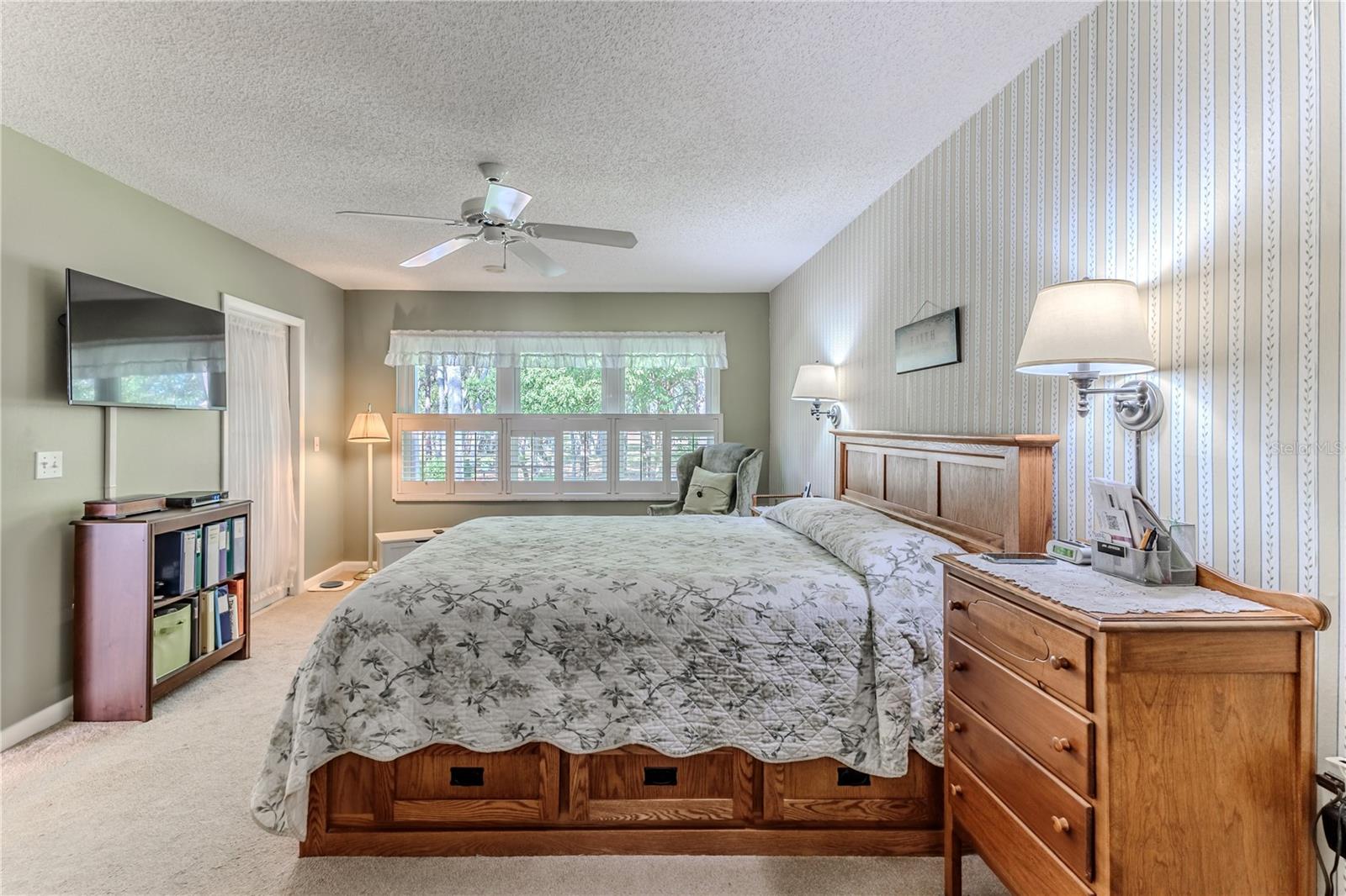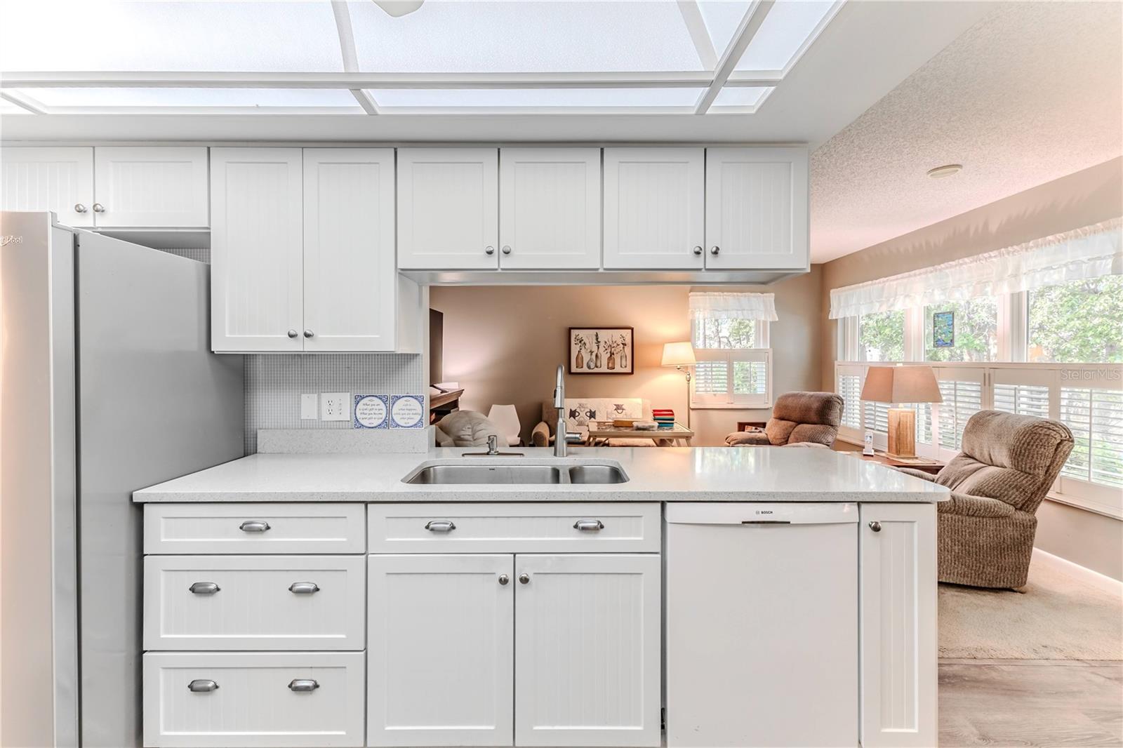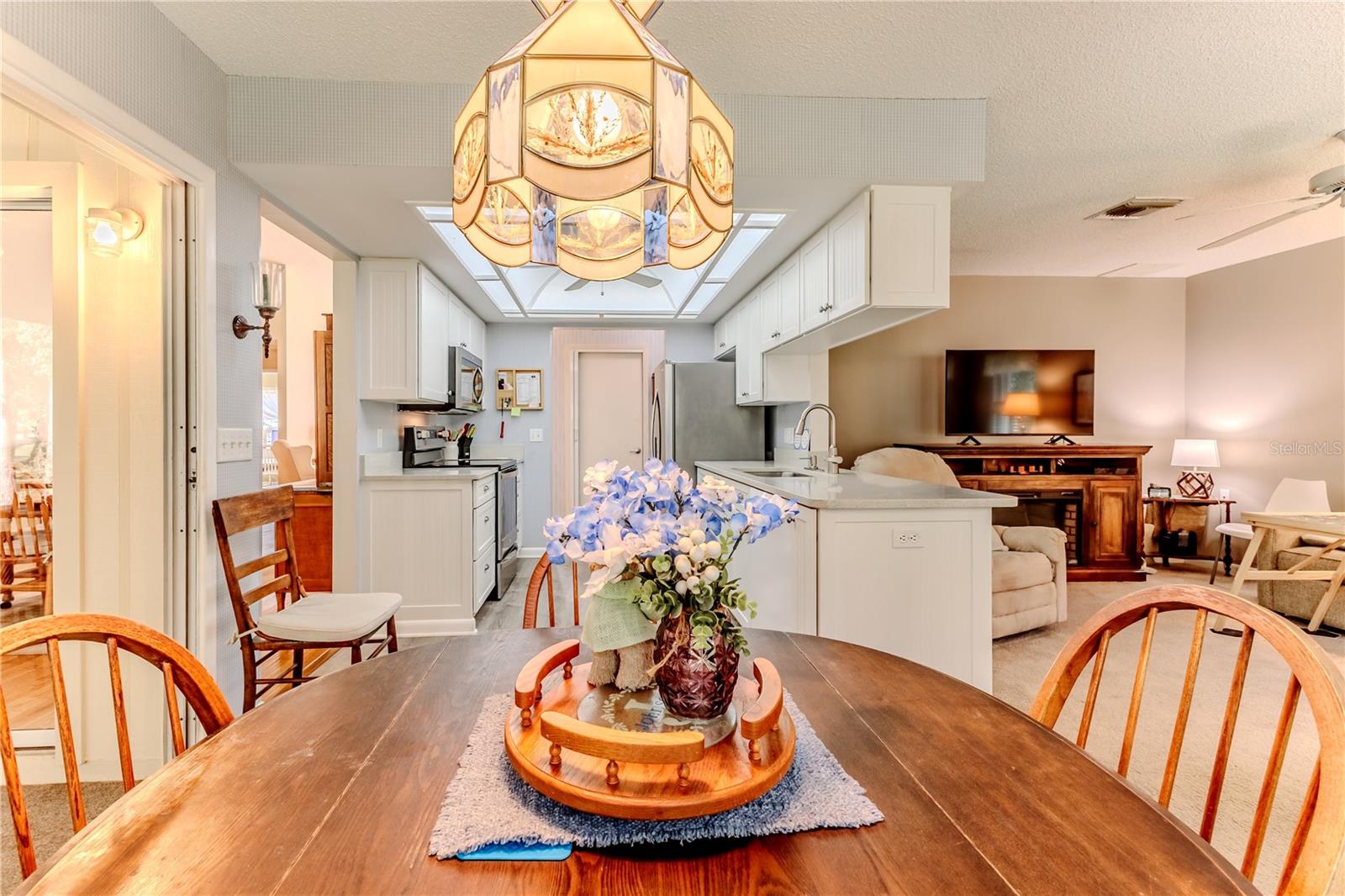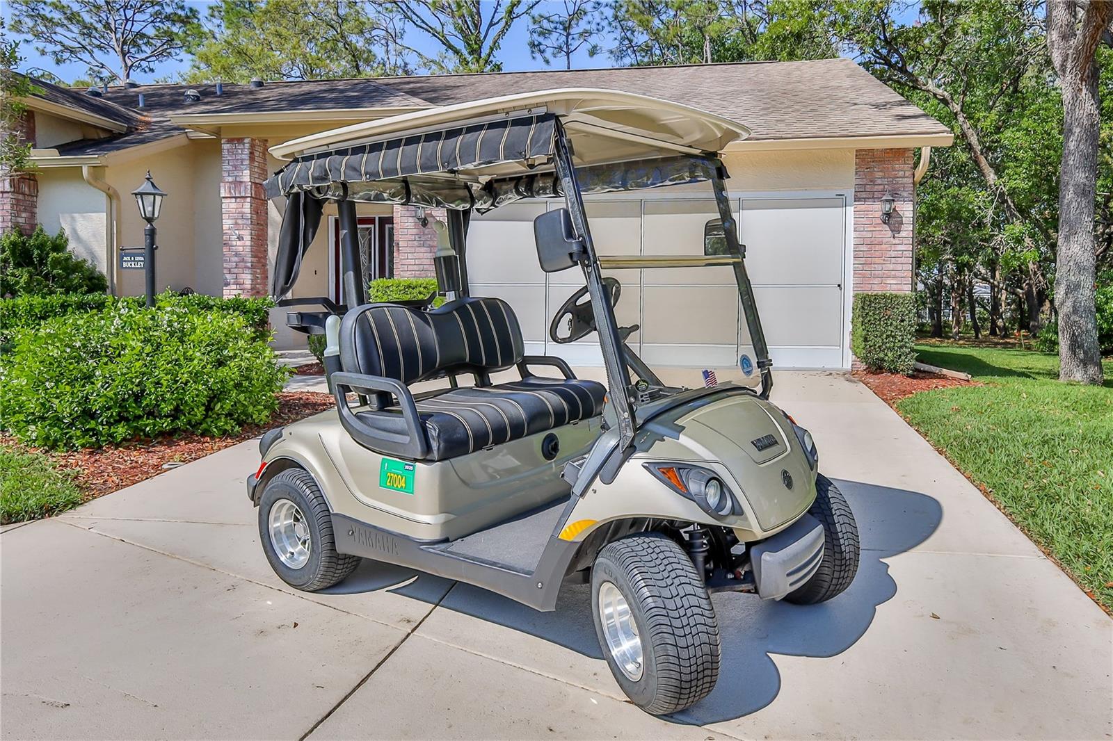 This is the one!! This charming, one owner, updated end-unit villa offers everything you need, including a golf cart, for comfortable and stylish living. Step inside to discover, two spacious bedrooms, updated kitchen, plantation shutters, a living room and family room, providing ample accommodations for you and your guests. The kitchen is a bright and welcoming space, featuring newer wood cabinets, gorgeous quartz counters, newer appliances, ample pantry storage, luxury vinyl plank flooring, and a cozy breakfast nook where you can start your mornings with beautiful garden views. The heart of the home features a delightful dining room and living room combo, adorned with wood floors, a piano and vaulted ceilings that create an airy, open atmosphere. From here, you'll enjoy additional living space in the enclosed lanai. The main bedroom, located at the rear of the home, is a true retreat with a door to the lanai, two California-closets, offering ample storage for all your wardrobe needs. The updated ensuite bathroom boasts a walk-in shower and linen closet. The guest bedroom is generously sized and conveniently located near the hall bathroom, perfect for visitors. Additional storage is available with two hall closets. The property also includes a two-car garage, pull-down stairs to the attic, fridge in garage. The oversized, inside laundry room includes washer, dryer, cabinets and utility sink. Updates include a new roof in 2012, newer windows, HVAC 2015, newer water heater, rain gutters screens. Additionally, furniture is offered outside the villa sale, making your move even easier. The Woodlands Village fee is $126/month, allows one dog, includes irrigation, lawn mowing, fertilization, weed control, front shrub trims, exterior painting, termite protection. Timber Pines, an award-winning, guard-gated 55+ deed-restricted community, offers access to an exceptional lifestyle. Residents enjoy three 18-hole golf courses, a 9-hole pitch & putt, tennis courts, 12 pickleball courts, two community pools, a country club restaurant and bar, a state-of-the-art fitness center, a woodworking shop, billiards, a performing arts center, and a vibrant array of clubs and activities. Don't miss the chance to make this delightful villa your new home, where comfort meets convenience. Contact us today to schedule your showing!