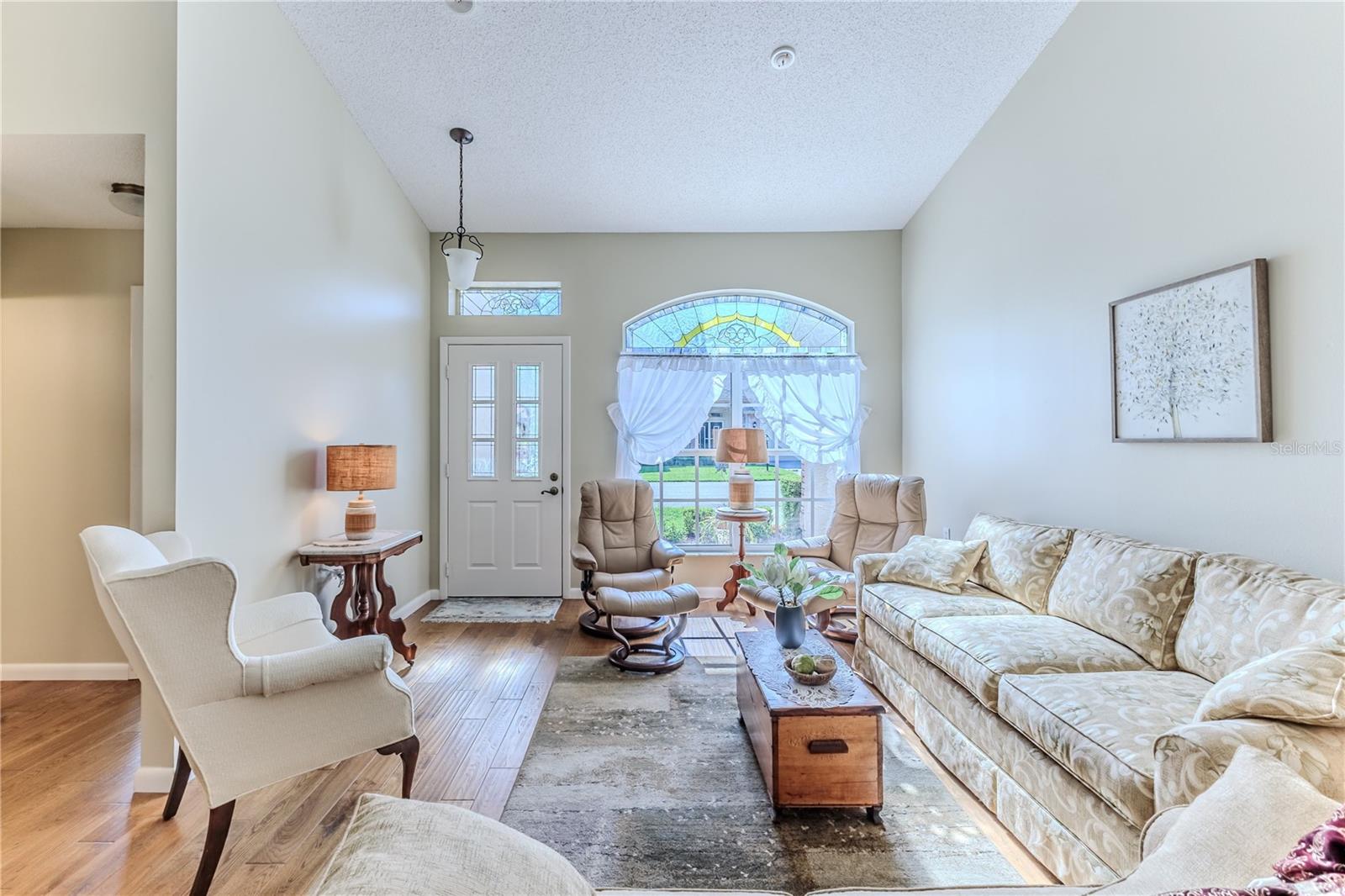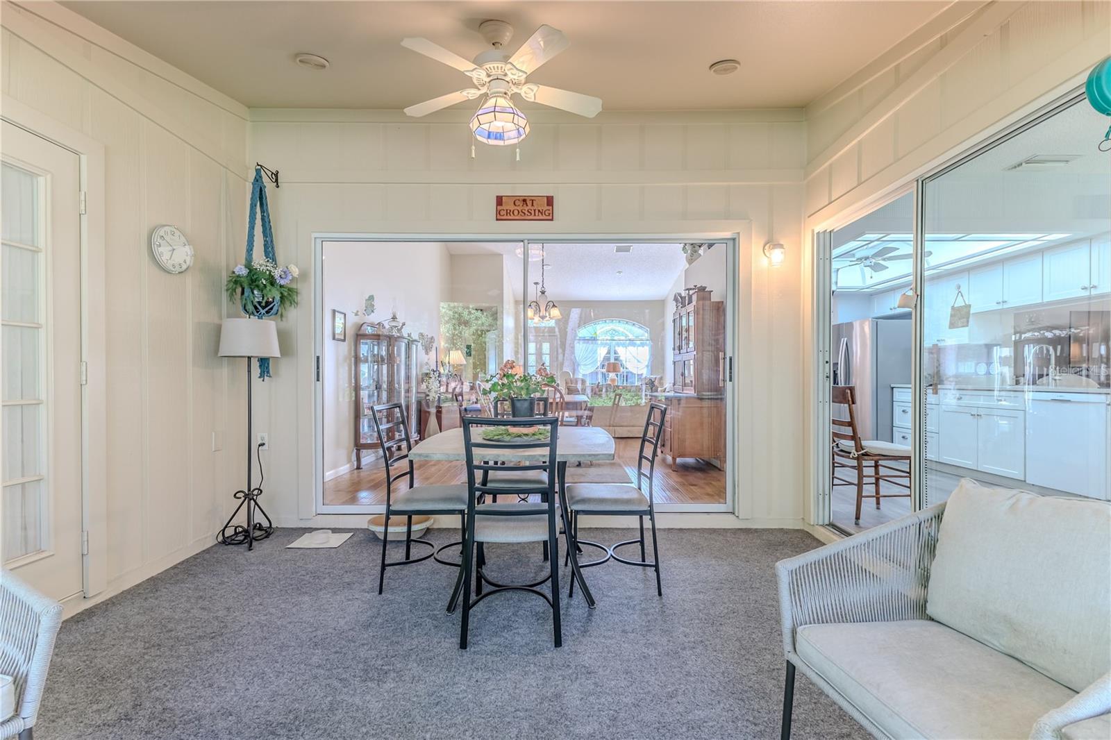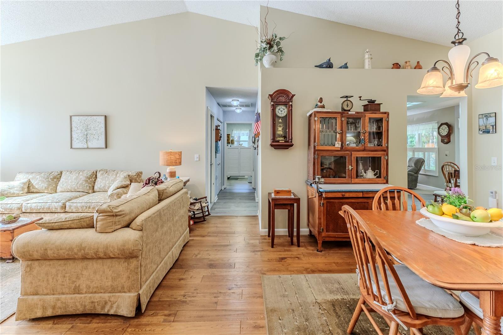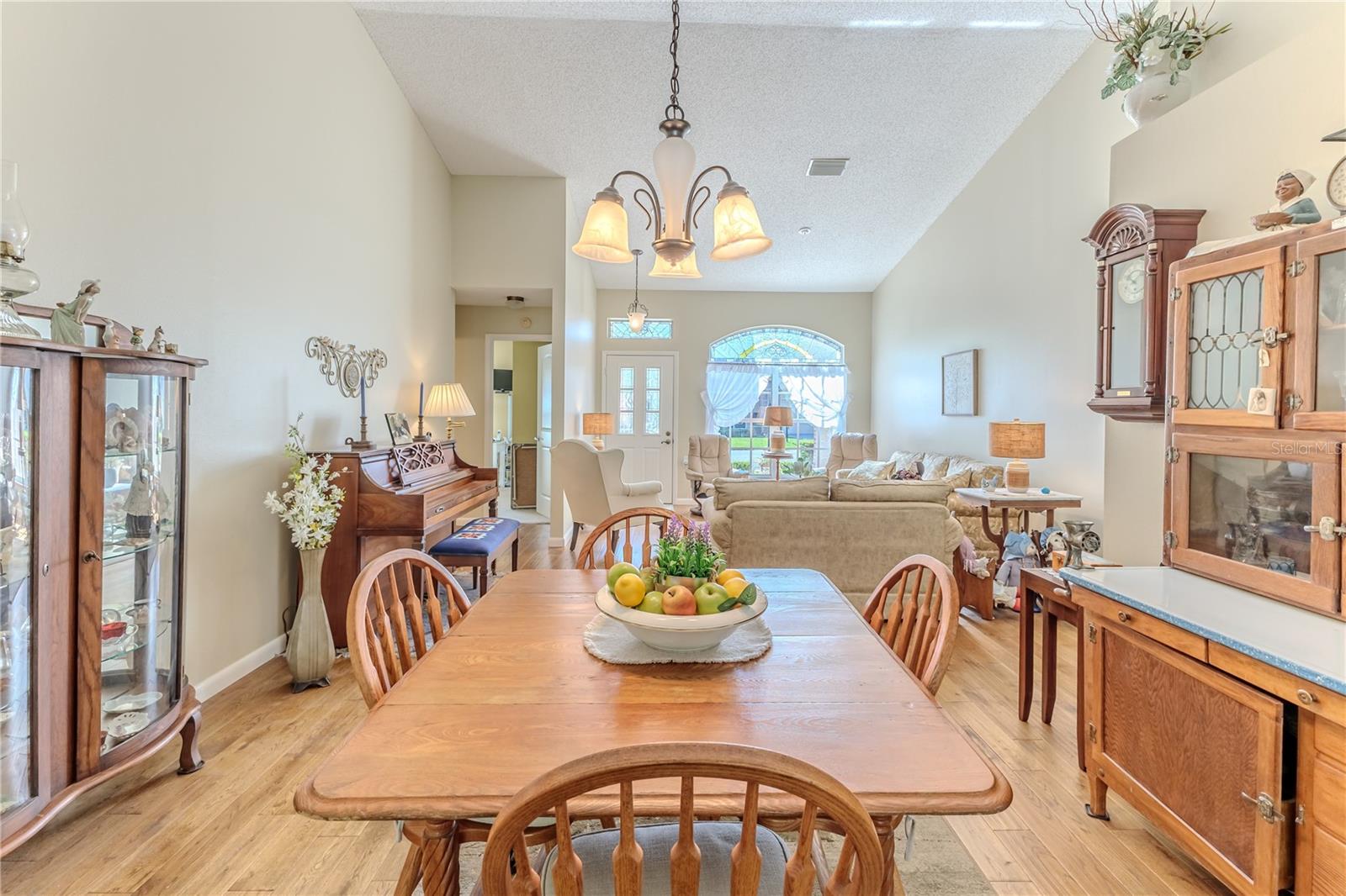 This is the one!! This charming, one owner, updated end-unit villa offers everything you need, including a golf cart, for comfortable and stylish living. Step inside to discover, two spacious bedrooms, updated kitchen, plantation shutters, a living room and family room, providing ample accommodations for you and your guests. The kitchen is a bright and welcoming space, featuring newer wood cabinets, gorgeous quartz counters, newer appliances, ample pantry storage, luxury vinyl plank flooring, and a cozy breakfast nook where you can start your mornings with beautiful garden views. The heart of the home features a delightful dining room and living room combo, adorned with wood floors, a piano and vaulted ceilings that create an airy, open atmosphere. From here, you'll enjoy additional living space in the enclosed lanai. The main bedroom, located at the rear of the home, is a true retreat with a door to the lanai, two California-closets, offering ample storage for all your wardrobe needs. The updated ensuite bathroom boasts a walk-in shower and linen closet. The guest bedroom is generously sized and conveniently located near the hall bathroom, perfect for visitors. Additional storage is available with two hall closets. The property also includes a two-car garage, pull-down stairs to the attic, fridge in garage. The oversized, inside laundry room includes washer, dryer, cabinets and utility sink. Updates include a new roof in 2012, newer windows, HVAC 2015, newer water heater, rain gutters screens. Additionally, furniture is offered outside the villa sale, making your move even easier. The Woodlands Village fee is $126/month, allows one dog, includes irrigation, lawn mowing, fertilization, weed control, front shrub trims, exterior painting, termite protection. Timber Pines, an award-winning, guard-gated 55+ deed-restricted community, offers access to an exceptional lifestyle. Residents enjoy three 18-hole golf courses, a 9-hole pitch & putt, tennis courts, 12 pickleball courts, two community pools, a country club restaurant and bar, a state-of-the-art fitness center, a woodworking shop, billiards, a performing arts center, and a vibrant array of clubs and activities. Don't miss the chance to make this delightful villa your new home, where comfort meets convenience. Contact us today to schedule your showing!