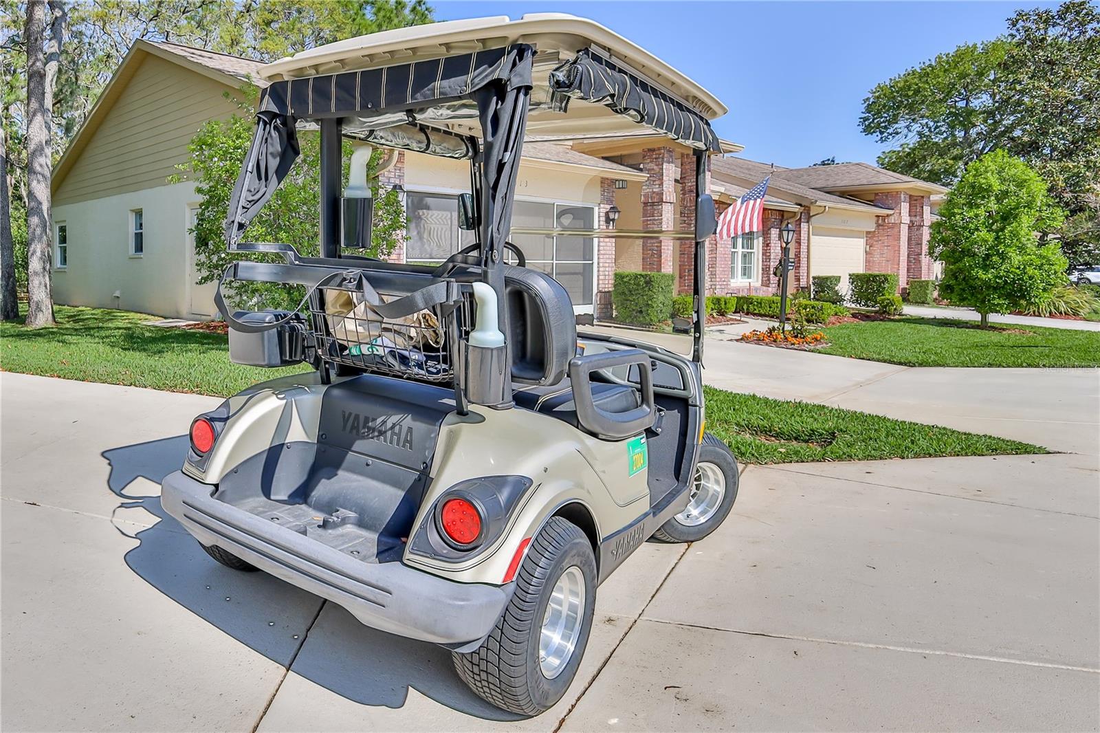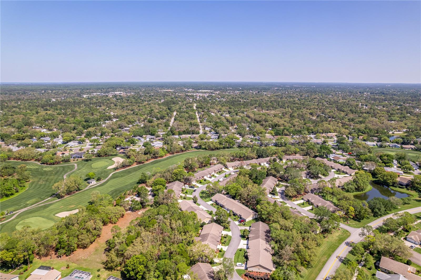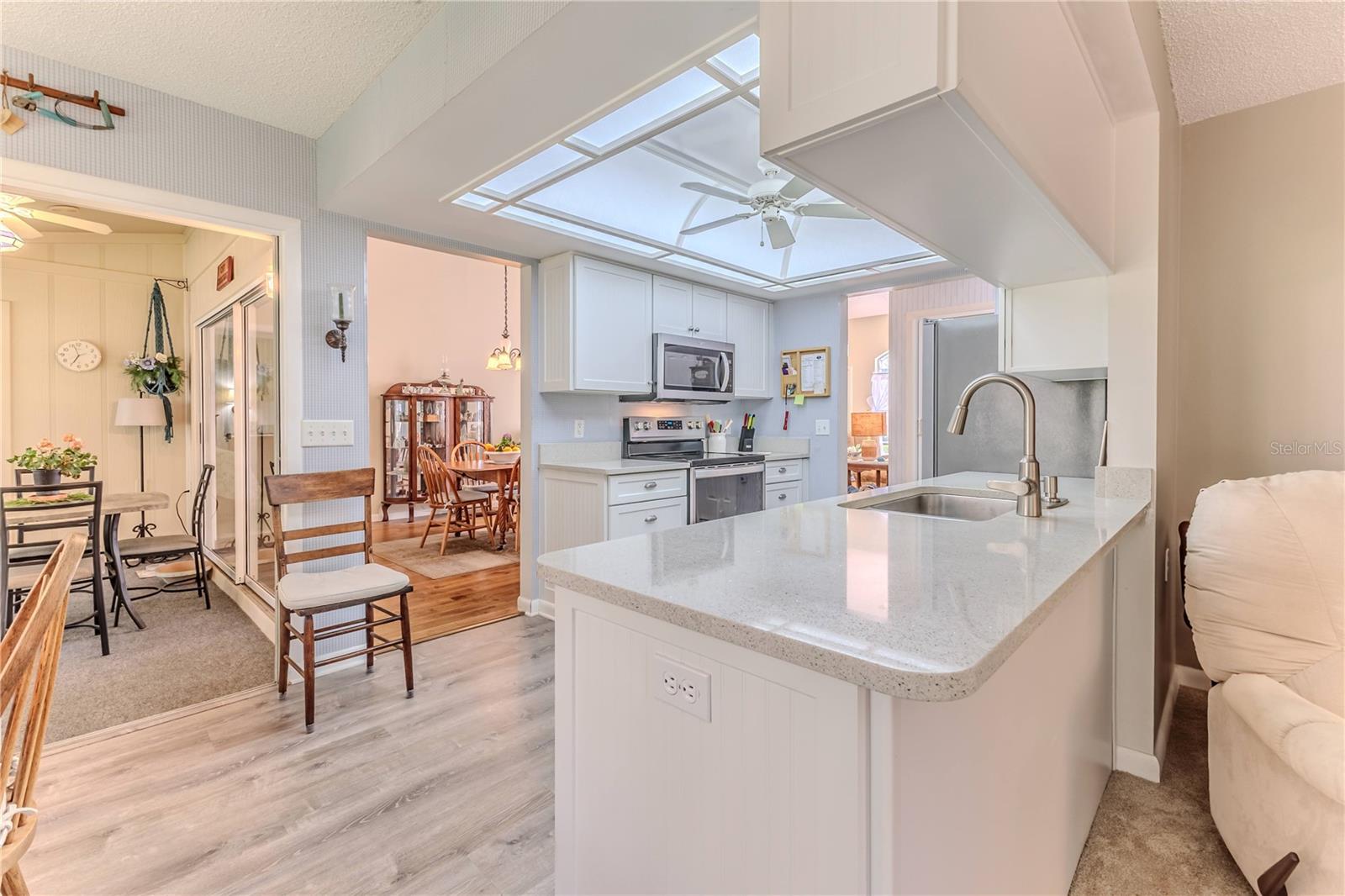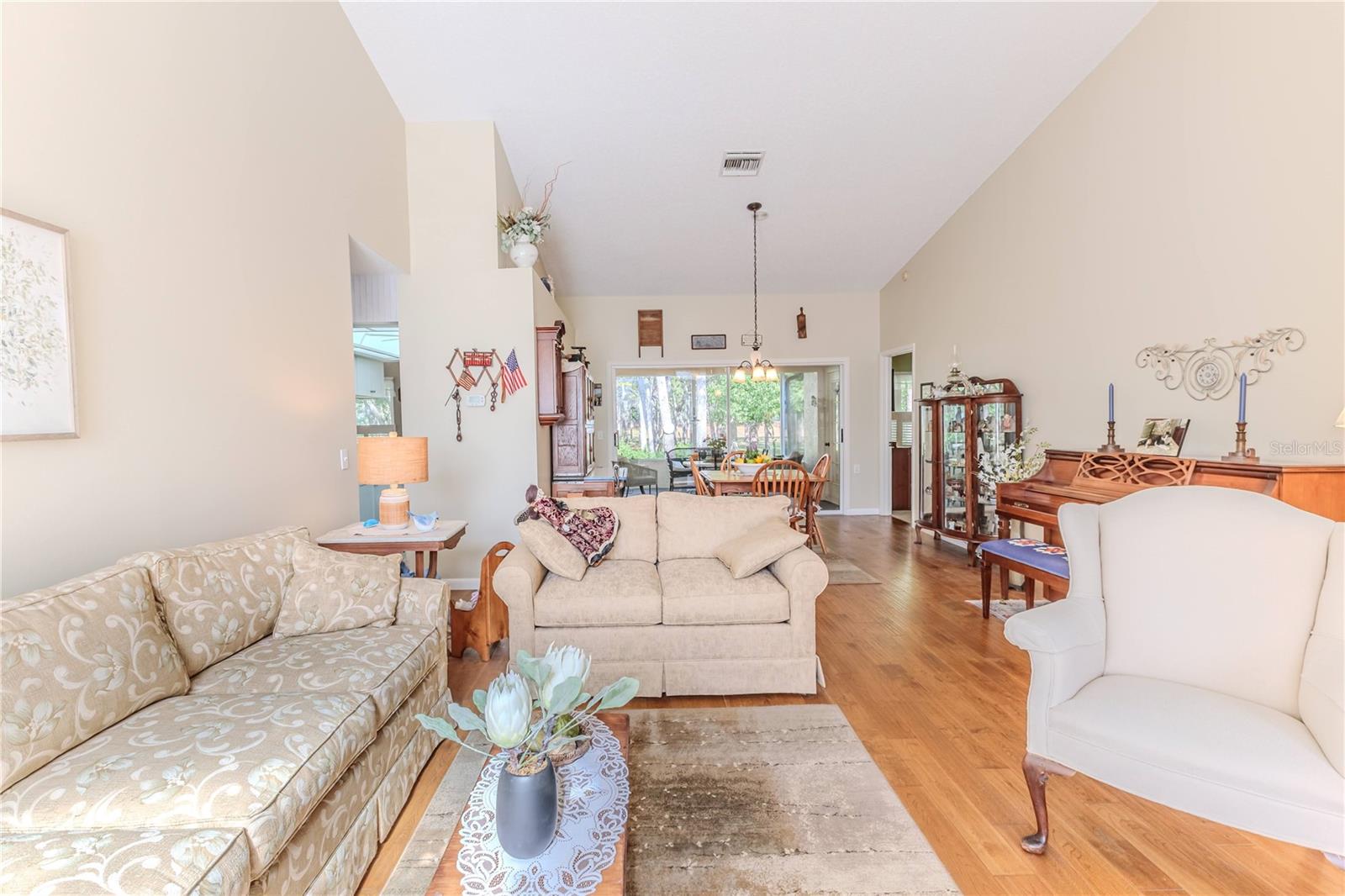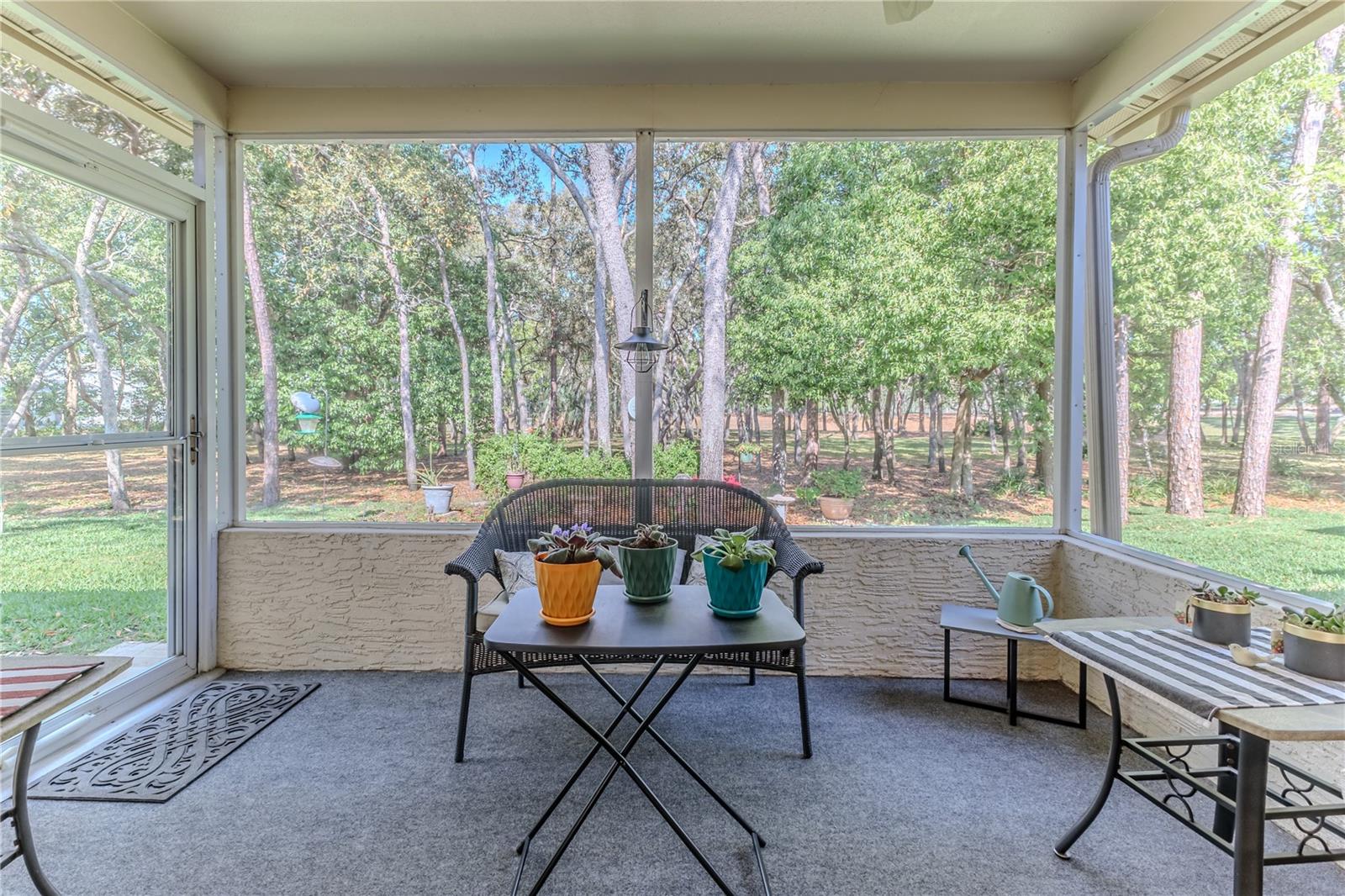 This is the one!! This charming, one owner, updated end-unit villa offers everything you need, including a golf cart, for comfortable and stylish living. Step inside to discover, two spacious bedrooms, updated kitchen, plantation shutters, a living room and family room, providing ample accommodations for you and your guests. The kitchen is a bright and welcoming space, featuring newer wood cabinets, gorgeous quartz counters, newer appliances, ample pantry storage, luxury vinyl plank flooring, and a cozy breakfast nook where you can start your mornings with beautiful garden views. The heart of the home features a delightful dining room and living room combo, adorned with wood floors, a piano and vaulted ceilings that create an airy, open atmosphere. From here, you'll enjoy additional living space in the enclosed lanai. The main bedroom, located at the rear of the home, is a true retreat with a door to the lanai, two California-closets, offering ample storage for all your wardrobe needs. The updated ensuite bathroom boasts a walk-in shower and linen closet. The guest bedroom is generously sized and conveniently located near the hall bathroom, perfect for visitors. Additional storage is available with two hall closets. The property also includes a two-car garage, pull-down stairs to the attic, fridge in garage. The oversized, inside laundry room includes washer, dryer, cabinets and utility sink. Updates include a new roof in 2012, newer windows, HVAC 2015, newer water heater, rain gutters screens. Additionally, furniture is offered outside the villa sale, making your move even easier. The Woodlands Village fee is $126/month, allows one dog, includes irrigation, lawn mowing, fertilization, weed control, front shrub trims, exterior painting, termite protection. Timber Pines, an award-winning, guard-gated 55+ deed-restricted community, offers access to an exceptional lifestyle. Residents enjoy three 18-hole golf courses, a 9-hole pitch & putt, tennis courts, 12 pickleball courts, two community pools, a country club restaurant and bar, a state-of-the-art fitness center, a woodworking shop, billiards, a performing arts center, and a vibrant array of clubs and activities. Don't miss the chance to make this delightful villa your new home, where comfort meets convenience. Contact us today to schedule your showing!