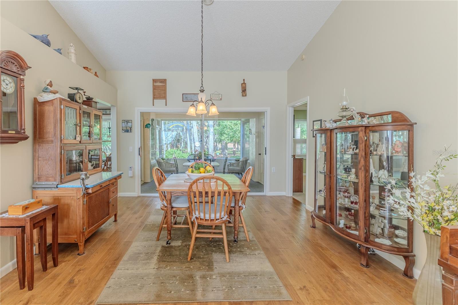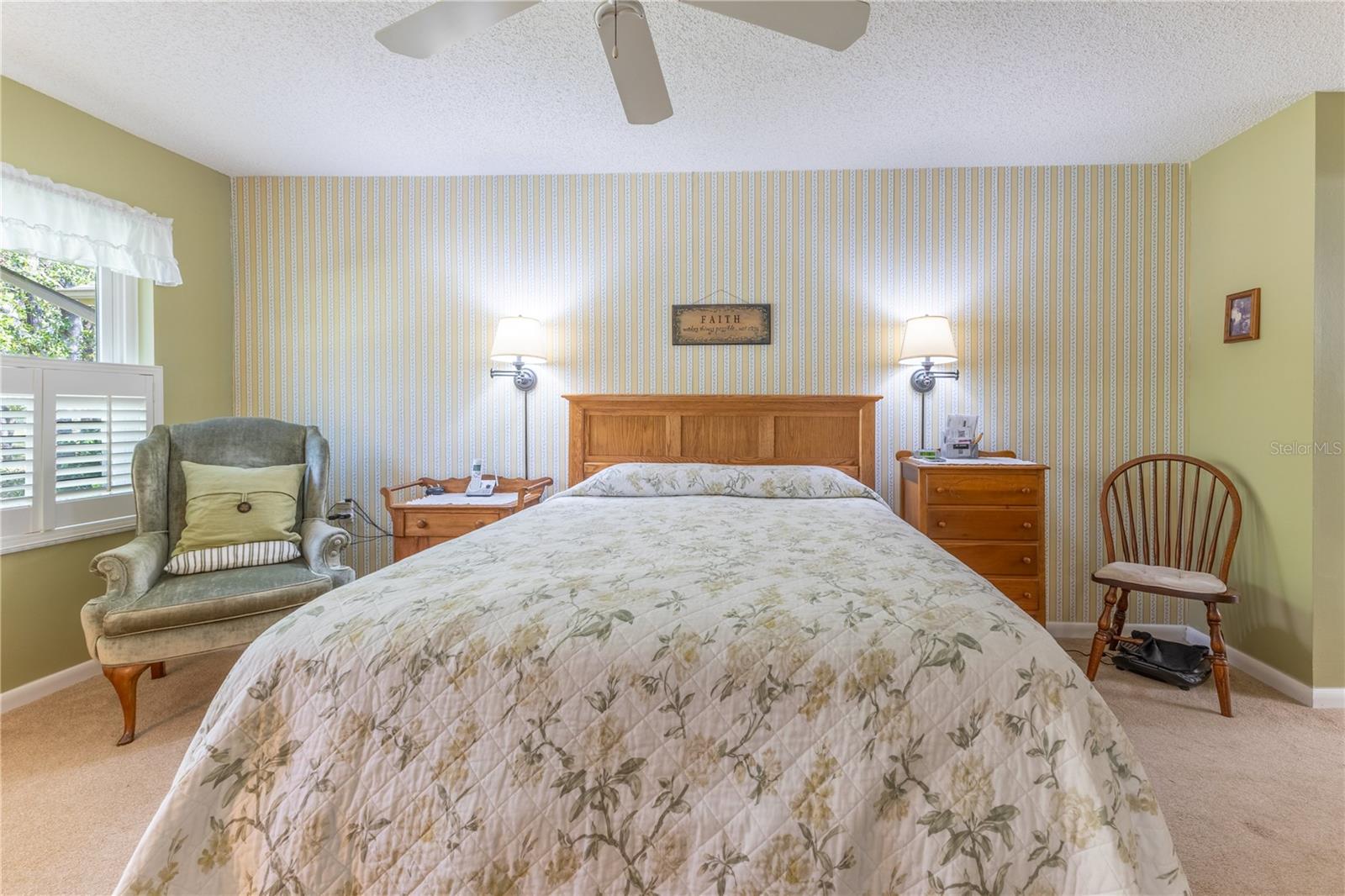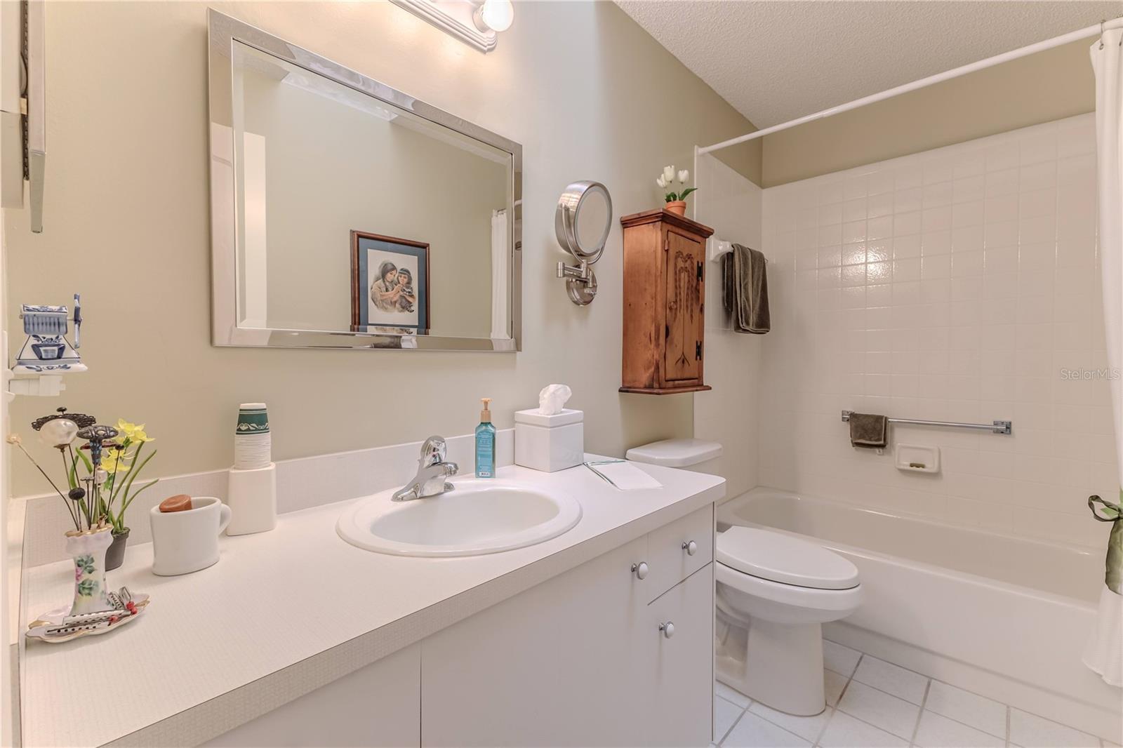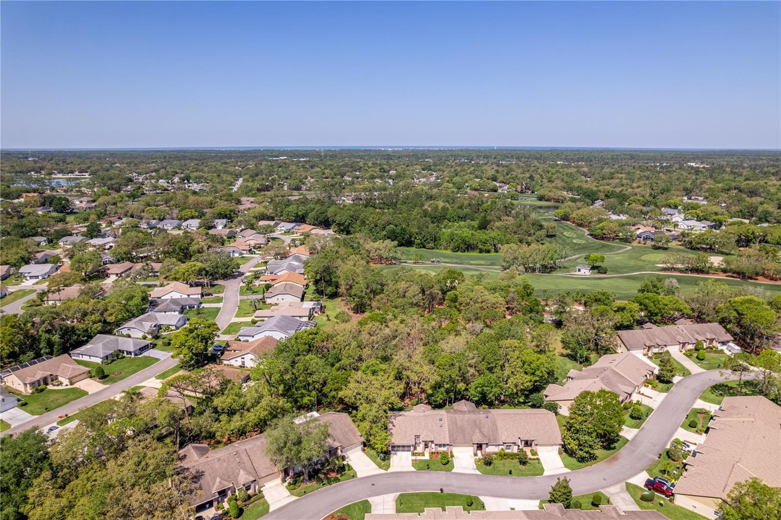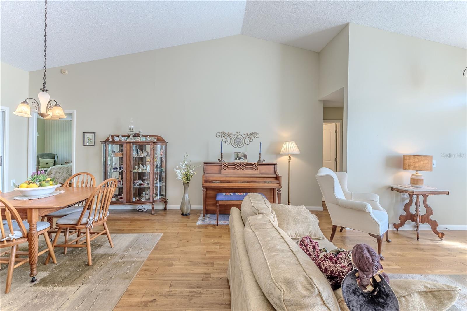 This is the one!! This charming, one owner, updated end-unit villa offers everything you need, including a golf cart, for comfortable and stylish living. Step inside to discover, two spacious bedrooms, updated kitchen, plantation shutters, a living room and family room, providing ample accommodations for you and your guests. The kitchen is a bright and welcoming space, featuring newer wood cabinets, gorgeous quartz counters, newer appliances, ample pantry storage, luxury vinyl plank flooring, and a cozy breakfast nook where you can start your mornings with beautiful garden views. The heart of the home features a delightful dining room and living room combo, adorned with wood floors, a piano and vaulted ceilings that create an airy, open atmosphere. From here, you'll enjoy additional living space in the enclosed lanai. The main bedroom, located at the rear of the home, is a true retreat with a door to the lanai, two California-closets, offering ample storage for all your wardrobe needs. The updated ensuite bathroom boasts a walk-in shower and linen closet. The guest bedroom is generously sized and conveniently located near the hall bathroom, perfect for visitors. Additional storage is available with two hall closets. The property also includes a two-car garage, pull-down stairs to the attic, fridge in garage. The oversized, inside laundry room includes washer, dryer, cabinets and utility sink. Updates include a new roof in 2012, newer windows, HVAC 2015, newer water heater, rain gutters screens. Additionally, furniture is offered outside the villa sale, making your move even easier. The Woodlands Village fee is $126/month, allows one dog, includes irrigation, lawn mowing, fertilization, weed control, front shrub trims, exterior painting, termite protection. Timber Pines, an award-winning, guard-gated 55+ deed-restricted community, offers access to an exceptional lifestyle. Residents enjoy three 18-hole golf courses, a 9-hole pitch & putt, tennis courts, 12 pickleball courts, two community pools, a country club restaurant and bar, a state-of-the-art fitness center, a woodworking shop, billiards, a performing arts center, and a vibrant array of clubs and activities. Don't miss the chance to make this delightful villa your new home, where comfort meets convenience. Contact us today to schedule your showing!