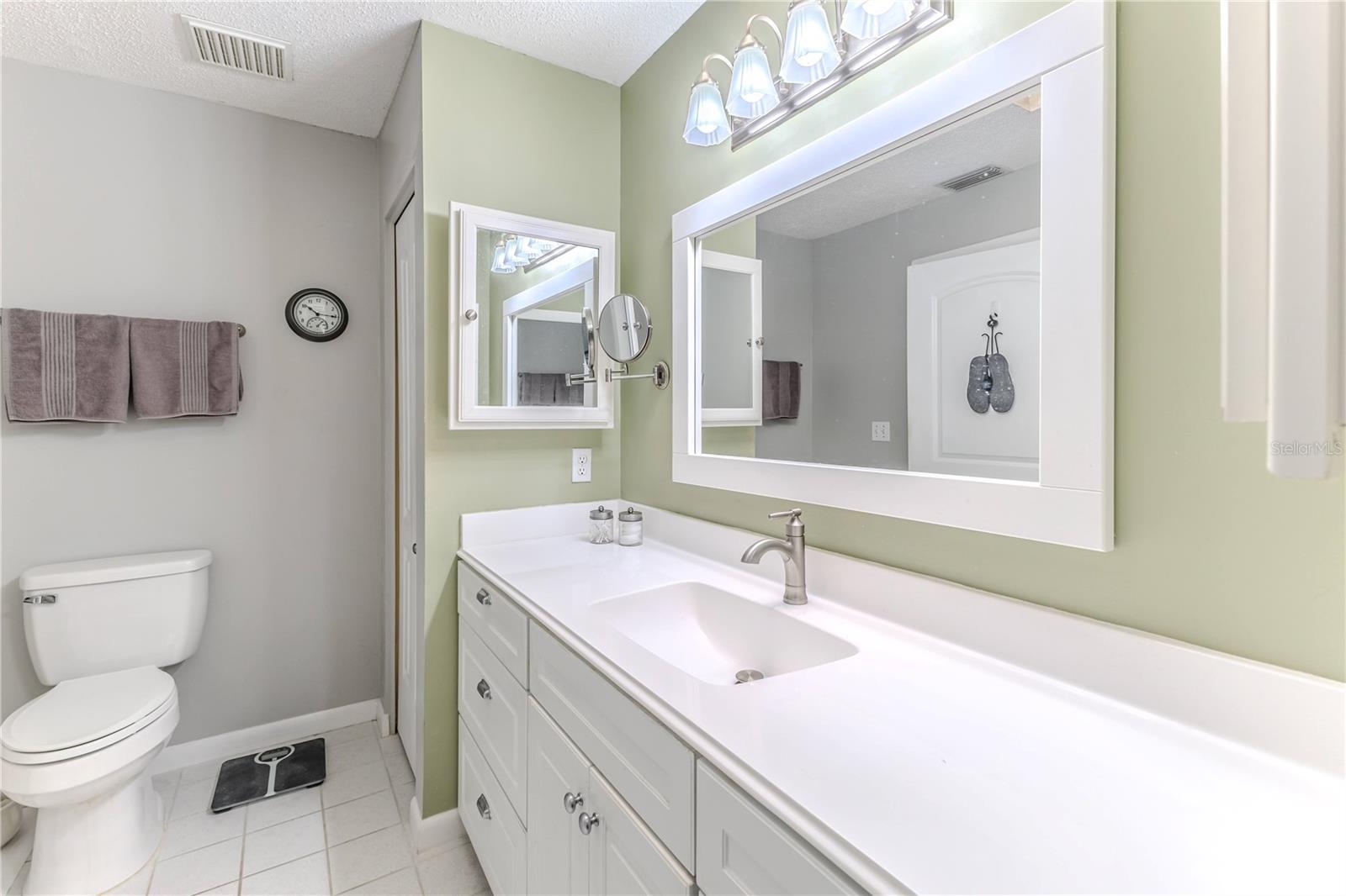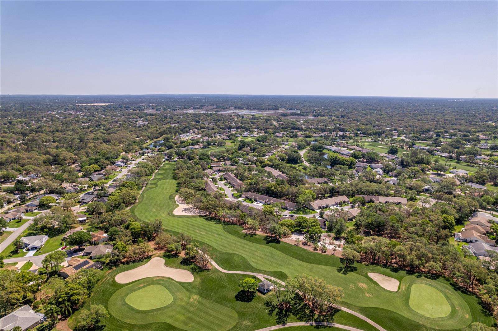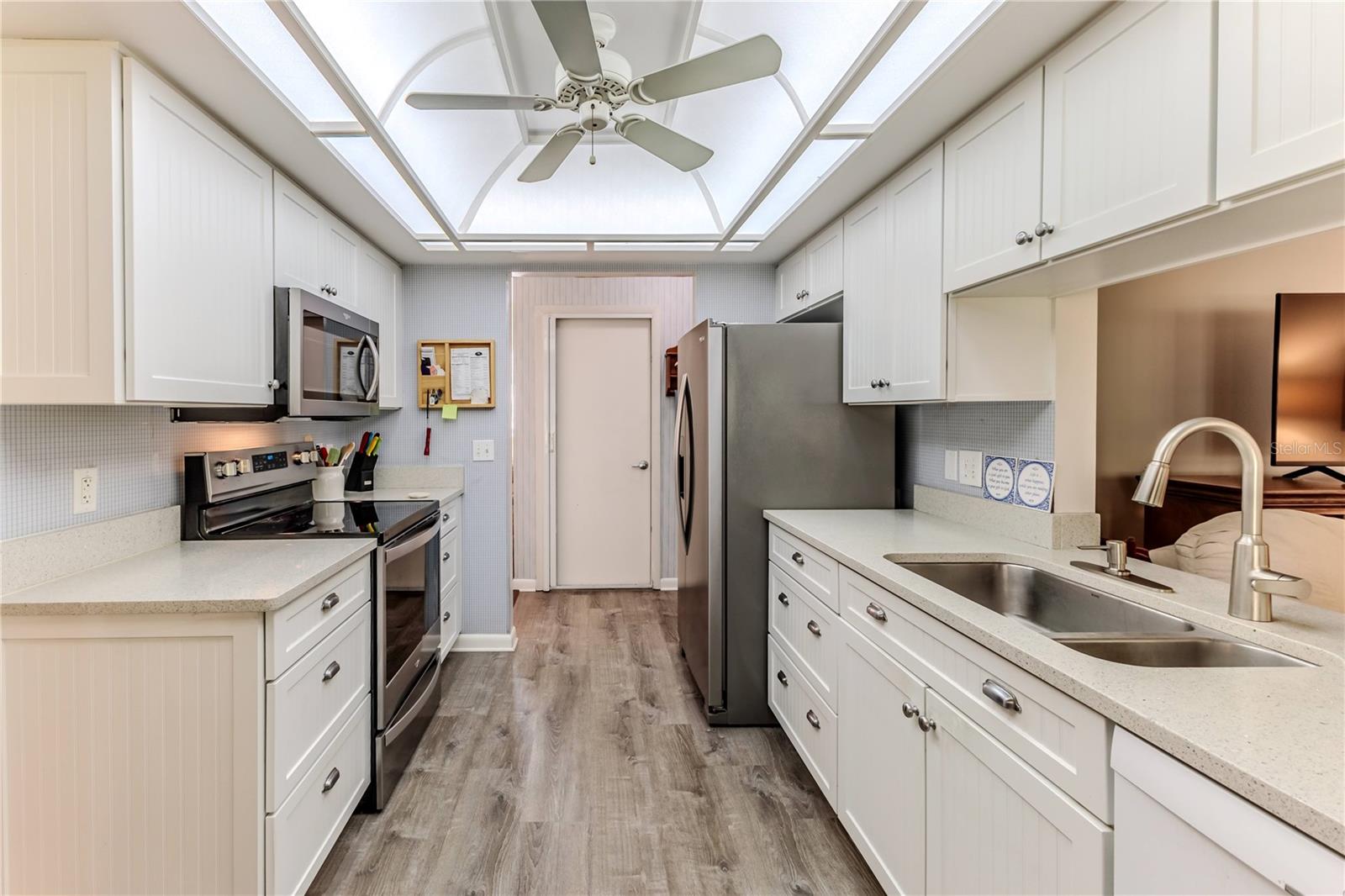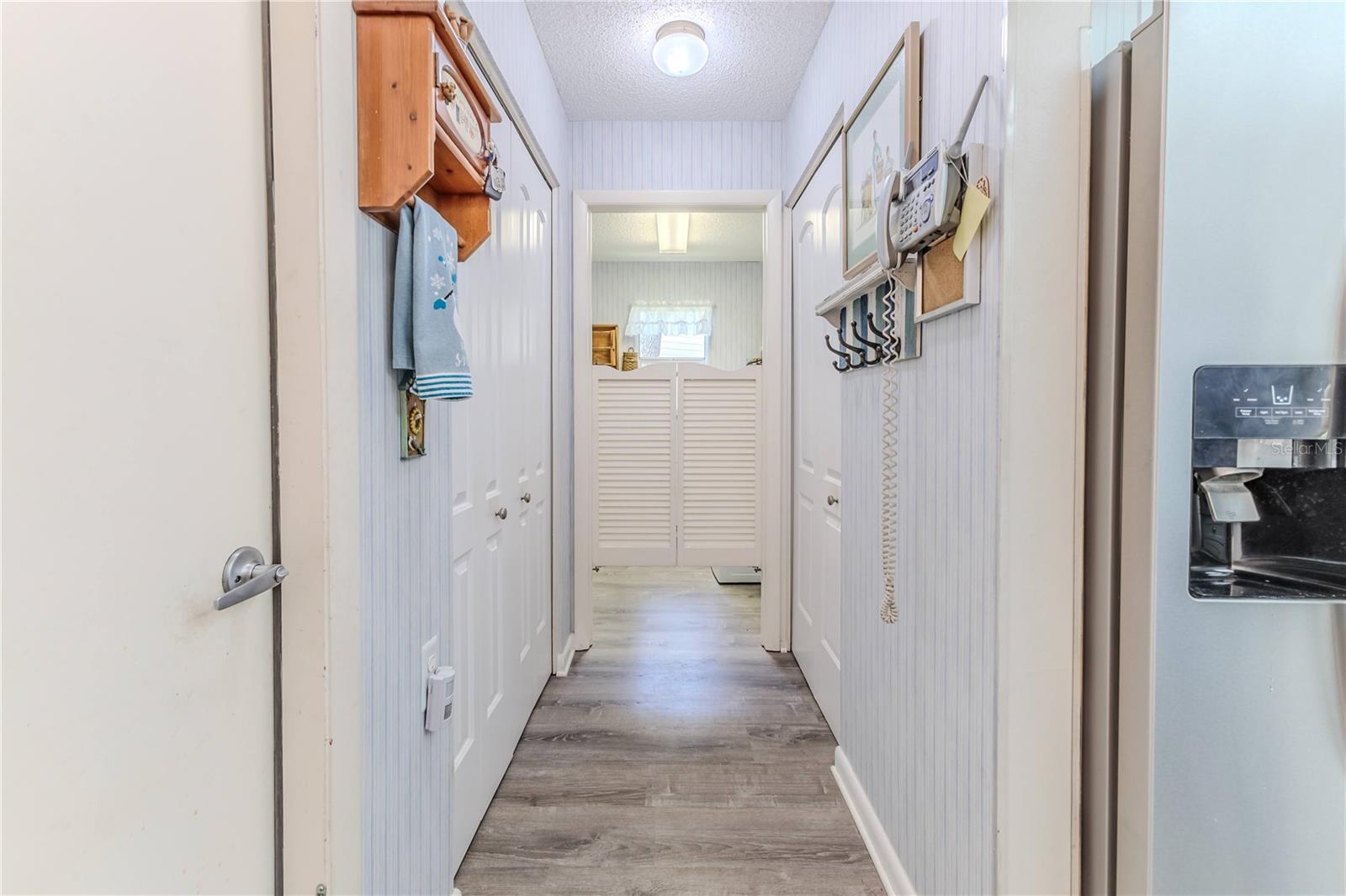 This is the one!! This charming, one owner, updated end-unit villa offers everything you need, including a golf cart, for comfortable and stylish living. Step inside to discover, two spacious bedrooms, updated kitchen, plantation shutters, a living room and family room, providing ample accommodations for you and your guests. The kitchen is a bright and welcoming space, featuring newer wood cabinets, gorgeous quartz counters, newer appliances, ample pantry storage, luxury vinyl plank flooring, and a cozy breakfast nook where you can start your mornings with beautiful garden views. The heart of the home features a delightful dining room and living room combo, adorned with wood floors, a piano and vaulted ceilings that create an airy, open atmosphere. From here, you'll enjoy additional living space in the enclosed lanai. The main bedroom, located at the rear of the home, is a true retreat with a door to the lanai, two California-closets, offering ample storage for all your wardrobe needs. The updated ensuite bathroom boasts a walk-in shower and linen closet. The guest bedroom is generously sized and conveniently located near the hall bathroom, perfect for visitors. Additional storage is available with two hall closets. The property also includes a two-car garage, pull-down stairs to the attic, fridge in garage. The oversized, inside laundry room includes washer, dryer, cabinets and utility sink. Updates include a new roof in 2012, newer windows, HVAC 2015, newer water heater, rain gutters screens. Additionally, furniture is offered outside the villa sale, making your move even easier. The Woodlands Village fee is $126/month, allows one dog, includes irrigation, lawn mowing, fertilization, weed control, front shrub trims, exterior painting, termite protection. Timber Pines, an award-winning, guard-gated 55+ deed-restricted community, offers access to an exceptional lifestyle. Residents enjoy three 18-hole golf courses, a 9-hole pitch & putt, tennis courts, 12 pickleball courts, two community pools, a country club restaurant and bar, a state-of-the-art fitness center, a woodworking shop, billiards, a performing arts center, and a vibrant array of clubs and activities. Don't miss the chance to make this delightful villa your new home, where comfort meets convenience. Contact us today to schedule your showing!