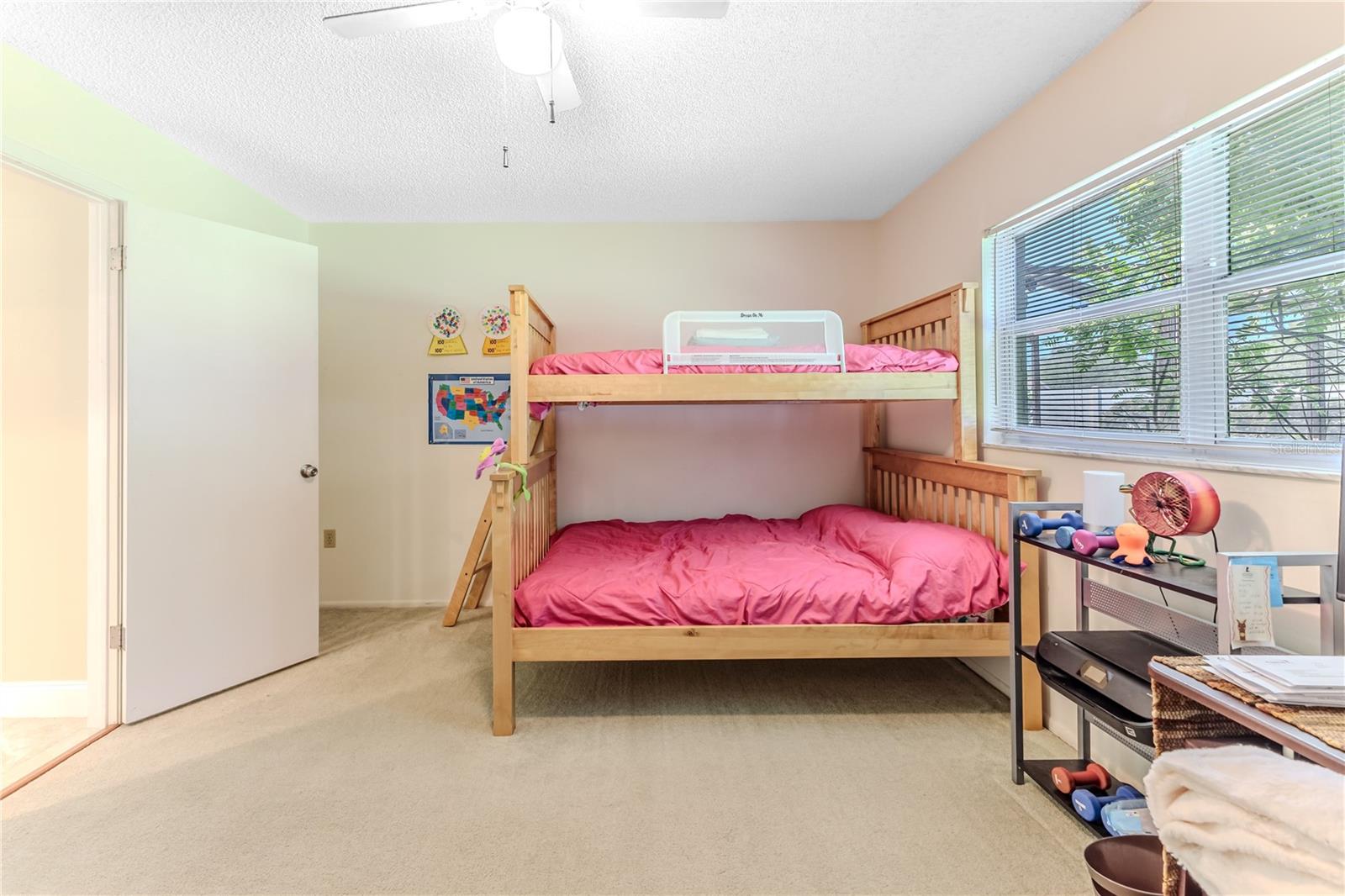 This beautifully maintained home offers 3 bedrooms in a desirable split floorplan, 2 updated bathrooms, and a 2-car garage. With 1,798 square feet of living space, the layout features an open design that connects a formal living and dining room to a spacious kitchen and family room—ideal for both everyday living and entertaining. The updated kitchen includes soft-close wood cabinets, granite countertops, stainless steel appliances, and a pantry with convenient pull-out shelves. Beautiful tile and carpet run throughout the home, enhancing both comfort and style. The main bedroom suite offers direct access to the pool area through sliding glass doors and features a walk-in closet, dual vanities, and a walk-in shower. Bedrooms 2 and 3 are generously sized, with Bedroom 2 featuring a walk-in closet and Bedroom 3 offering dual closets. The oversized laundry room includes a washer and dryer, adding to the home's practicality. Step outside to enjoy the impressive 20,000-gallon screened-in swimming pool, which is 8 feet deep at one end—perfect for Florida living. The large backyard is fully fenced, providing privacy and room to play or garden. Sprinklers on well. The garage includes a utility sink, workbench, ceiling fan, and pull-down attic stairs for additional storage. Roof was replaced in 2006 and the HVAC system in 1997. This home combines comfort, function, and value in a highly livable floorplan.