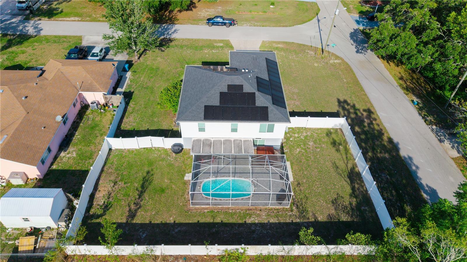 Welcome to your dream retreat! This beautifully maintained 4-bedroom, 2.5-bathroom home, built in 2004, offers over 2,800 square feet of living space and is situated on a private corner lot in a non-deed-restricted neighborhood with no HOA. Step inside to find engineered hardwood floors throughout and a semi-updated kitchen featuring dual sinks, double pantries, and newer stainless steel appliances—perfect for cooking and entertaining. French doors lead to a spacious covered lanai overlooking your private saltwater pool and spa (3 to 5 feet deep), fully enclosed and ideal for relaxing or hosting guests. The home boasts generously sized bedrooms with walk-in closets, an inside laundry room with washer and dryer included, and a versatile bonus room that can serve as a home office, fifth bedroom, or additional living area. Additional features include a stamped concrete driveway with ample parking, new carpeting upstairs, and Goodman A/C units for comfort. Major updates provide peace of mind, including a new roof in 2020, solar panels installed in 2021 (to be fully owned at closing), window and door replacements in 2019, vinyl fencing added in 2017, and the pool and enclosure installed in 2007. Gutters and downspouts were recently added as well. With no HOA restrictions and easy access to Tampa and the Gulf, this home combines privacy, comfort, and style—offering the perfect place to live, grow, and enjoy the best of Florida living.