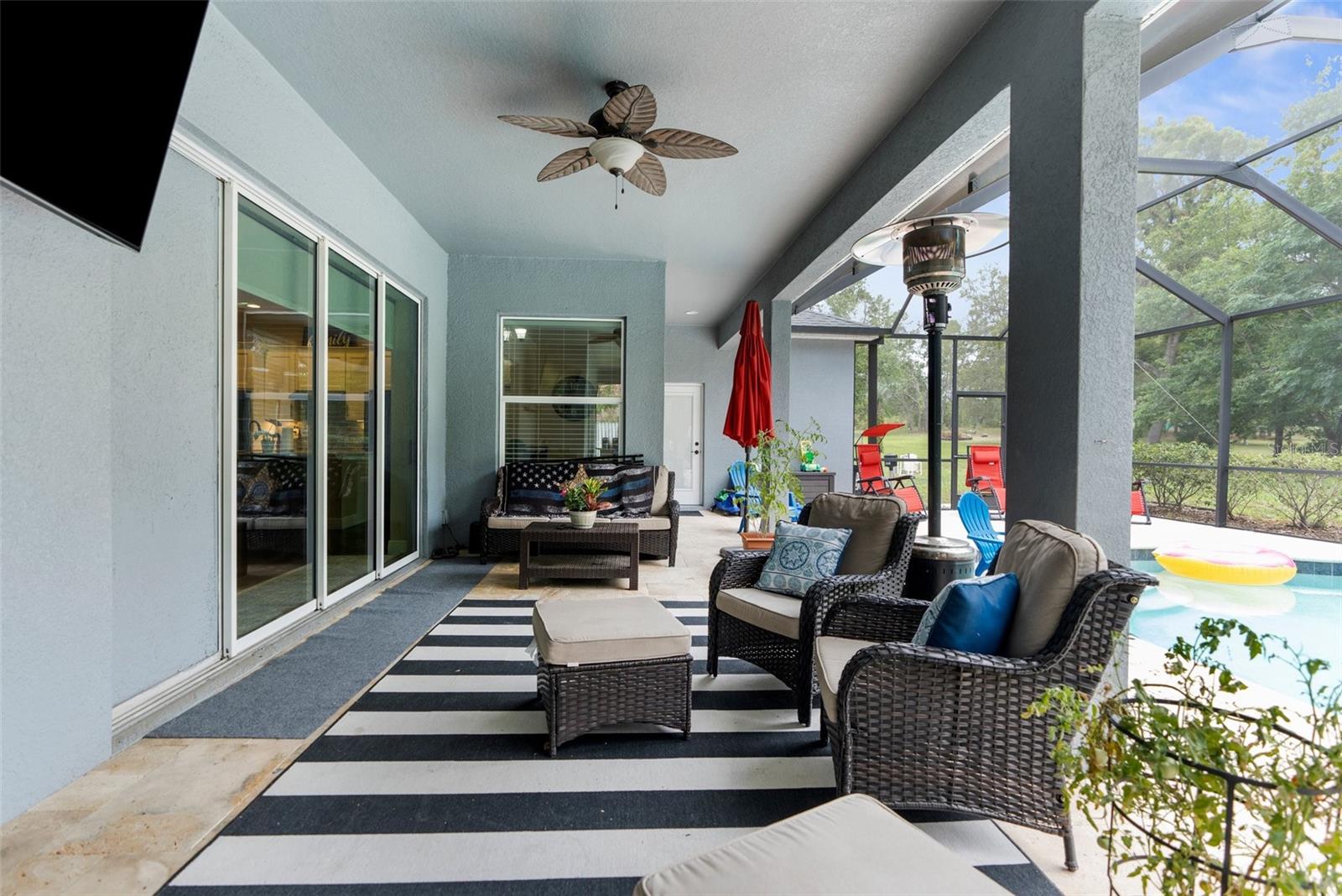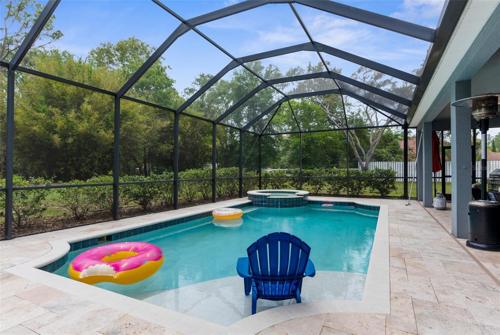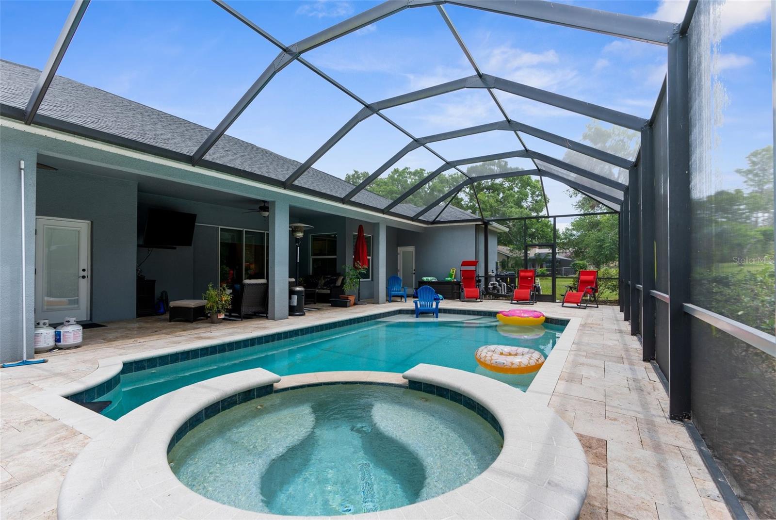 One or more photo(s) has been virtually staged. Welcome to an exceptional 4-bedroom, 3-bathroom estate in one of Spring Hill’s most sought-after areas—where luxury, privacy, and thoughtful design come together effortlessly. With no HOA and CDD, this property offers freedom and sophistication on a grand scale. Spanning 4,337 total square feet under roof, the home includes an oversized 4-car garage with 983 square feet of space and 8-foot double garage doors—ideal for oversized vehicles, a home gym, or a dream workshop setup. Step through 8-foot double front doors and into 2,739 square feet of refined living space, where 10-foot ceilings, elegant crown molding, and 5-inch baseboards define every room. The home’s main living areas feature luxury vinyl flooring for a sleek, durable finish, while the bedrooms offer plush, comfortable carpeting. In the bathrooms and laundry room, ceramic tile delivers both style and easy maintenance. At the heart of the home is a gourmet kitchen, beautifully appointed with quartz countertops, a Wi-Fi–connected wall oven, built-in microwave, cooktop with a custom hood, and a smart thermostat—a perfect blend of style, performance, and modern convenience. The cabinetry throughout the home is enhanced with modern hardware and soft-close features, adding both elegance and function. Just off the kitchen is a charming dining nook that overlooks the spacious pool deck and expansive backyard, creating a peaceful spot for morning coffee or casual meals. The primary suite is a peaceful retreat, complete with tray ceilings, an oversized fan, and a luxurious dual walk-in shower with stone flooring. The primary bath is thoughtfully designed with a centered soaking tub, creating a true spa-like experience. Every countertop throughout the home is finished in high-end quartz, creating a cohesive and refined aesthetic. A flex space within the home adds valuable versatility—perfect for use as an additional living area, home office, or playroom, depending on your needs. Outside, enjoy your private oasis on a 1.01-acre lot with well-fed irrigation to keep landscaping lush and water costs low. A custom travertine pool deck, 433 sq. ft. of covered lanai, and a heated, Wi-Fi–connected pool and spa make this the ultimate space for entertaining or unwinding. The covered lanai also features two ceiling fans, along with a cable and electric outlet—perfectly positioned for mounting a TV and creating an outdoor living room you’ll enjoy year-round. Triple sliding glass doors open fully from the living room to the lanai, offering seamless indoor-outdoor living. The expansive driveway provides ample space for guests, recreation, or large vehicles. And with the home located less than 10 minutes from shopping centers and the Suncoast Parkway, it offers unmatched convenience for both everyday errands and easy commutes. Whether you're hosting, relaxing, or working from home, this property delivers a rare blend of luxury, comfort, and smart-home innovation.