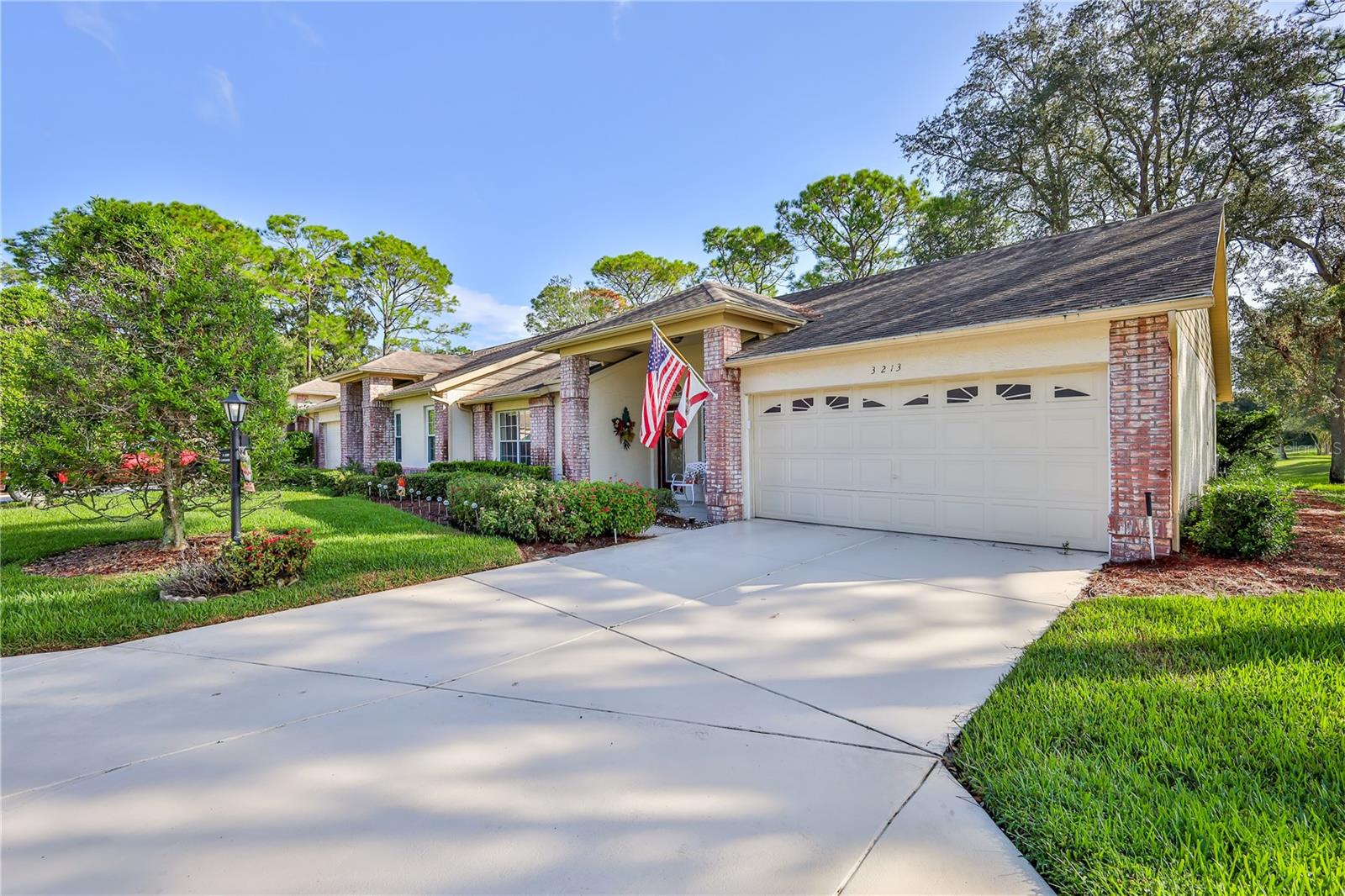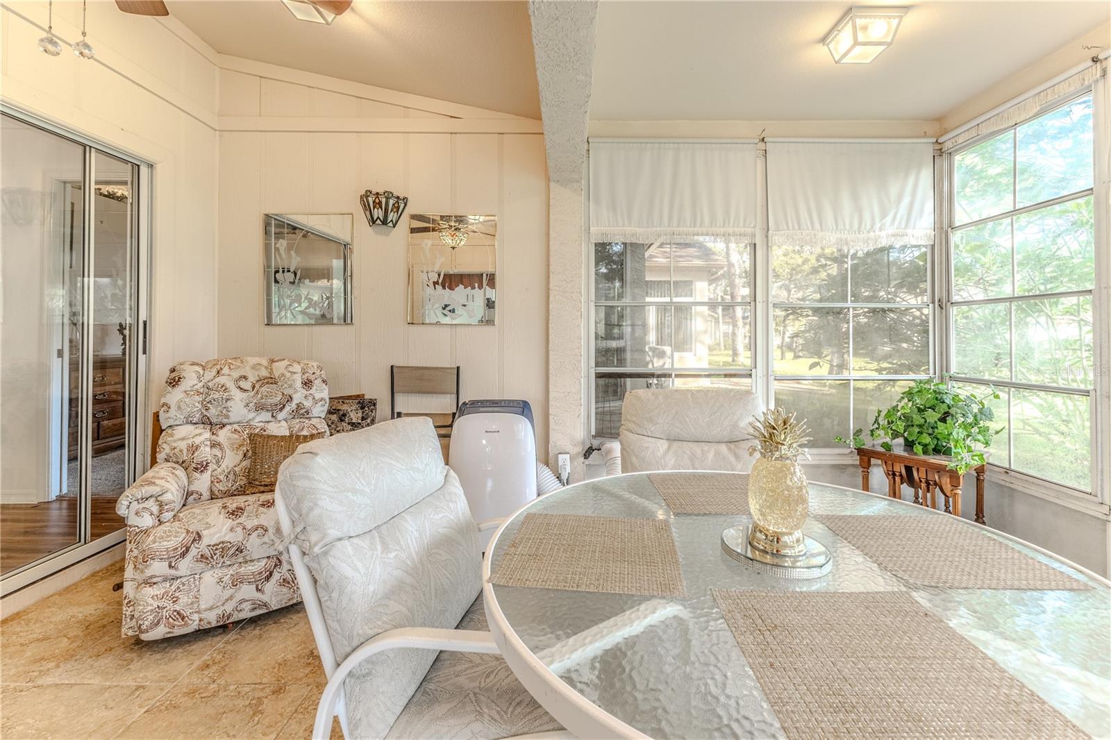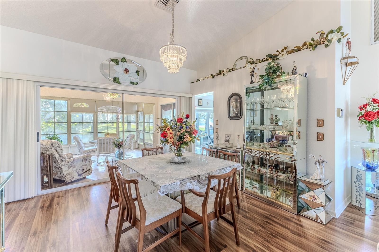 Welcome to this stunning, Magnolia model, end-unit villa, offering 2 bedrooms, 2.5 bathrooms, and a spacious 2-car garage, perfectly situated on a corner lot with peaceful pond views. From the moment you arrive, you'll appreciate the privacy, natural light, and beautiful scenery that make this home truly special. Step inside to an open-concept living area with vaulted ceilings, chandelier lighting, ceiling fans, and laminate flooring. The extended enclosed lanai—finished with vinyl windows and screens, includes the table and chairs—provides year-round enjoyment with serene views of trees, grass, and water. Just outside, an open patio is perfect for grilling or relaxing in the sunshine. The kitchen is a standout, featuring vaulted ceilings, tile floors, stainless steel appliances, a pantry, and a large picture window overlooking the pond. The kitchen opens to the family room, complete with a sparkling ceiling fan fixture. The front bedroom includes a large walk-in closet and easy access to a full bathroom with a tub/shower combo and linen closet. The main suite offers a private retreat with vaulted ceilings, a bump-out sitting area, dual closets, and an en suite bathroom with dual sink vanity, shower, and toilet. Additional highlights include: inside laundry room, storage, Half bath off the garage. Newer windows throughout. 2-car garage with ceiling fan and freezer included. Golf cart and some furnishings available for purchase separately. Roof 2015. HVAC 2019. Remediated settlement with all documents, fully insurable and financeable. Woodlands Village allows one dog. Timber Pines is an award winning, guard-gated, 55+, deed-restricted community offering a resort-style lifestyle: three 18-hole golf courses, a 9-hole pitch & putt, tennis, 12 pickleball courts, two community swimming pools, country club restaurant and bar, fitness center, billiards, performing arts, and over 100 social clubs and activities. This villa combines comfort, functionality, and charm with a prime pond-front location. Don't miss your chance to enjoy the Florida lifestyle in this desirable corner property!