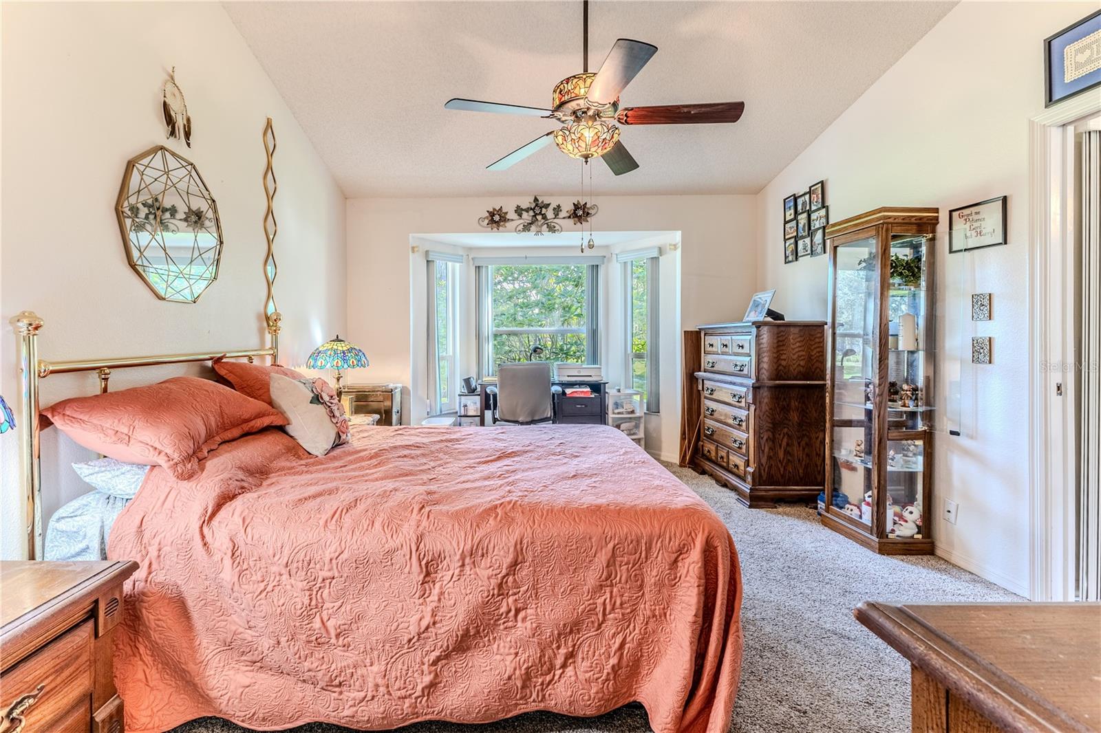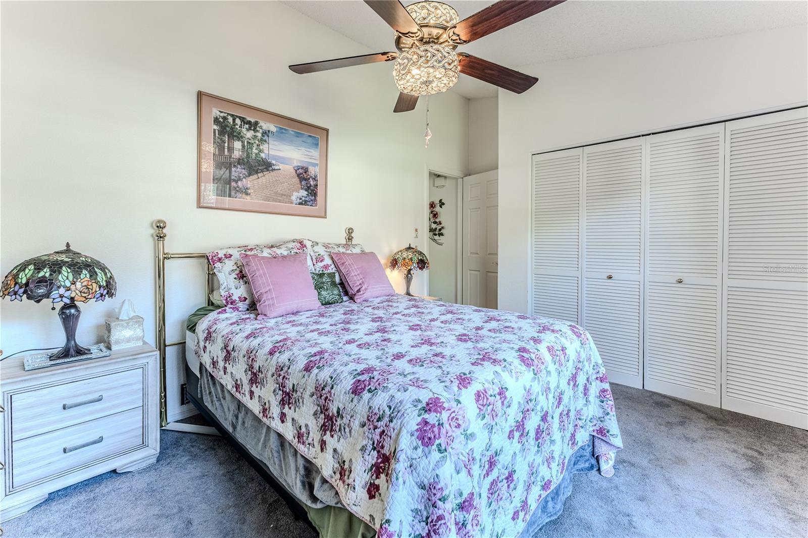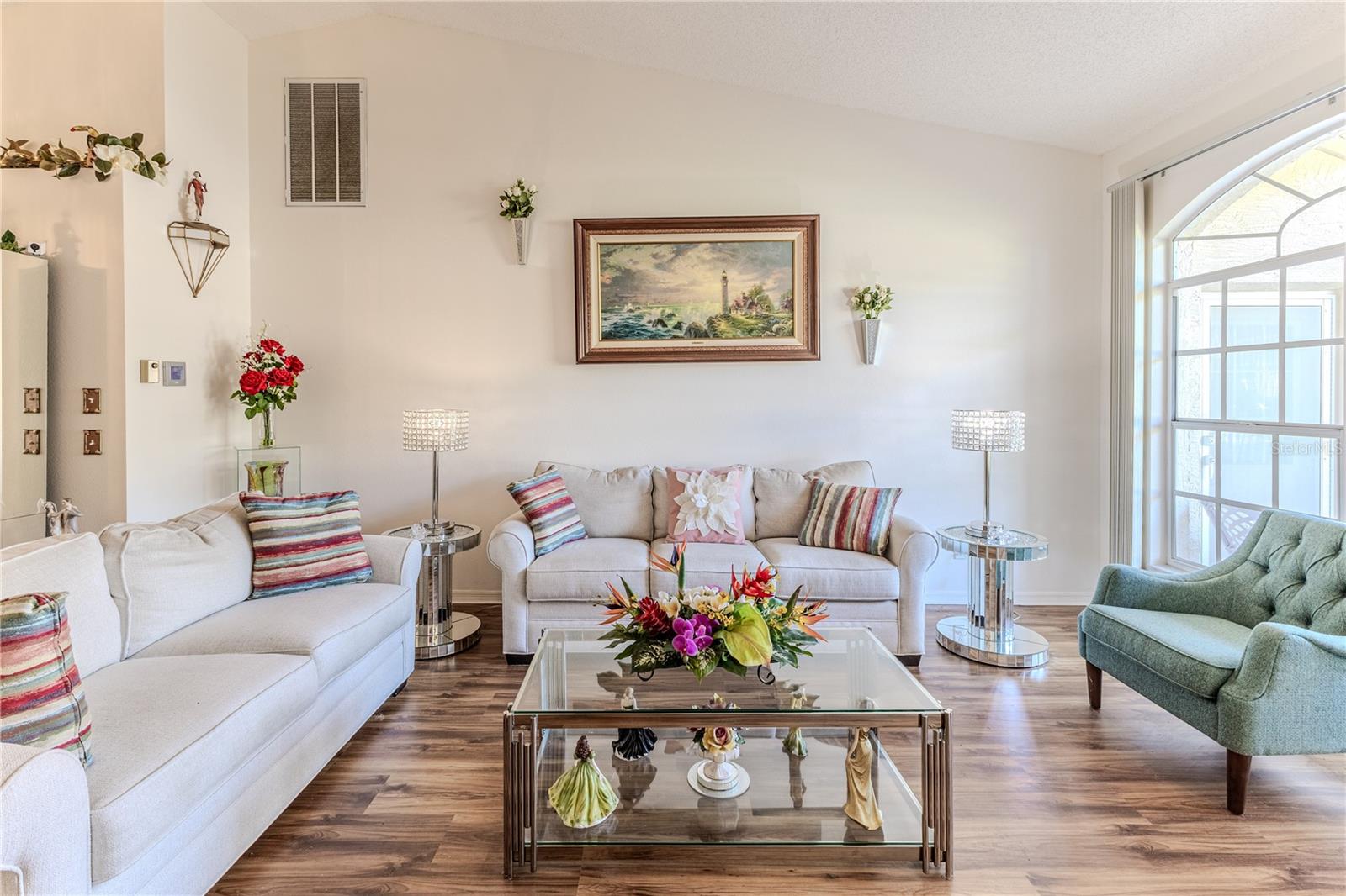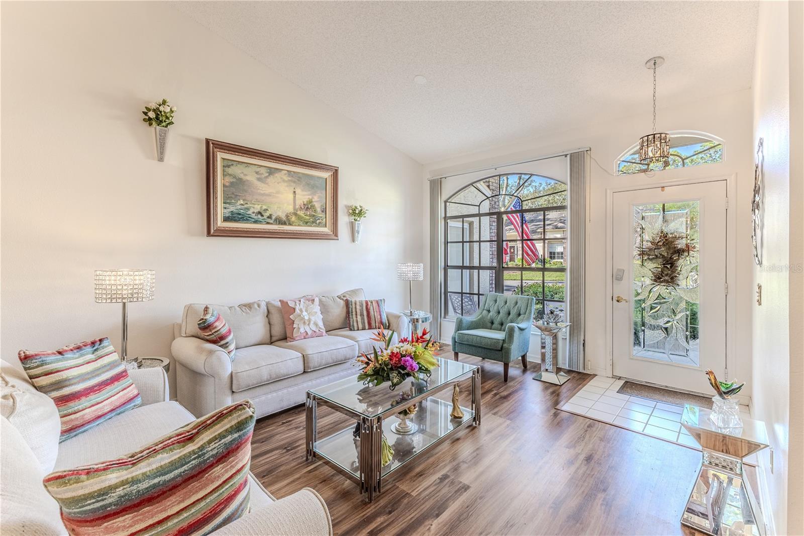 Welcome to this stunning, Magnolia model, end-unit villa, offering 2 bedrooms, 2.5 bathrooms, and a spacious 2-car garage, perfectly situated on a corner lot with peaceful pond views. From the moment you arrive, you'll appreciate the privacy, natural light, and beautiful scenery that make this home truly special. Step inside to an open-concept living area with vaulted ceilings, chandelier lighting, ceiling fans, and laminate flooring. The extended enclosed lanai—finished with vinyl windows and screens, includes the table and chairs—provides year-round enjoyment with serene views of trees, grass, and water. Just outside, an open patio is perfect for grilling or relaxing in the sunshine. The kitchen is a standout, featuring vaulted ceilings, tile floors, stainless steel appliances, a pantry, and a large picture window overlooking the pond. The kitchen opens to the family room, complete with a sparkling ceiling fan fixture. The front bedroom includes a large walk-in closet and easy access to a full bathroom with a tub/shower combo and linen closet. The main suite offers a private retreat with vaulted ceilings, a bump-out sitting area, dual closets, and an en suite bathroom with dual sink vanity, shower, and toilet. Additional highlights include: inside laundry room, storage, Half bath off the garage. Newer windows throughout. 2-car garage with ceiling fan and freezer included. Golf cart and some furnishings available for purchase separately. Roof 2015. HVAC 2019. Remediated settlement with all documents, fully insurable and financeable. Woodlands Village allows one dog. Timber Pines is an award winning, guard-gated, 55+, deed-restricted community offering a resort-style lifestyle: three 18-hole golf courses, a 9-hole pitch & putt, tennis, 12 pickleball courts, two community swimming pools, country club restaurant and bar, fitness center, billiards, performing arts, and over 100 social clubs and activities. This villa combines comfort, functionality, and charm with a prime pond-front location. Don't miss your chance to enjoy the Florida lifestyle in this desirable corner property!
