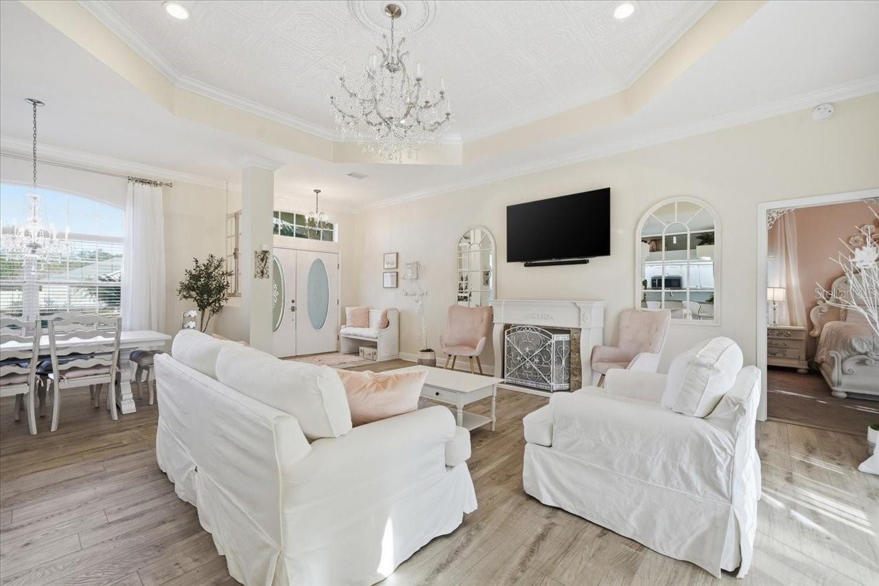 Beautifully maintained 3-bedroom, 2-bath single-family home offering a bright, open layout and tasteful finishes throughout. The inviting exterior features a well-kept lawn and attractive curb appeal. Inside, the kitchen showcases white cabinetry, granite countertops, tile flooring, stainless steel appliances, and subway tile backsplash, opening seamlessly to the dining and living areas—ideal for both everyday living and entertaining. The dining space is highlighted by large windows and elegant lighting, allowing for abundant natural light. The spacious primary suite includes a double-sink vanity and a walk-in tiled shower with decorative accents. Neutral finishes and crown molding add a cohesive, refined touch throughout the home. Enjoy Florida living on the covered rear patio, perfect for relaxing or outdoor seating. Conveniently located near shopping, dining, and major roadways in Spring Hill. Seller also owns a neighboring property, presenting a rare opportunity for buyers seeking proximity for family members or related households while maintaining separate residences.