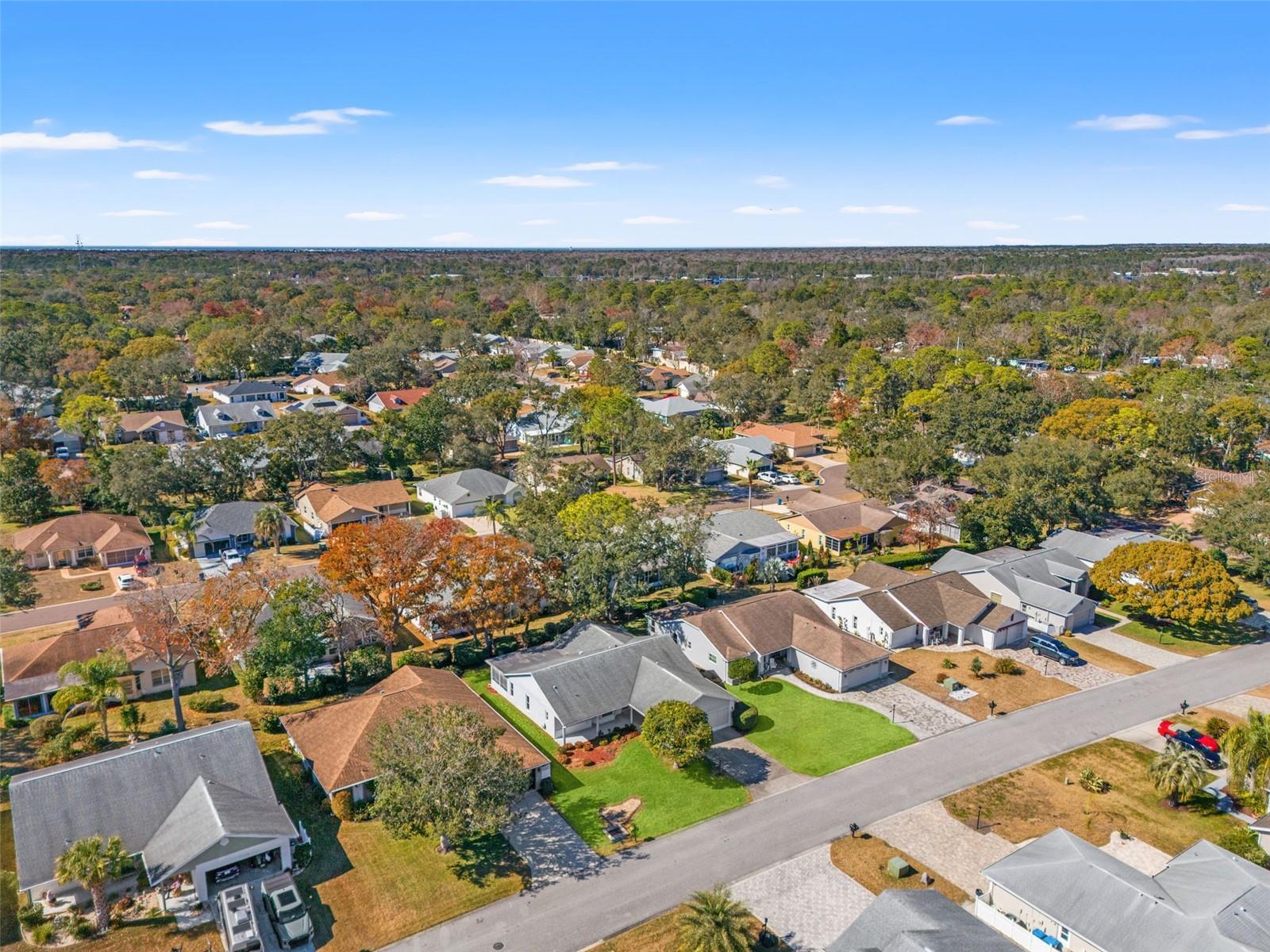 Awesome three-bedroom home located in award-winning Timber Pines. Enter into a light and bright living room/dining room combination that opens to an oversized lanai—perfect for relaxing or entertaining. The kitchen, accessible from the dining area, offers plenty of cabinets and counter space along with a lovely breakfast nook. The spacious primary suite features two large walk-in closets, dual sinks, and a step-in shower, with sliding doors opening directly to the lanai. This desirable split floor plan includes two guest bedrooms on the opposite side of the home with an adjacent bathroom offering a tub/shower combination. Additional highlights include a hall storage closet, coat closet at the entry, and an inside laundry room complete with washer, dryer, and utility sink. Save money with your own private irrigation well. Enjoy the lifestyle and amenities of Timber Pines in this well-maintained home. Timber Pines is a gated and guarded premier 55+ community featuring four golf courses, tennis and pickleball courts, clubhouse, fitness center, pools, full-service restaurant, dog park, performing arts center, resident activity center, billiards center, billiards center, wood shop, arts and crafts room, and over 100 social clubs and activities. Spectrum cable TV with two boxes and high-speed internet are included in the HOA. Don't miss your opportunity to enjoy comfort, convenience, and community in Timber Pines. Schedule your private showing today.