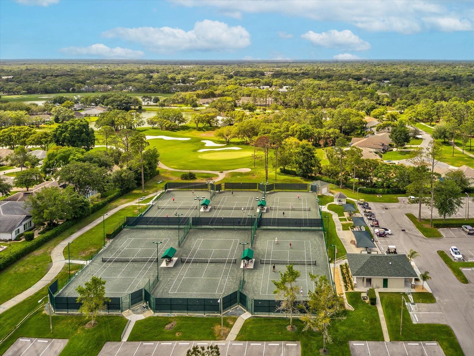 Welcome to easy Florida living in this beautifully maintained END-UNIT villa located in the exclusive, guard-gated golf community of Timber Pines. Perfectly positioned in the desirable Pine Glen village, this home blends privacy, comfort, and an unbeatable resort-style lifestyle. Step inside to a bright, open floor plan filled with natural light. Wood, tile, and high-end laminate flooring run throughout, creating a clean, modern feel with no carpet to worry about. The inviting layout is ideal for both everyday living and entertaining. The spacious eat-in kitchen features stainless steel appliances, an island for gathering, and plenty of prep space. The primary suite is a true retreat, offering a large walk-in closet with custom built-ins, dual sinks, a walk-in shower, and a solar tube that brings in soft natural light. A split layout provides privacy, with the guest bedroom on the opposite side of the home, also featuring its own walk-in closet and easy access to the second bath with tub/shower combo and solar tube. Upgrades and extras include a NEW roof, NEW A/C, recessed lighting throughout, electric blinds on the sliding doors, an electric garage screen, and accessible attic storage. Enjoy quiet mornings or relaxing evenings on the private back patio overlooking mature landscaping, or unwind on the welcoming front porch. Pine Glen residents enjoy their own private heated pool and a socially active neighborhood atmosphere, while Timber Pines offers one of the most amenity-rich lifestyles in the area. Residents have access to four association-owned golf courses, a country club with elegant dining, an upscale sports bar, two Olympic-size heated pools, a state-of-the-art fitness and wellness center, performing arts theater, pickleball and tennis courts, bocce, billiards, and over 100 clubs and activities. HOA fees include cable (two boxes), high-speed internet, and termite protection. If you’ve been searching for low-maintenance living with high-end amenities, vibrant social opportunities, and true Florida lifestyle appeal, this is the one! AC 2022, ROOF 2024.