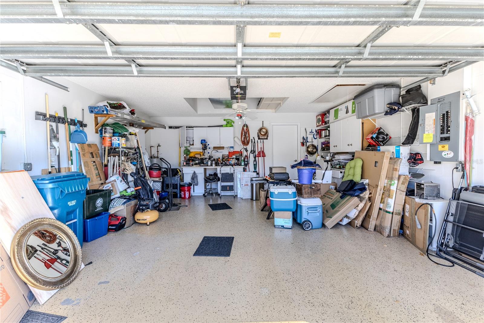 Desirable end-unit villa offering 2 bedrooms, 2 bathrooms, and a spacious 2-car garage is furnished and includes the golf cart. The vaulted ceilings in the living and dining room combination create an open, airy feel, complemented by elegant chandeliers and wood-look laminate flooring throughout the main living areas. The beautifully updated kitchen features white cabinetry, granite countertops, designer pendant lighting, closet pantry plus an additional storage pantry, and a bright eat-in area overlooking the retention area and golf course. The extended family room offers additional living space and includes a ceiling fan for comfort. Step outside to enjoy peaceful golf course views from your private rear patio, complete with a concrete pad ideal for grilling and outdoor furnishings. The guest suite is thoughtfully positioned at the front of the home and can be closed off with a pocket door for privacy. It features an updated full bathroom with a stylish vanity, tile flooring, and a tub/shower combination. The guest bedroom includes an oversized walk-in closet offering exceptional storage space. The primary bedroom overlooks the serene backyard and includes two large walk-in closets and a ceiling fan. The primary bath features a spacious walk-in shower with dual showerheads, dual sink vanity, linen closet, wood cabinetry, and beautiful tile flooring. Additional highlights include an interior laundry room with utility sink, washer and dryer included, and shelving for storage. The garage offers built-in shelving, a workbench, pull-down attic access, and a convenient side service door for easy entry. Roof 2020. HVAC 2017. A note for the animal lovers - this village is a no-dog zone. Maintenance covers exterior painting, irrigation, lawnmowing, front hedge trimming, lawn fertilization, cable tv, internet, village pool -- simplifying ownership and freeing up your time. Timber Pines is an award-winning, guard-gated, 55+ community, where residents enjoy three 18-hole golf courses, a 9-hole pitch & putt, 12pickleball courts, tennis, two community pools, a country club restaurant and bar, fitness center, performing arts, billiards, and over 100social clubs and activities. The villa offers a peaceful, beautiful view and an easy-care lifestyle.