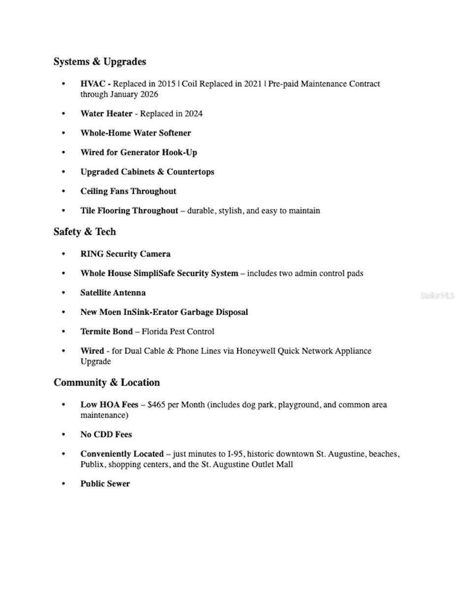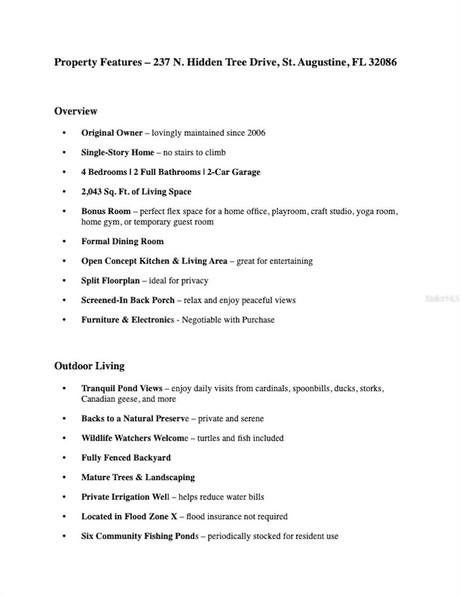 Welcome to 237 N. Hidden Tree Drive – a lovingly maintained, original-owner home nestled on a tranquil pond in the sought-after community of Hideaway at Old Moultrie. This spacious 4-bedroom, 2-bathroom residence offers over 2,000 square feet of single-level living, complete with an open-concept design, formal dining room, and a versatile bonus room perfect for an office, home gym, craft room, playroom or guest space. Enjoy peaceful mornings from your screened-in back porch overlooking a wildlife-rich pond and lush natural preserve. The fully fenced backyard, mature landscaping, and private irrigation well make outdoor living both serene and low maintenance. Inside, you’ll find upgraded cabinets and countertops, tile flooring throughout, ceiling fans in every room, and a split floor plan that ensures privacy. The HVAC system was replaced in 2015, with a new coil in 2021 and a prepaid maintenance plan through January 2026. The water heater is brand new (2024), and the home is wired for a generator. Tech and safety features include a RING camera system, SimpliSafe home security with dual admin panels, satellite antenna, and wired dual phone and cable lines through a Honeywell Quick Network Appliance upgrade. A termite bond with Florida Pest Control adds peace of mind. Located in Flood Zone X (no flood insurance required), this home is part of a quiet community with low annual HOA fees ($465/Year), no CDD, and access to playgrounds, a dog park, and six periodically stocked fishing ponds. Conveniently situated just minutes from I-95, historic downtown St. Augustine, area beaches, Publix, and shopping. Furniture and electronics are negotiable with purchase. Showings by appointment only. Pre-approval or proof of funds is required prior to scheduling.