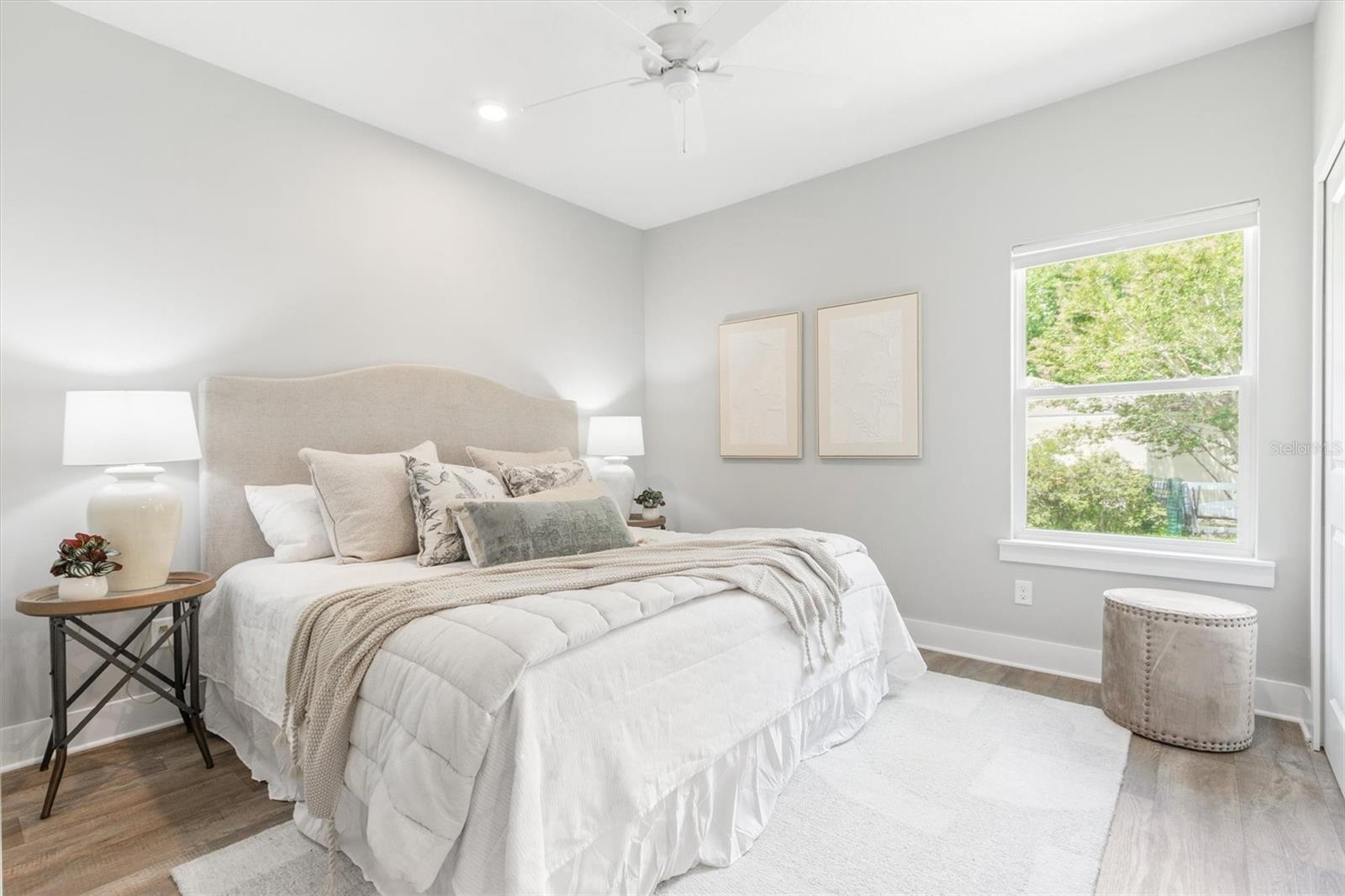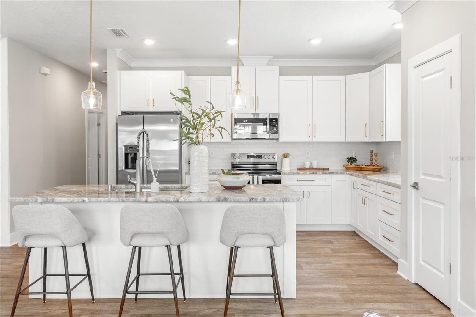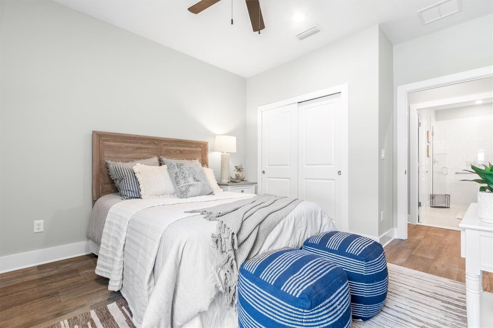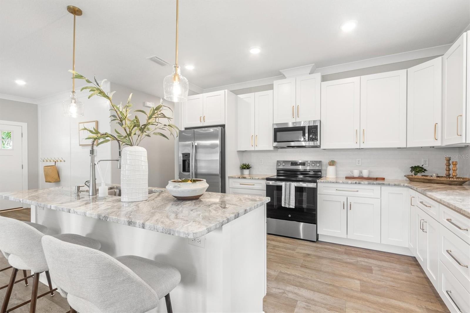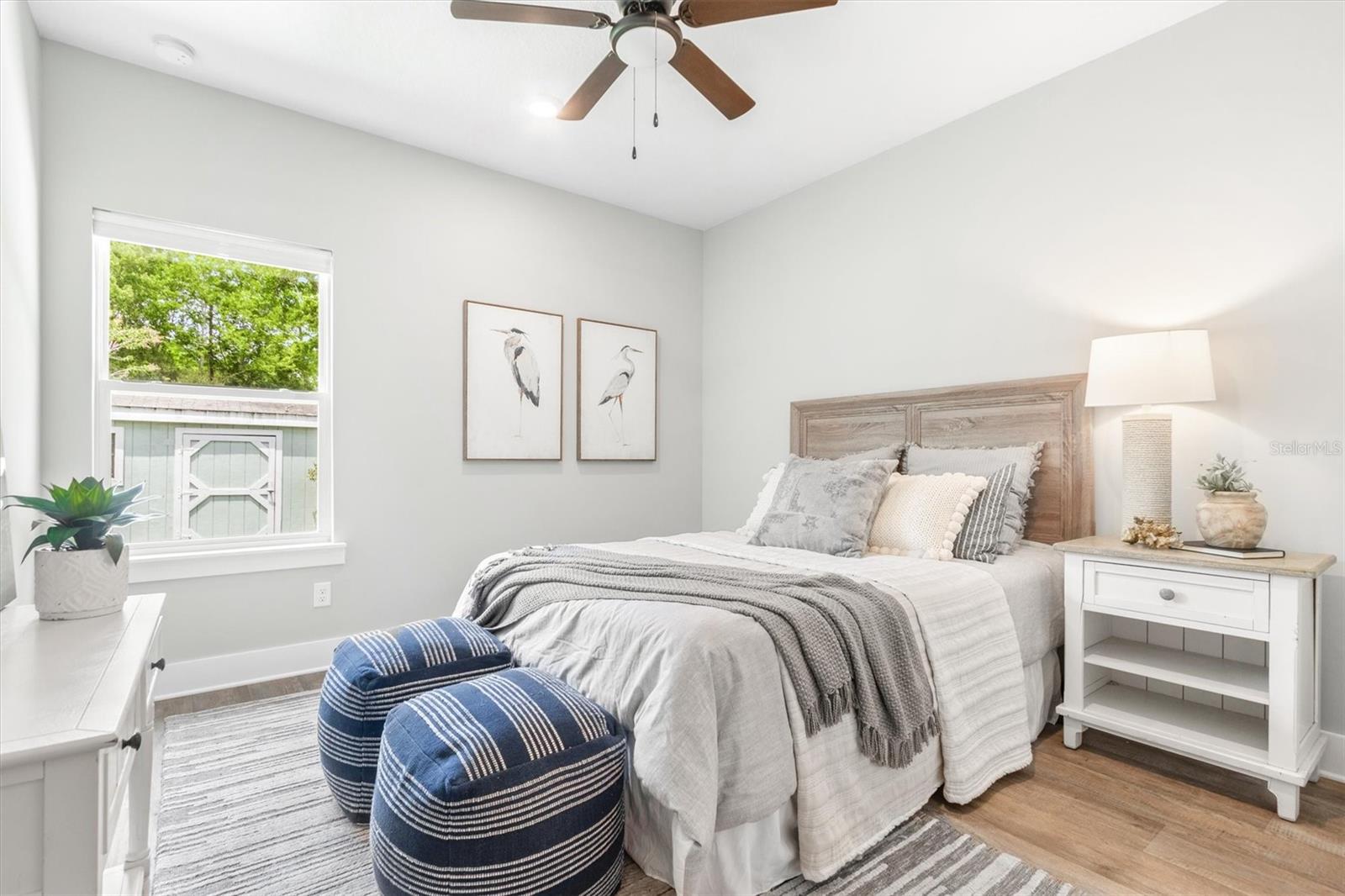 Welcome to this beautifully crafted 2024 home on a spacious half-acre, corner lot in St. Augustine. This 4-bedroom, 3-bath property offers nearly 1,800 square feet of open living with luxury vinyl plank flooring, upgraded tile, and elegant top-down bottom-up window shades. The gourmet kitchen features granite counters, upgraded cabinetry, a large island, and upscale fixtures. The flexible 4th bedroom doubles as a private office with a garage entrance and half-glass door with pet door. Enjoy a separate laundry room with sink, spacious front and back covered porches, remote patio blinds, an outdoor shower, and a fully fenced yard with kid/pet safety mesh and two gates. The oversized 2-car garage includes plumbing for a future bath or pet wash and a half-glass door. Also included: covered RV/boat port with pad, extra-large powered shed, tankless water heater, gutters with rain barrels, and smart features. All just 5 minutes to Crescent Beach and I-95.