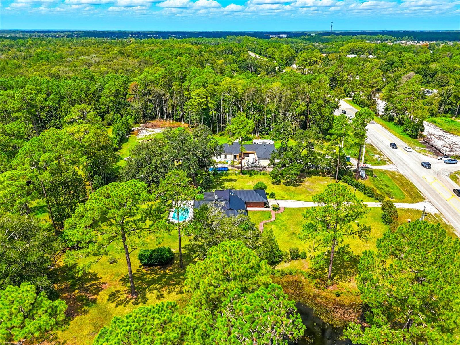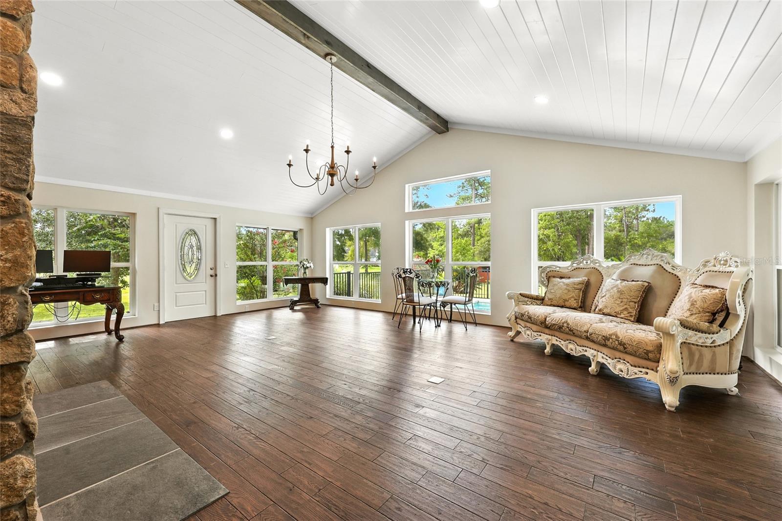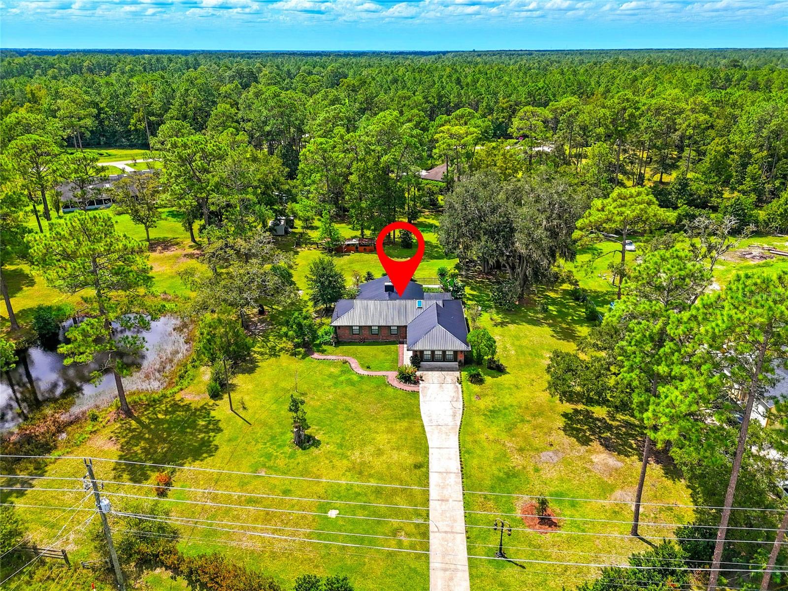Now offered at an exceptional new price — don’t miss this opportunity to own one of the best values in World Golf Village area. Tucked away in the peaceful countryside of historic Saint Augustine, this one-of-a-kind property combines rural charm with city convenience. Ideally located just 2 miles from the I-95 World Golf Village exit and only 11 miles from the ocean, this home offers a lifestyle that’s hard to find anywhere else in the area. The well-built brick residence has been fully remodeled into an open-concept floor plan and features a brand-new galvanized metal roof. A stunning Great Room addition, completed in 2024, expands the living space and makes this home truly exceptional. Step inside to find high-beamed ceilings, elegant chandeliers, rich hardwood floors, and spacious areas perfect for gatherings. The newly designed kitchen showcases luxurious granite countertops, Italian travertine flooring, stainless steel appliances, and a generous walk-in pantry. The show-stopping Great Room boasts a dramatic 16-foot cathedral ceiling with exposed beams, seven oversized 6x6 ft windows, gleaming hardwood floors, and a striking two-way wood-burning fireplace crafted from natural Tennessee mountain stone. Bathed in natural light, this space offers tranquil views of the property and seamless access to the pool and covered patio. Opportunity awaits—the covered patio rests on a concrete slab, creating the potential for a future 4th bedroom or in-law suite with private access to both the Great Room and pool area. Set on 1.99 acres of high and dry land (no flood zone), the property is surrounded by lush landscaping that includes majestic Florida live oaks, citrus trees, and year-round blooming botanicals. Local wildlife such as wild turkey, deer, and a variety of birds can often be spotted roaming the grounds, while the land also supports livestock, as many neighboring farms do. Three outbuildings add even more value: a small barn with three sections (ideal for livestock and storage) complete with a chicken coop and eight nesting boxes, plus two sheds—including one with a side carport. With endless possibilities for both living and lifestyle, this property offers a rare blend of elegance, functionality, and natural beauty. Don’t miss your chance to see it in person—schedule your showing today!