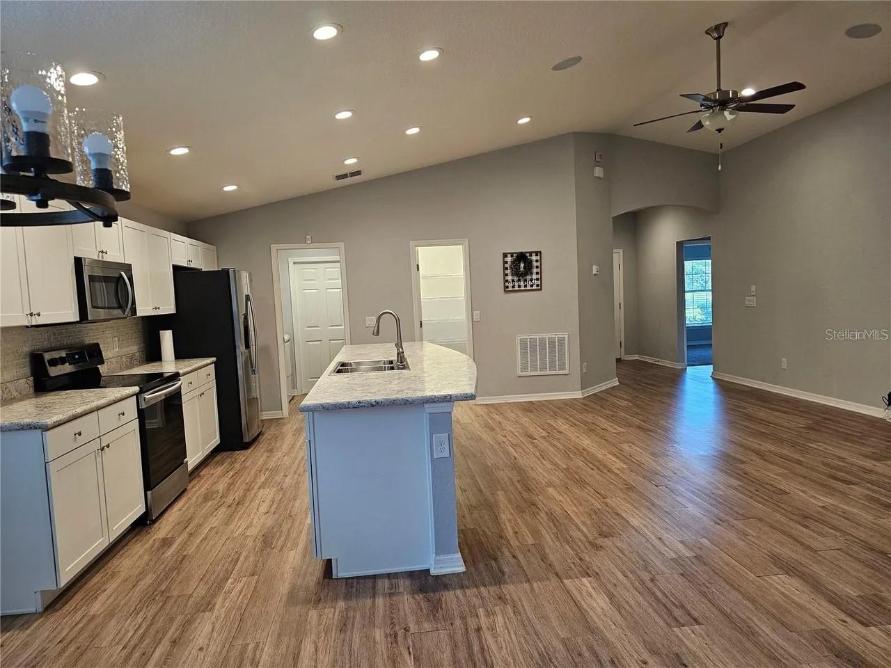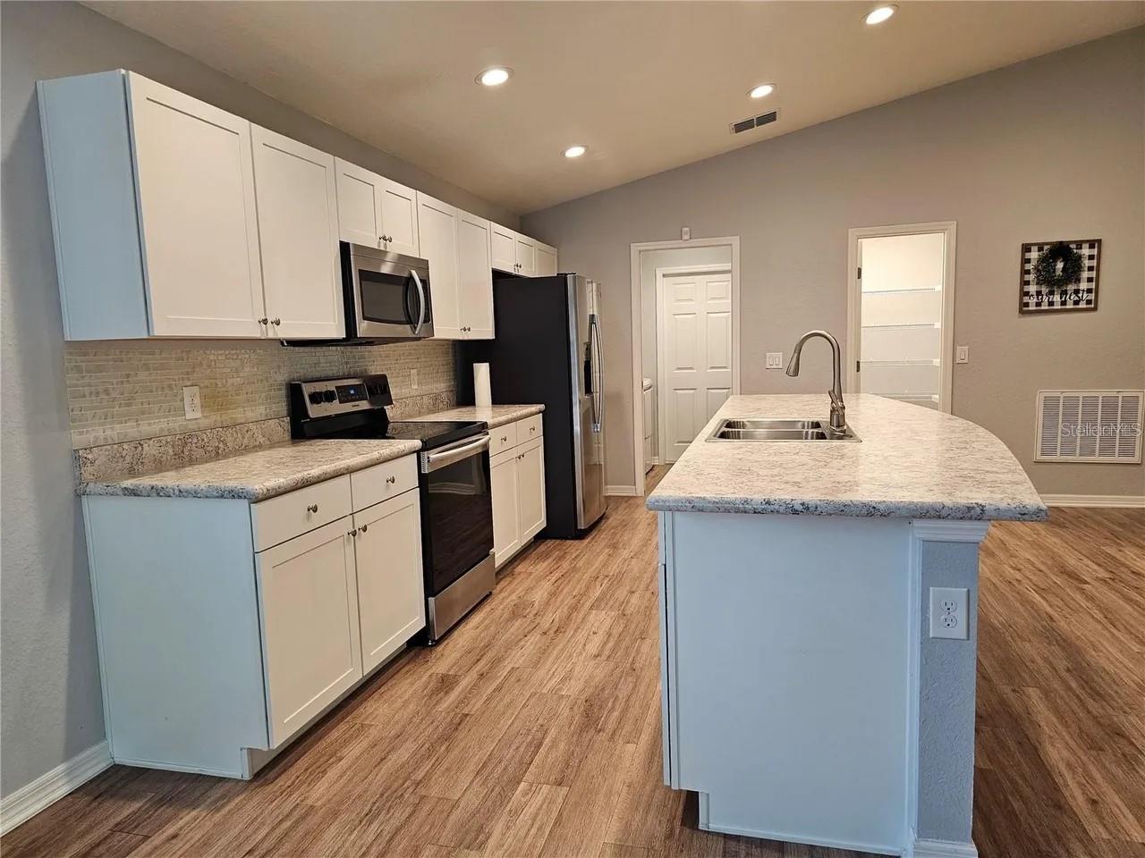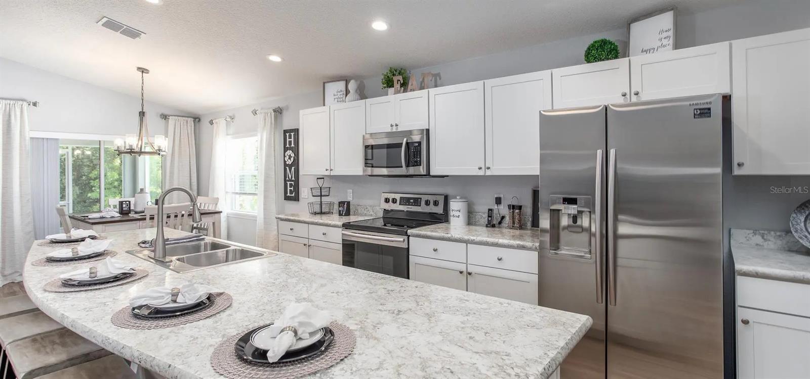 Like new home formerly the builder's model home. Home has no neighbors in the back so you have privacy with beautiful trees. Home has the following features: open floor plan with volume ceilings, large gathering room with built in surround sound ceiling speakers, gorgeous kitchen with low maintenance stainless steel Samsung appliances such as a smooth top stove, over the range microwave, quiet-operation dishwasher, side by side refrigerator, pull down faucet, energy efficient LED recessed lighting in living area and master bedroom, beautiful shaker style cabinets with soft close hinges and decorative knobs/pull both in kitchen and bathrooms, oversized countertop for plenty of sitting area to entertain at as well as easy to clean wood style vinyl plank flooring in living area, laundry room, kitchen, and bathrooms and Mohawk stain resistant carpet in bedrooms. The master bathroom has dual sinks, garden tub, separate shower with all custom decorative tiles and a nice size master closet with extra shelving for organizing. Since this was the model home, you will see in all the bedrooms special paint design as well as wall decor to give it a tasteful design. The other extra upgrades are the wireless security system, insulated and finished garage walls as well as 4-foot depth extension making garage oversized which is a great option added to this home. The custom led lighting in garage and epoxy floor an added upgrade which not many homes do not have. Garage can be converted to an office, if needed, as there are many electrical connections as well as for internet access. Home has built in pest control, architectural shingles with limited-lifetime warranty. Save on utilities with energy-efficient Radiant Barrier, R-30 insulation, foam-injected block insulation, double-pane Low-E windows and programmable thermostat. Enjoy sitting in your screened in porch or your open porch area near your entrance door. So come and see this amazing home.