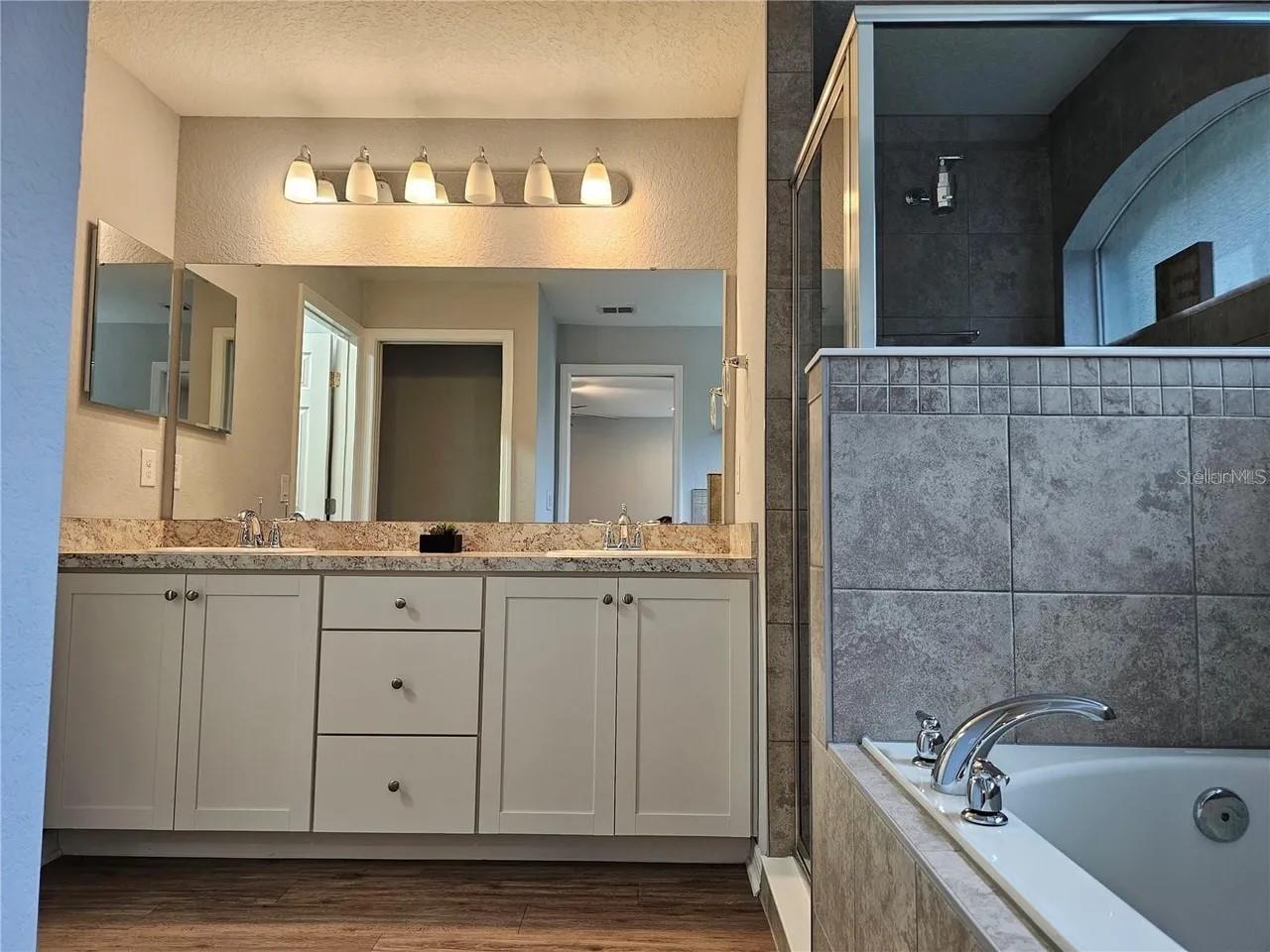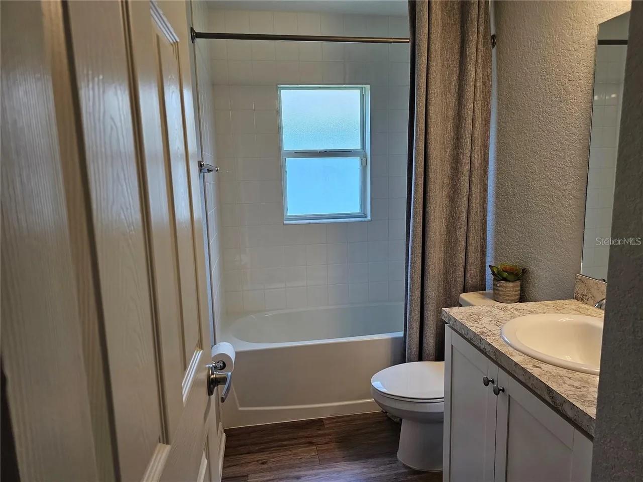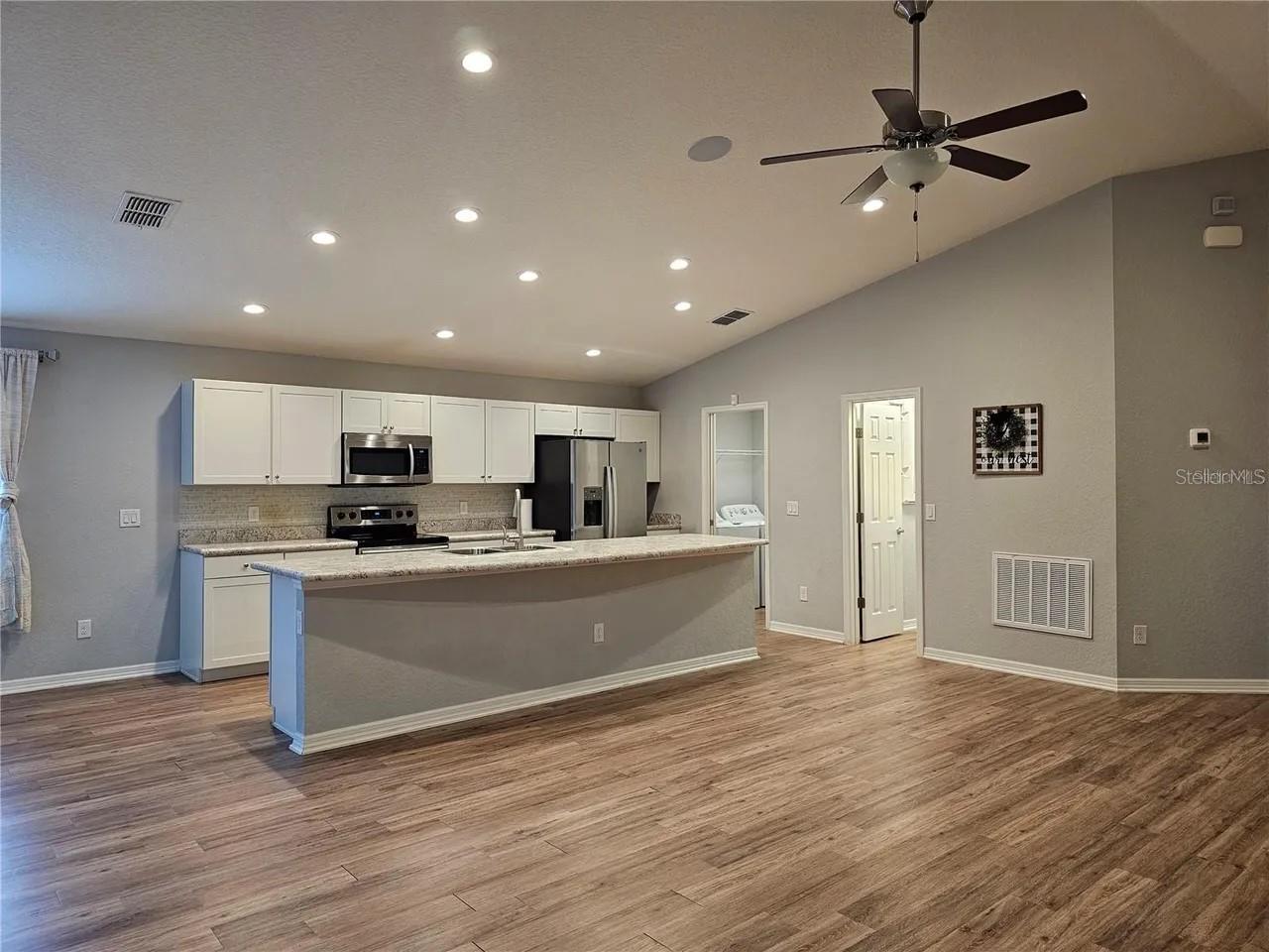 Like new home formerly the builder's model home. Home has no neighbors in the back so you have privacy with beautiful trees. Home has the following features: open floor plan with volume ceilings, large gathering room with built in surround sound ceiling speakers, gorgeous kitchen with low maintenance stainless steel Samsung appliances such as a smooth top stove, over the range microwave, quiet-operation dishwasher, side by side refrigerator, pull down faucet, energy efficient LED recessed lighting in living area and master bedroom, beautiful shaker style cabinets with soft close hinges and decorative knobs/pull both in kitchen and bathrooms, oversized countertop for plenty of sitting area to entertain at as well as easy to clean wood style vinyl plank flooring in living area, laundry room, kitchen, and bathrooms and Mohawk stain resistant carpet in bedrooms. The master bathroom has dual sinks, garden tub, separate shower with all custom decorative tiles and a nice size master closet with extra shelving for organizing. Since this was the model home, you will see in all the bedrooms special paint design as well as wall decor to give it a tasteful design. The other extra upgrades are the wireless security system, insulated and finished garage walls as well as 4-foot depth extension making garage oversized which is a great option added to this home. The custom led lighting in garage and epoxy floor an added upgrade which not many homes do not have. Garage can be converted to an office, if needed, as there are many electrical connections as well as for internet access. Home has built in pest control, architectural shingles with limited-lifetime warranty. Save on utilities with energy-efficient Radiant Barrier, R-30 insulation, foam-injected block insulation, double-pane Low-E windows and programmable thermostat. Enjoy sitting in your screened in porch or your open porch area near your entrance door. So come and see this amazing home.