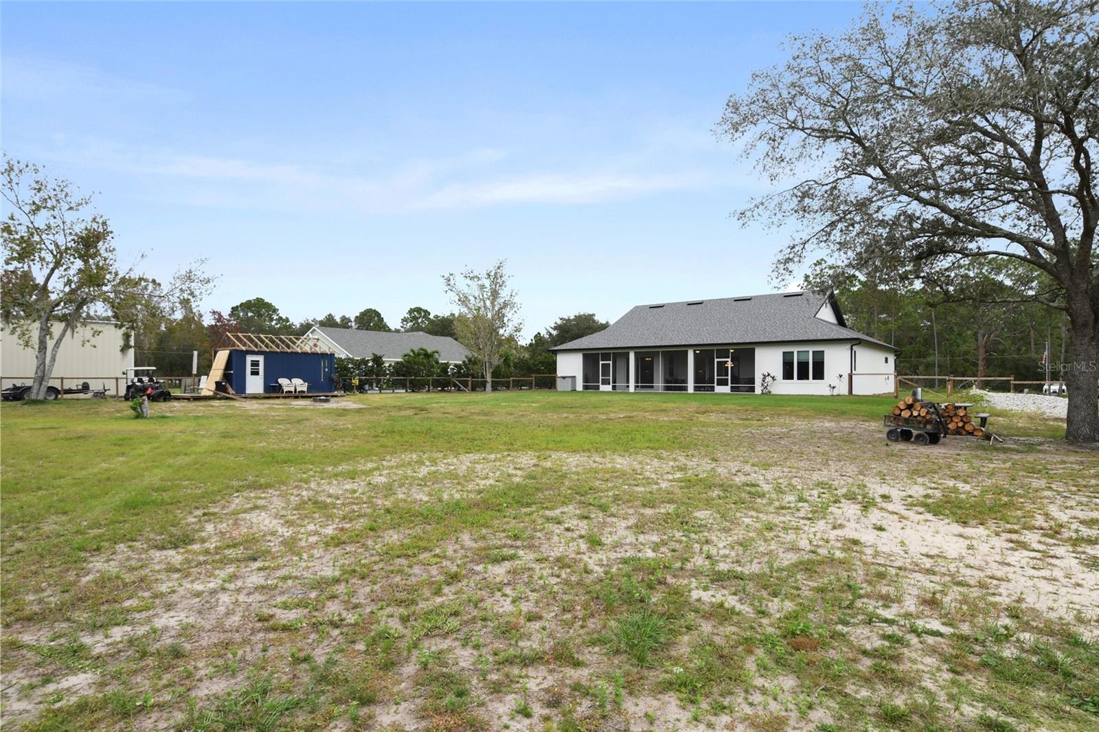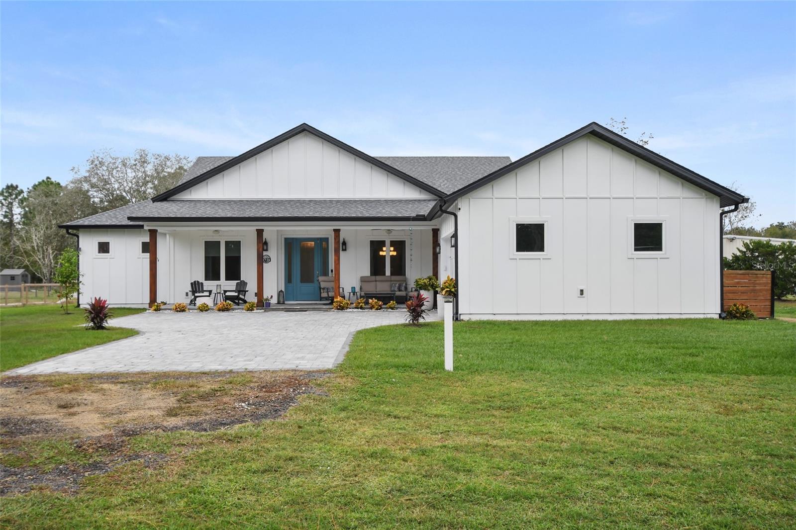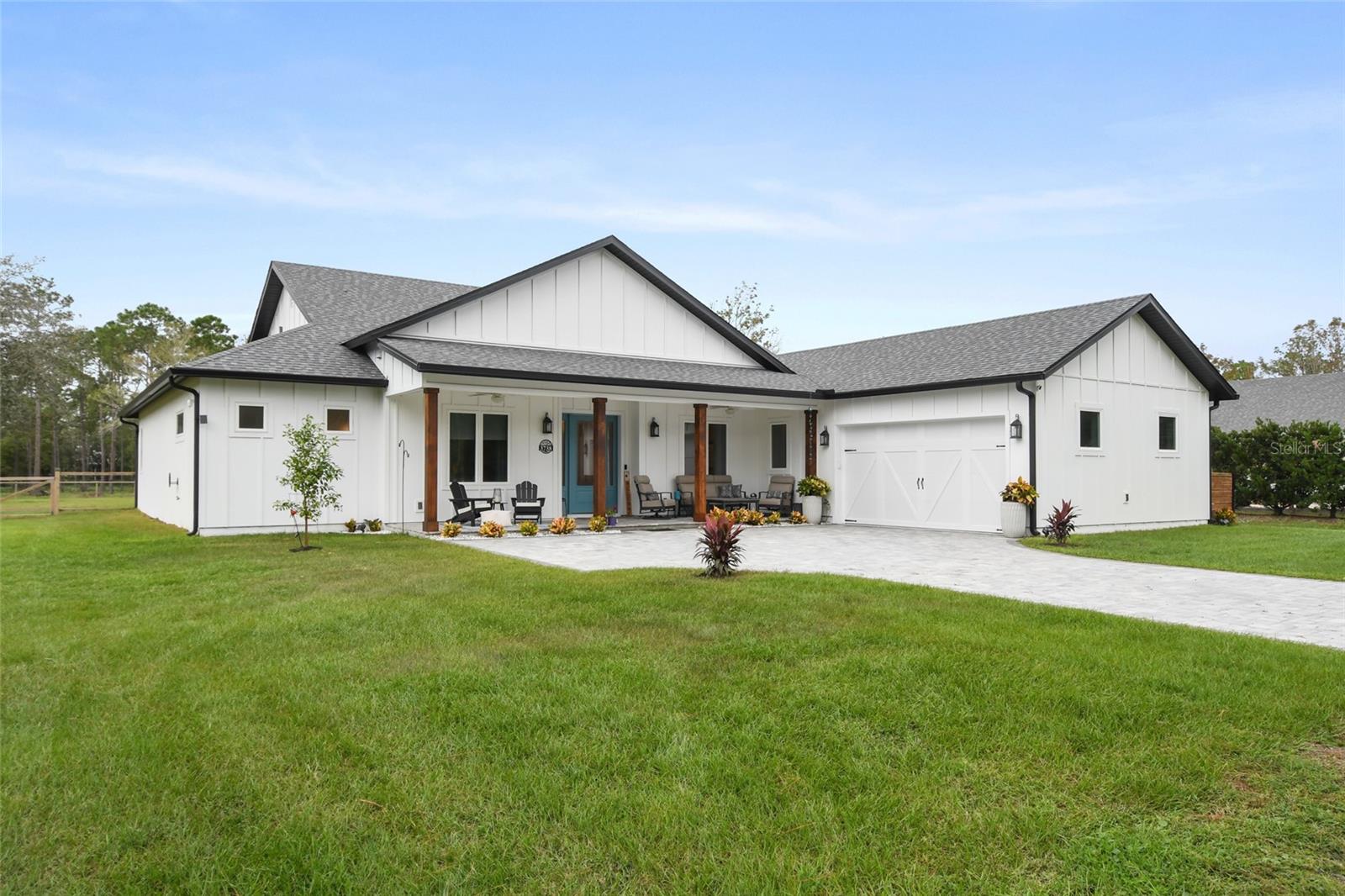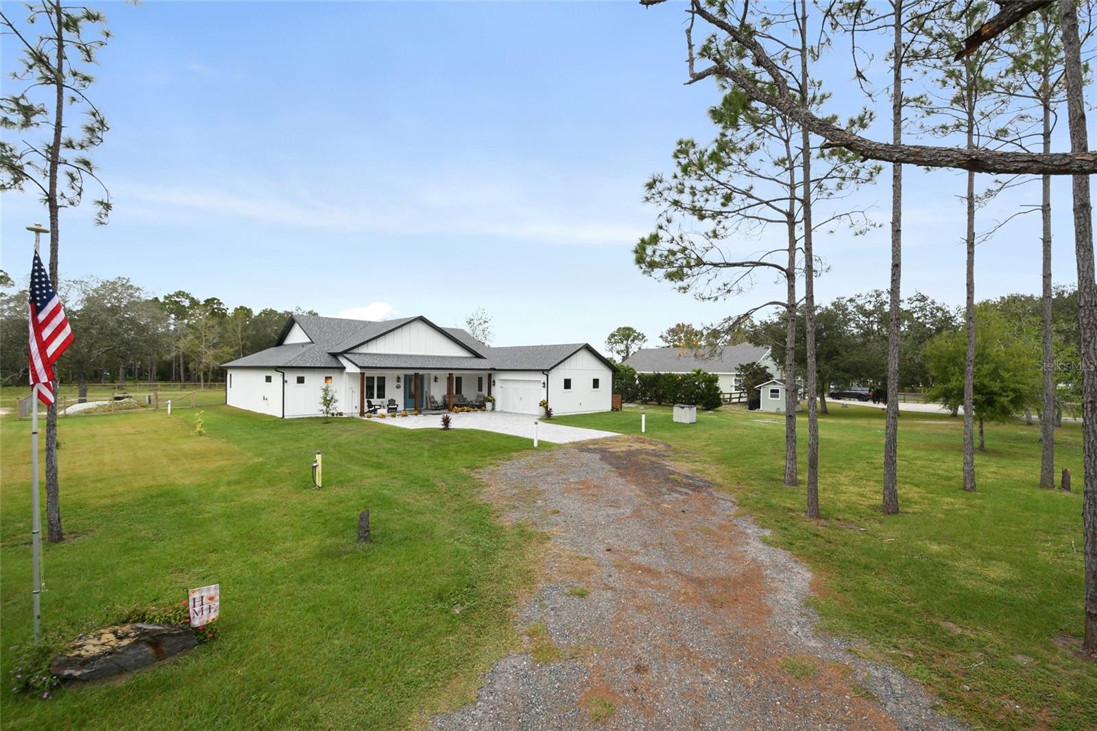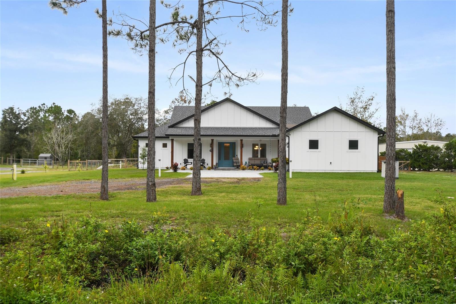 Nestled on a quiet, fully landscaped 1-acre lot, this stunning 2022-built dream home offers the perfect blend of modern luxury and peaceful retreat. Boasting FOUR spacious bedrooms and THREE and a half beautifully appointed bathrooms, this home is designed with a thoughtful open and split floor plan that maximizes space and comfort. The interior features SHAW luxury vinyl plank flooring throughout, offering both elegance and durability. The gourmet kitchen is a chef's dream, complete with an oversized island with breakfast bar, stainless steel sink, solid wood cabinets, built-in oven and microwave, and a beautiful subway tile backsplash that complements the stunning quartz countertops. The generous laundry room, located off the kitchen, includes built-in cabinets and a sink, leading directly to the garage. Large PELLA windows flood the space with natural light, highlighting the vaulted ceilings and creating an airy, open feel while offering picturesque views of the surrounding trees. Enjoy the tranquility of nature from the inviting covered front porch, the perfect spot for relaxing and taking in the gentle breeze. The home also features a fully finished garage with Shark Coating flooring, providing extra space for storage or hobbies. The extra-long driveway, featuring stylish pavers, offers additional parking. A unique shipping container in the backyard serves as additional storage or a potential office space. Located in a peaceful neighborhood with wooded surroundings, this home provides privacy and a serene lifestyle, all while being conveniently close to local attractions, theme parks, and other amenities. Schedule a showing today and make this incredible home yours!