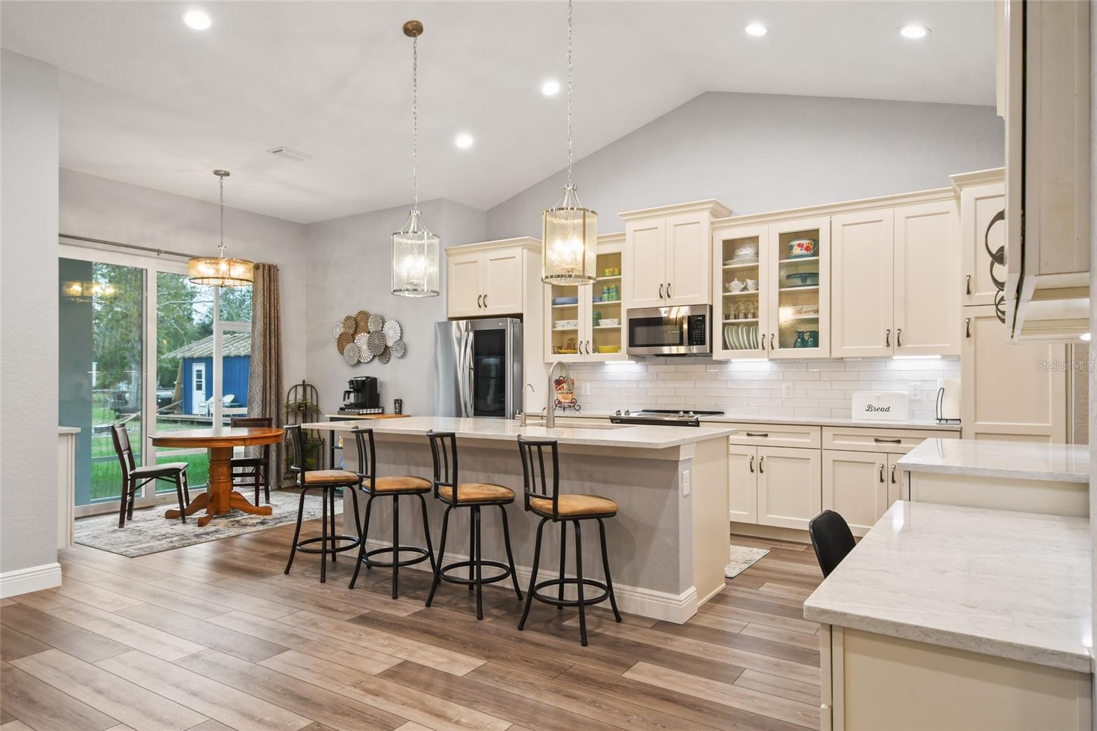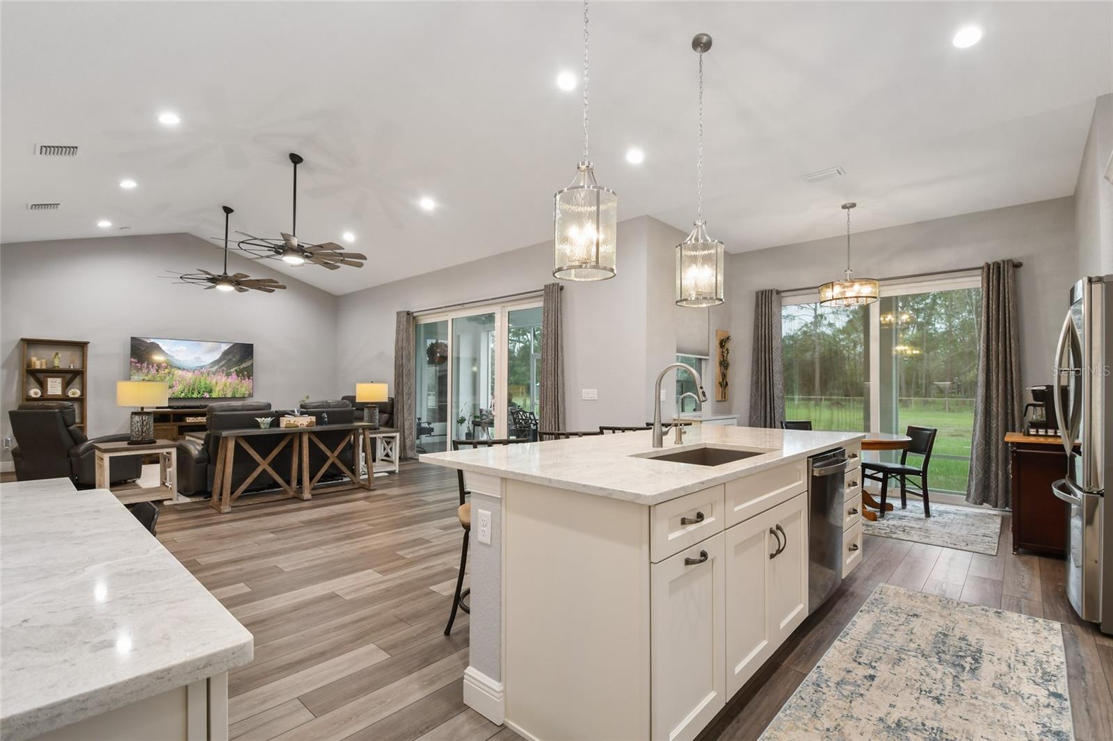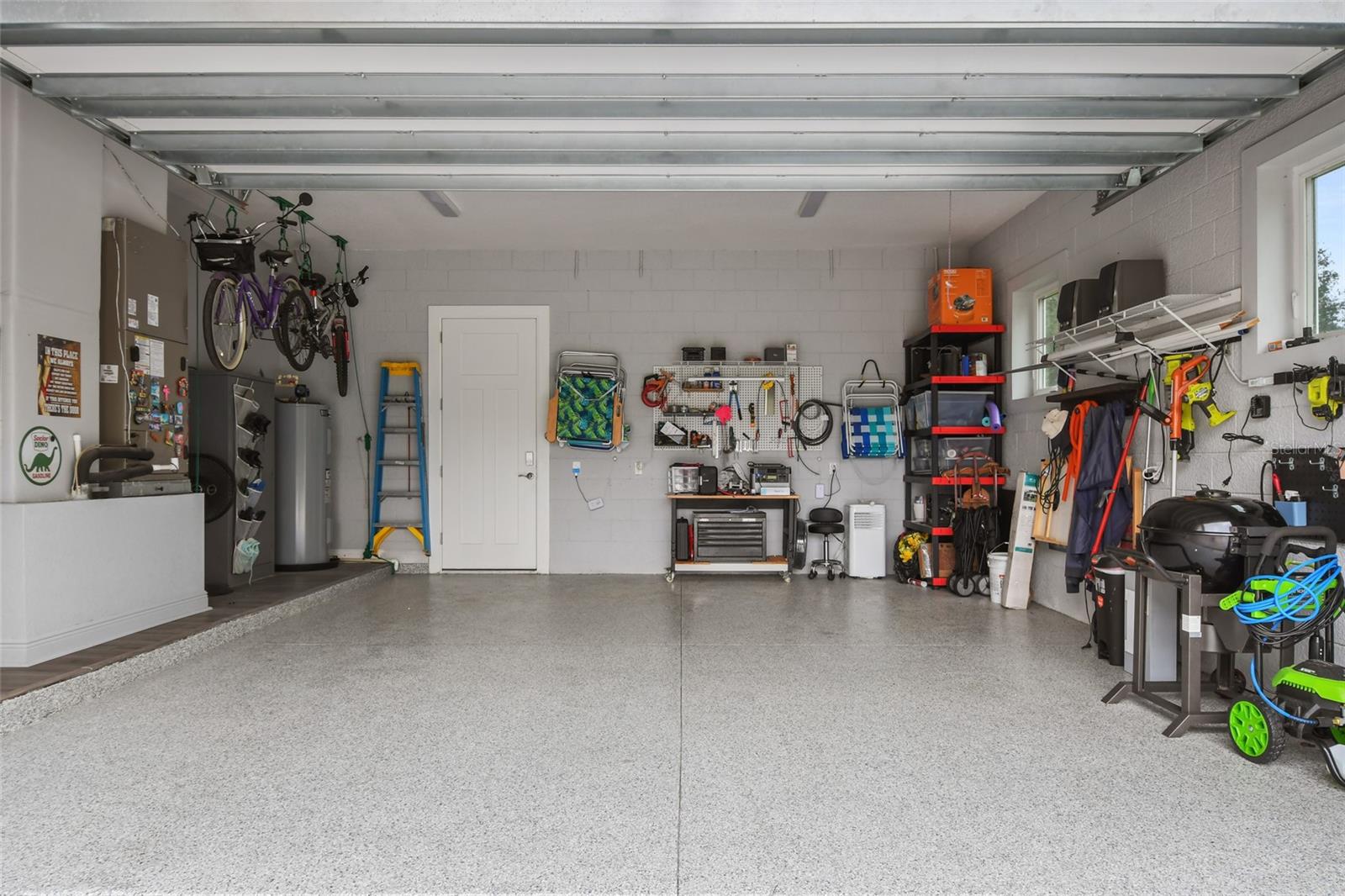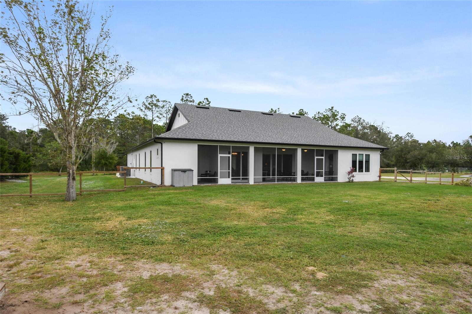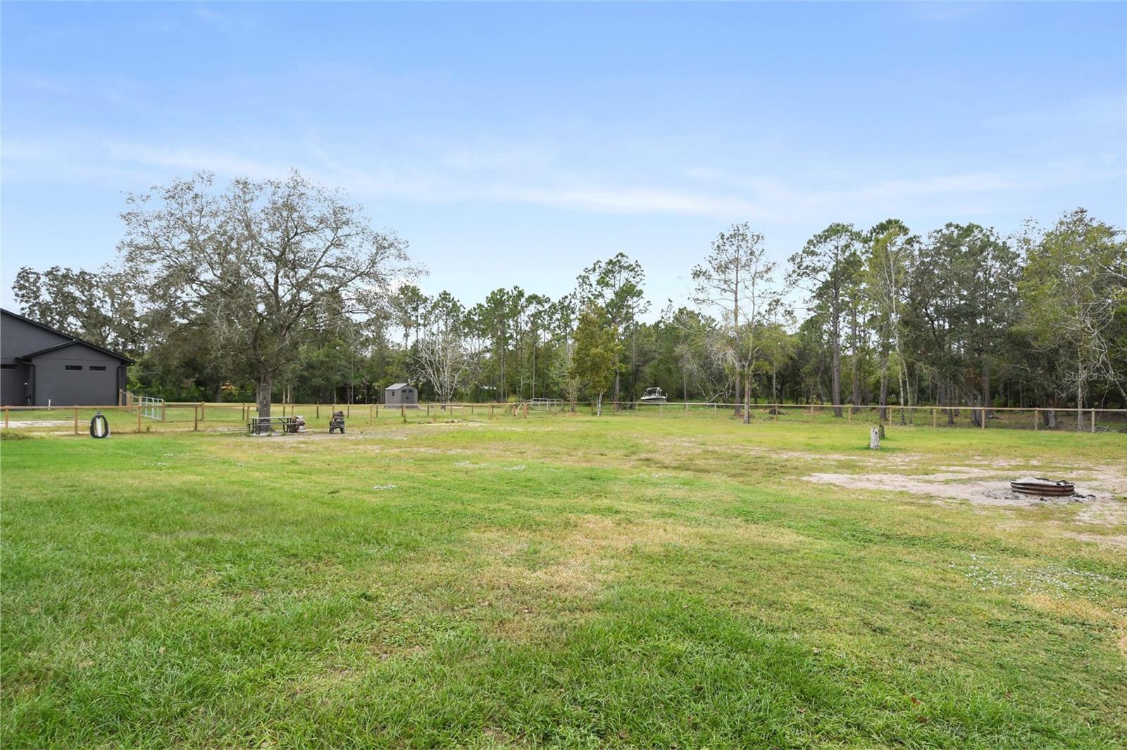Nestled on a quiet, fully landscaped 1-acre lot, this stunning 2022-built dream home offers the perfect blend of modern luxury and peaceful retreat. Boasting FOUR spacious bedrooms and THREE and a half beautifully appointed bathrooms, this home is designed with a thoughtful open and split floor plan that maximizes space and comfort. The interior features SHAW luxury vinyl plank flooring throughout, offering both elegance and durability. The gourmet kitchen is a chef's dream, complete with an oversized island with breakfast bar, stainless steel sink, solid wood cabinets, built-in oven and microwave, and a beautiful subway tile backsplash that complements the stunning quartz countertops. The generous laundry room, located off the kitchen, includes built-in cabinets and a sink, leading directly to the garage. Large PELLA windows flood the space with natural light, highlighting the vaulted ceilings and creating an airy, open feel while offering picturesque views of the surrounding trees. Enjoy the tranquility of nature from the inviting covered front porch, the perfect spot for relaxing and taking in the gentle breeze. The home also features a fully finished garage with Shark Coating flooring, providing extra space for storage or hobbies. The extra-long driveway, featuring stylish pavers, offers additional parking. A unique shipping container in the backyard serves as additional storage or a potential office space. Located in a peaceful neighborhood with wooded surroundings, this home provides privacy and a serene lifestyle, all while being conveniently close to local attractions, theme parks, and other amenities. Schedule a showing today and make this incredible home yours!