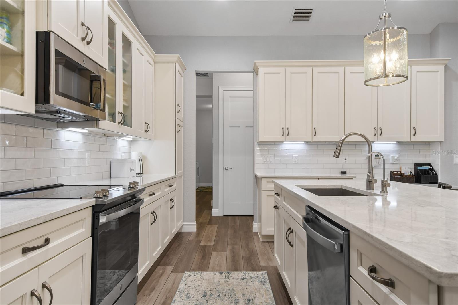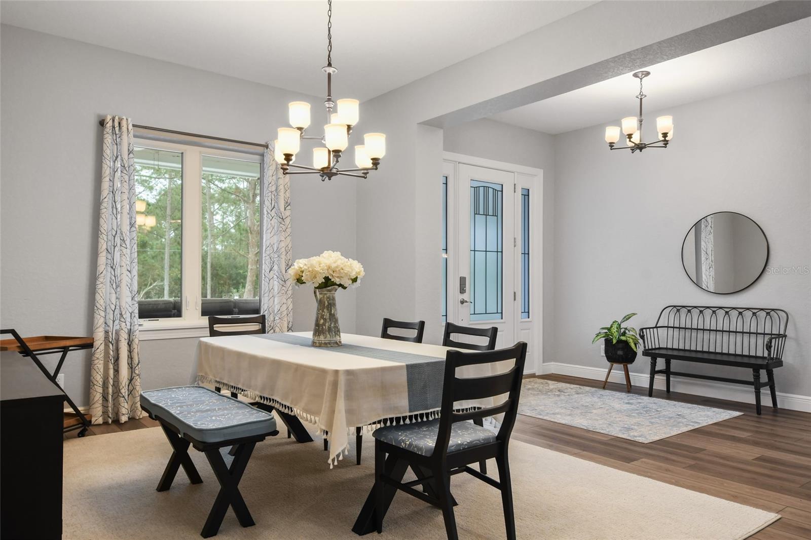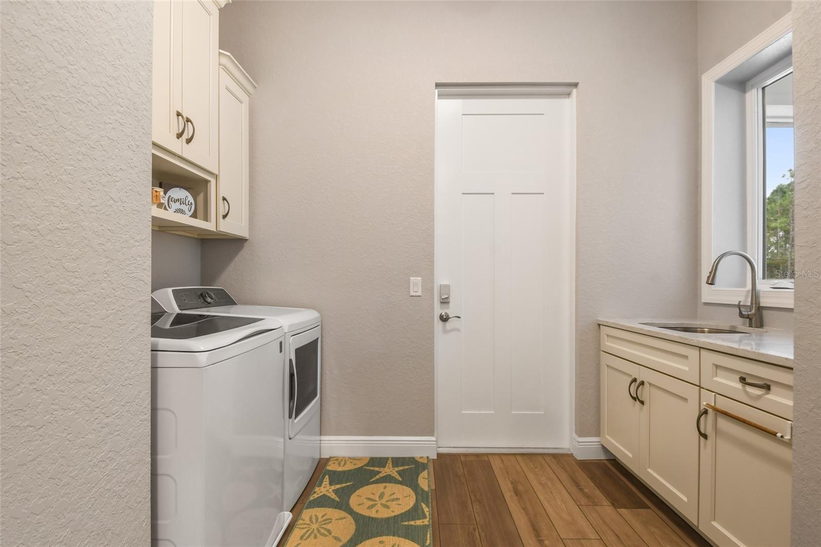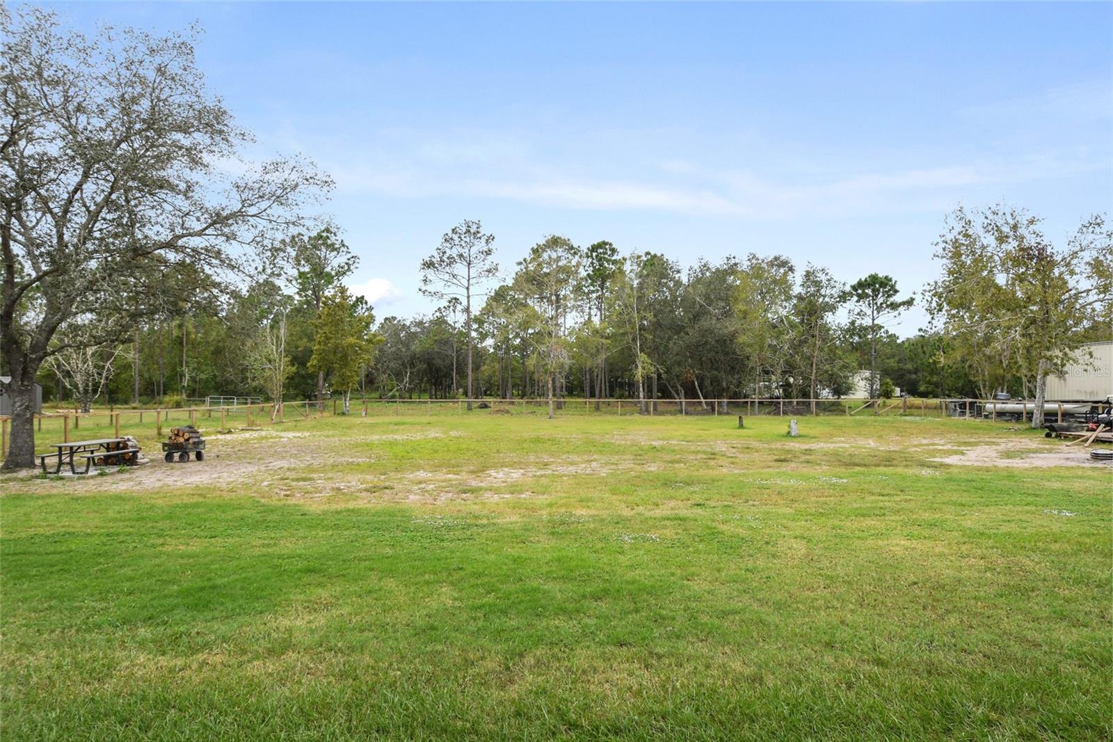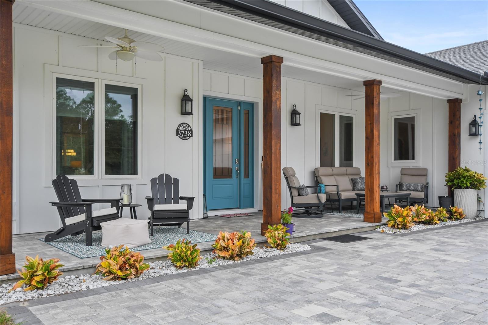 Nestled on a quiet, fully landscaped 1-acre lot, this stunning 2022-built dream home offers the perfect blend of modern luxury and peaceful retreat. Boasting FOUR spacious bedrooms and THREE and a half beautifully appointed bathrooms, this home is designed with a thoughtful open and split floor plan that maximizes space and comfort. The interior features SHAW luxury vinyl plank flooring throughout, offering both elegance and durability. The gourmet kitchen is a chef's dream, complete with an oversized island with breakfast bar, stainless steel sink, solid wood cabinets, built-in oven and microwave, and a beautiful subway tile backsplash that complements the stunning quartz countertops. The generous laundry room, located off the kitchen, includes built-in cabinets and a sink, leading directly to the garage. Large PELLA windows flood the space with natural light, highlighting the vaulted ceilings and creating an airy, open feel while offering picturesque views of the surrounding trees. Enjoy the tranquility of nature from the inviting covered front porch, the perfect spot for relaxing and taking in the gentle breeze. The home also features a fully finished garage with Shark Coating flooring, providing extra space for storage or hobbies. The extra-long driveway, featuring stylish pavers, offers additional parking. A unique shipping container in the backyard serves as additional storage or a potential office space. Located in a peaceful neighborhood with wooded surroundings, this home provides privacy and a serene lifestyle, all while being conveniently close to local attractions, theme parks, and other amenities. Schedule a showing today and make this incredible home yours!