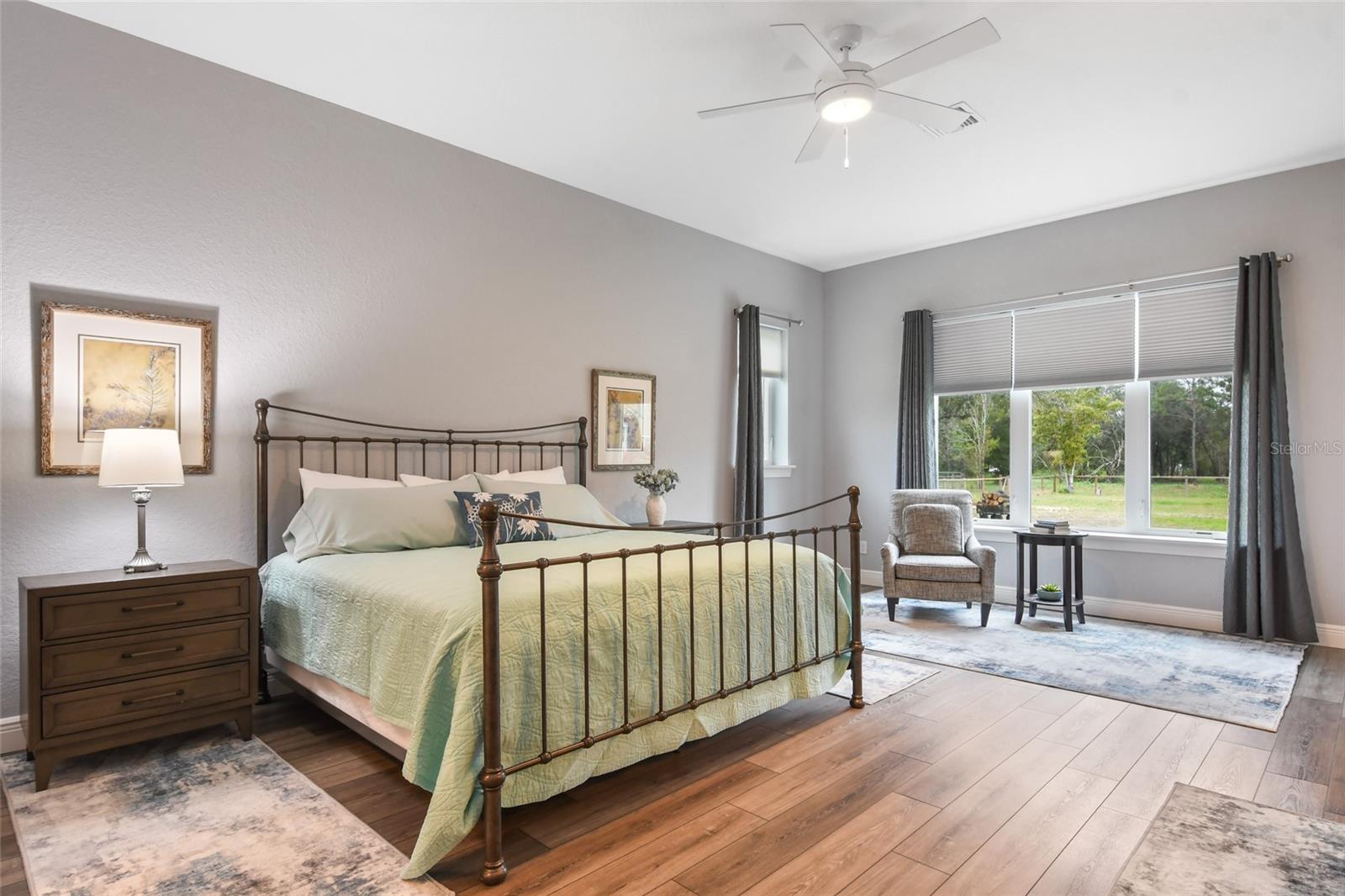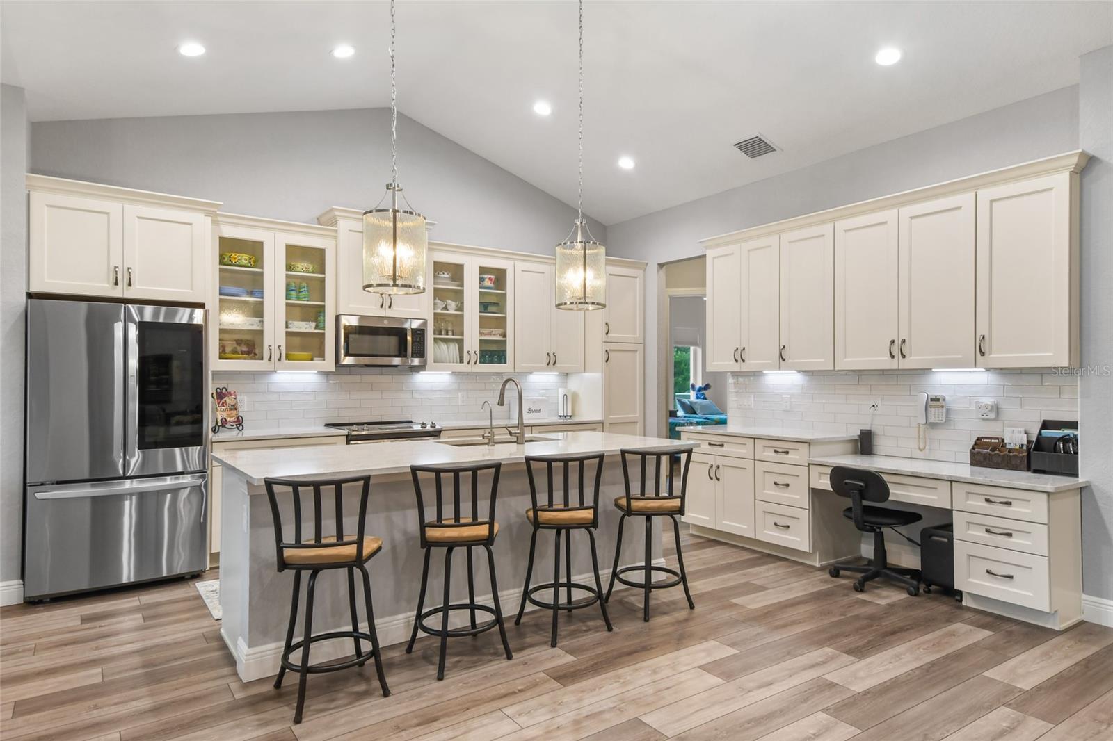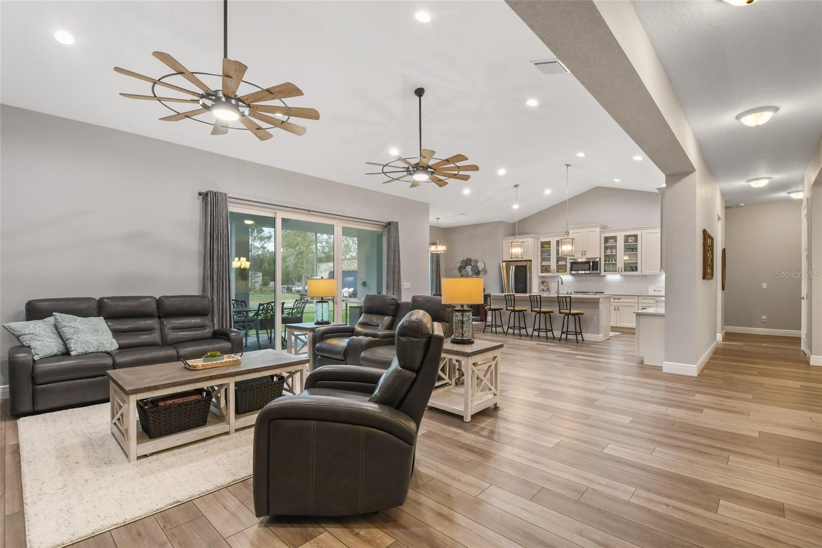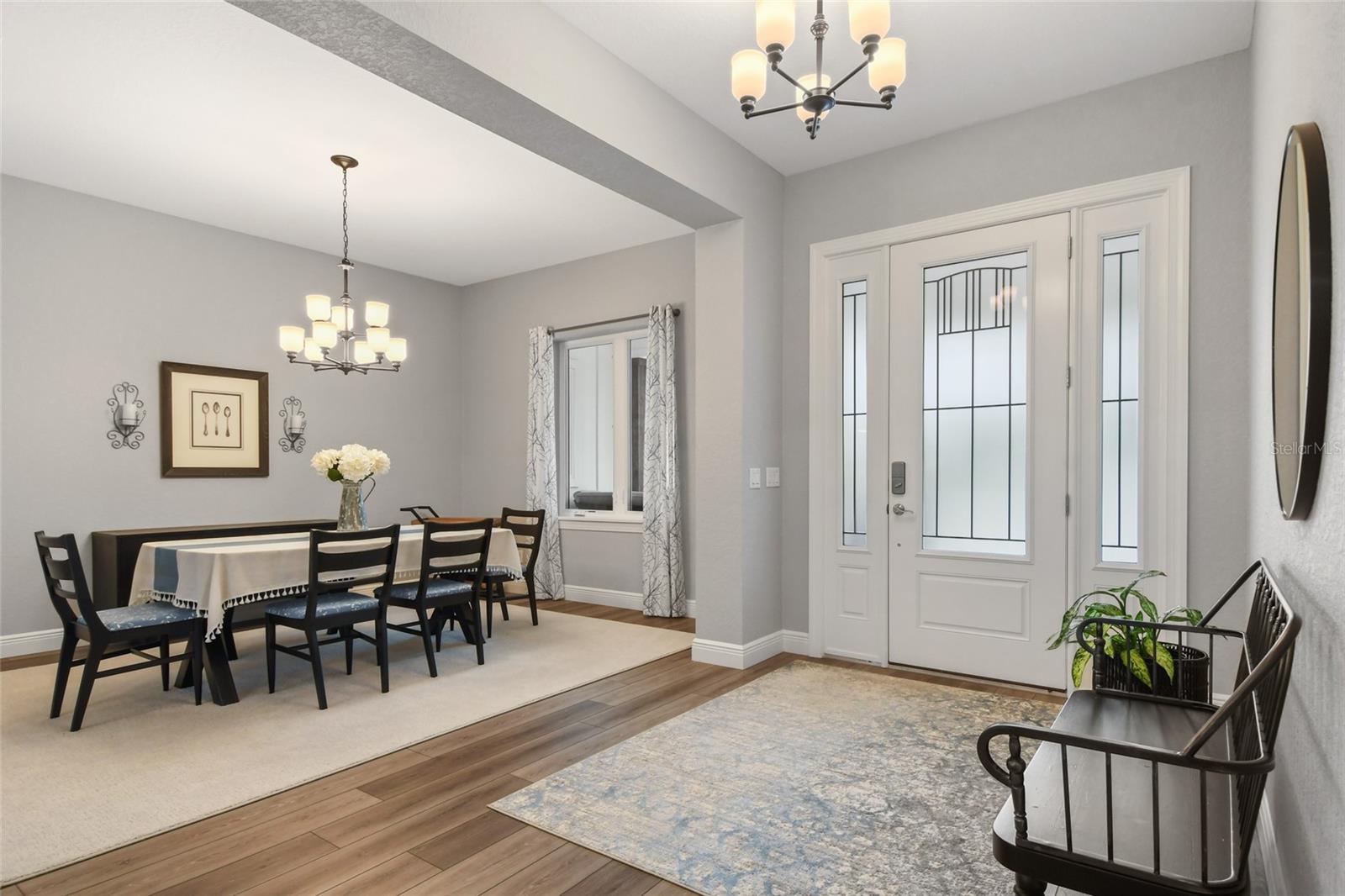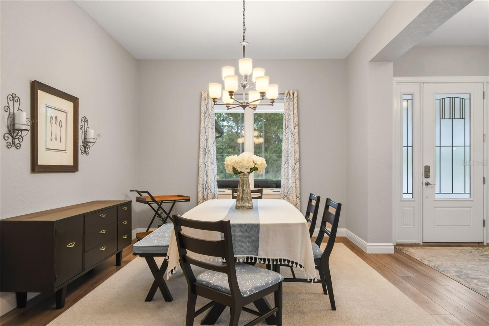 Nestled on a quiet, fully landscaped 1-acre lot, this stunning 2022-built dream home offers the perfect blend of modern luxury and peaceful retreat. Boasting FOUR spacious bedrooms and THREE and a half beautifully appointed bathrooms, this home is designed with a thoughtful open and split floor plan that maximizes space and comfort. The interior features SHAW luxury vinyl plank flooring throughout, offering both elegance and durability. The gourmet kitchen is a chef's dream, complete with an oversized island with breakfast bar, stainless steel sink, solid wood cabinets, built-in oven and microwave, and a beautiful subway tile backsplash that complements the stunning quartz countertops. The generous laundry room, located off the kitchen, includes built-in cabinets and a sink, leading directly to the garage. Large PELLA windows flood the space with natural light, highlighting the vaulted ceilings and creating an airy, open feel while offering picturesque views of the surrounding trees. Enjoy the tranquility of nature from the inviting covered front porch, the perfect spot for relaxing and taking in the gentle breeze. The home also features a fully finished garage with Shark Coating flooring, providing extra space for storage or hobbies. The extra-long driveway, featuring stylish pavers, offers additional parking. A unique shipping container in the backyard serves as additional storage or a potential office space. Located in a peaceful neighborhood with wooded surroundings, this home provides privacy and a serene lifestyle, all while being conveniently close to local attractions, theme parks, and other amenities. Schedule a showing today and make this incredible home yours!