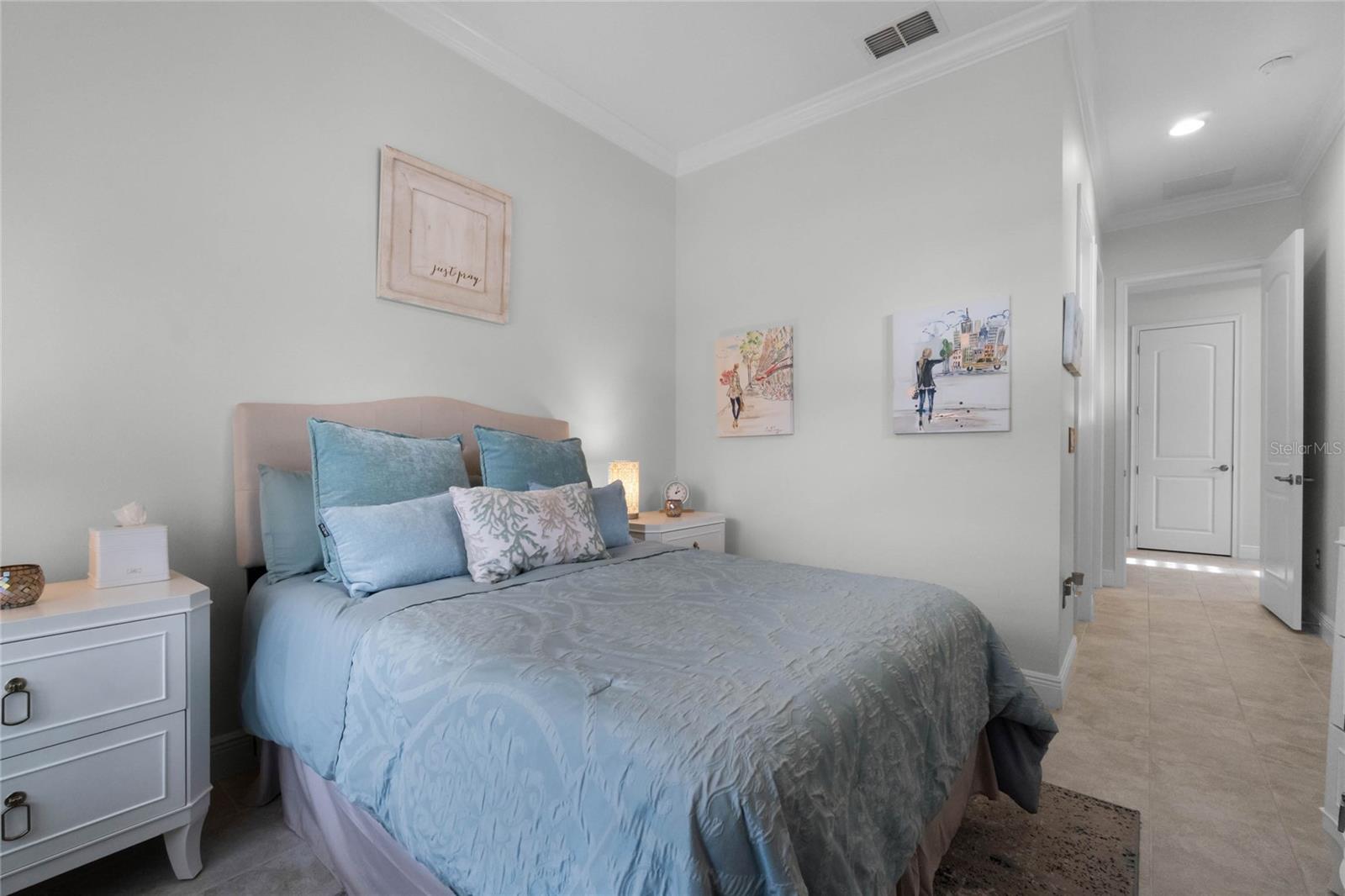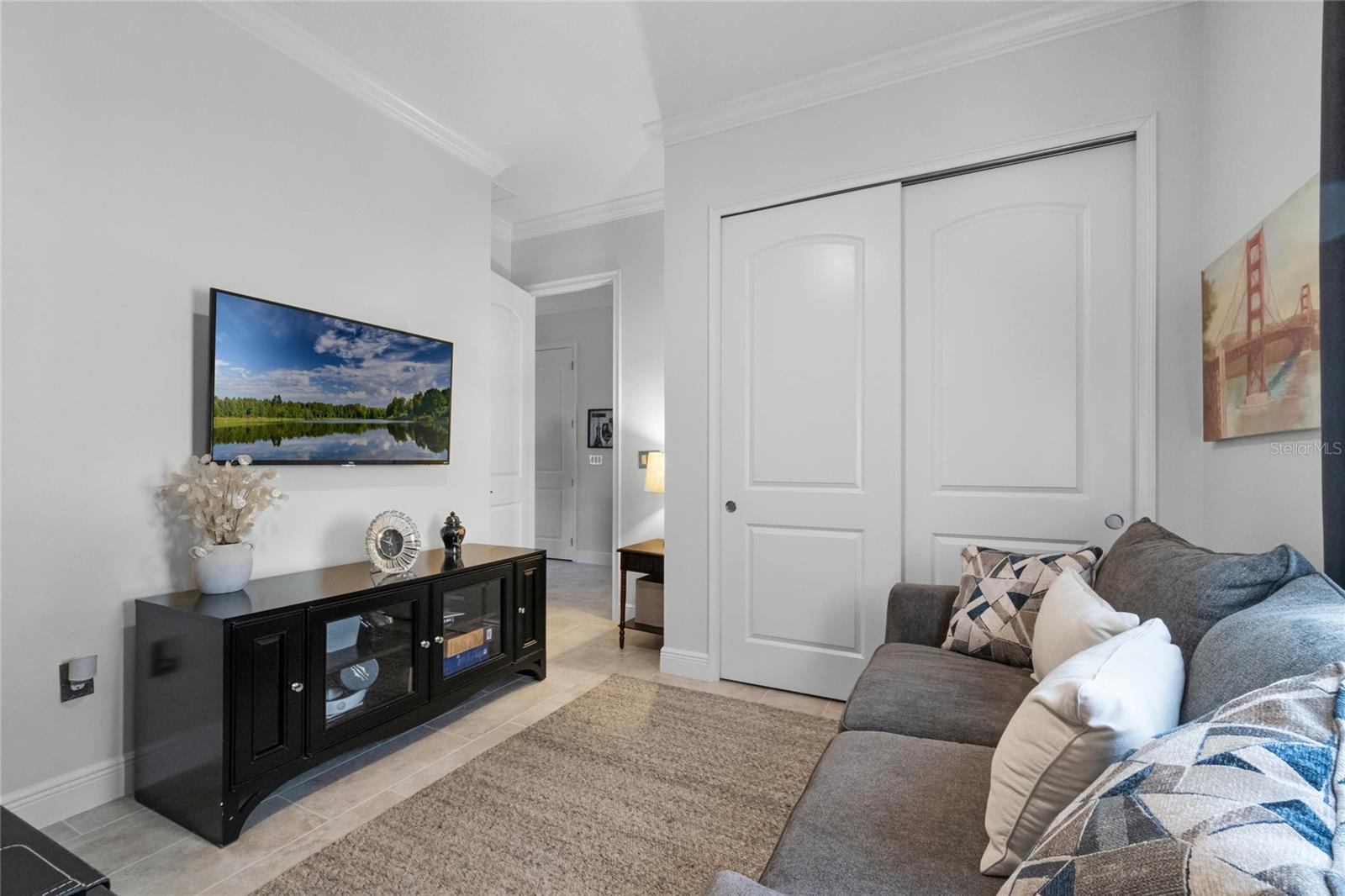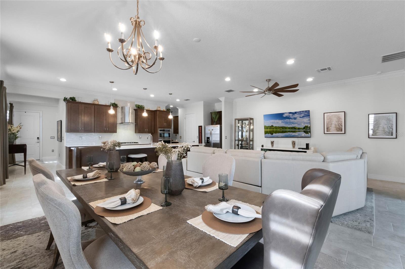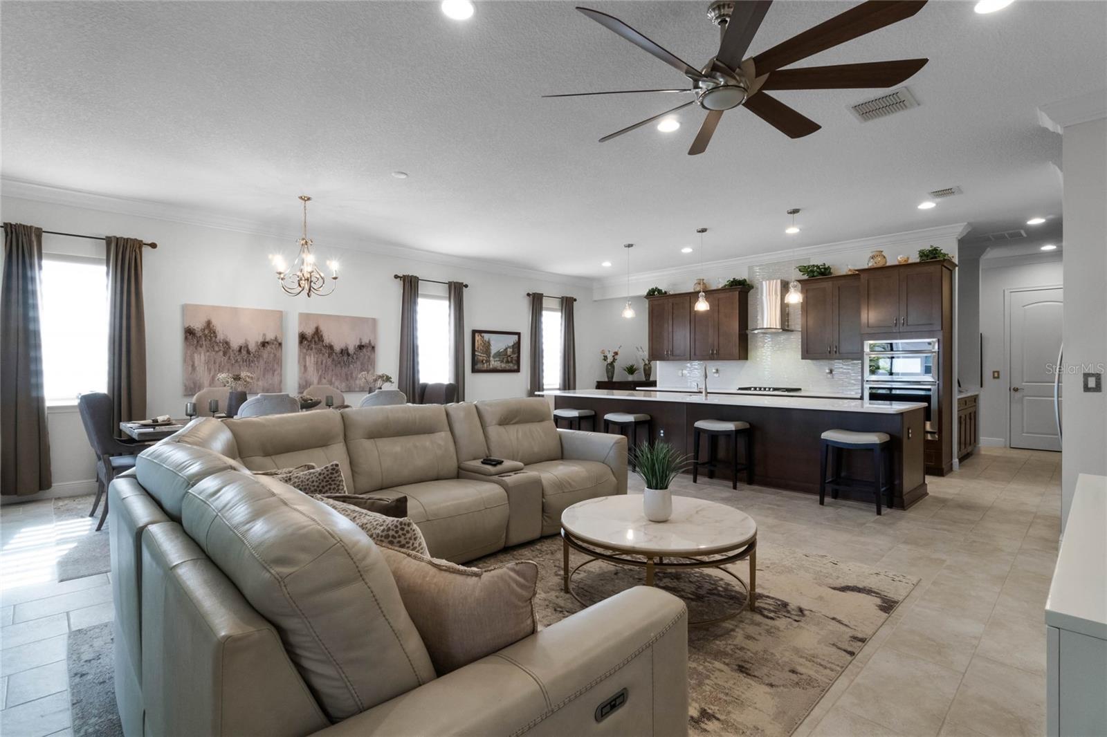 ***PRICE REDUCED*** MOTIVATED SELLER IS OFFERING UP TO $10K SELLER CREDIT. This Elegant 3-bedroom, 3 bathroom home is in the highly sought-after Twin Lakes 55+ Active lifestyle community. The Jones Home Marco Model is a one-story, beautiful home with a versatile floor plan. Enter the home and be greeted with 10-foot ceilings and upgraded ceramic tile. Fall in love with an upgraded kitchen with stainless steel appliances, convection oven, gas stove, 42" upgraded cabinets, quartz countertops, backsplash, walk-in pantry, and a 10-foot island with upgraded pendant lights that easily seats 6. The Living Room/Dining Room combo has upgraded light fixtures and recess lighting. Crown molding throughout the house. The upscale laundry room has updated cabinets. The garage has custom storage units. The sliding glass doors that lead out to the screened patio with a professional grill for the chef and entertainment. The master bedroom has a large walk-in shower with glass doors and a large closet with a closet organizing system. There are two more bedrooms. Bedroom 2 includes a full bath and a walk-in closet. The 3rd full bath is in the hallway to be used as a guest bathroom. Bedroom 3 is just down the hall with a nice-sized closet. Off Bedroom 3, you'll find the office/den/library area with access to the 3rd bath and a dedicated bar and coffee area. This flexible room is currently being used as the owner’s den. Amenities include a resort-style pool and lap pool, a 20,000 square foot Clubhouse, fitness center, tennis courts, putting green, walking trails, a pickleball court, fishing, and pontoon boats to use on Live Oak Lake. The community has many active and socializing activities for residents to connect. This versatile home could be a wonderful space for multiple family members or friends who wish to live together. Close to Lake Nona Medical City, Orlando International Airport, Theme parks, beaches, and downtown Orlando. This house looks like a model.