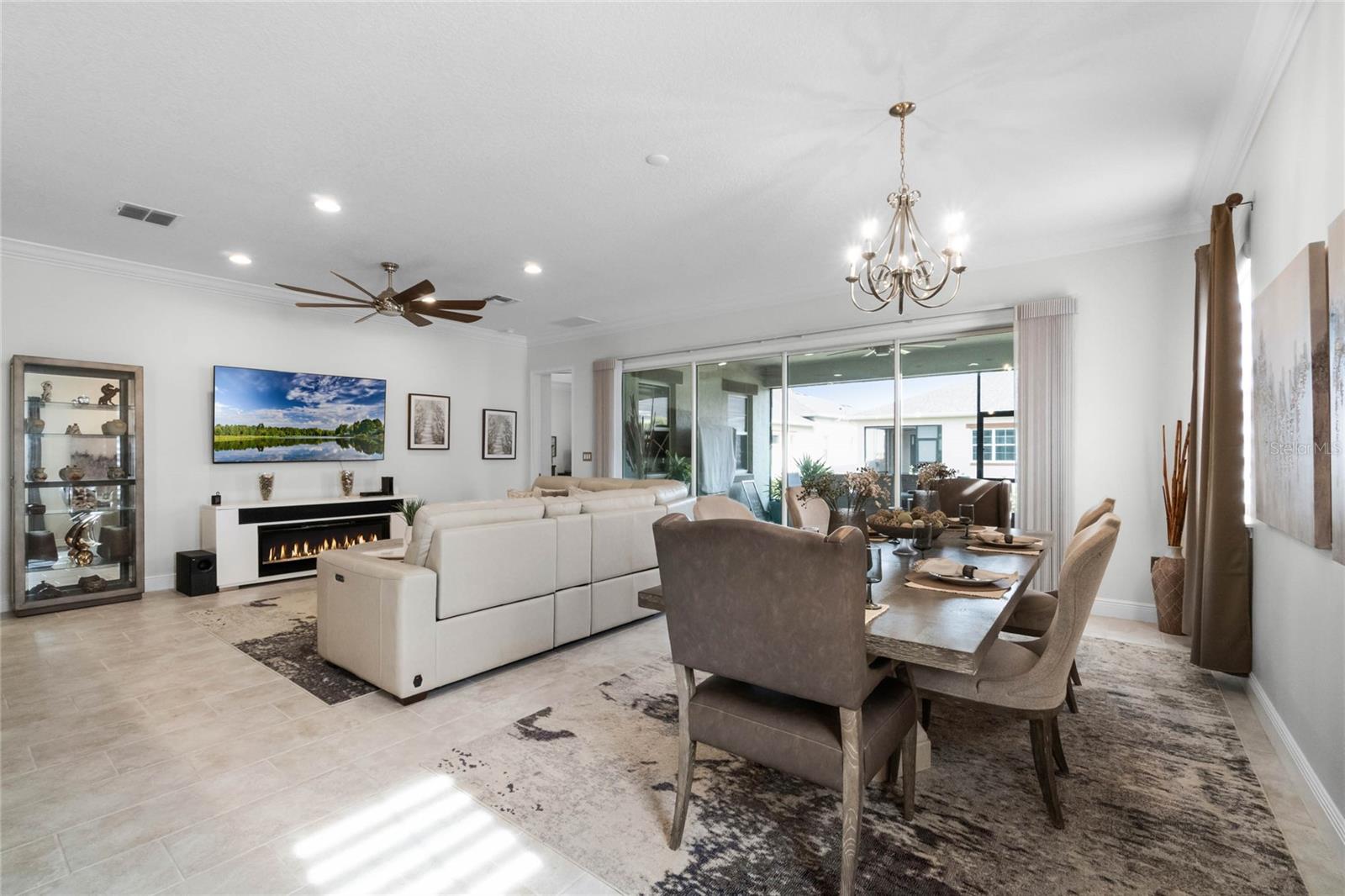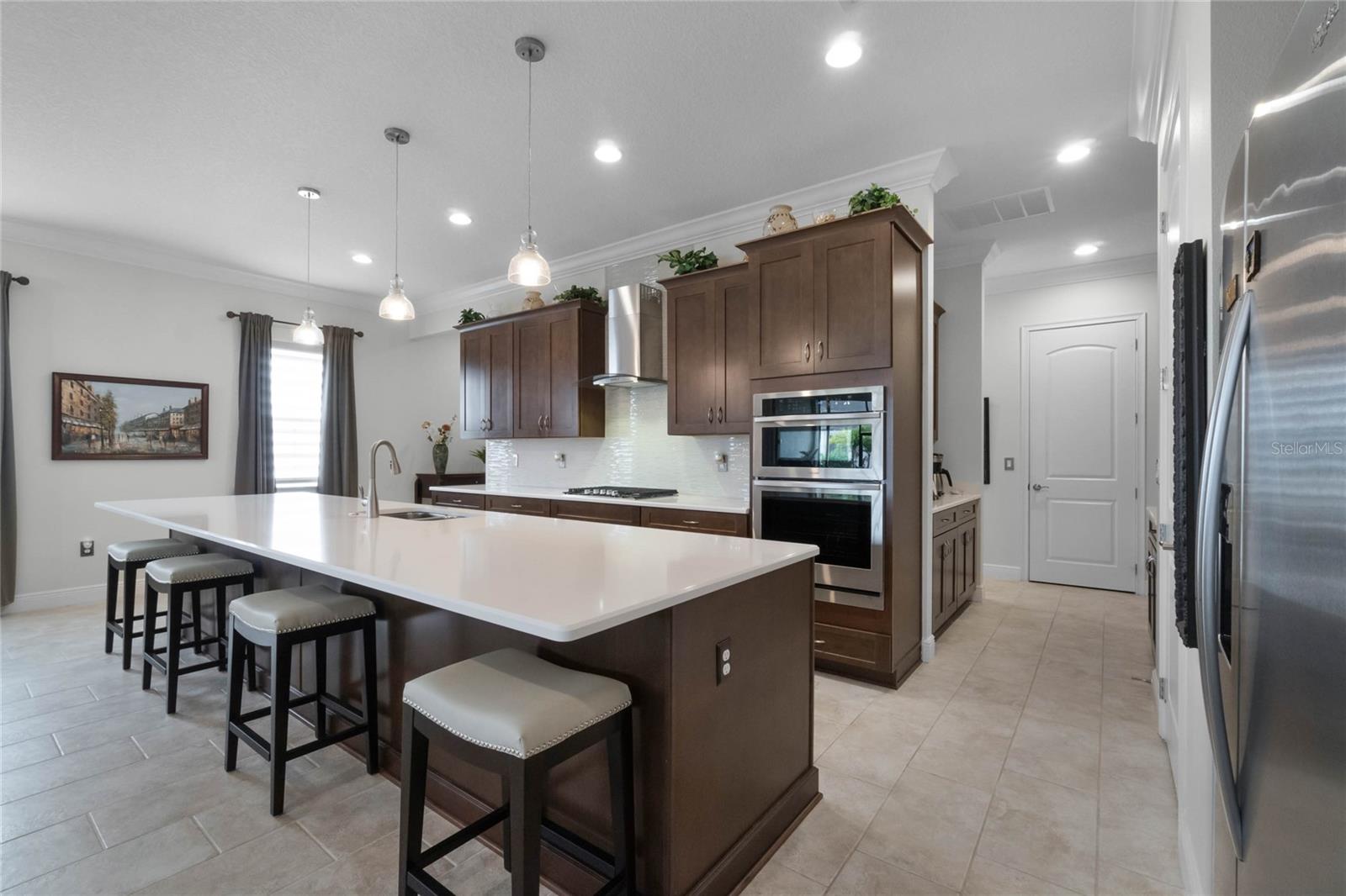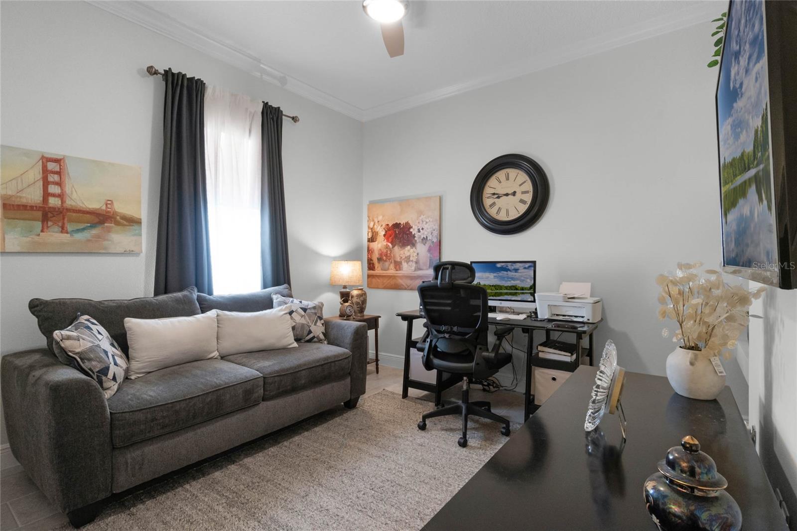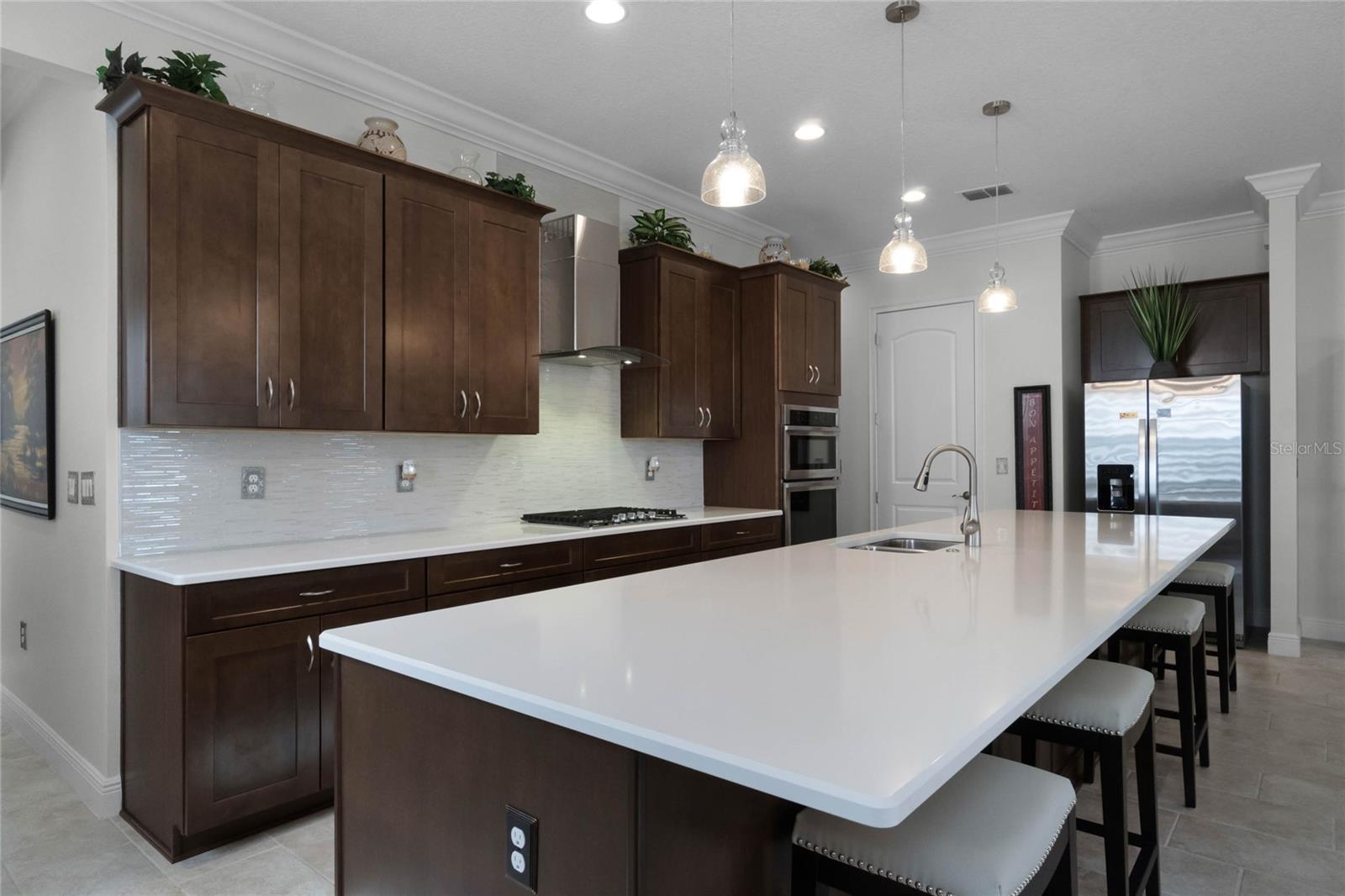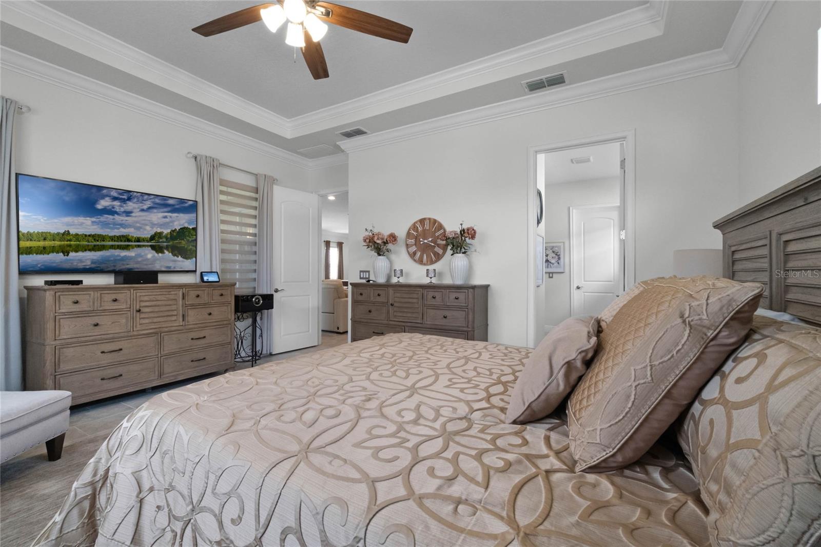 ***PRICE REDUCED*** MOTIVATED SELLER IS OFFERING UP TO $10K SELLER CREDIT. This Elegant 3-bedroom, 3 bathroom home is in the highly sought-after Twin Lakes 55+ Active lifestyle community. The Jones Home Marco Model is a one-story, beautiful home with a versatile floor plan. Enter the home and be greeted with 10-foot ceilings and upgraded ceramic tile. Fall in love with an upgraded kitchen with stainless steel appliances, convection oven, gas stove, 42" upgraded cabinets, quartz countertops, backsplash, walk-in pantry, and a 10-foot island with upgraded pendant lights that easily seats 6. The Living Room/Dining Room combo has upgraded light fixtures and recess lighting. Crown molding throughout the house. The upscale laundry room has updated cabinets. The garage has custom storage units. The sliding glass doors that lead out to the screened patio with a professional grill for the chef and entertainment. The master bedroom has a large walk-in shower with glass doors and a large closet with a closet organizing system. There are two more bedrooms. Bedroom 2 includes a full bath and a walk-in closet. The 3rd full bath is in the hallway to be used as a guest bathroom. Bedroom 3 is just down the hall with a nice-sized closet. Off Bedroom 3, you'll find the office/den/library area with access to the 3rd bath and a dedicated bar and coffee area. This flexible room is currently being used as the owner’s den. Amenities include a resort-style pool and lap pool, a 20,000 square foot Clubhouse, fitness center, tennis courts, putting green, walking trails, a pickleball court, fishing, and pontoon boats to use on Live Oak Lake. The community has many active and socializing activities for residents to connect. This versatile home could be a wonderful space for multiple family members or friends who wish to live together. Close to Lake Nona Medical City, Orlando International Airport, Theme parks, beaches, and downtown Orlando. This house looks like a model.