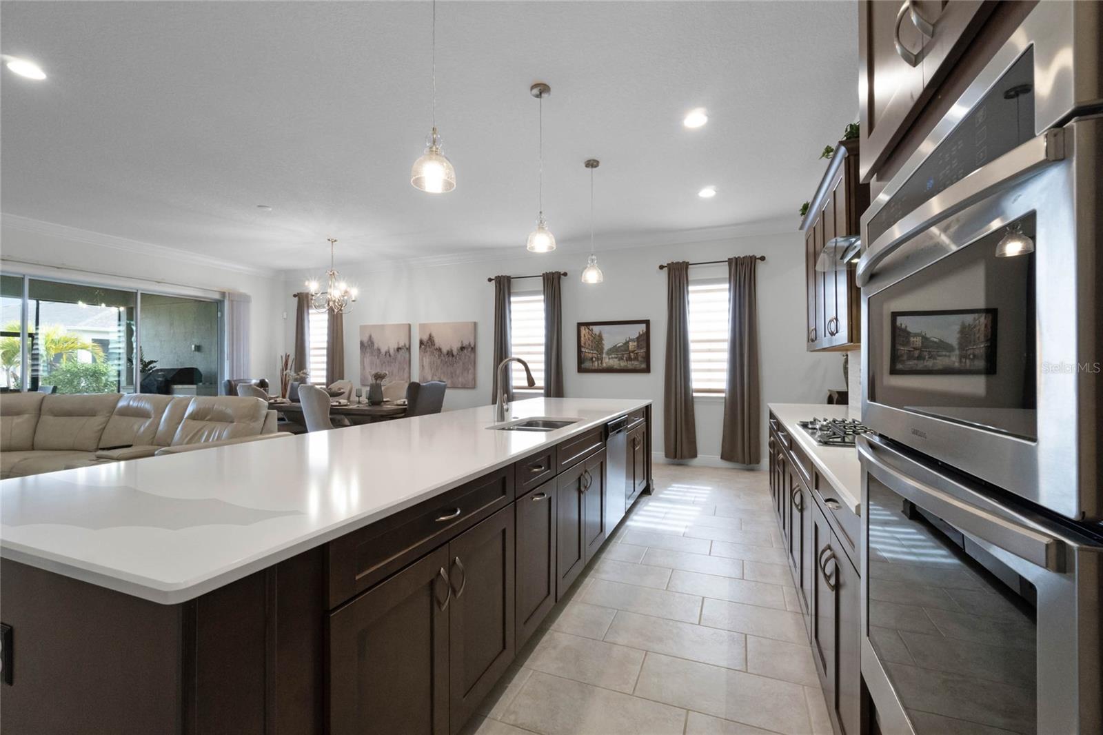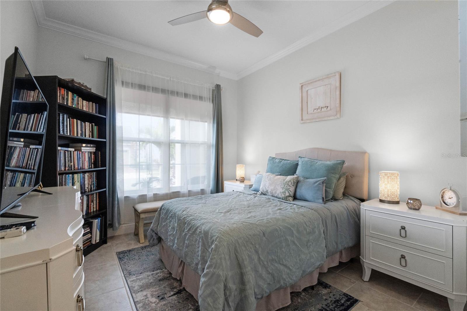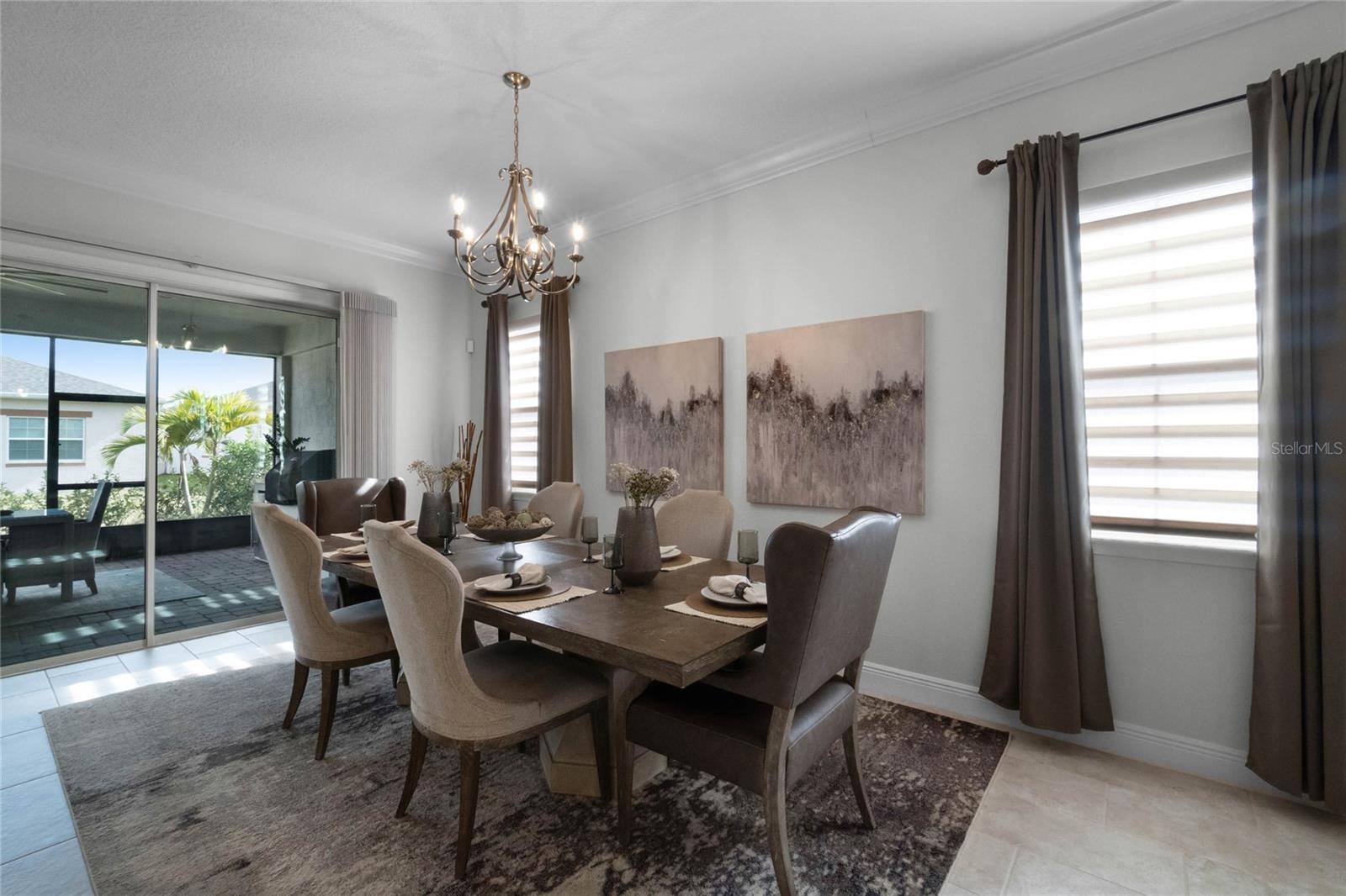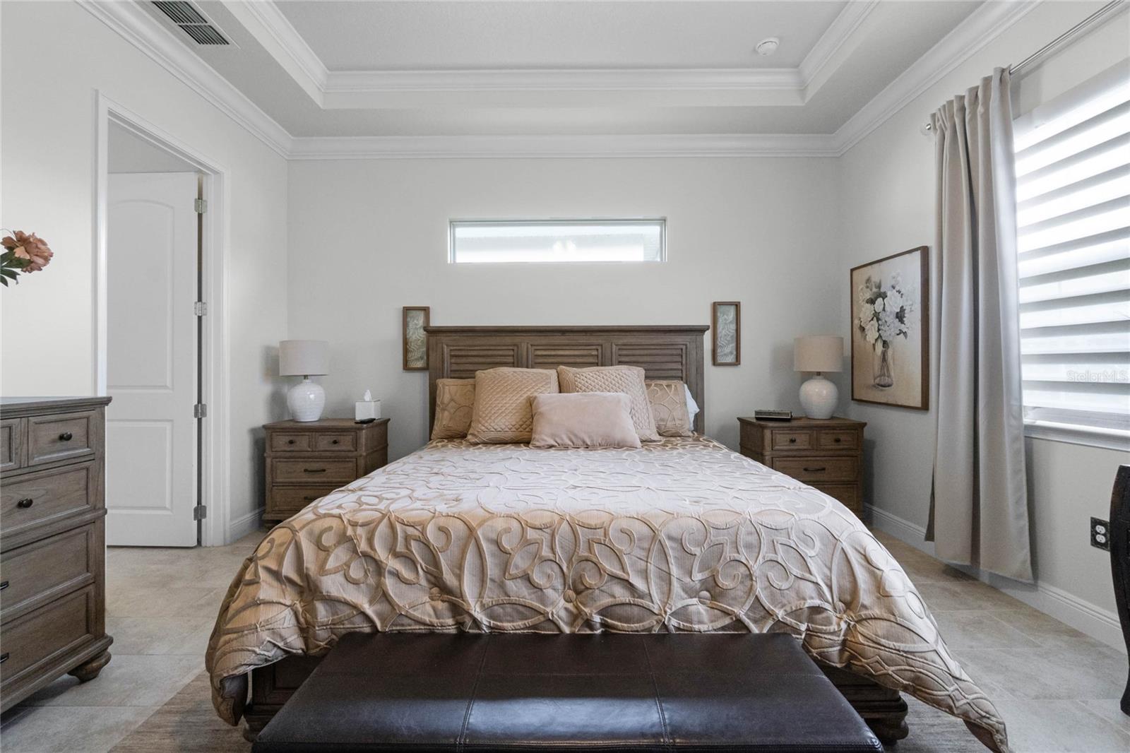 ***PRICE REDUCED*** MOTIVATED SELLER IS OFFERING UP TO $10K SELLER CREDIT. This Elegant 3-bedroom, 3 bathroom home is in the highly sought-after Twin Lakes 55+ Active lifestyle community. The Jones Home Marco Model is a one-story, beautiful home with a versatile floor plan. Enter the home and be greeted with 10-foot ceilings and upgraded ceramic tile. Fall in love with an upgraded kitchen with stainless steel appliances, convection oven, gas stove, 42" upgraded cabinets, quartz countertops, backsplash, walk-in pantry, and a 10-foot island with upgraded pendant lights that easily seats 6. The Living Room/Dining Room combo has upgraded light fixtures and recess lighting. Crown molding throughout the house. The upscale laundry room has updated cabinets. The garage has custom storage units. The sliding glass doors that lead out to the screened patio with a professional grill for the chef and entertainment. The master bedroom has a large walk-in shower with glass doors and a large closet with a closet organizing system. There are two more bedrooms. Bedroom 2 includes a full bath and a walk-in closet. The 3rd full bath is in the hallway to be used as a guest bathroom. Bedroom 3 is just down the hall with a nice-sized closet. Off Bedroom 3, you'll find the office/den/library area with access to the 3rd bath and a dedicated bar and coffee area. This flexible room is currently being used as the owner’s den. Amenities include a resort-style pool and lap pool, a 20,000 square foot Clubhouse, fitness center, tennis courts, putting green, walking trails, a pickleball court, fishing, and pontoon boats to use on Live Oak Lake. The community has many active and socializing activities for residents to connect. This versatile home could be a wonderful space for multiple family members or friends who wish to live together. Close to Lake Nona Medical City, Orlando International Airport, Theme parks, beaches, and downtown Orlando. This house looks like a model.