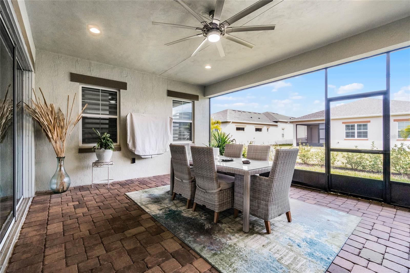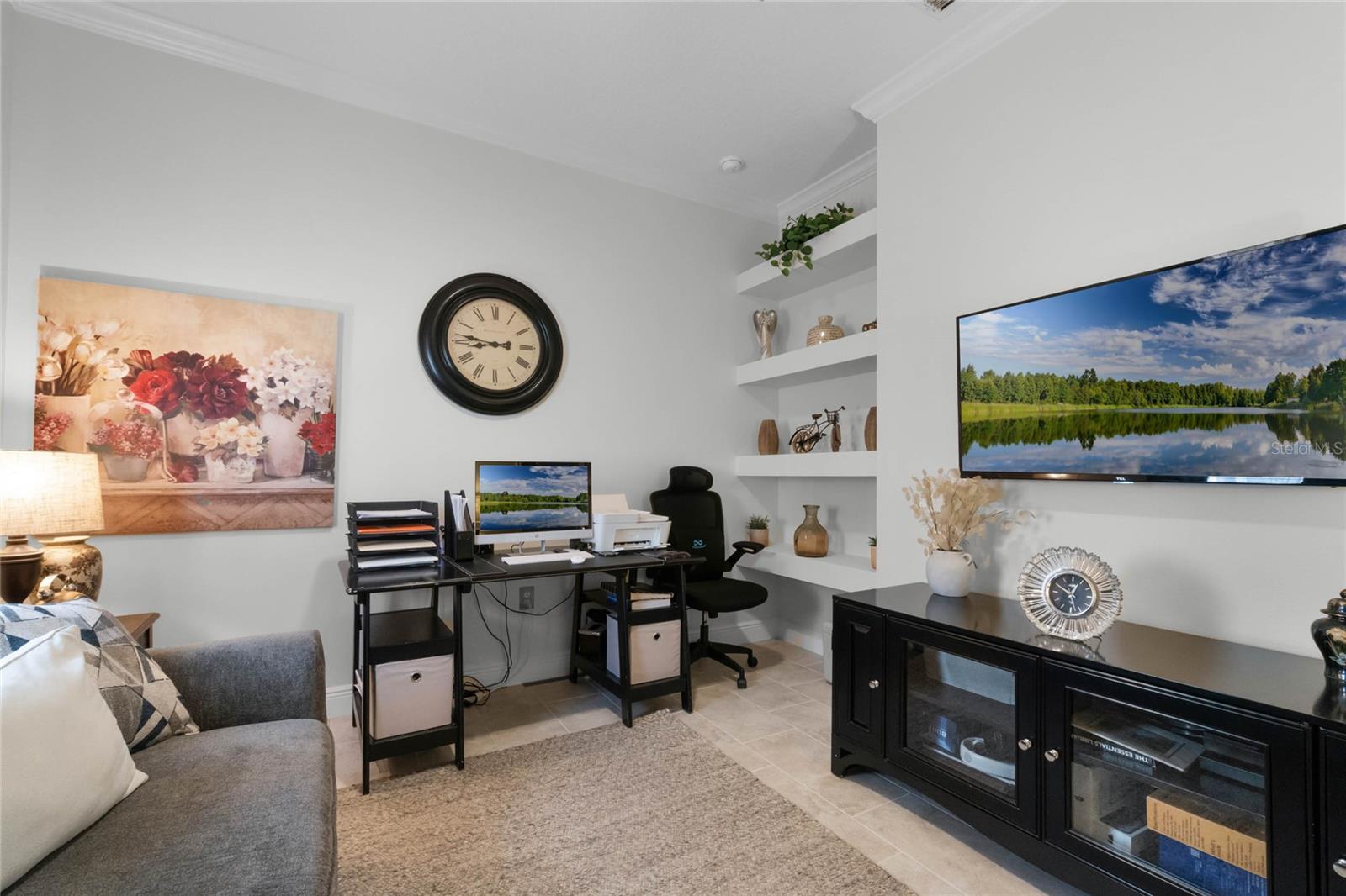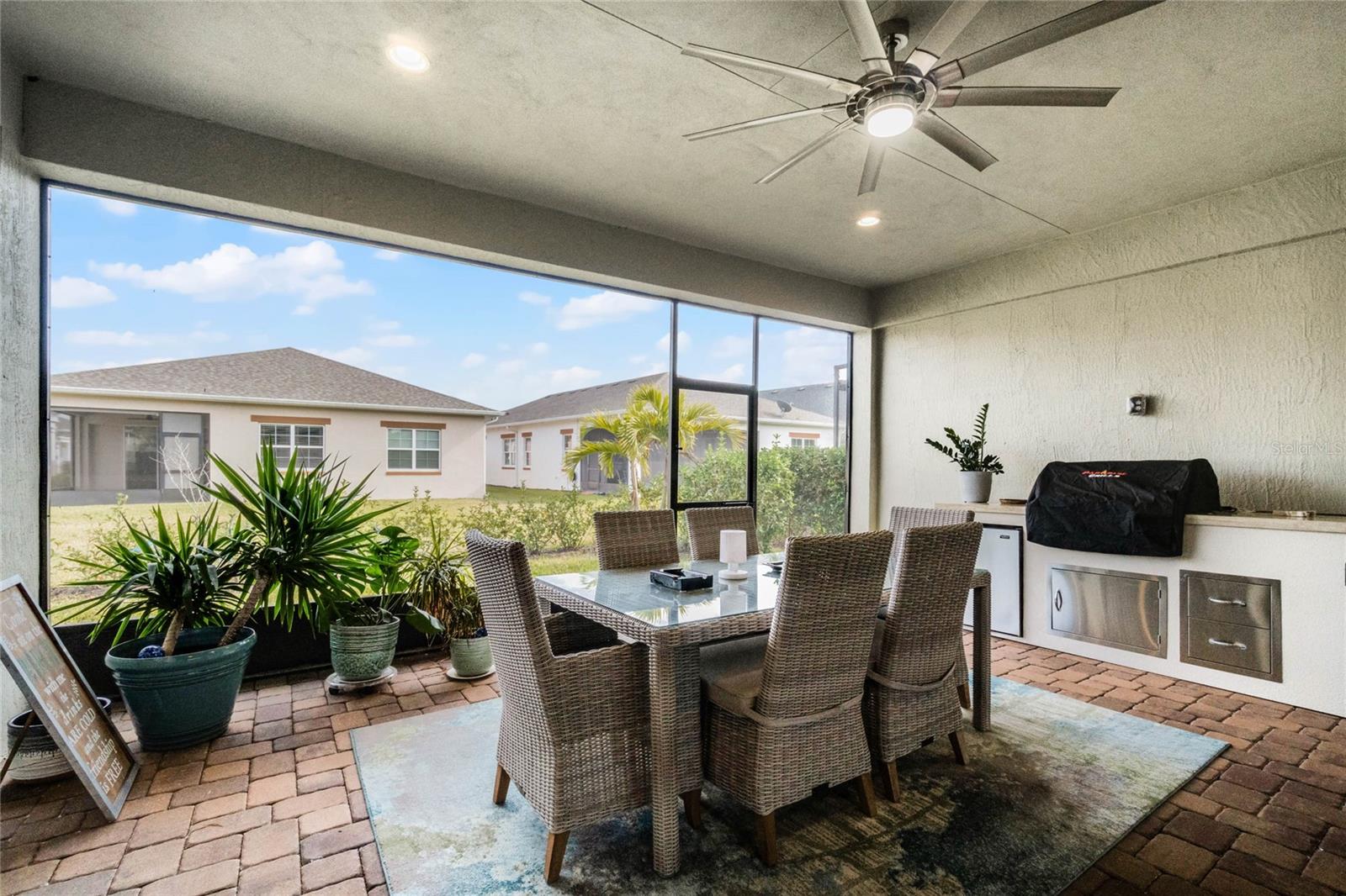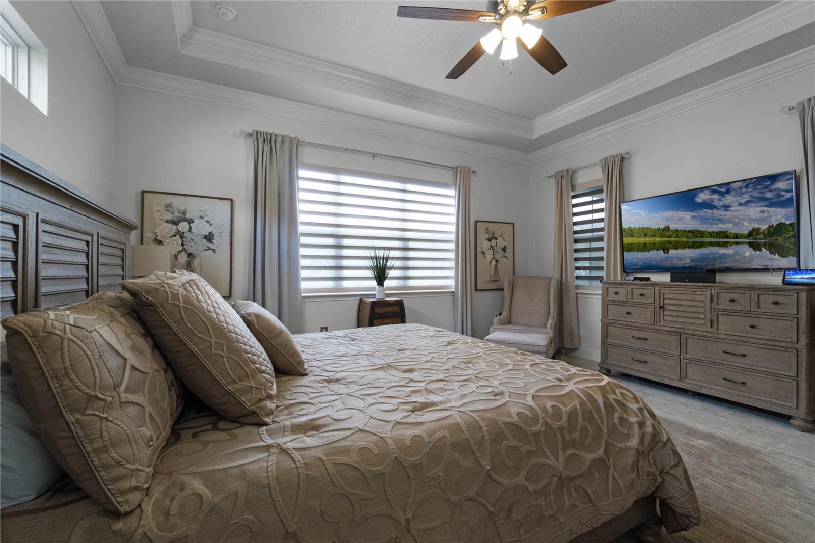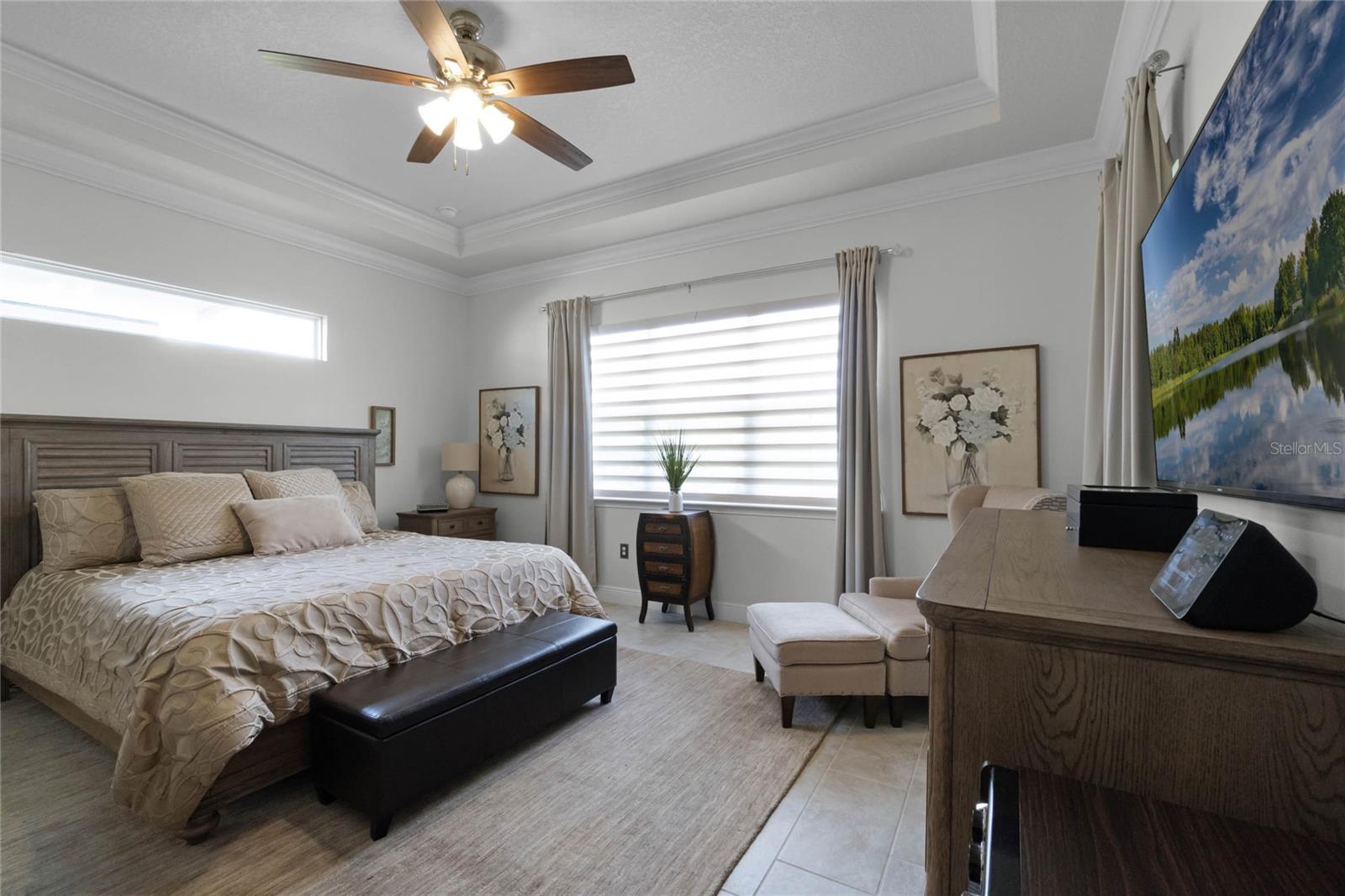***PRICE REDUCED*** MOTIVATED SELLER IS OFFERING UP TO $10K SELLER CREDIT. This Elegant 3-bedroom, 3 bathroom home is in the highly sought-after Twin Lakes 55+ Active lifestyle community. The Jones Home Marco Model is a one-story, beautiful home with a versatile floor plan. Enter the home and be greeted with 10-foot ceilings and upgraded ceramic tile. Fall in love with an upgraded kitchen with stainless steel appliances, convection oven, gas stove, 42" upgraded cabinets, quartz countertops, backsplash, walk-in pantry, and a 10-foot island with upgraded pendant lights that easily seats 6. The Living Room/Dining Room combo has upgraded light fixtures and recess lighting. Crown molding throughout the house. The upscale laundry room has updated cabinets. The garage has custom storage units. The sliding glass doors that lead out to the screened patio with a professional grill for the chef and entertainment. The master bedroom has a large walk-in shower with glass doors and a large closet with a closet organizing system. There are two more bedrooms. Bedroom 2 includes a full bath and a walk-in closet. The 3rd full bath is in the hallway to be used as a guest bathroom. Bedroom 3 is just down the hall with a nice-sized closet. Off Bedroom 3, you'll find the office/den/library area with access to the 3rd bath and a dedicated bar and coffee area. This flexible room is currently being used as the owner’s den. Amenities include a resort-style pool and lap pool, a 20,000 square foot Clubhouse, fitness center, tennis courts, putting green, walking trails, a pickleball court, fishing, and pontoon boats to use on Live Oak Lake. The community has many active and socializing activities for residents to connect. This versatile home could be a wonderful space for multiple family members or friends who wish to live together. Close to Lake Nona Medical City, Orlando International Airport, Theme parks, beaches, and downtown Orlando. This house looks like a model.