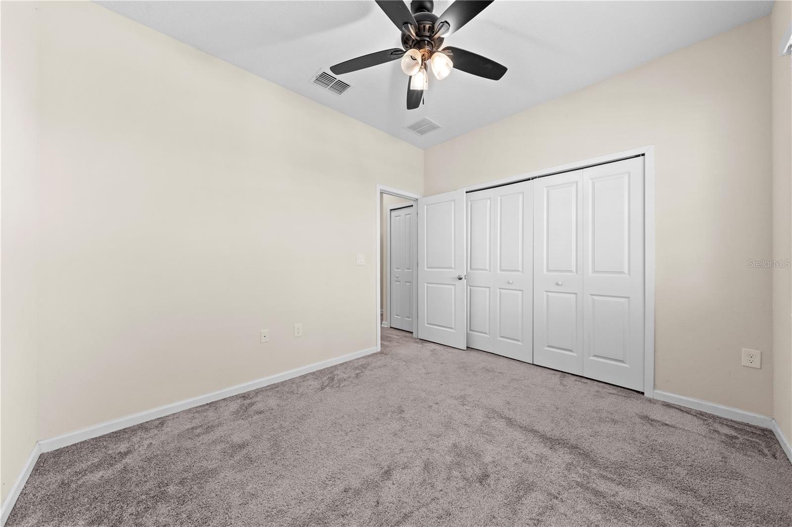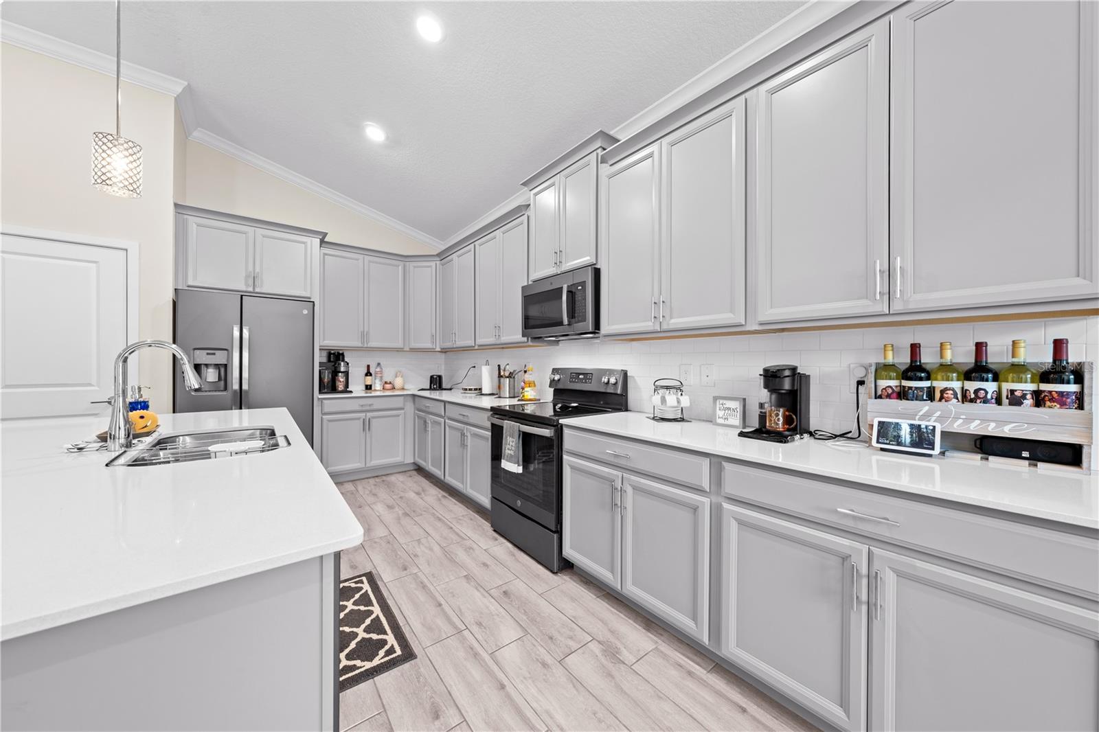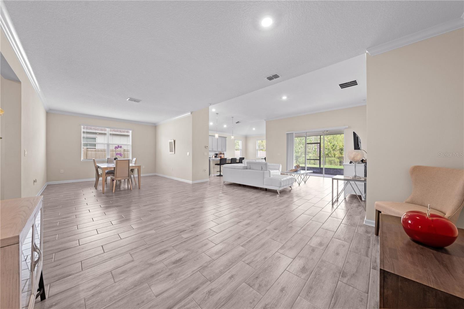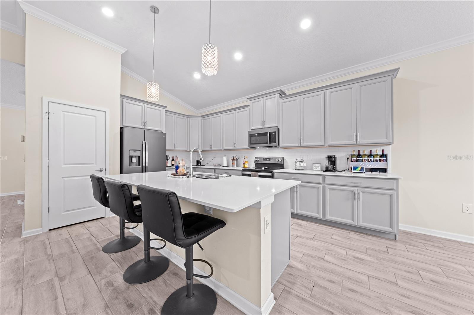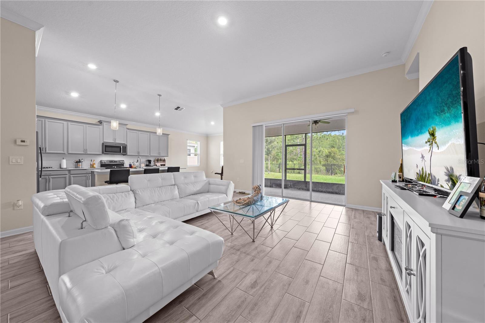 Beautiful FOUR bedroom THREE bath home featuring a THREE car garage on a 0.21 acre conservation lot. The yard is big enough to put in a pool should you desire to do so. This home has a 3 way split for added privacy with one bedroom and bathroom together as a great guest quarters, this bedroom also has a walk in closet. The home features ceramic tile plank flooring throughout with exception to the bedrooms which all have carpet. The floor plan has a formal dining room separate from the kitchen/living and breakfast nook great room concept. The kitchen features a closet pantry, breakfast bar, breakfast nook, 42" upper cabinets with crown molding, quartz counters, back splash and an island. The master suite comes complete with HIS and HERS walk in closets, a huge walk in shower, dual sinks, water closet and quartz counters. All of the bedrooms ceiling fans. Other great features in this home include a fenced back yard, security system, all appliances included, screen enclosed 8 x 18 Lanai, pocket sliding glass doors, multiple linen closets, a coat and vacuum closet, cabinets in the laundry room, a water softener system, and a home warranty through Warranty Service Plus good through 2/7/29. Seller is offering OWNER FINAINCING with 20% down, 7.5% interest rate with a 3 year Balloon. The neighborhood features sidewalks, a playground and community pool. Schedule a visit soon!