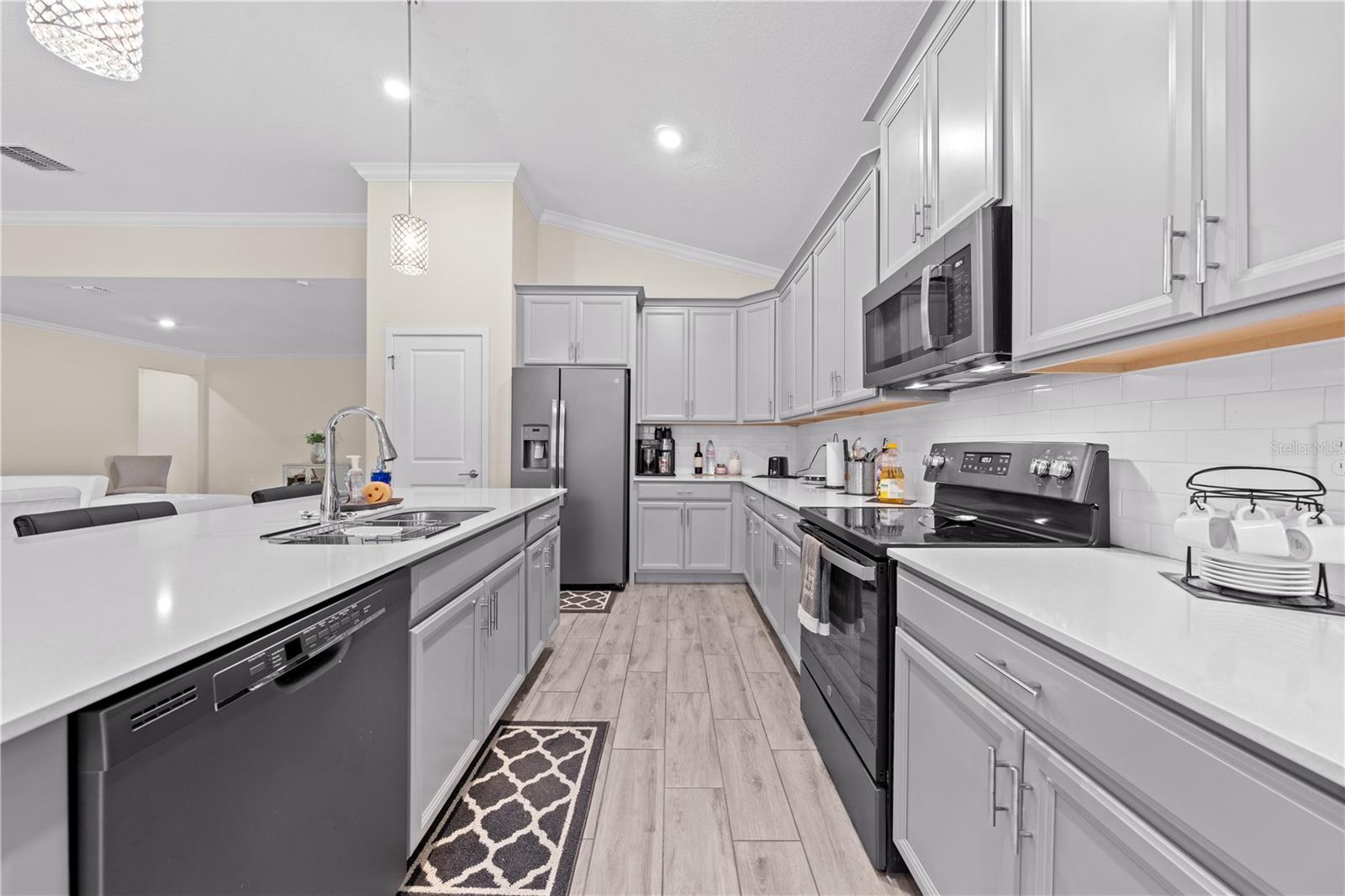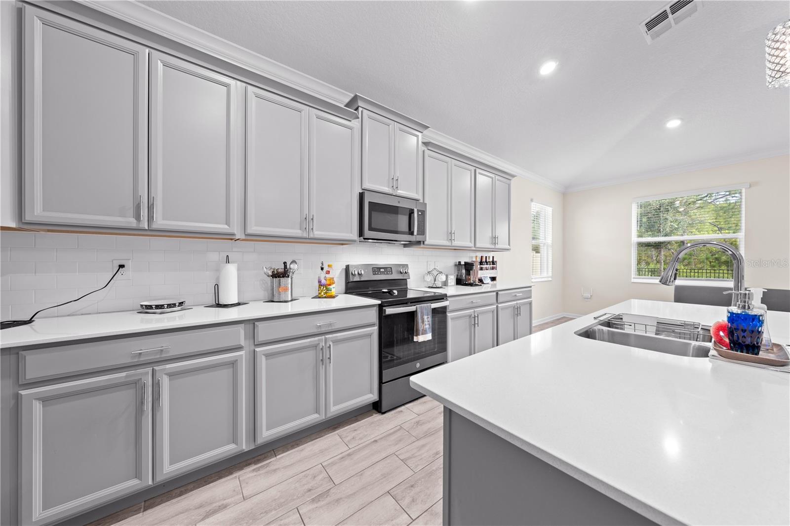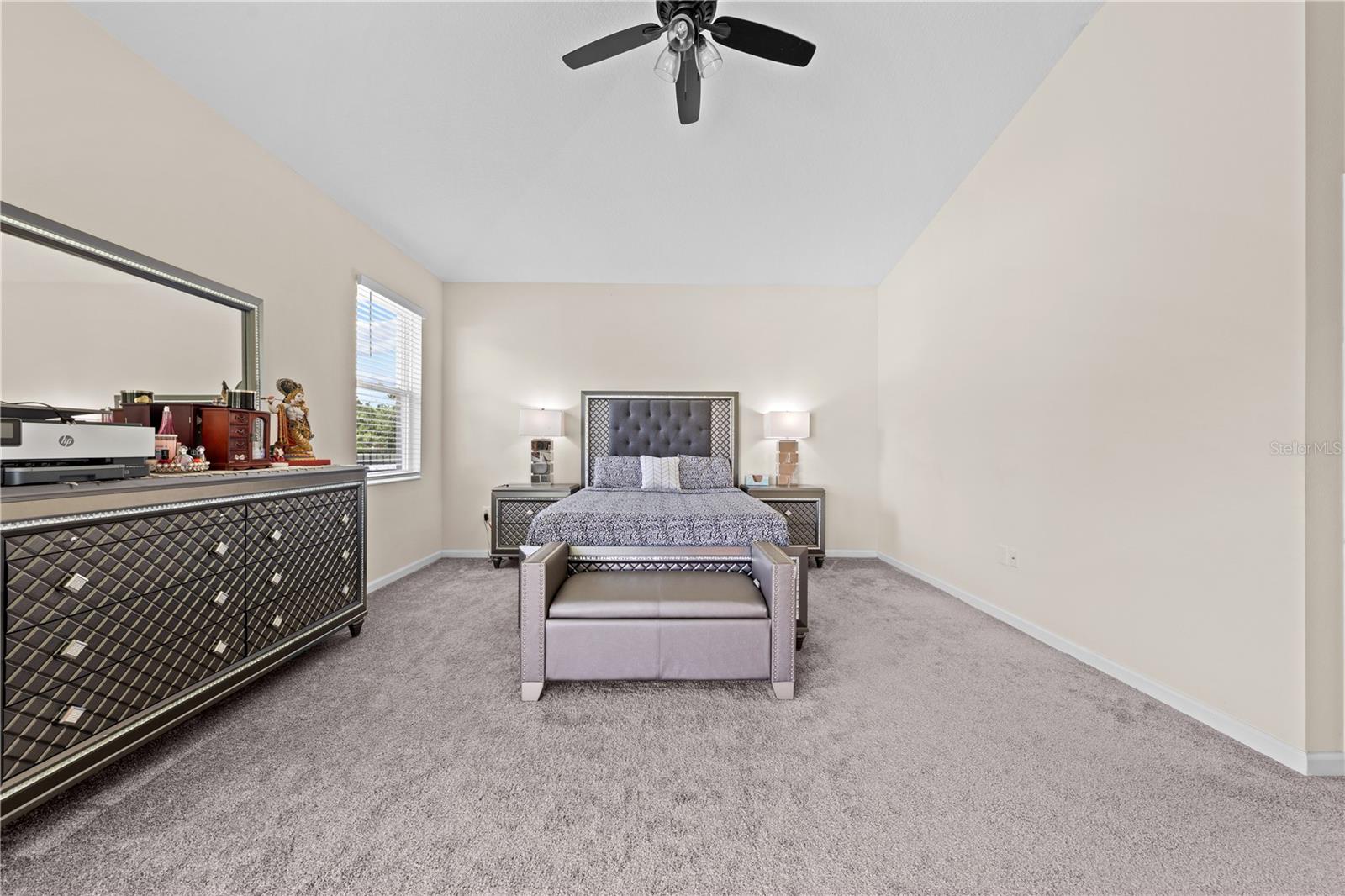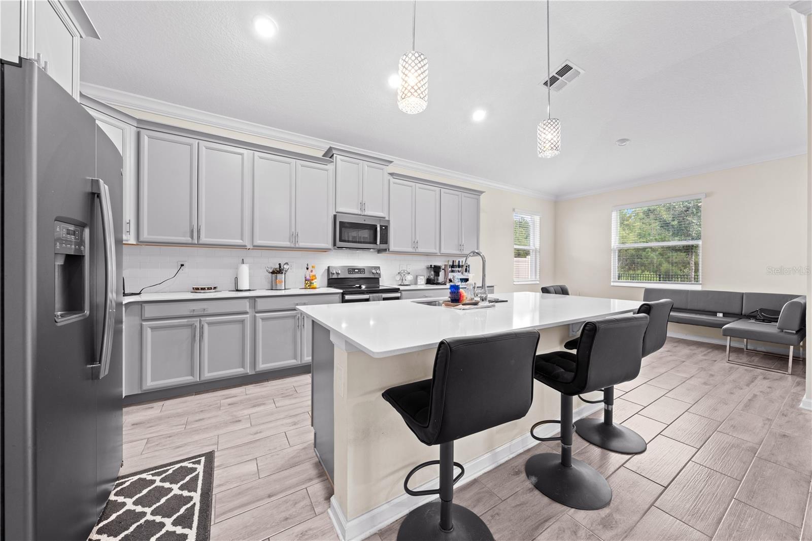Beautiful FOUR bedroom THREE bath home featuring a THREE car garage on a 0.21 acre conservation lot. The yard is big enough to put in a pool should you desire to do so. This home has a 3 way split for added privacy with one bedroom and bathroom together as a great guest quarters, this bedroom also has a walk in closet. The home features ceramic tile plank flooring throughout with exception to the bedrooms which all have carpet. The floor plan has a formal dining room separate from the kitchen/living and breakfast nook great room concept. The kitchen features a closet pantry, breakfast bar, breakfast nook, 42" upper cabinets with crown molding, quartz counters, back splash and an island. The master suite comes complete with HIS and HERS walk in closets, a huge walk in shower, dual sinks, water closet and quartz counters. All of the bedrooms ceiling fans. Other great features in this home include a fenced back yard, security system, all appliances included, screen enclosed 8 x 18 Lanai, pocket sliding glass doors, multiple linen closets, a coat and vacuum closet, cabinets in the laundry room, a water softener system, and a home warranty through Warranty Service Plus good through 2/7/29. Seller is offering OWNER FINAINCING with 20% down, 7.5% interest rate with a 3 year Balloon. The neighborhood features sidewalks, a playground and community pool. Schedule a visit soon!