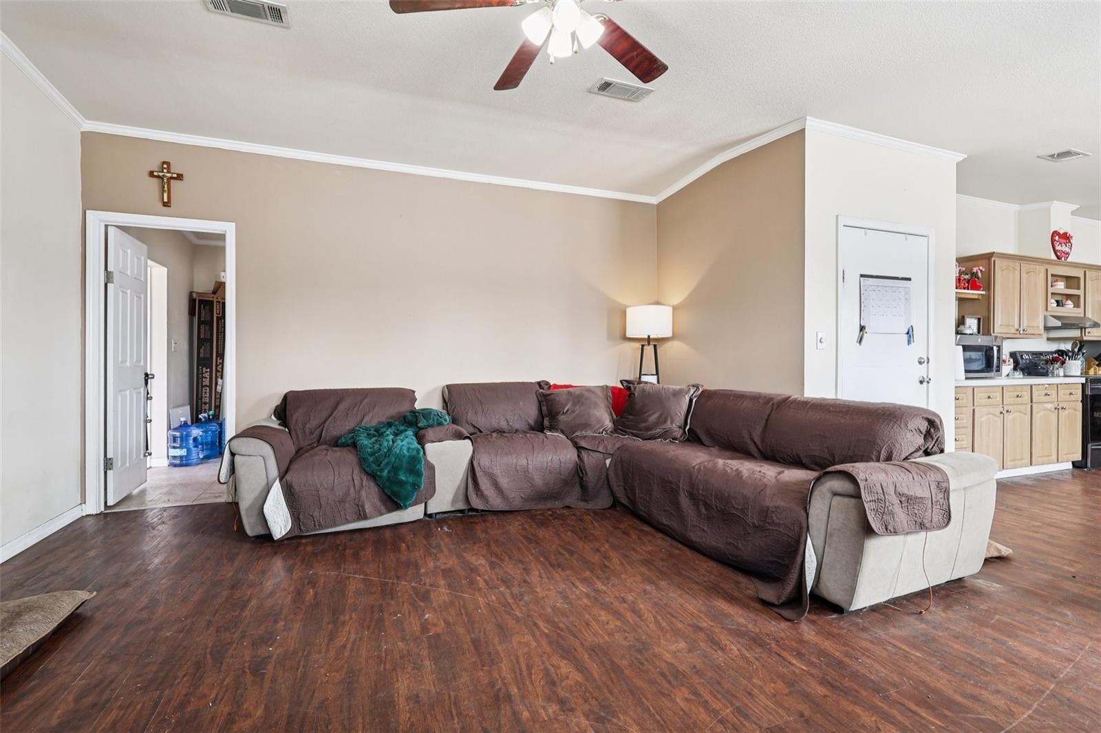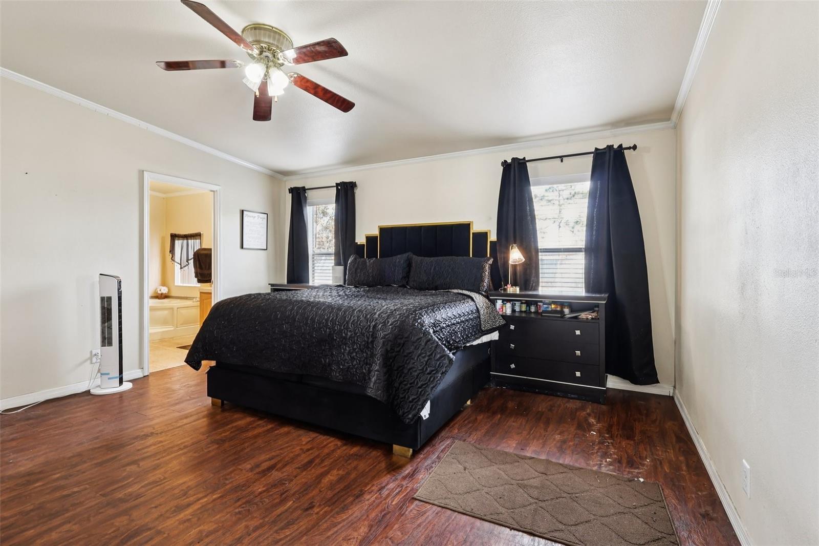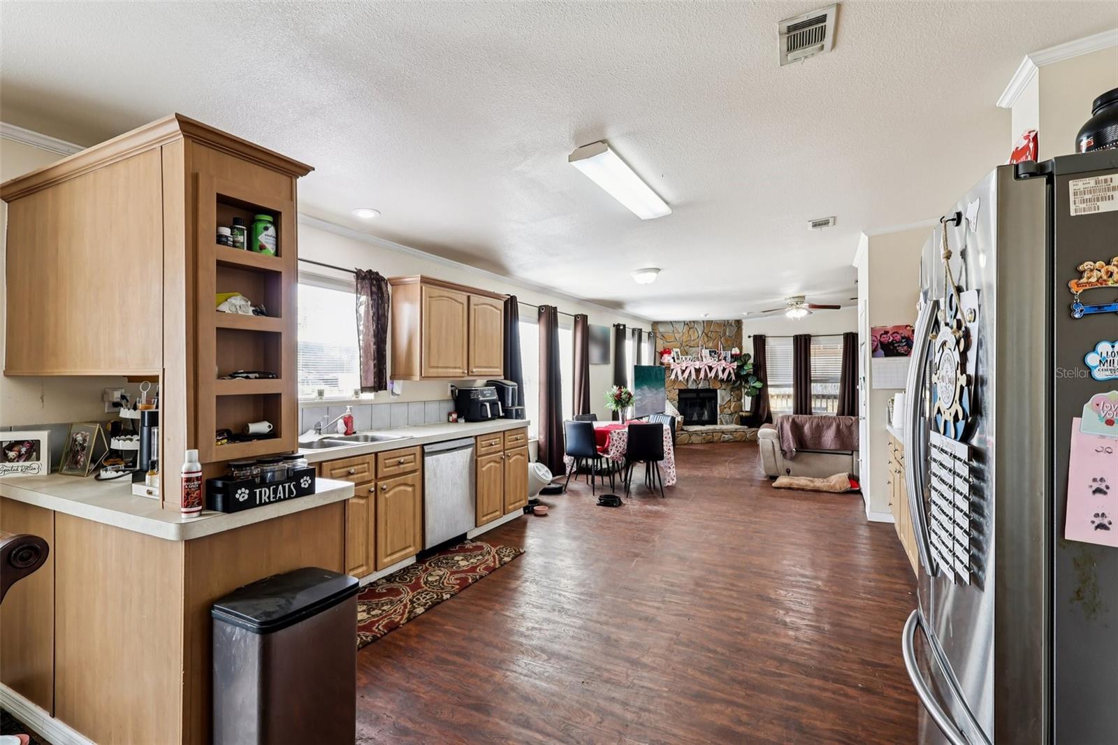 Offering interest rate buy-down or closing cost credit through preferred lender! Set on nearly one acre of land, this spacious 4-bedroom, 2-bathroom double-wide manufactured home offers approximately 2,280 sq. ft. of comfortable living space with no HOA and no CDD fees. The primary suite serves as a private retreat featuring an en-suite bath with dual sinks, a garden tub, separate shower, built-in storage, and a walk-in closet. The split-bedroom floor plan enhances privacy, with three additional bedrooms located off the family room. This versatile area can function as a game room, secondary living space or home office. The kitchen features generous counter space, abundant cabinetry, a breakfast nook and a formal dining room. The open-concept layout flows into the main living areas, creating an ideal space for everyday living and entertaining. The living room is highlighted by a cozy wood-burning fireplace, adding warmth and character to the home. Fully fenced front and backyard along with a storage shed. The expansive lot offers room for outdoor activities, gardening, or other permitted uses. Conveniently located with quick access to St. Cloud and Melbourne, this home offers peaceful surroundings while remaining close to shopping, dining, and major roadways. Nearby amenities include a community park with a playground, basketball court, walking trails, and picnic pavilions. This property combines space, comfort, and potential—ready for you to make it your own.