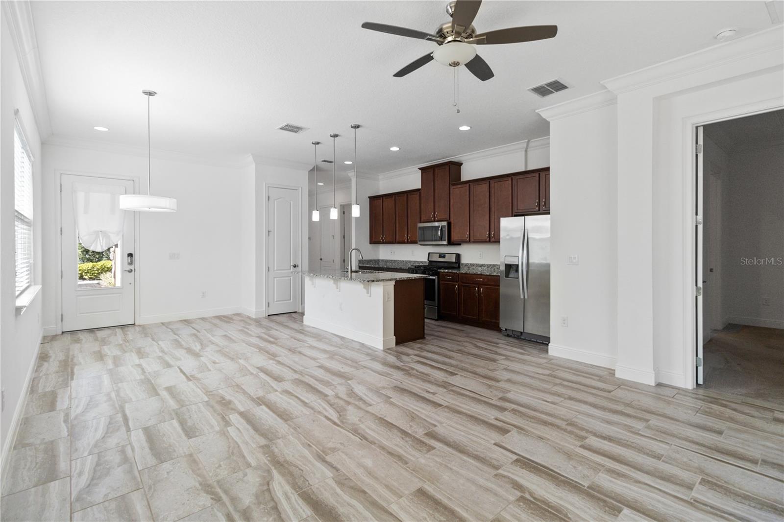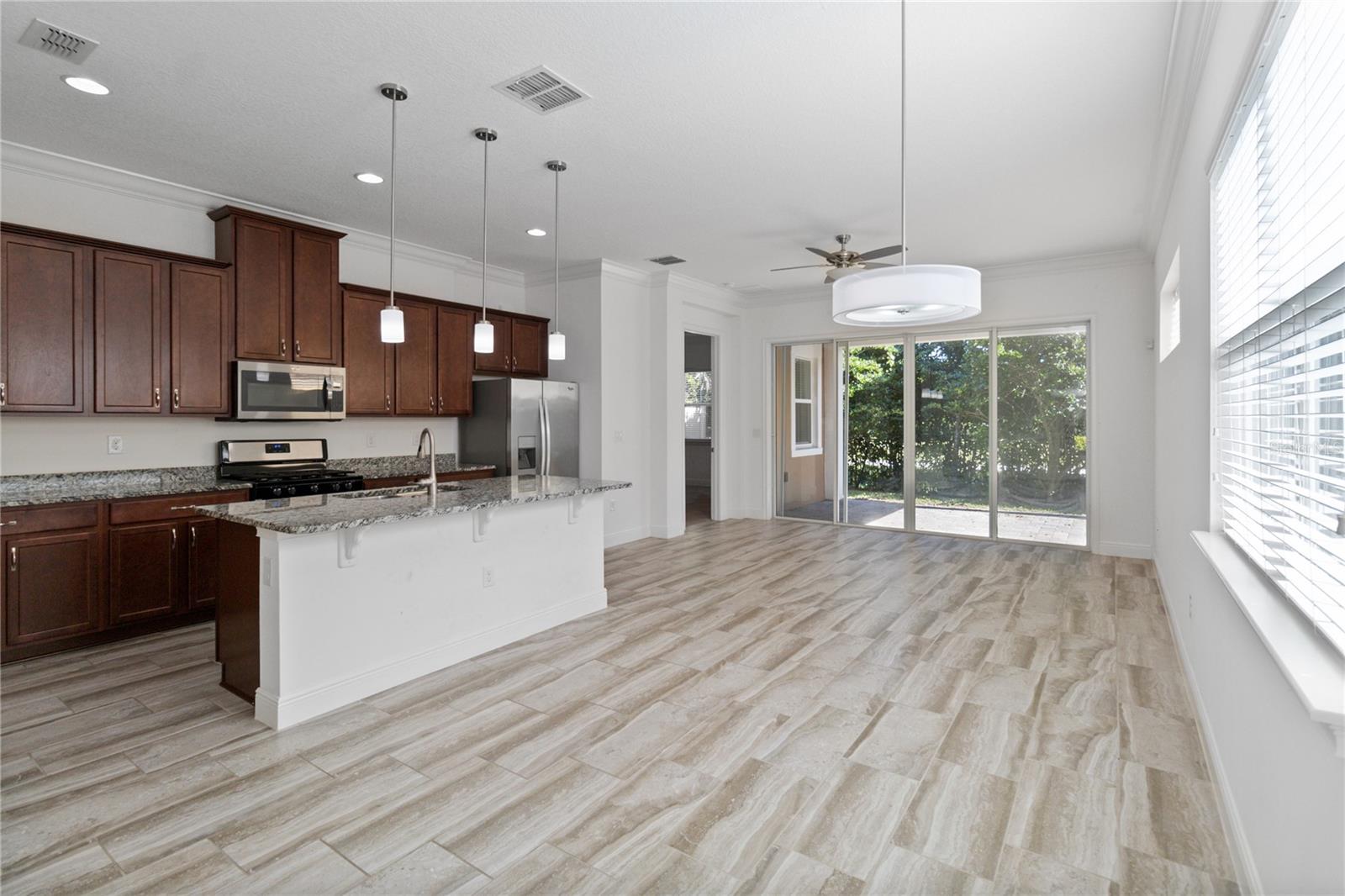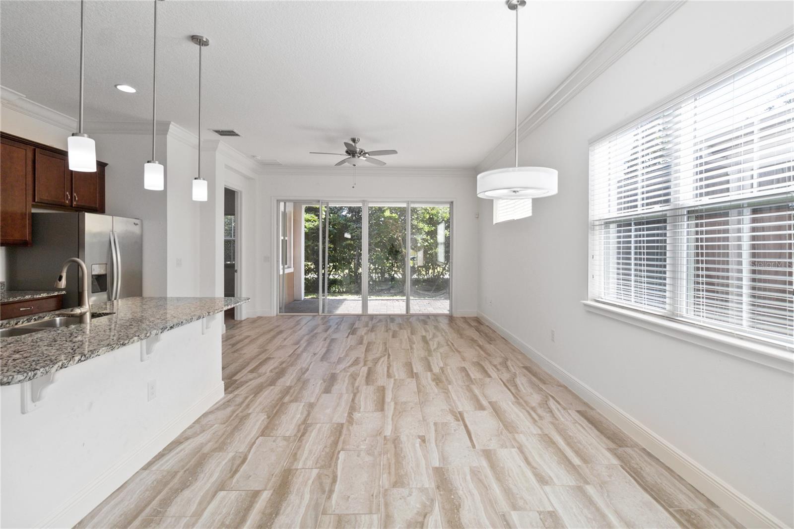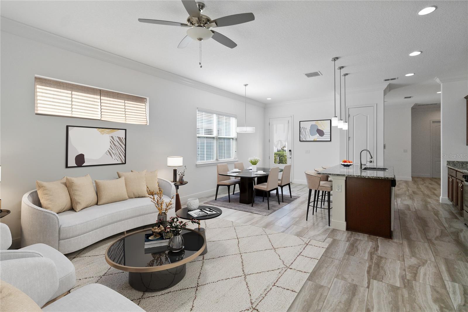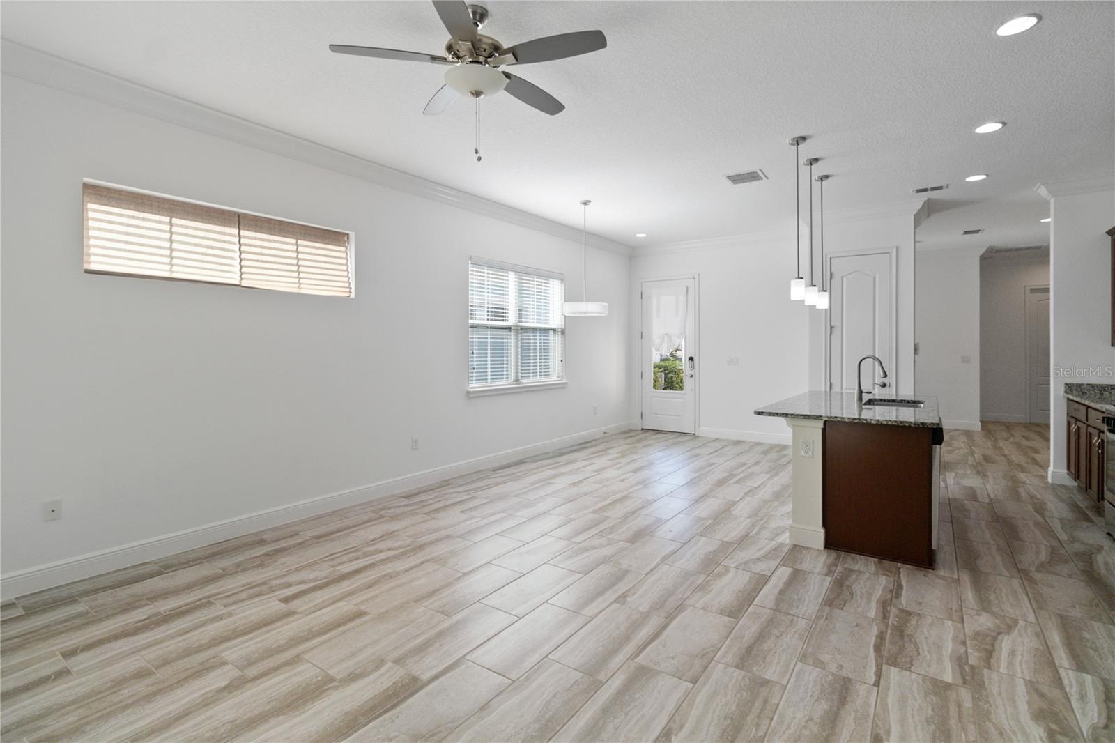 Welcome home to this GORGEOUS and Freshly Painted Daytona floor plan located in the well sought after Gated 55+ Active Del Webb Twin Lakes community. Walk into the breathtaking property featuring stunning wood plank flooring with crown molding throughout and professionally painted. Stunning 42" Cabinets with custom molding, stainless steel refrigerator, Pantry, custom granite countertops throughout, pendant lights, and chandelier. Living room features Sliding glass doors leading to the Lanai with a custom ceiling fan to enjoy your morning coffee. Master bedroom with blinds, trey ceiling, crown molding and ceiling fan. Master bedroom bathroom features crown molding, custom frameless glass doors, diamond shaped tile flooring in the shower, large shower head, and custom tiling. Double vanity granite countertops, brush Nickel hardware and lots of cabinets and a linen closet, carpeted walk-in closet. Laundry room tailored with lower cabinets for great storage, tile flooring, and beautiful granite countertops. Quiet Study/Den features crown molding, blinds, and ceiling fan, very spacious could be a 3rd bedroom. Guest bedroom features a ceiling fan with light and faux wood blinds. Amenities include a Resort style pool, Lap Pool and 3rd pool on the carriage house side, 20,000 square foot Gorgeous Clubhouse, State of the art Fitness Center, Flex room, Tennis Courts, Putting Green, Walking Trails, Pickle Ball Court, Fishing, and Pontoon Boats and Jon boat to use on Live Oak Lake! The community has many active and socializing activities. View today!