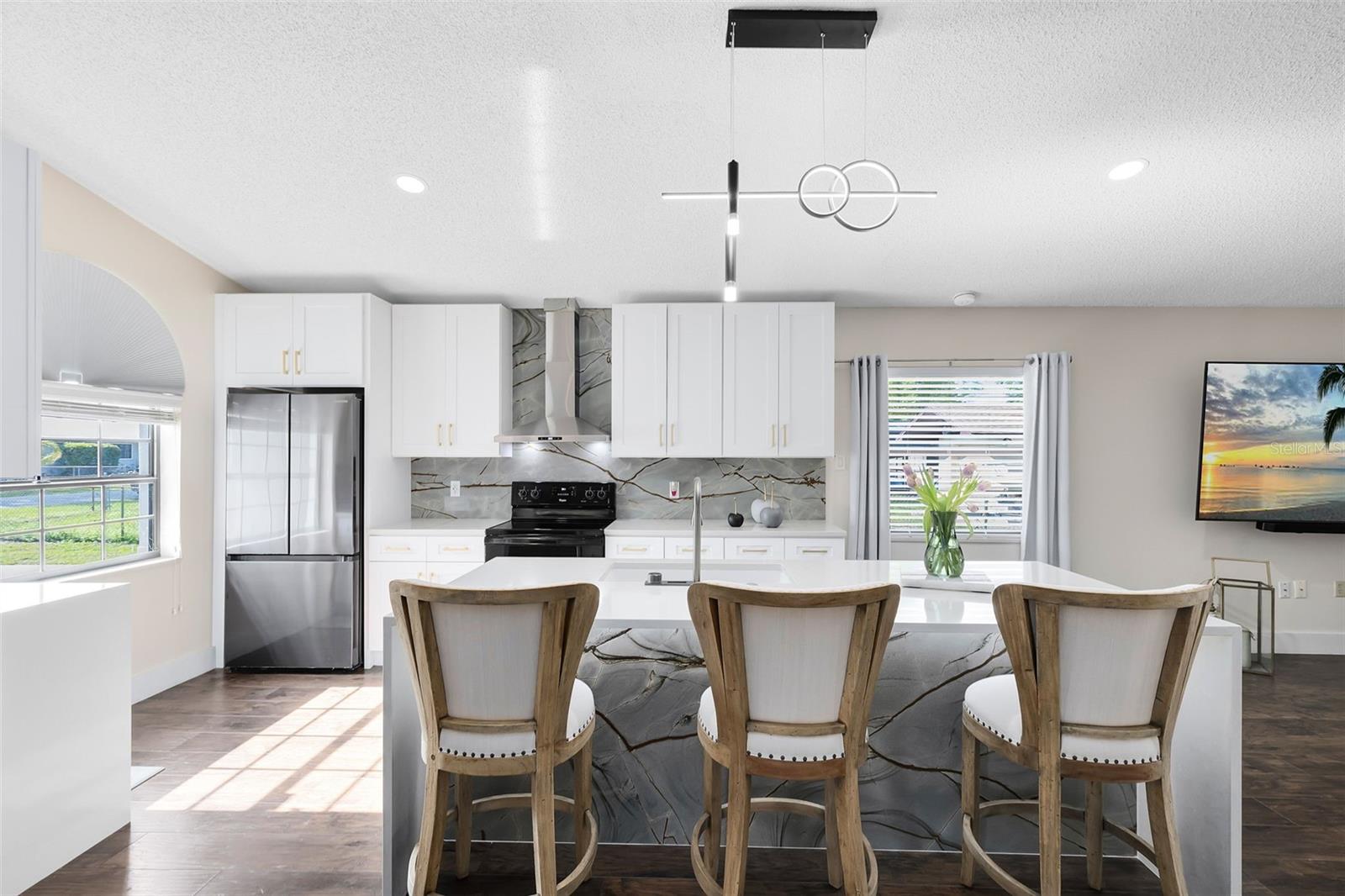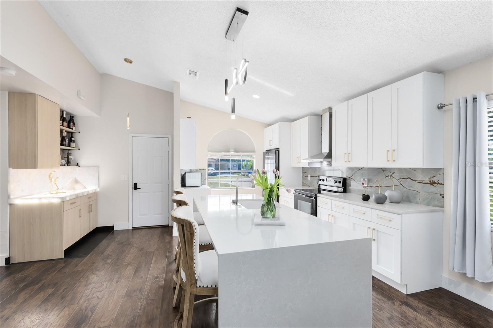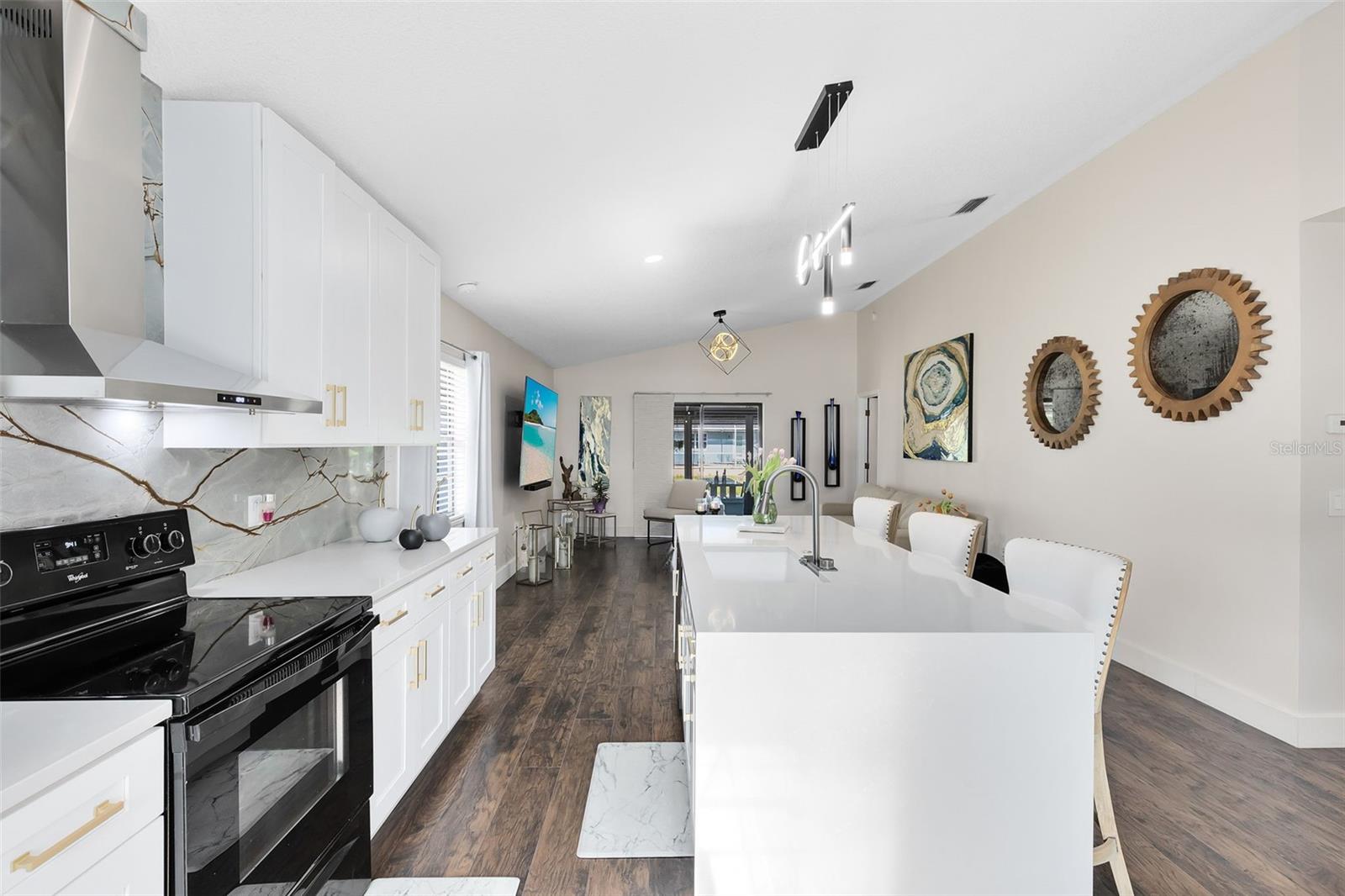 Fully Renovated Canalfront Home with Direct Access to the East Lake Toho Chain of Lakes! Located on a peaceful cul-de-sac, this beautifully upgraded home features an open floor plan with vaulted ceilings, luxury wood-look flooring, and abundant natural light. The showstopping kitchen offers 42” cabinets, a large island with breakfast bar, quartz countertops, a deep blue quartzite backsplash, modern lighting, a quartz composite single-bowl sink, a Crystal quartzite dry bar, and new stainless steel appliances. The spacious master suite includes serene canal views, a walk-in closet, and a fully renovated en-suite bathroom with quartz counters, shower walls, and designer wallpaper. The guest bathroom is also upgraded with quartz and wallpaper accents. Enjoy Florida outdoor living with a covered, screened-in patio and a brand-new covered wood deck with pergola (2024)—perfect for entertaining. The Lanai has Tile, The corner lot offers ample space for a pool, fire pit, or summer kitchen. BONUS: The garage has been professionally converted into a private in-law suite complete with a full bathroom featuring quartz shower walls and vanity, a kitchenette with quartz countertops, and an undermount stainless steel sink. Additional upgrades include: New A/C (Dec 2022) Tankless water heater (2023) Backup power system Hardwood flooring throughout the home Laminate flooring in bathrooms NO HOA. Launch your kayak, jet ski, or bass boat from your backyard and enjoy direct water access. Ideally located near Historic Downtown St. Cloud, U-Pick farms, restaurants, and shopping. Just 20 minutes to Lake Nona, 30 minutes to Orlando International Airport, and 40 minutes to beaches and world-famous attractions. Don’t miss this move-in-ready canal front gem packed with upgrades and waterfront charm!