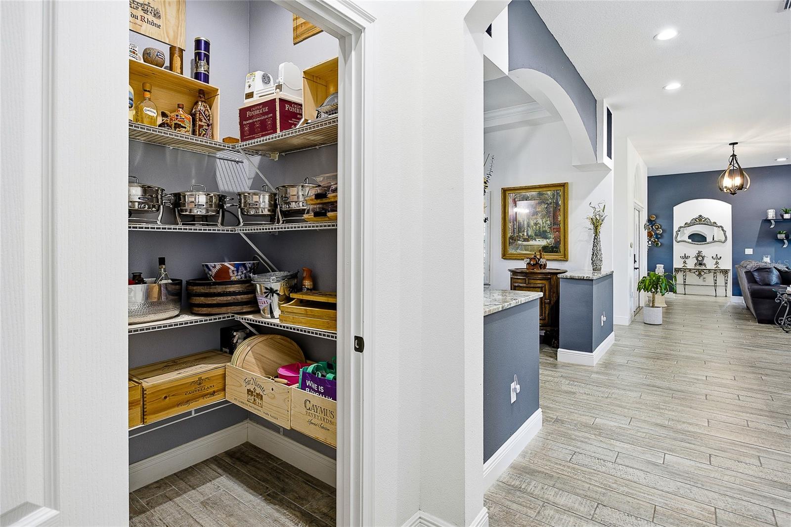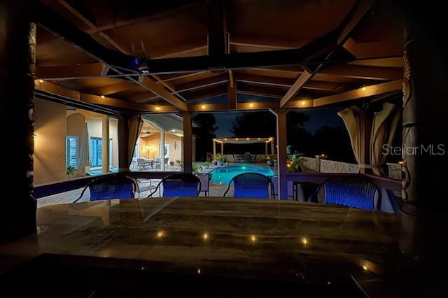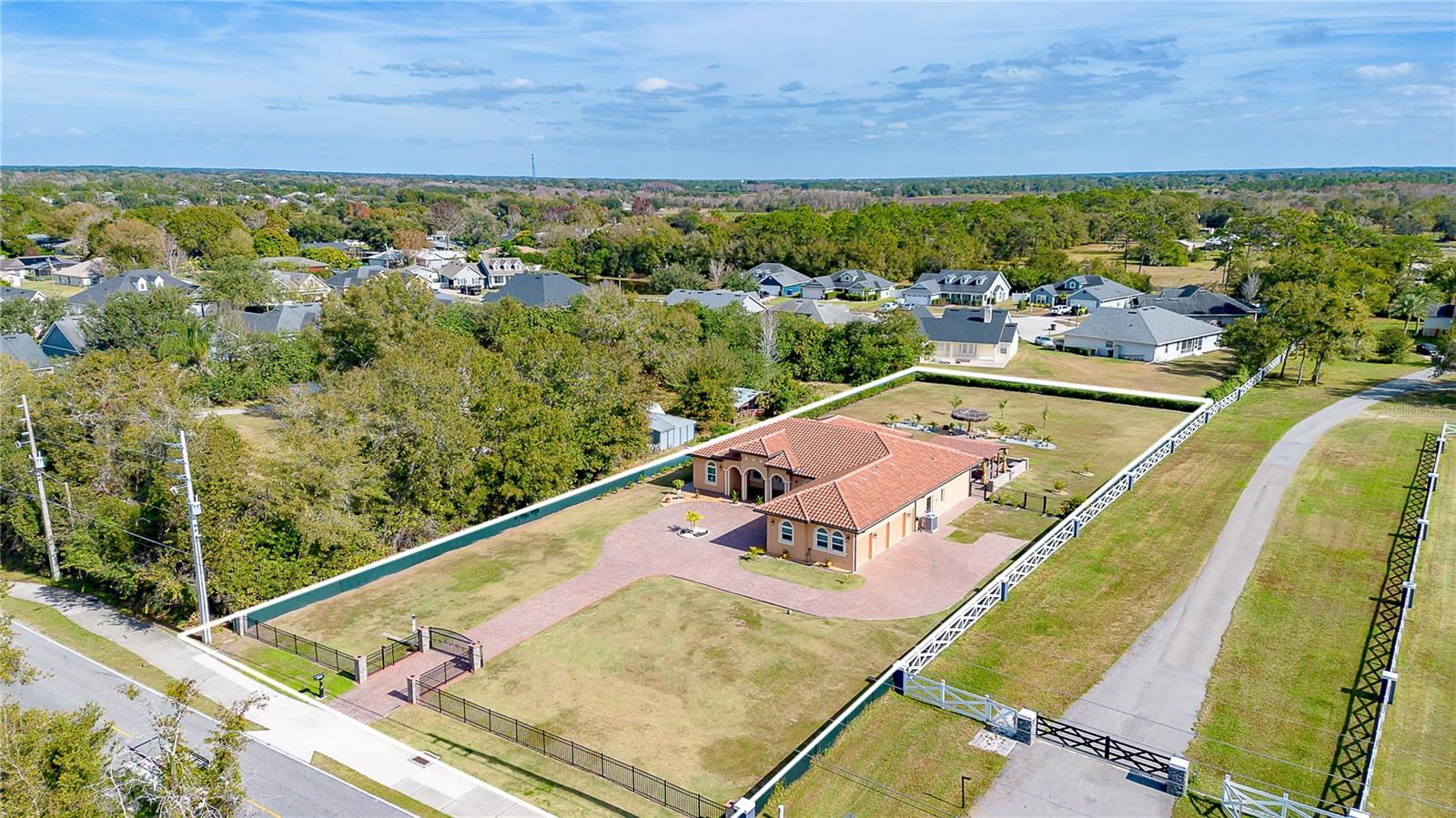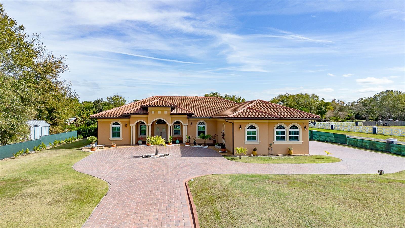 This custom-built residence seamlessly blends refined craftsmanship with resort-inspired amenities. Topped with a Spanish Mediterranean tile roof, it is on a fully fenced 0.9-acre homesite with a private electric gate and no homeowner's association. Designed with precision, the home features porcelain tile flooring throughout, impact-rated doors and windows, and plantation shutters, including in the garage. Encompassed by 125 feet of brick pavers, the grounds are as meticulously planned as the interiors. The outdoor living space centers around a saltwater pool framed by a hand-laid stone wall and anchored by a fully equipped, lighted tiki bar. This alfresco retreat includes a television, Bluetooth speakers, dual refrigerators, a grill, a fire pit and a heat pump heater for year-round enjoyment. Inside, the three-bedroom, three-bath residence includes 10-foot ceilings, motorized blinds, and a primary suite with an expansive walk-in closet. The gourmet kitchen is fitted with Smart LG appliances, Wi-Fi connectivity and a 14-by-5-foot island. Additional features include a beverage station with wine refrigeration, two pantries, a covered lanai and an oversized laundry room with built-in cabinetry. Technology and security are thoughtfully integrated with eight cameras and power access on each exterior corner. Architectural details such as tray ceilings, crown molding, arches and niches underscore the home’s elevated design. Near Disney, Medical City and Universal, this Central Florida residence offers exceptional access with uncompromising luxury. Seller is willing to consider closing cost contribution or interest buydown with a full offer.