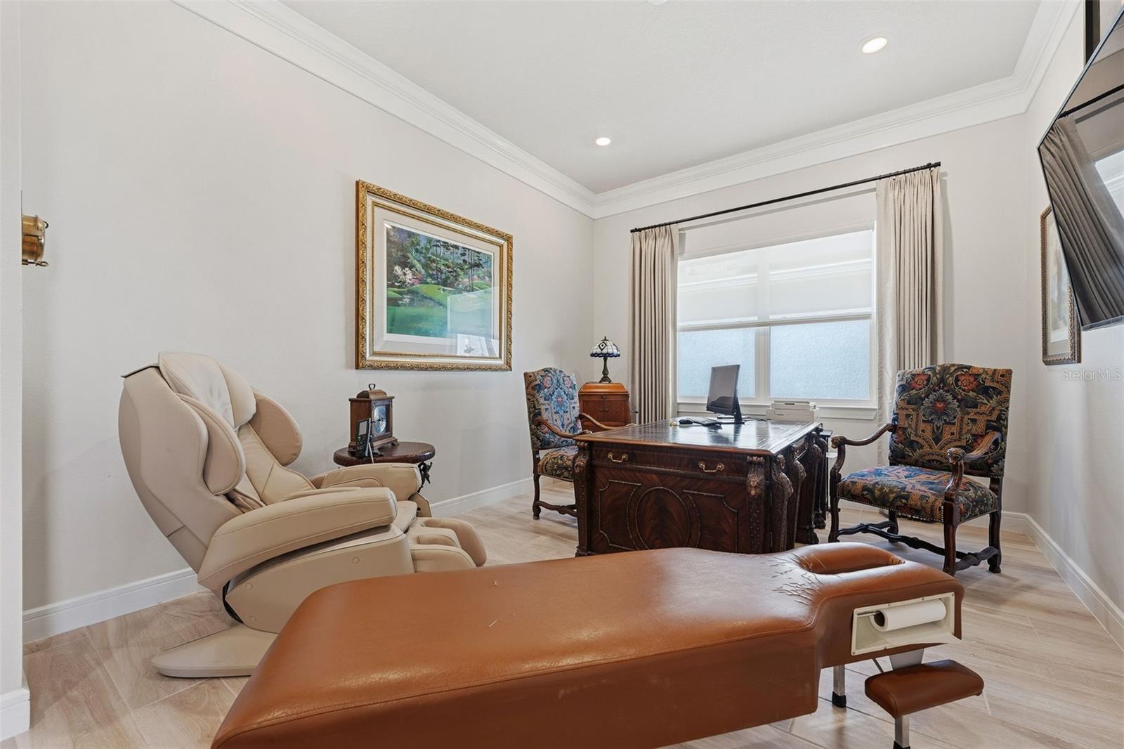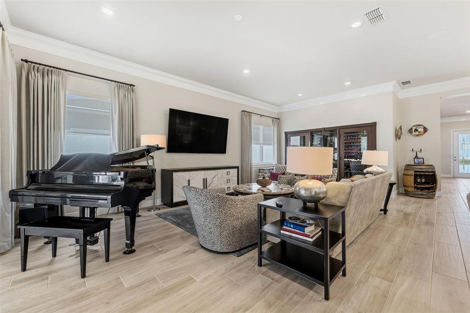 Welcome to 2722 River Creek Lane, located in the resort style community of Sunbridge by Del Webb, where this extraordinary one story residence sets a standard that simply does not compare. This is by far the largest and most extensively upgraded single story home in all of Sunbridge, offering an impressive 4,526 square feet of heated living space. Professionally redesigned with no detail overlooked, this home exemplifies true luxury living while also incorporating ADA accessible features, allowing for comfort, ease of movement, and long term livability all on one level. Ideally positioned approximately 100 yards from the clubhouse, residents enjoy immediate access to pickleball courts, resort style pool, restaurant, fitness center, and social amenities, while the rear of the home backs to scenic protected preserves that will never be built on, providing privacy and peaceful views. Every inch of this home is one of a kind and loaded with high end finishes. A 45 square foot refrigerated wine cellar provides the perfect space for a substantial wine collection. The chef’s kitchen is exceptional, featuring a Culligan reverse osmosis system, upgraded and hard to find countertops, custom cabinetry, a high end gas range, upgraded hood, refrigerator, oven, and microwave. Upgrades continue throughout the home with premium flooring, fully upgraded bathrooms, custom cabinetry in every closet and the pantry, upgraded blinds, custom light fixtures, custom windows, and crown molding throughout the living areas. High tech Klipsch surround sound systems with subwoofers are installed in the living room, family room, and primary bedroom, all with wireless receivers and subwoofers that convey. The expansive family room addition features sound resistant sliding doors, allowing the space to function as a private living area or open completely to create one massive entertaining space. This room is accented by beautiful mahogany ceiling woodwork, along with an electric fireplace and television that convey. The three car garage is a dream for car enthusiasts or hobbyists, professionally insulated and equipped with a high end Mitsubishi HVAC system and brand new epoxy floors. Additional features include a whole home water treatment system, refrigerator and freezer that convey, and an upgraded attic with added flooring for easy access storage. Step outside to a true backyard oasis, designed for beauty and low maintenance living. The outdoor space includes professional landscaping with artificial turf, a gorgeous pergola with sun shade, a private putting green, and a high end outdoor kitchen. The kitchen is equipped with a Schwank high performance grill capable of reaching 1,500 degrees in minutes for restaurant quality cooking, along with a standard gas grill, gas burner, sink, refrigerator, and granite countertops. A gas instant hot water system completes the home’s extensive list of premium features. While Sunbridge by Del Webb is a 55 plus community, it is important to note that up to 10 percent of the community is permitted to be under the age of 55, offering additional flexibility for eligible buyers. As an added value, the seller is offering an $800 credit to be applied toward a home warranty. No other home in Sunbridge compares in size, quality, or level of customization. This is a rare opportunity to own a truly exceptional luxury residence that combines elegance, accessibility, and resort style living in this remarkable home.