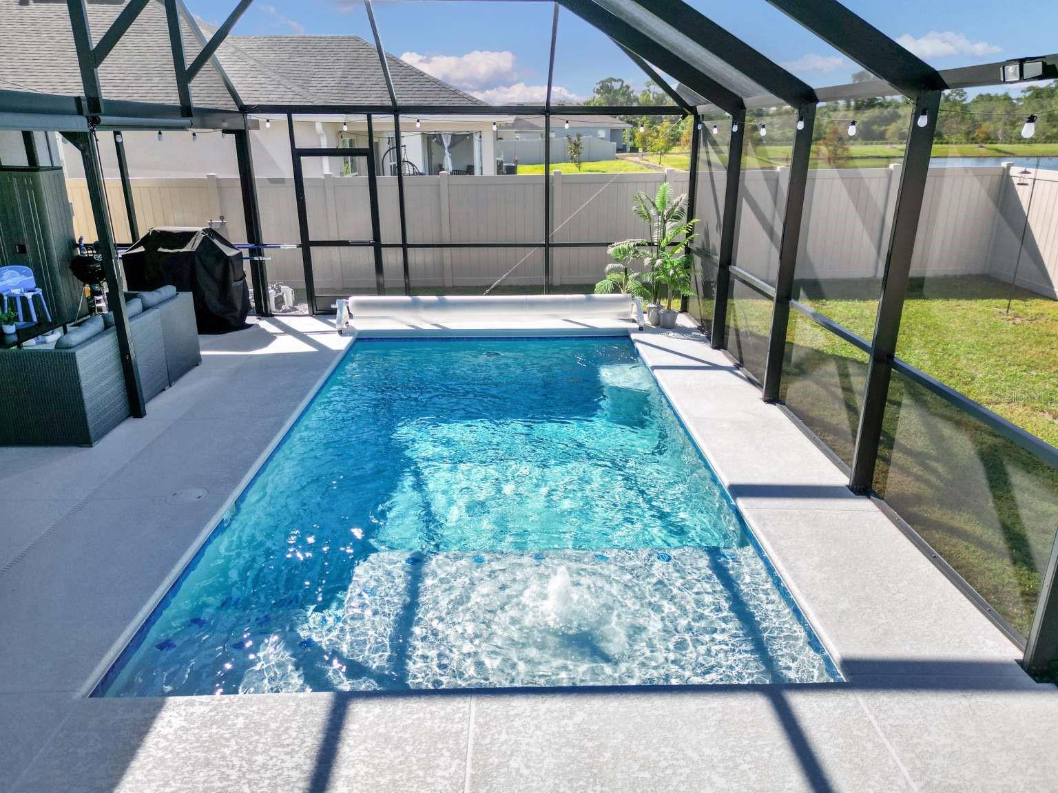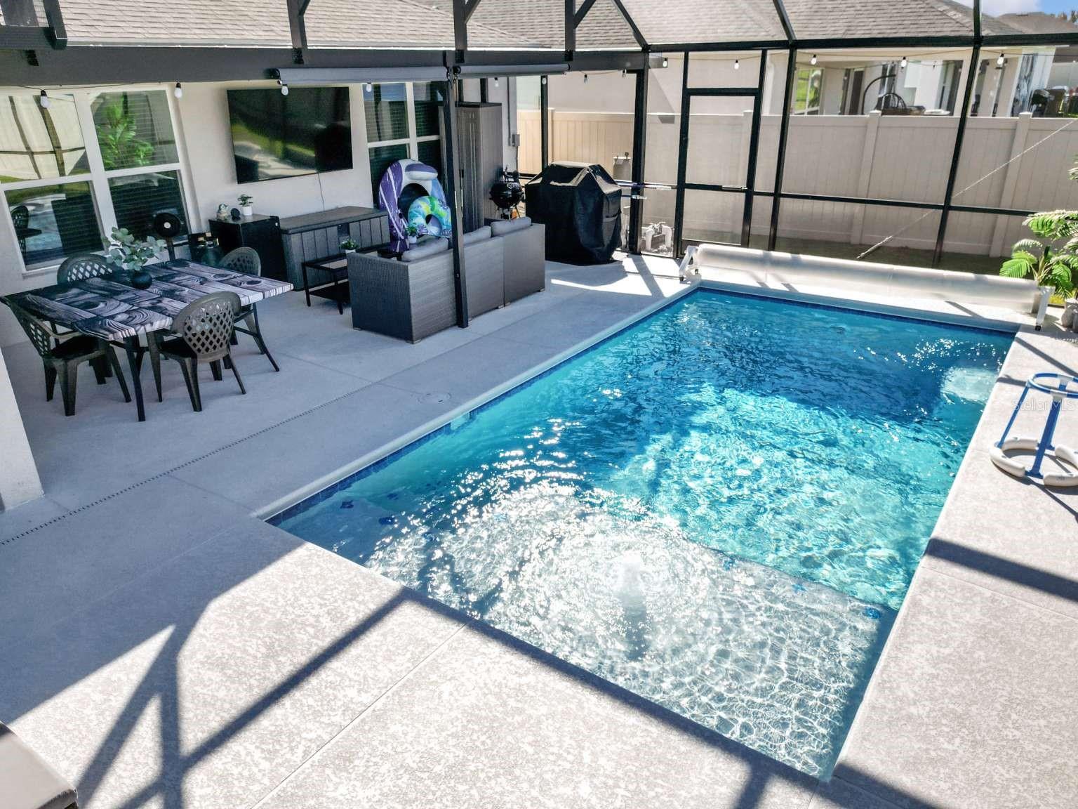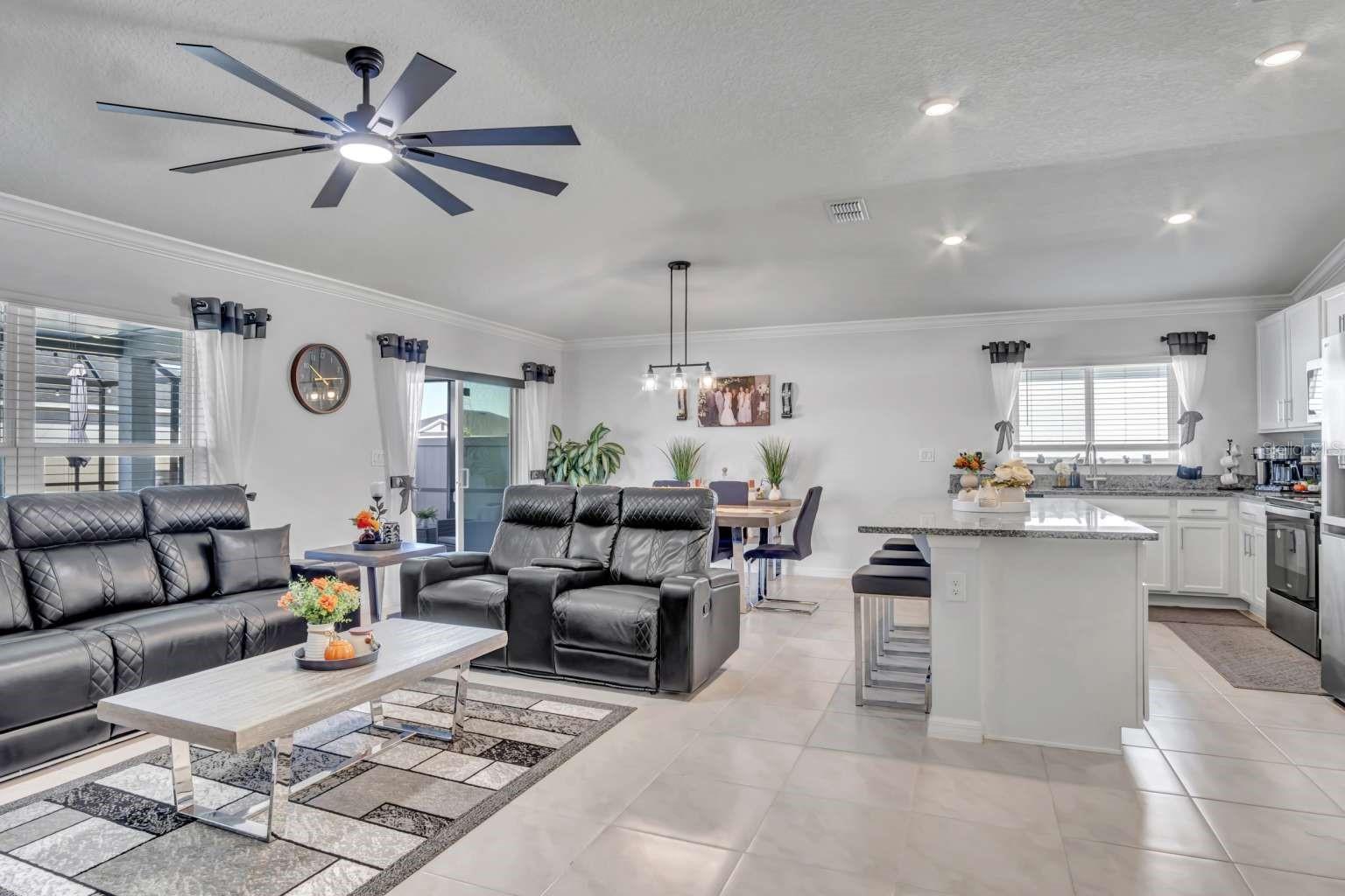 Beautiful 2024 Single-Story Pool Home with Modern Upgrades! Welcome to this stunning, newly built 2024 single-story pool home featuring an open-concept floor plan with sleek tile flooring and a spacious great room with volume ceilings. The gourmet kitchen offers a large island, Dallas White granite countertops, Whirlpool® stainless steel appliances, and 36-inch upper cabinets accented with polished chrome hardware. Retreat to the primary suite, complete with plush carpeting, a tray ceiling, a generous walk-in closet, and a luxurious en-suite bath showcasing a dual-sink vanity, linen closet, and walk-in shower with elegant tile surround. Additional highlights include crown molding, a whole-home water softener system, an under-sink water filtration unit, a two-car garage with epoxy-coated floors, and full home gutters for added convenience and protection. Step outside to your private screened-in pool and covered lanai with roof panels, perfect for entertaining, relaxing, or enjoying weekend barbecues in your fenced backyard. This home offers low HOA fees, no CDD, and a prime location with easy access to Lake Nona, the Florida Turnpike, and US-192. Don’t miss this exceptional opportunity to own a move-in ready home that perfectly combines style, comfort, and convenience!