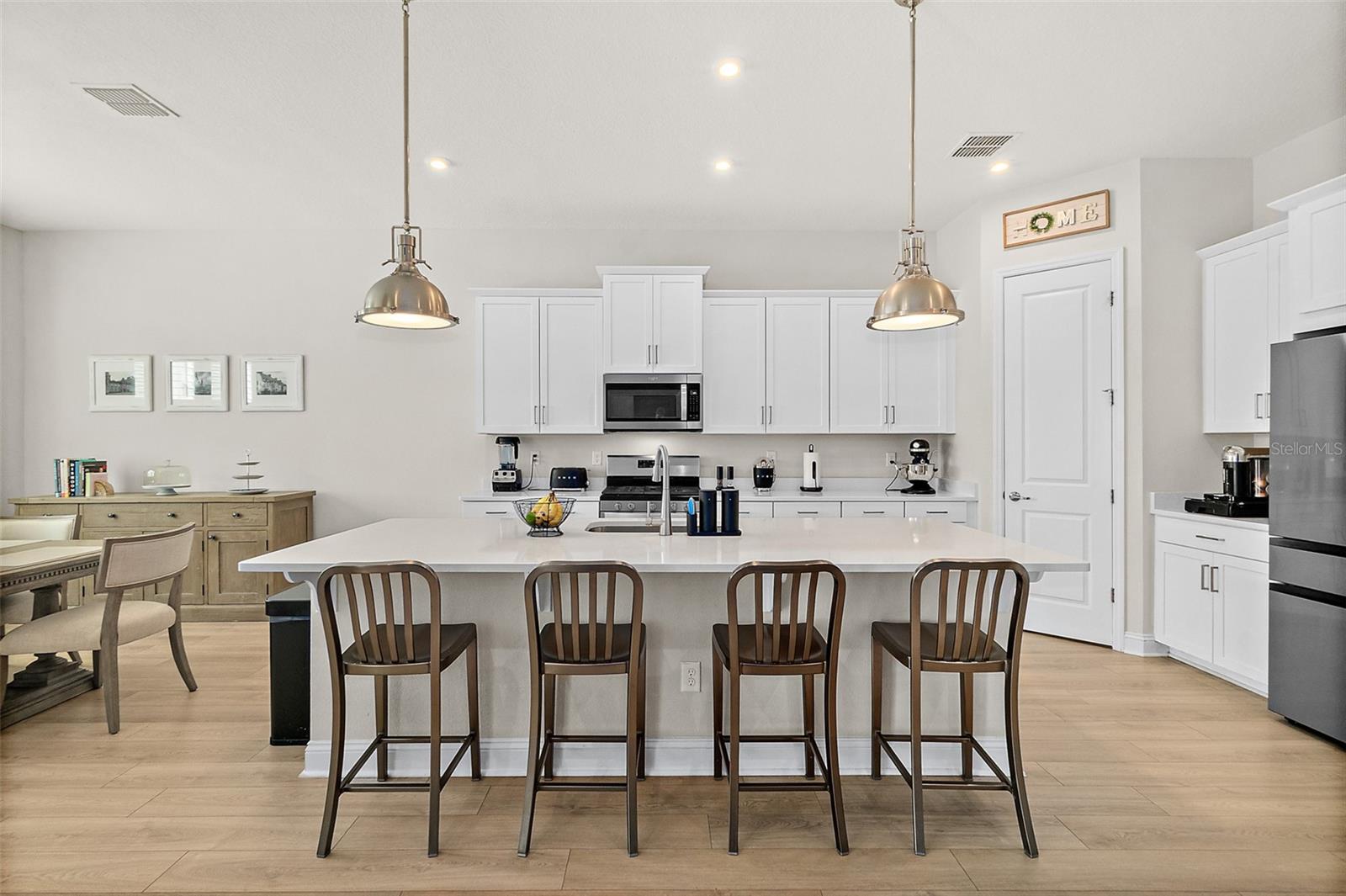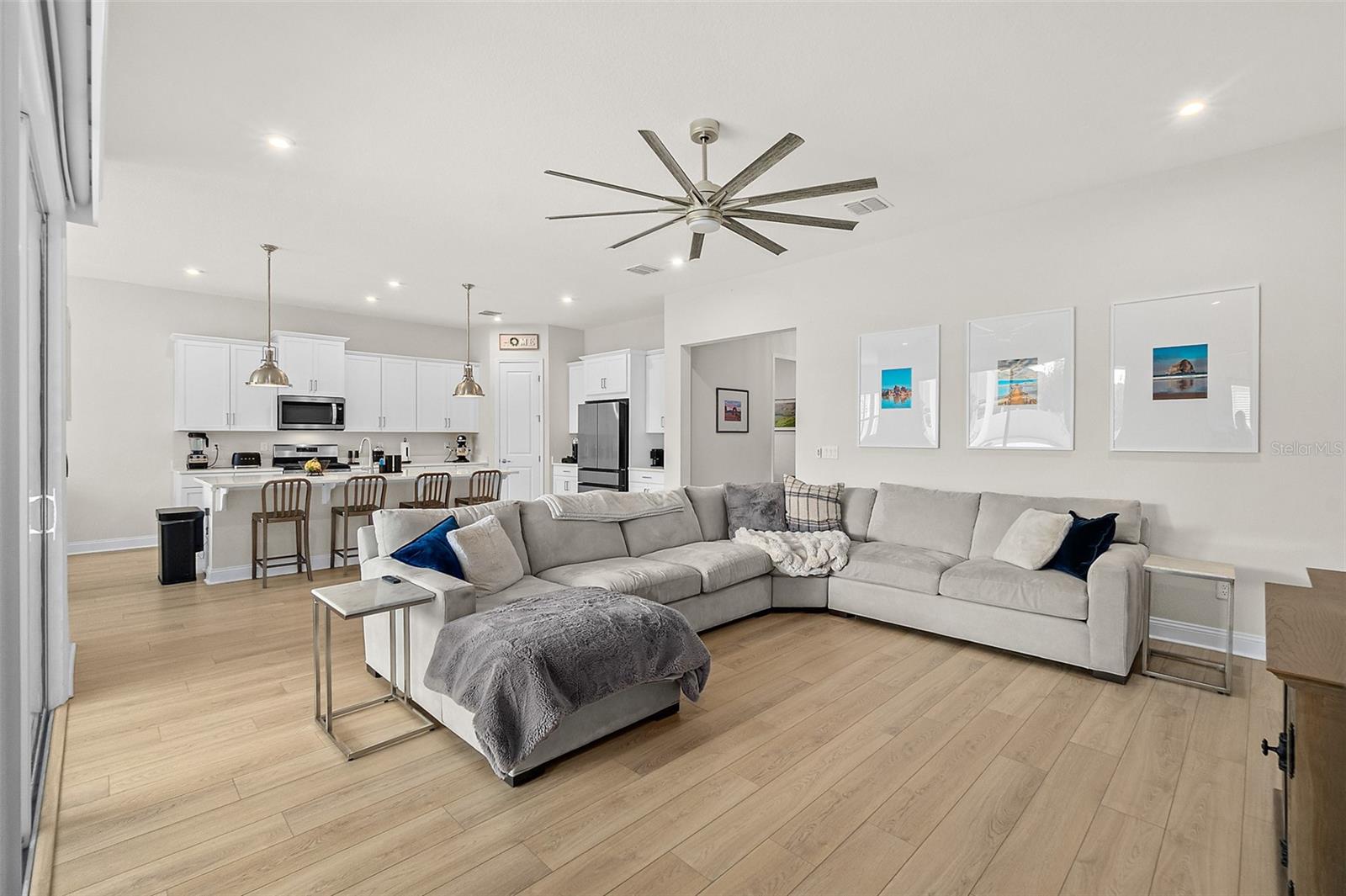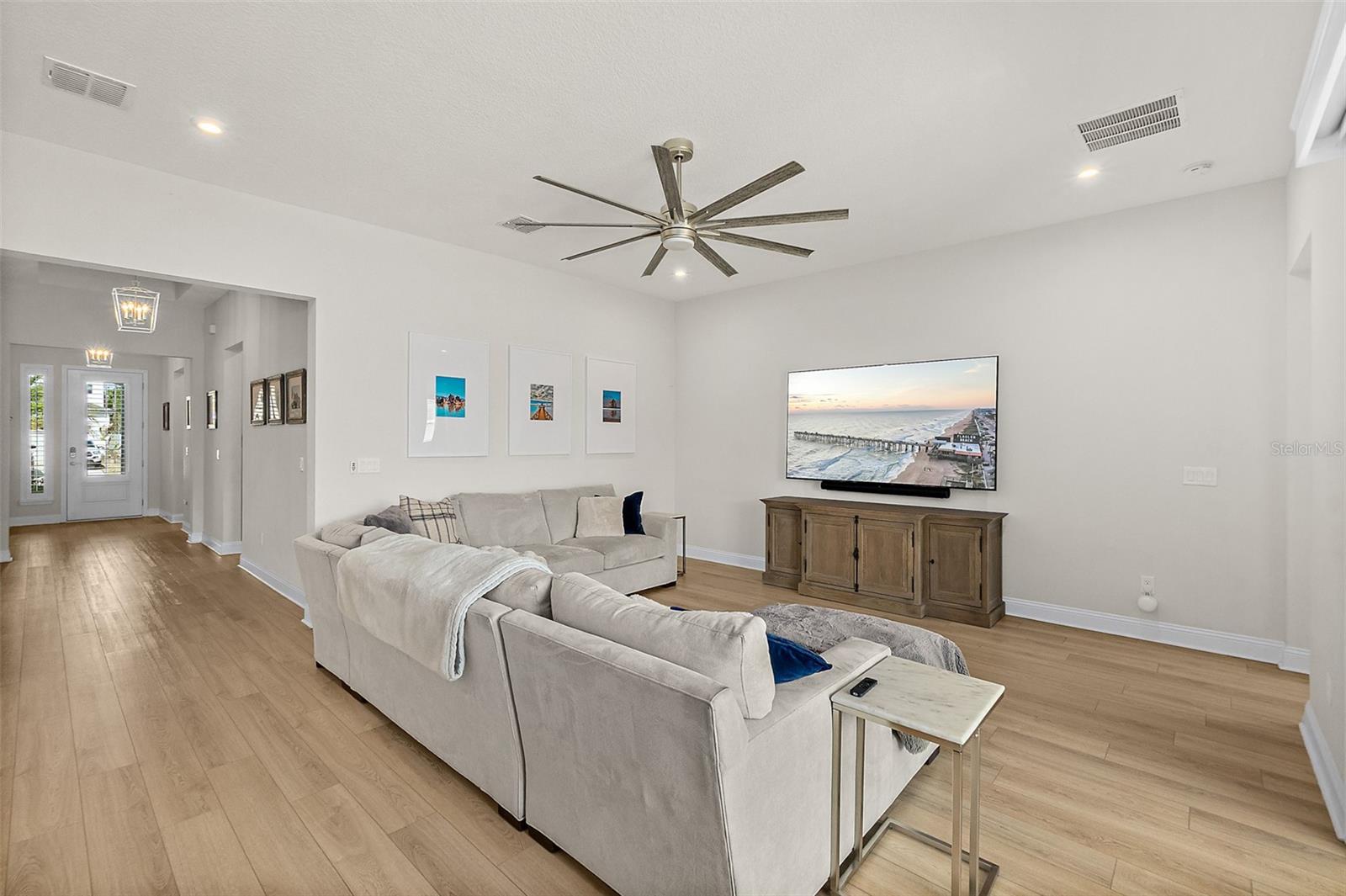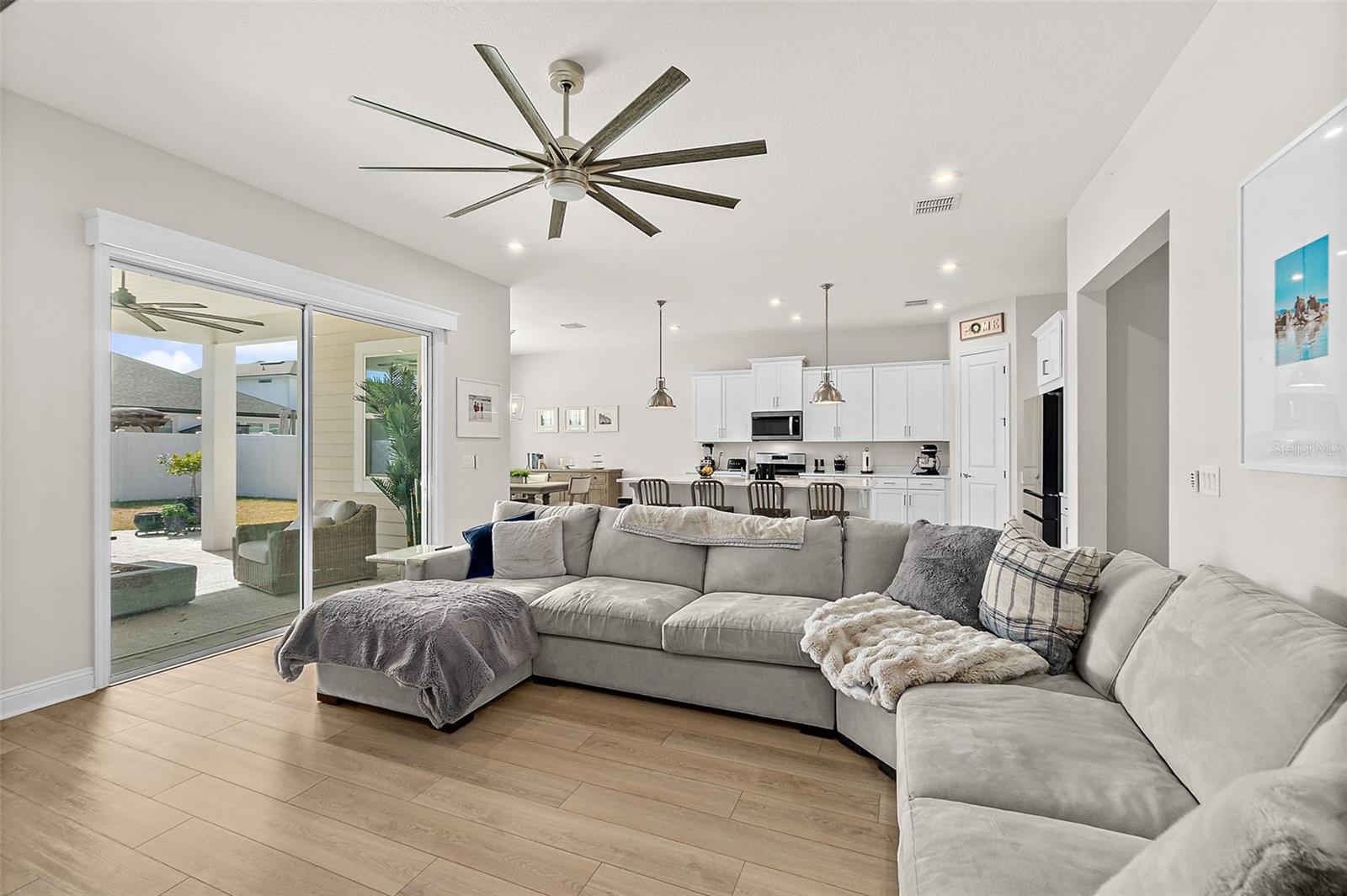 Owner pride truly shows in this Holton Farmhouse plan by Mattamy Homes in the Arbors at Rivertown. You will appreciate the upgraded features and enjoy living is this open concept single story home. The 8' doors, 5 1/4'' base molding, and luxury vinyl plank flooring are impressive. 4 bedrooms plus a study with french doors provide lots of family options. Beautiful ceiling fans, light fixtures, and plantation shutters throughout. Master suite features a tray ceiling, dual vanities, large walk-in shower and closet with storage organizers. These Boaxel organizers have been added throughout the storage areas and closets. Other great features include a water softener, EV charging outlet, electronic shade for sliding glass doors, extended lanai and paver patio, vinyl privacy fence, gutters & downspouts, and custom landscaping. Great location in the community close to the new Hallowes Cove Academy, Riverview Lodge, and all the outstanding amenities that Rivertown has to offer!