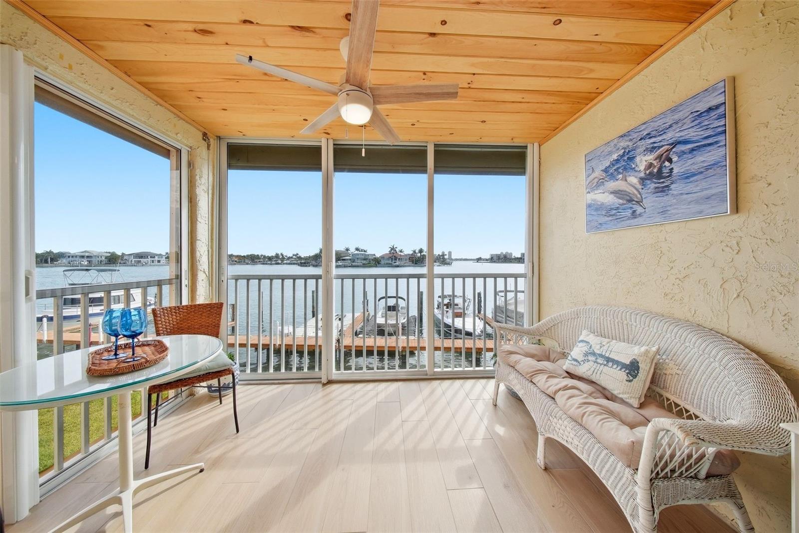 Welcome to your turnkey fully furnished coastal retreat in the resort-style gated community of Boca Shores, directly on Boca Ciega Bay and a ½ mile stroll from Treasure Island’s Sunset Beach and the Gulf of America. Full WATERFRONT unit, beautifully updated and furnished second story 2 Bed 1 Bath Condo with sweeping unobstructed views of the wide Intracoastal Waterway. Enjoy the stunning water view from the kitchen, dining area, living room and primary bedroom. Just off the main living area, a hallway leads to a spacious full bathroom situated between the two bedrooms. The primary bedroom has a large window facing Boca Ciega Bay and features a large walk-in closet. A new full size combo washer/dryer is conveniently located IN the unit, in the second bedroom. Brand new wood-look porcelain plank tile throughout gives a coastal vibe. The condo has newer windows and sliding doors plus switch-operated hurricane shutters to add protection and peace of mind. The all weather lanai with its sliding doors and screens brings the outside in and offers panoramic views and refreshing Intracoastal breezes. Association amenities include a waterfront heated pool, fishing dock with cleaning station, clubhouse and fitness center (currently under construction), indoor bicycle storage for a nominal fee, two laundry rooms and more. A reasonable monthly condo fee of $855 includes items like exterior maintenance, exterior insurance, grounds and pool maintenance, water, sewer, trash, cable and internet. BOATERS! There are boat slips directly in front of the unit, with electric and water, that can be leased for a monthly fee from the Association when available (slips open as of listing date). Boca Shores is very PET FRIENDLY, allowing owners two pets, with size restrictions. This home is well suited for permanent residents as well as investors, with a minimum lease term of 30 days. The 5.4- acre St. Pete Beach Egan Park is located directly next door and has tennis and pickleball courts, ball fields, a public boat launch and a walking area for you and your pets. Near Boca Shores you will find a great selection of restaurants - many with live music, the Corey Avenue shopping district, as well as a fun Sunday market where you'll find fresh foods, vegetables and crafts. Only a 30 min drive to TPA and PIE or 20 min to vibrant downtown St Petersburg. This is a dream purchase for water lovers. Schedule your private tour today!