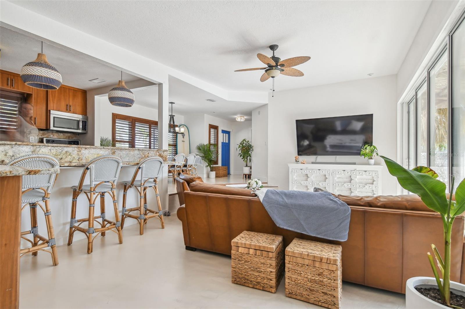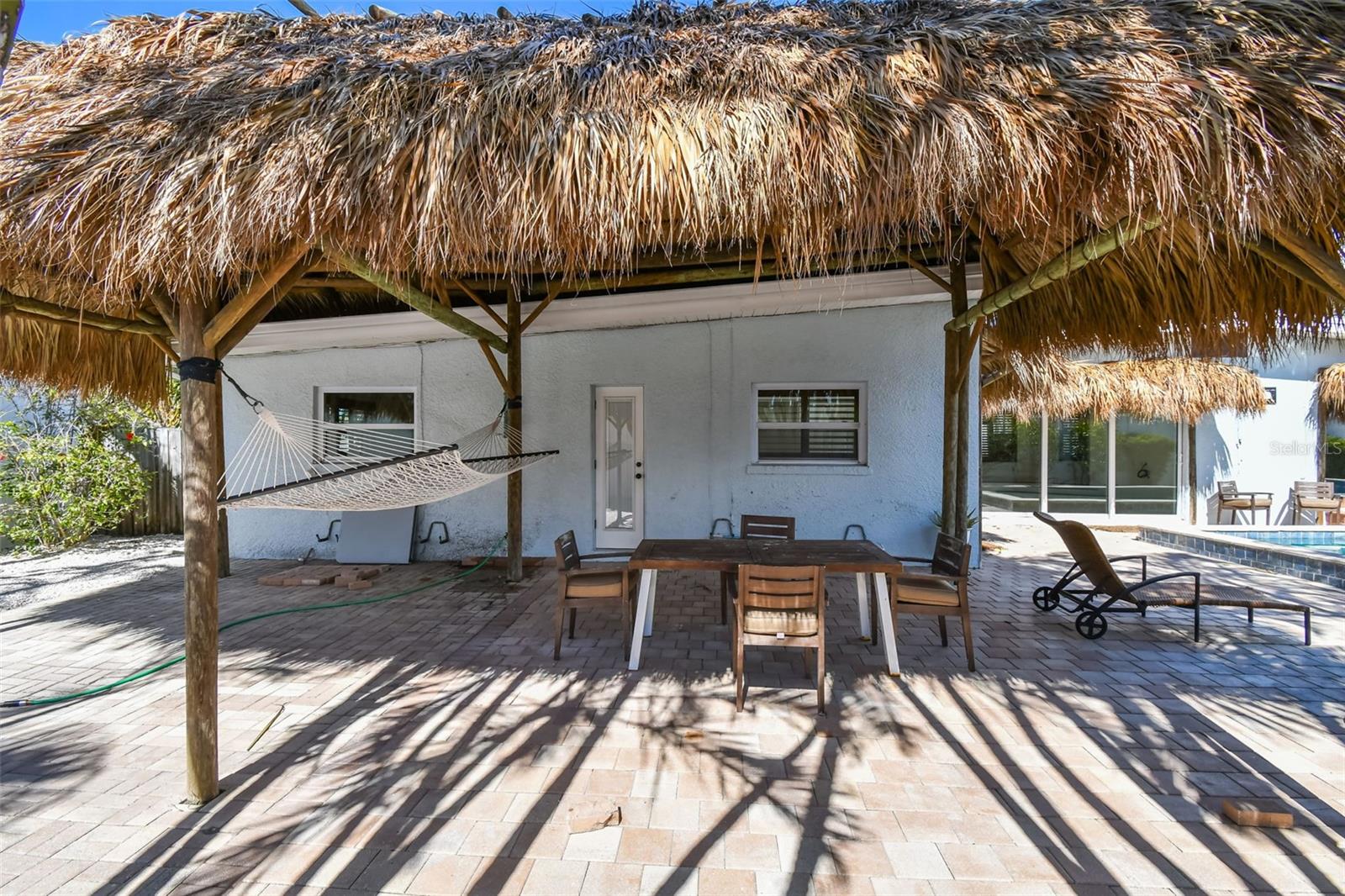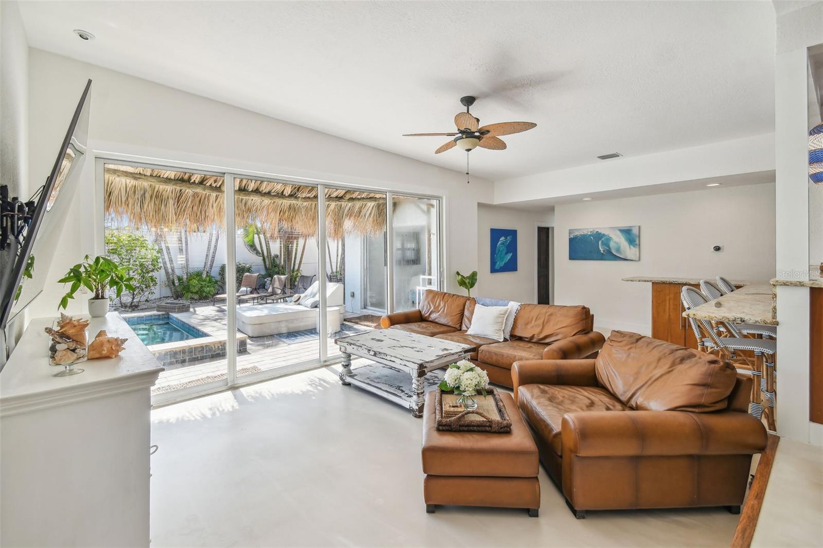Welcome to this unique home located on Boca Ciega Isle at the center of St Pete Beach, the Sunset capital of FL. This amazing home is perfect for entertaining and outdoor living. Walk to the beach or drive to several beach access points and 71 blocks of sand on the Gulf of Mexico. No inch is wasted in this comfortable 4 bed, 2 bath, split-plan home with an elevated front porch, master bedroom, and kitchen. You too will likely spend most of your time in the great room which allows you to bring the outdoors inside with massive Low E solar glass, pocket door sliding doors to the paved backyard oasis with a spa-like spillover pool. The interior is light and opens to the south and your tropical island paradise. St Pete Beach has Freebee beach rides and residents don't have to pay for the beach meter parking. The Giant tall Tiki Hut off the back roof with 5 doors to its private yard 3 are sliding glass all leading to the home's classic outdoor living areas even on a rainy or hot summer day you can sit outside and enjoy our gulf breeze. Wake up to Island birds and the sound of rushing water from your pool waterfall. This private paved backyard is set up for an outdoor TV which can be viewed from the pool or perhaps a daybed, and surround sound speakers connected to a Savant system for movie nights or just to jam out to some great tunes. The 4th bedroom includes a back door entrance via the western gate and lawn, its doggy door is good for a small or medium size, and can also be easily removed. This is perfectly fenced grass for your pet or child to play away from the pool. The 2nd bathroom, which has an updated spa-like deep soaker tub and high-end hardware, leads to the enormous Tiki Hut - BBQ outdoor breeze area. North of the grass is the gate to the well-known tree, with the best-tasting mangos! The garage door stores some utilities and lots of storage (currently 161 sqft). NO Garage, instead it is the 4th bedroom Gym room / Laundry room can be re-opened to a single-car garage and still has storage. Its main bedroom suite is on the elevated east end of the home with Travertine floors looking down to the pool and soothing water spillover sounds, all creating a resort-like atmosphere. All other flooring is mother-of-pearl Epoxy floors with is smooth matte finish drawing inspiration from Tulum and Santorini, and a seamless marble look with no grout to clean! Custom flat cabinetry, plantation shutters, and hand-woven Balinese lighting. Less than a mile's walk to the beach “sand in your toes”. even closer to the Public shopping center. St Pete Beach City was named the Sunset Capital and has Low Taxes and free Golf-Cart rides. Call today for a viewing, you will feel worlds away on this natural island with its quaint bridge access to about 100 homes with 1 peaceful Waterfront Park. St Pete Beach has lots to do besides 71 blocks of soft sandy beach to enjoy it and certainly lots of great restaurants and beach bars! SPTB Residents have Free meter-parking, 2 registered vehicles per household, lots of beach access, walk or Golf cart, the sand, to the Drunken Clam, Publix, Starbucks, or any of our many Beachfront haunts. Only 25 min virtual non-stop from the Airport to St Pete Beach Call to view today!